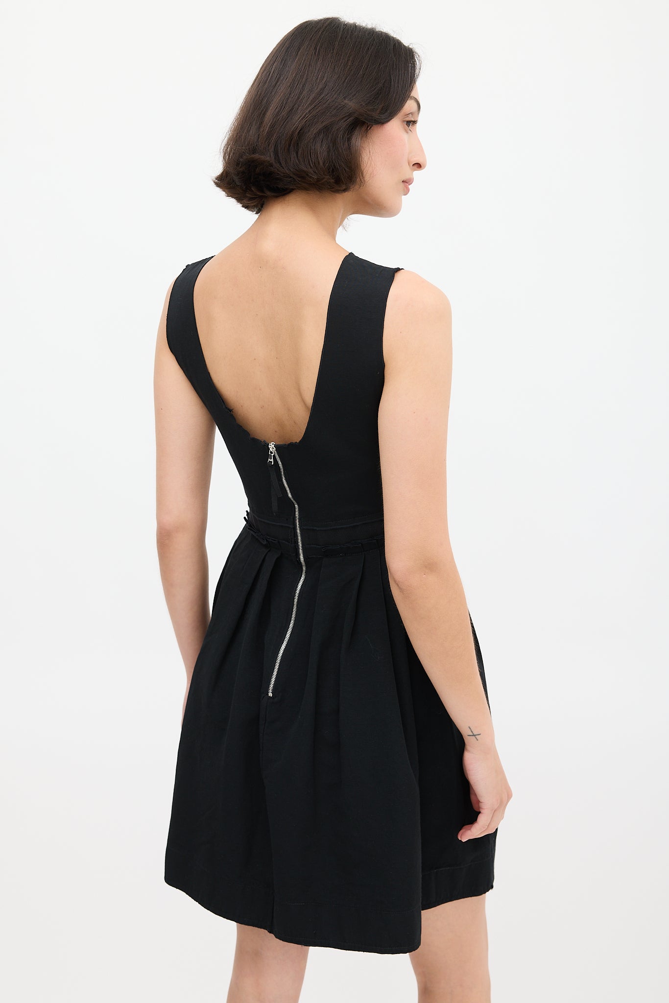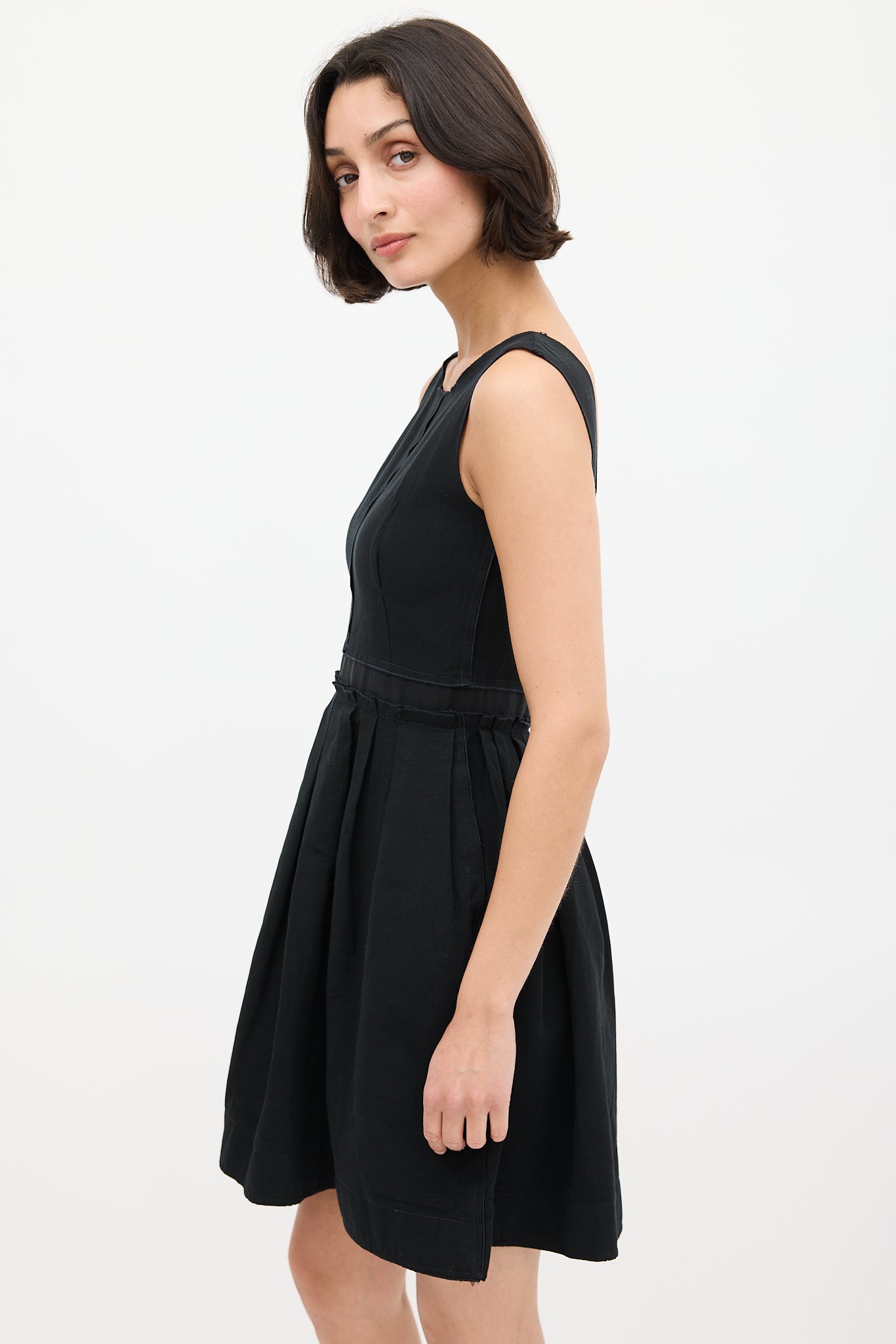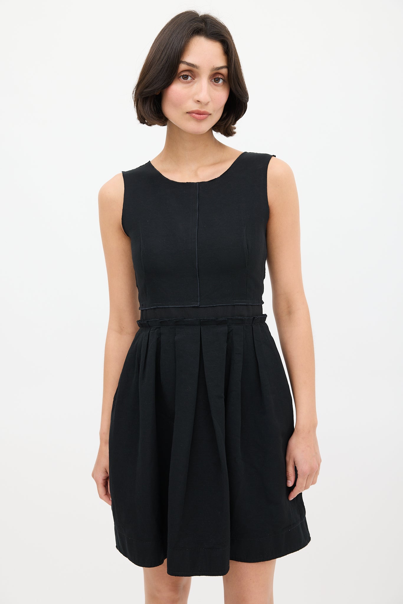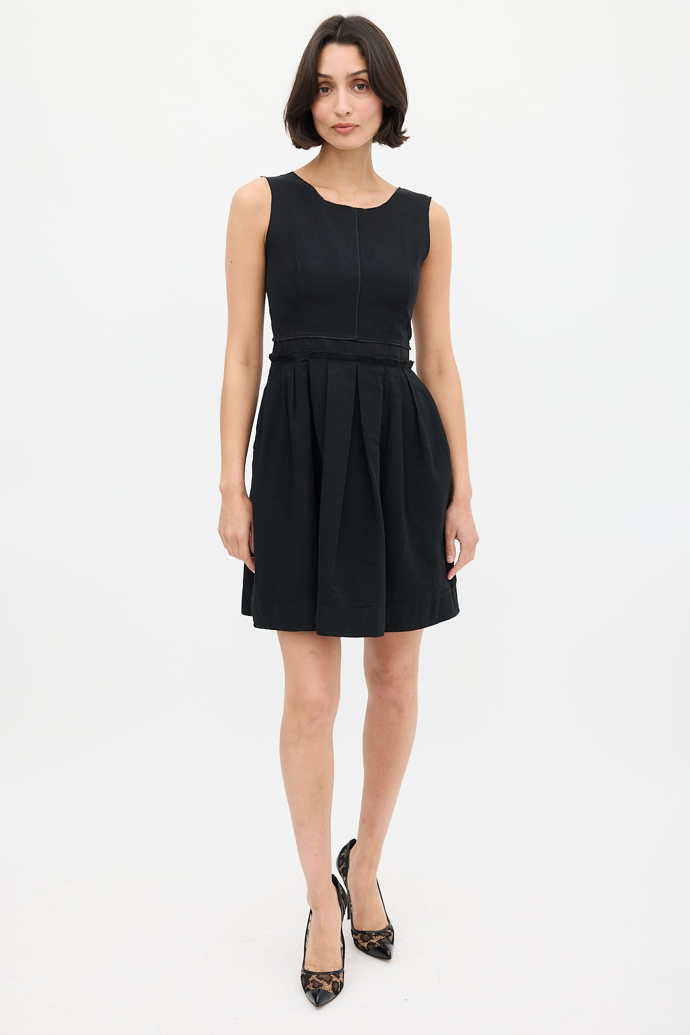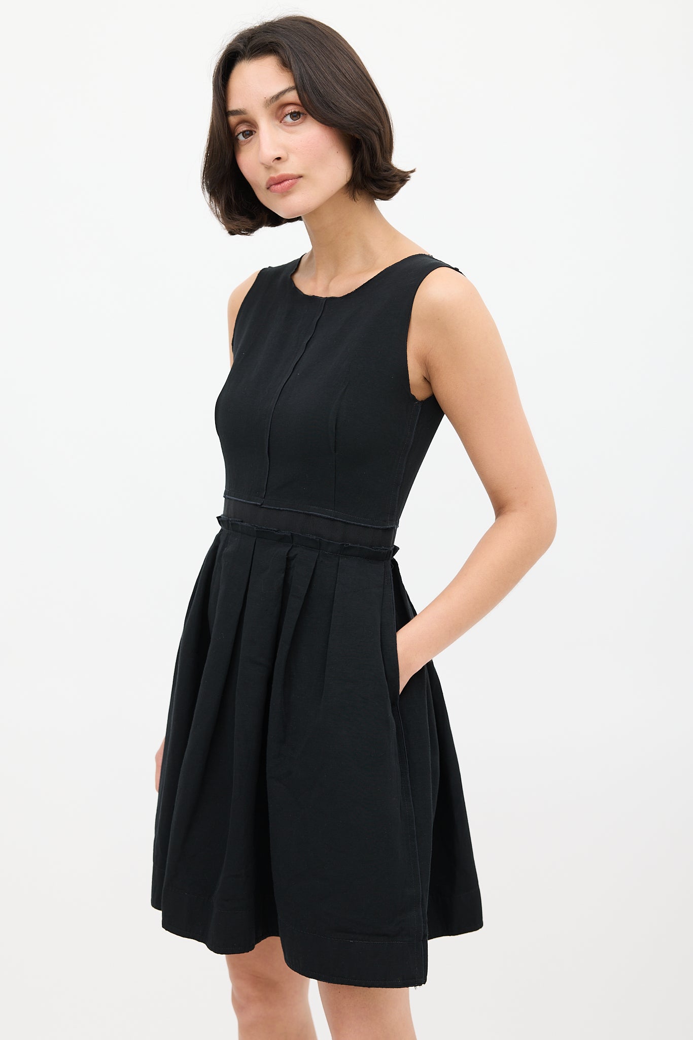 Pre-owned Dolce & Gabbana D&G black dress featuring wide neckline, scoop back, zip closure at back, webbing at waist, two hip pockets, and pleated skirt.