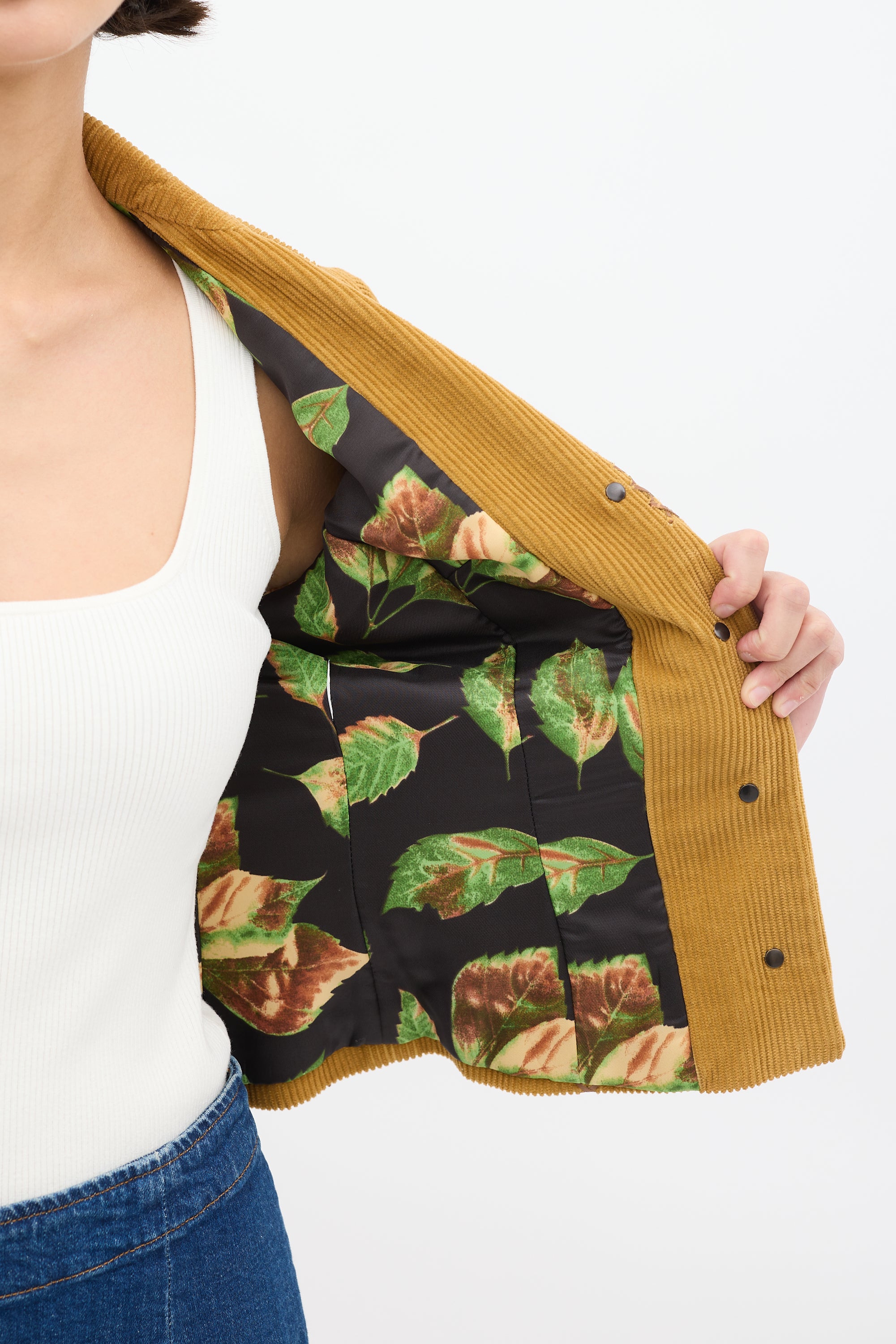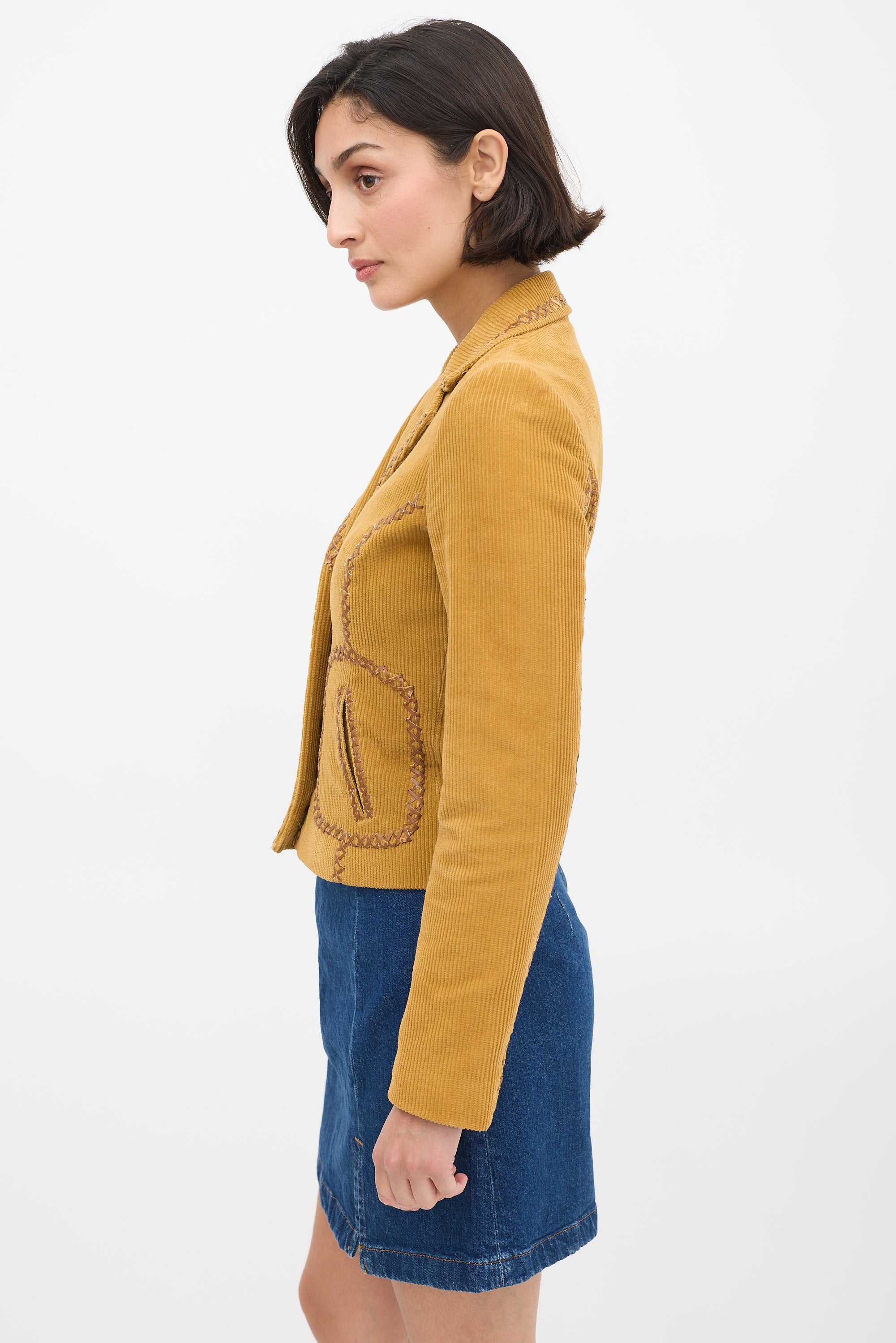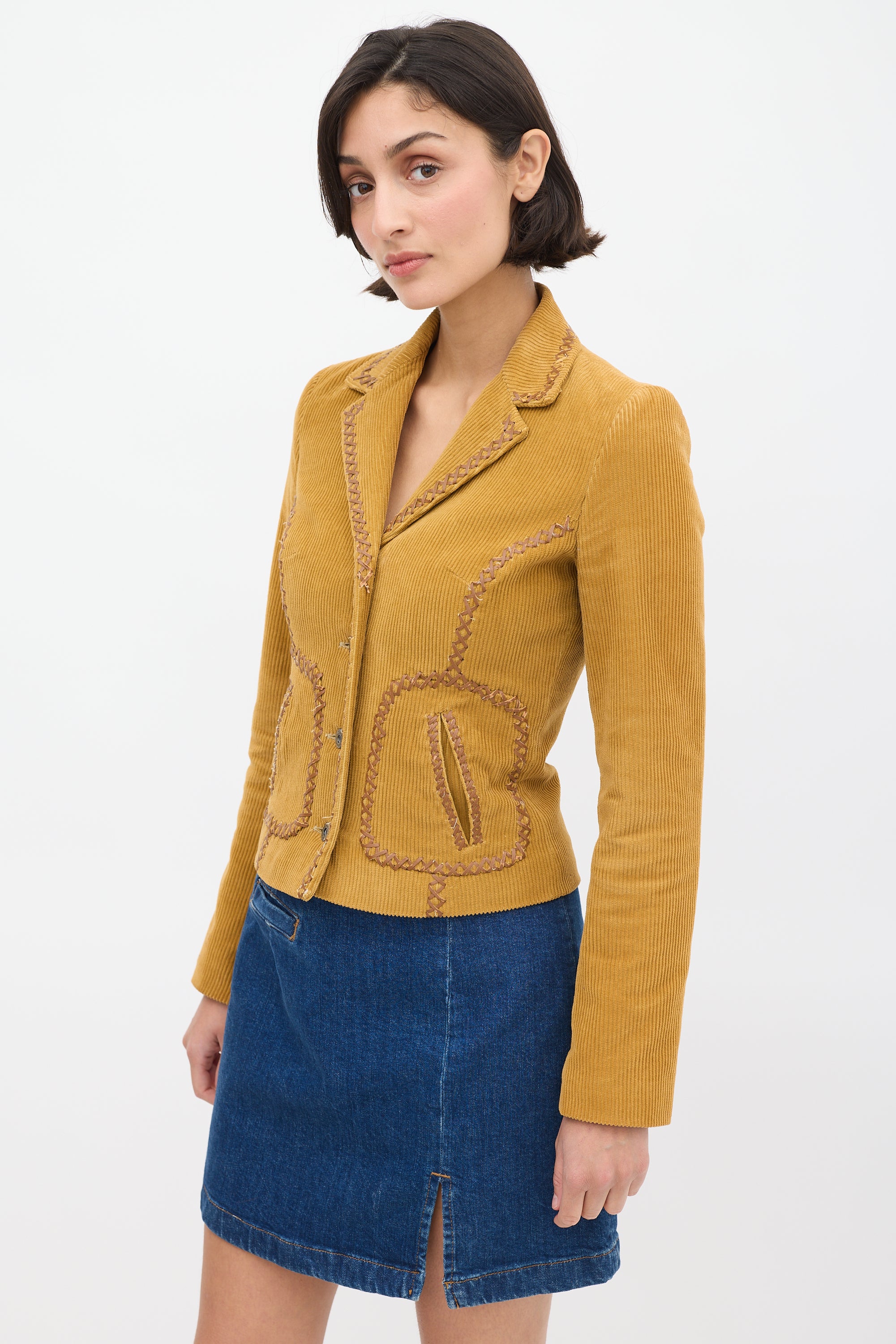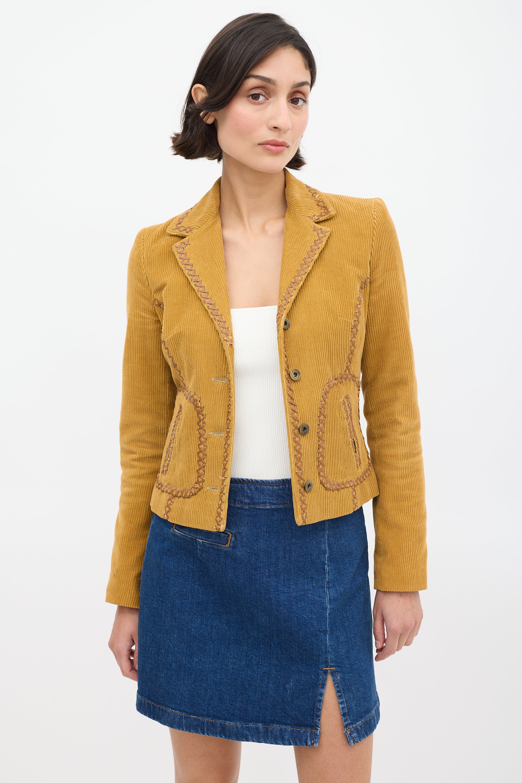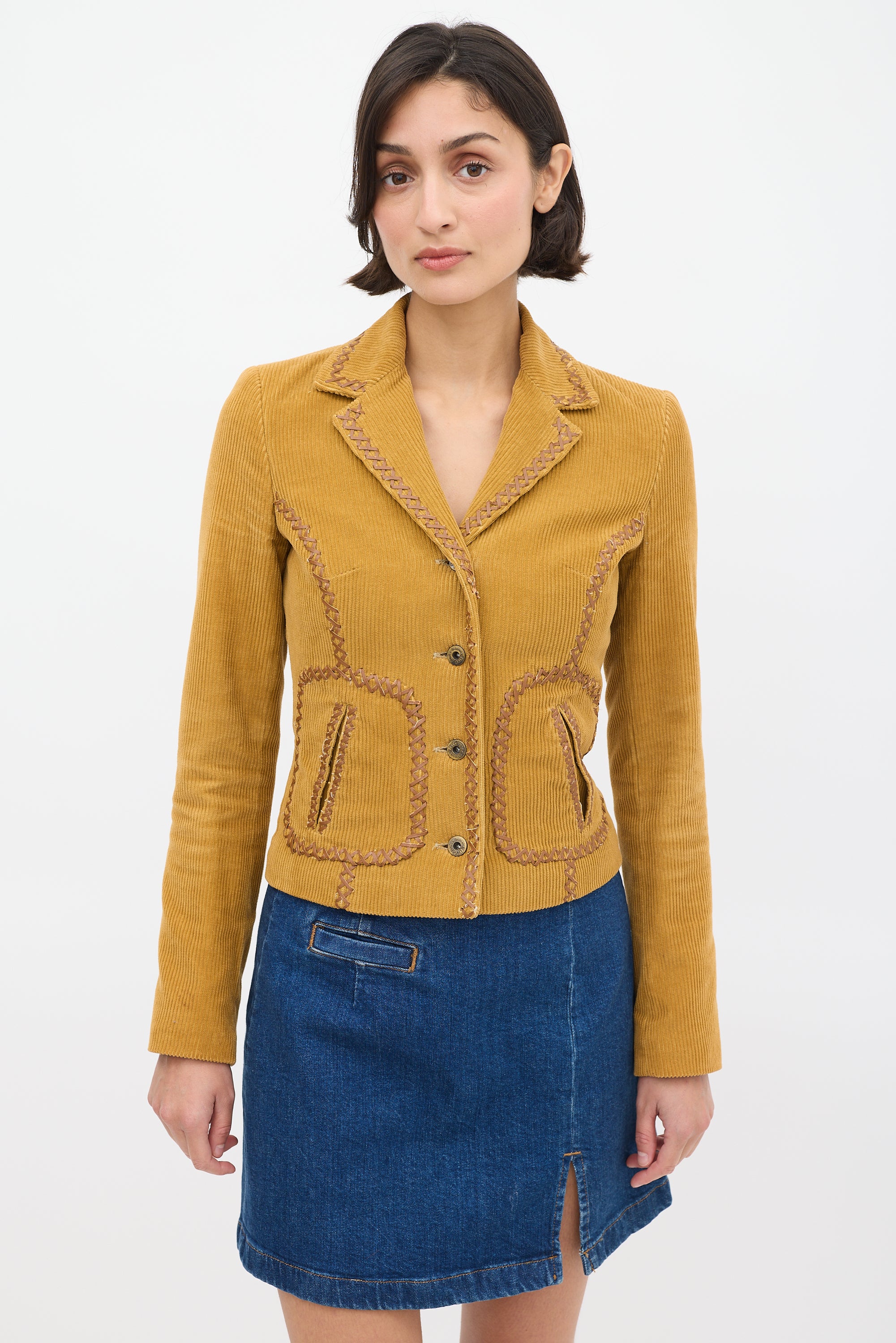 Pre-owned Dolce & Gabbana D&G brown corduroy blazer featuring notch lapel, button up front, tonal leather whipstitch detail, two hip pockets, and leaves printed lining.