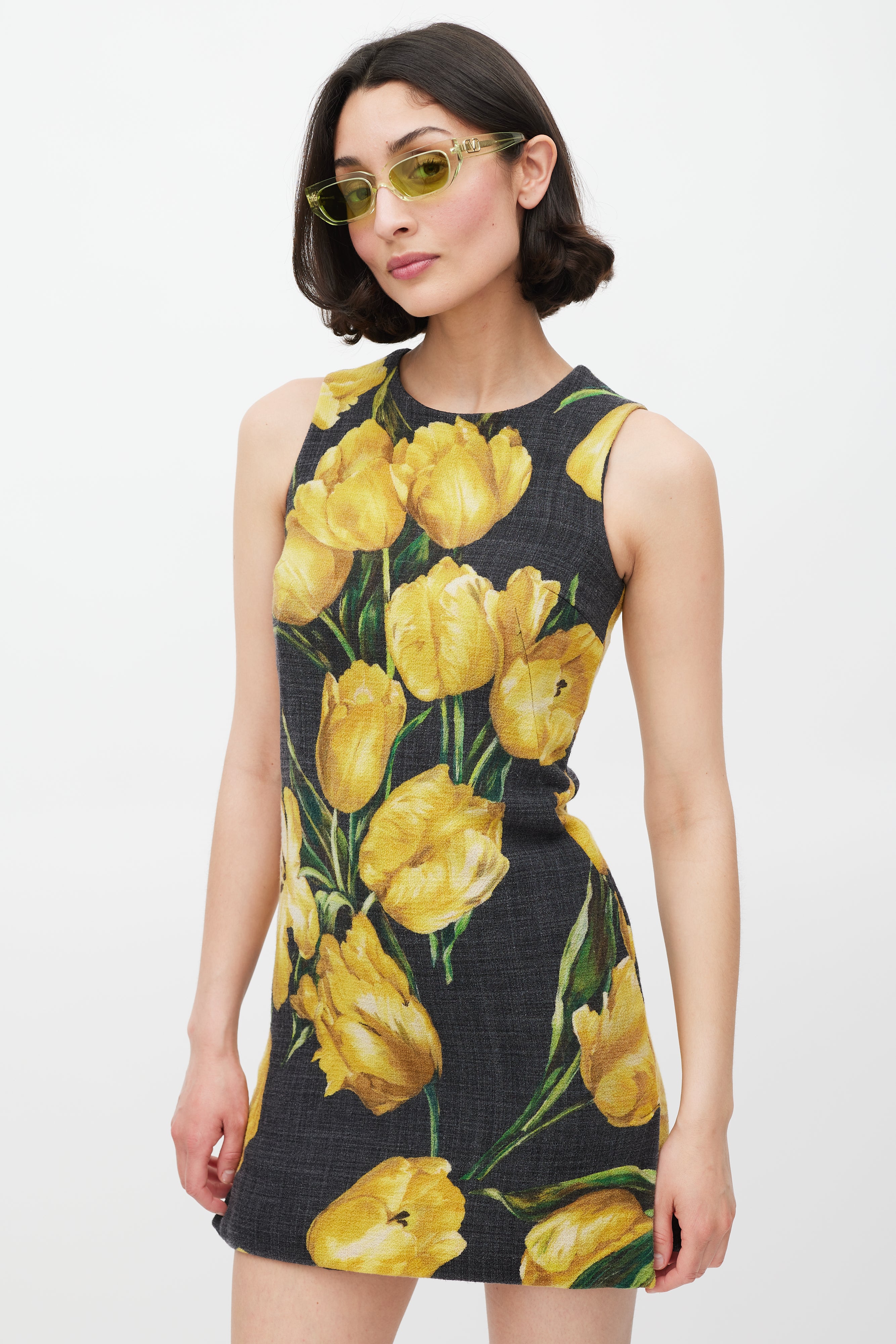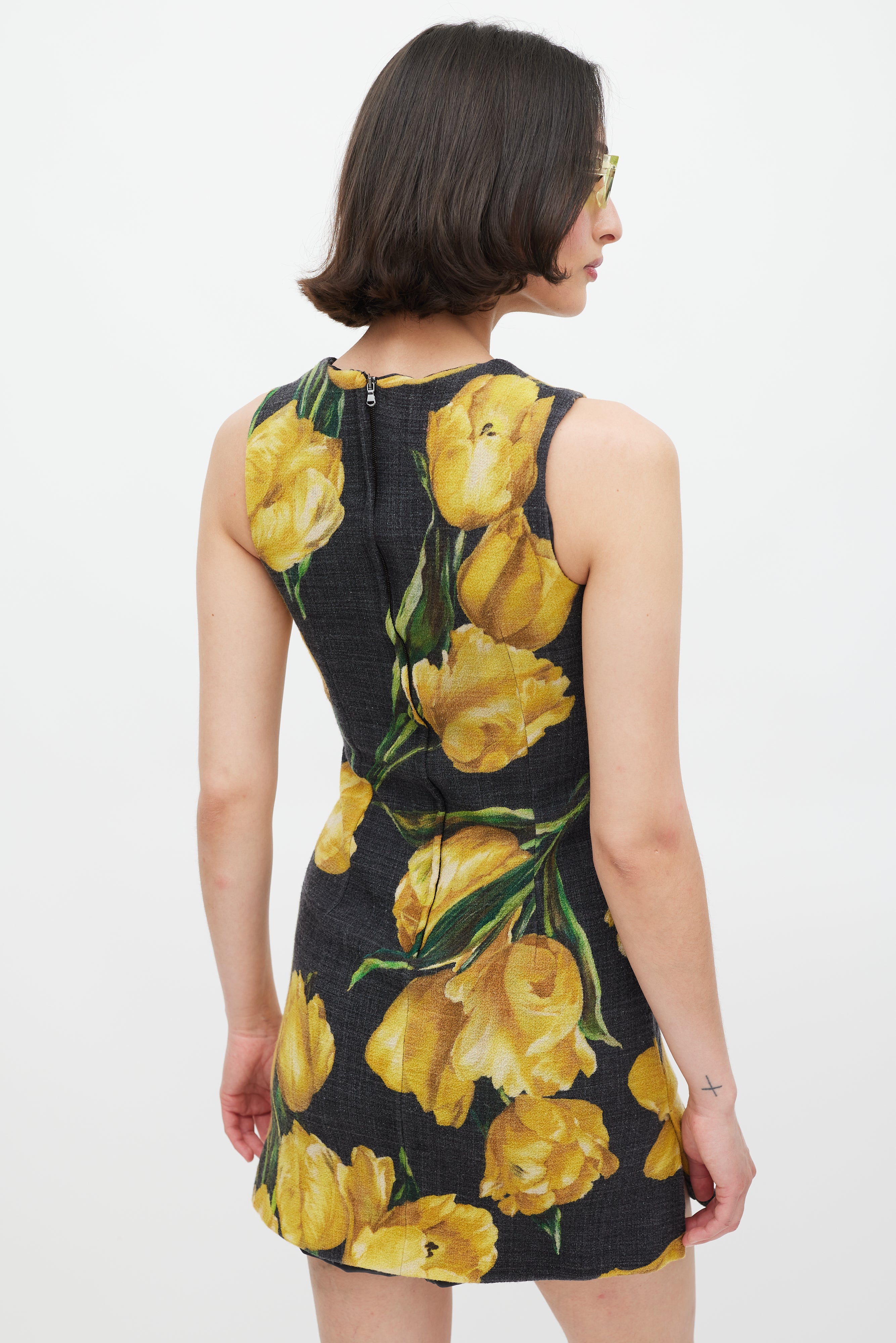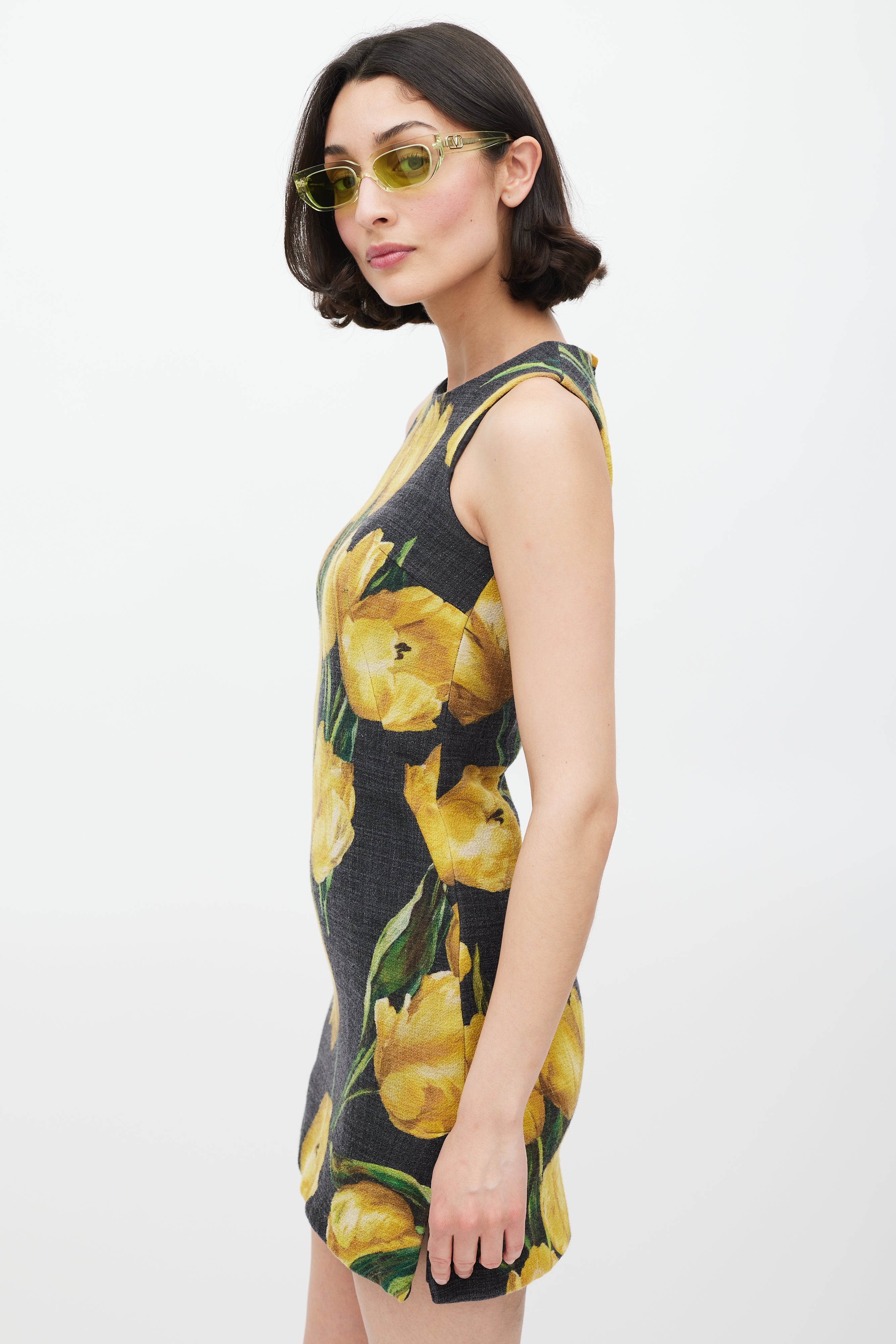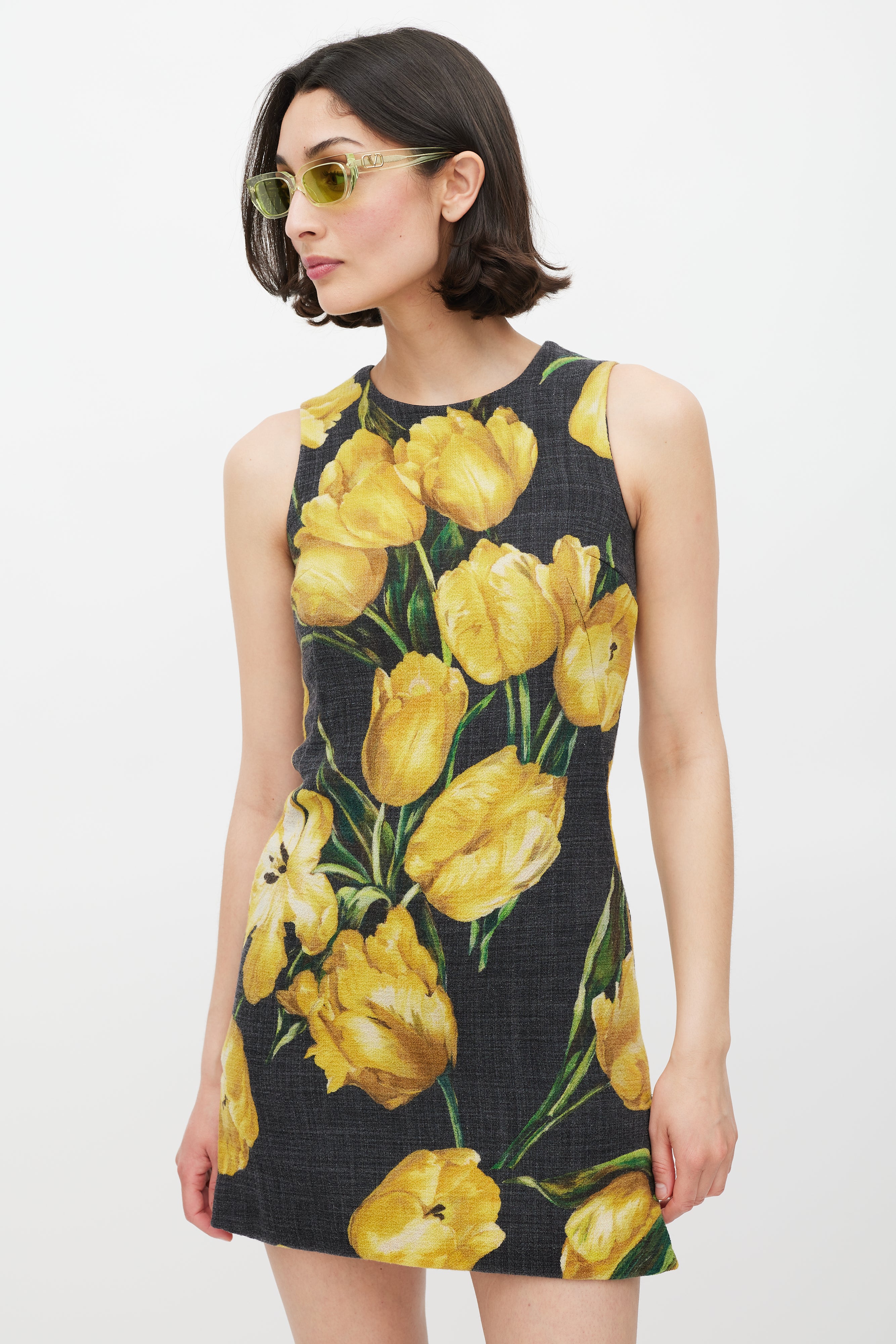 Pre-owned Dolce & Gabbana dark grey wool sleeveless mini shift dress featuring a yellow and green tulip print throughout, round neckline, darting at bodice, side slits, and concealed back zip. Lined.