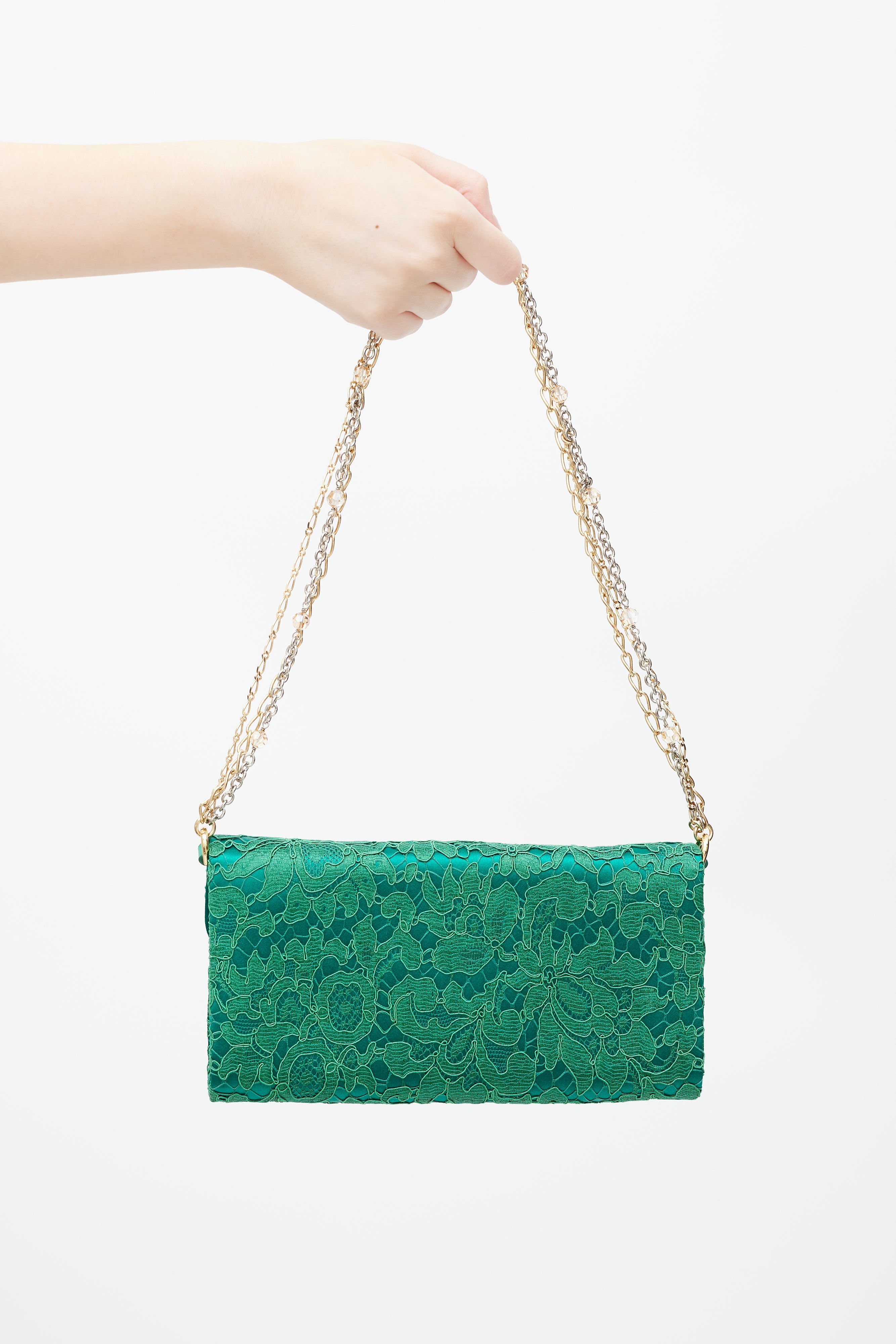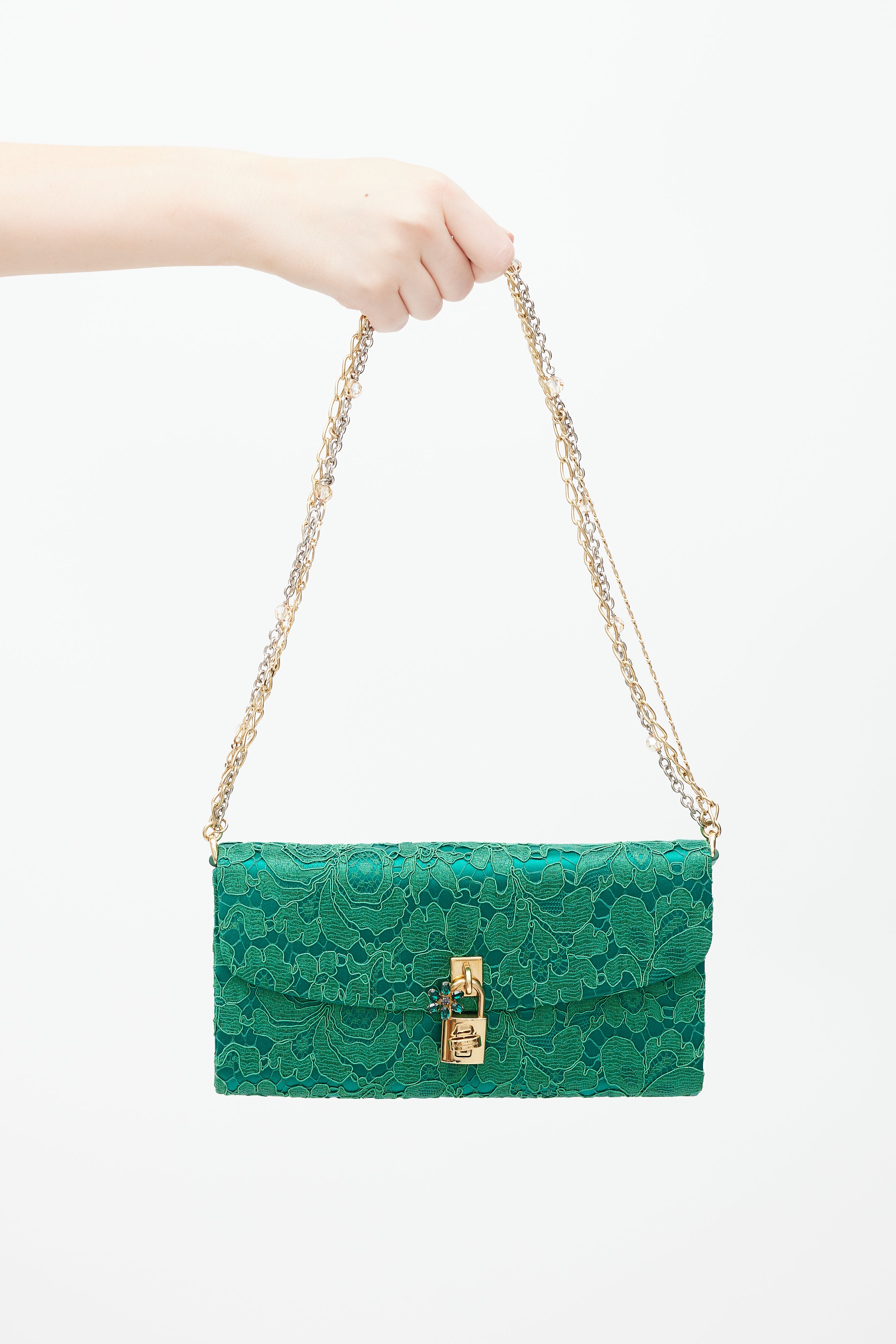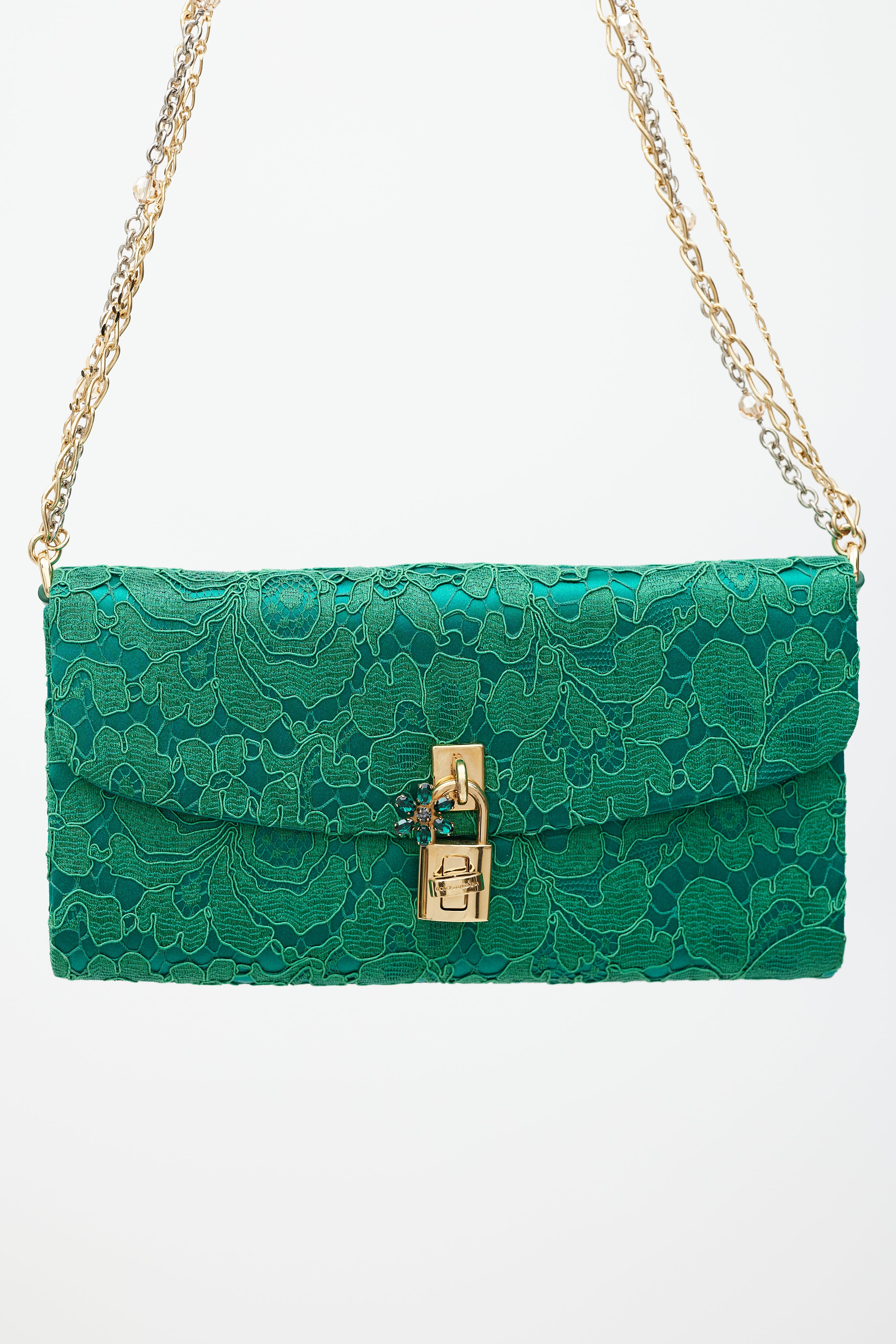 Pre-owned Dolce & Gabbana green Borsa De Sera bag featuring a top flap, tonal floral lace detailing, one main compartment with two slip pockets, beaded chainlink shoulder strap, reflective mirror tab, and gold tone jewel twist lock closure. Comes with original dust bag.
