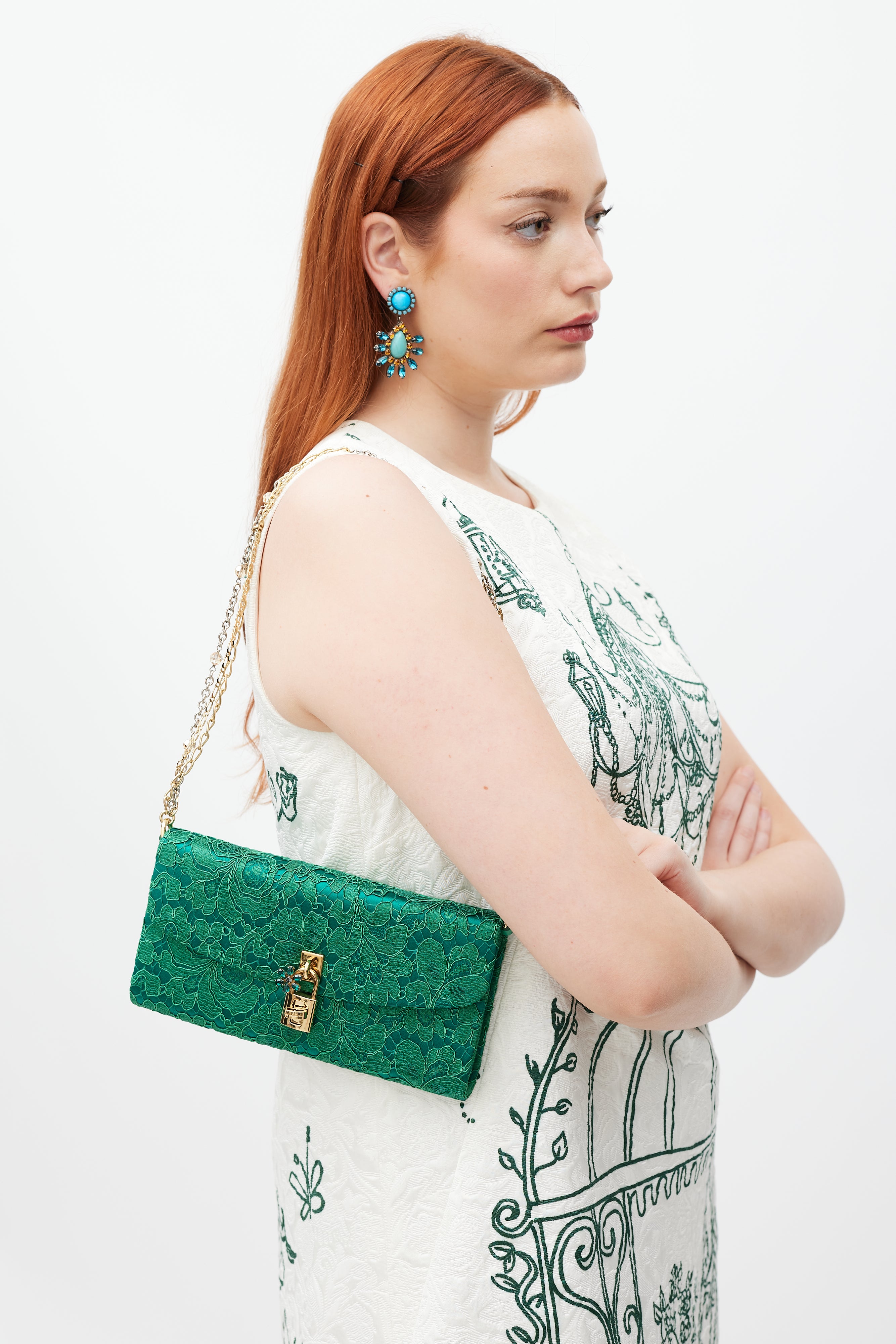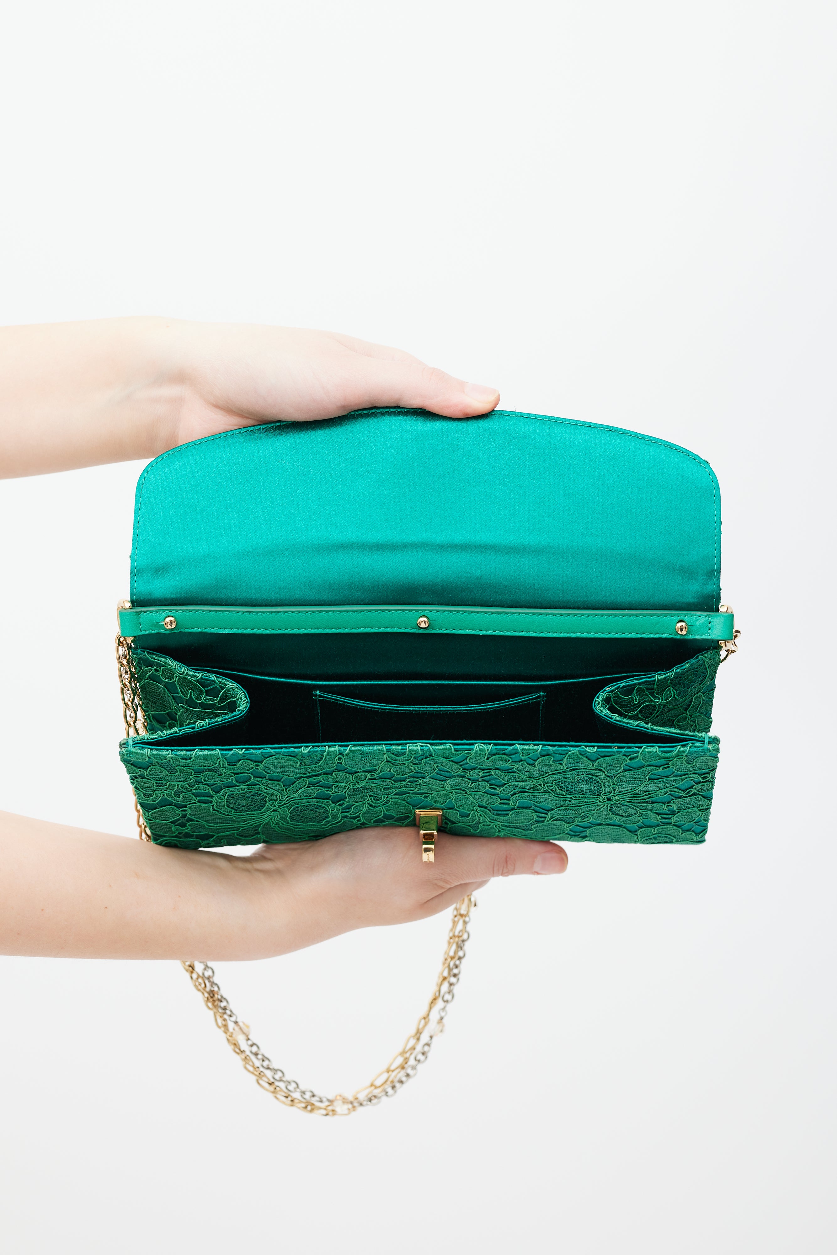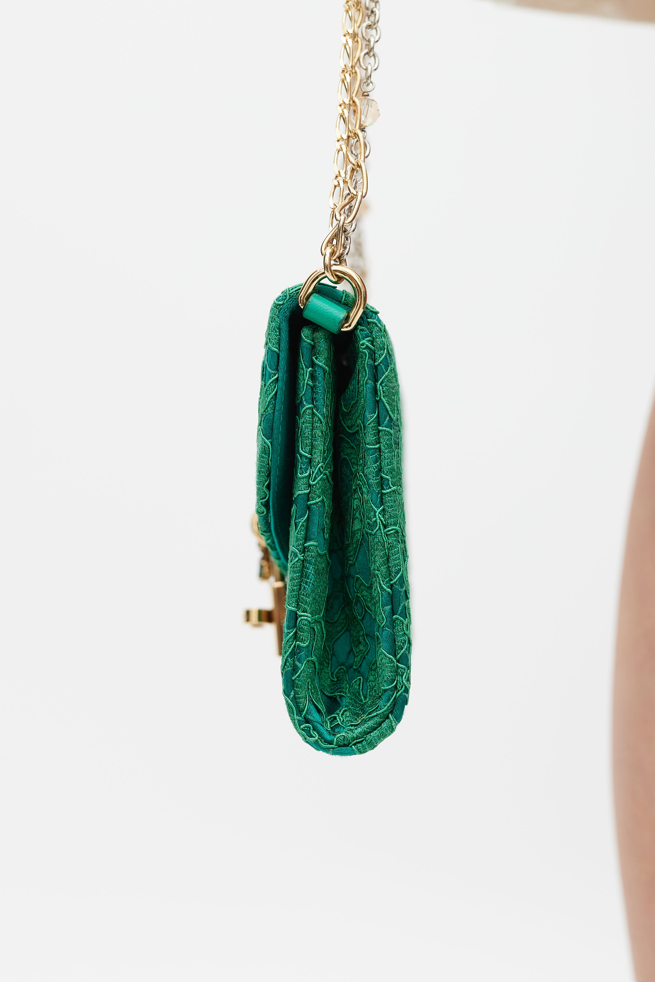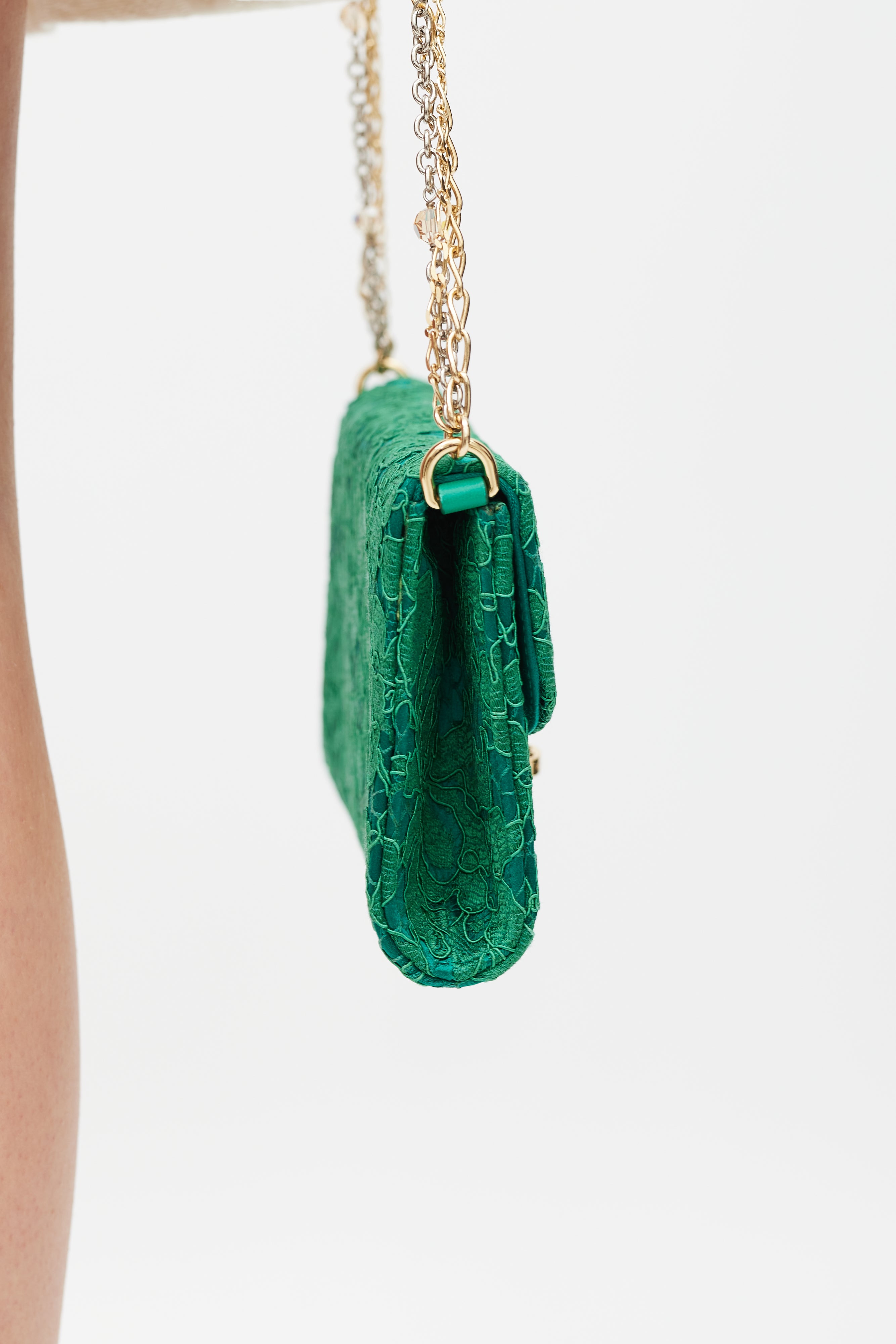 Pre-owned Dolce & Gabbana green Borsa De Sera bag featuring a top flap, tonal floral lace detailing, one main compartment with two slip pockets, beaded chainlink shoulder strap, reflective mirror tab, and gold tone jewel twist lock closure. Comes with original dust bag.