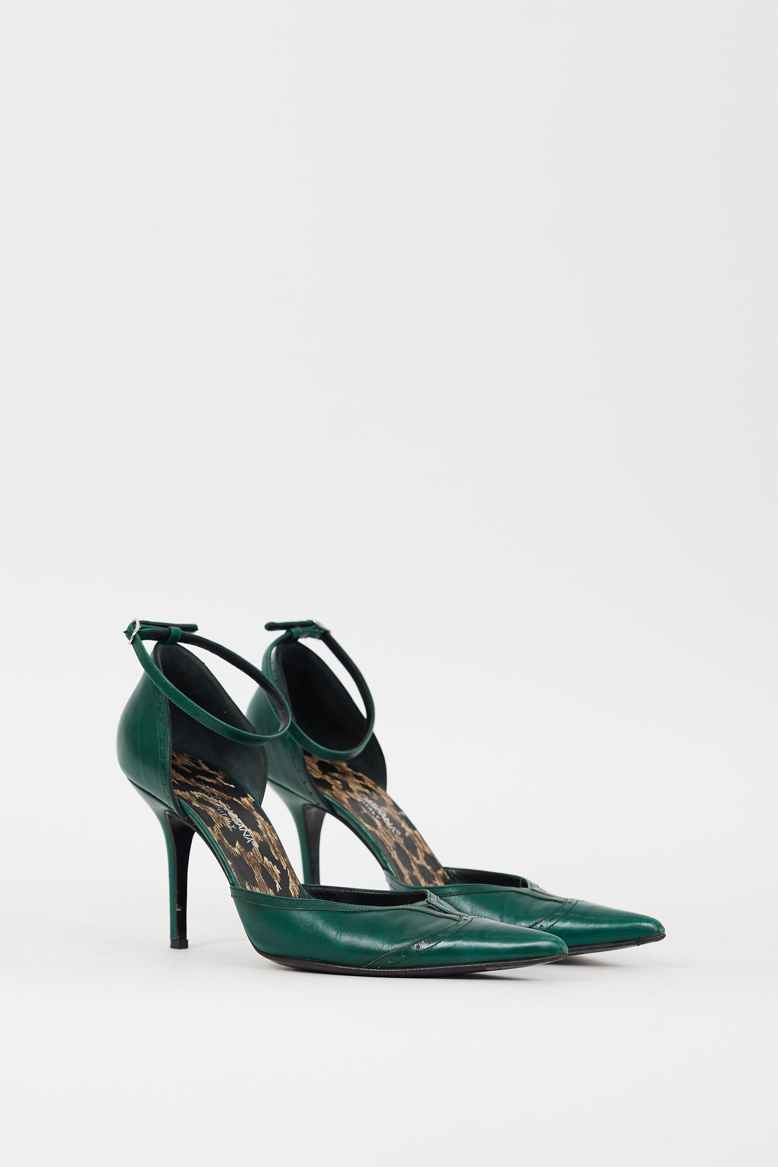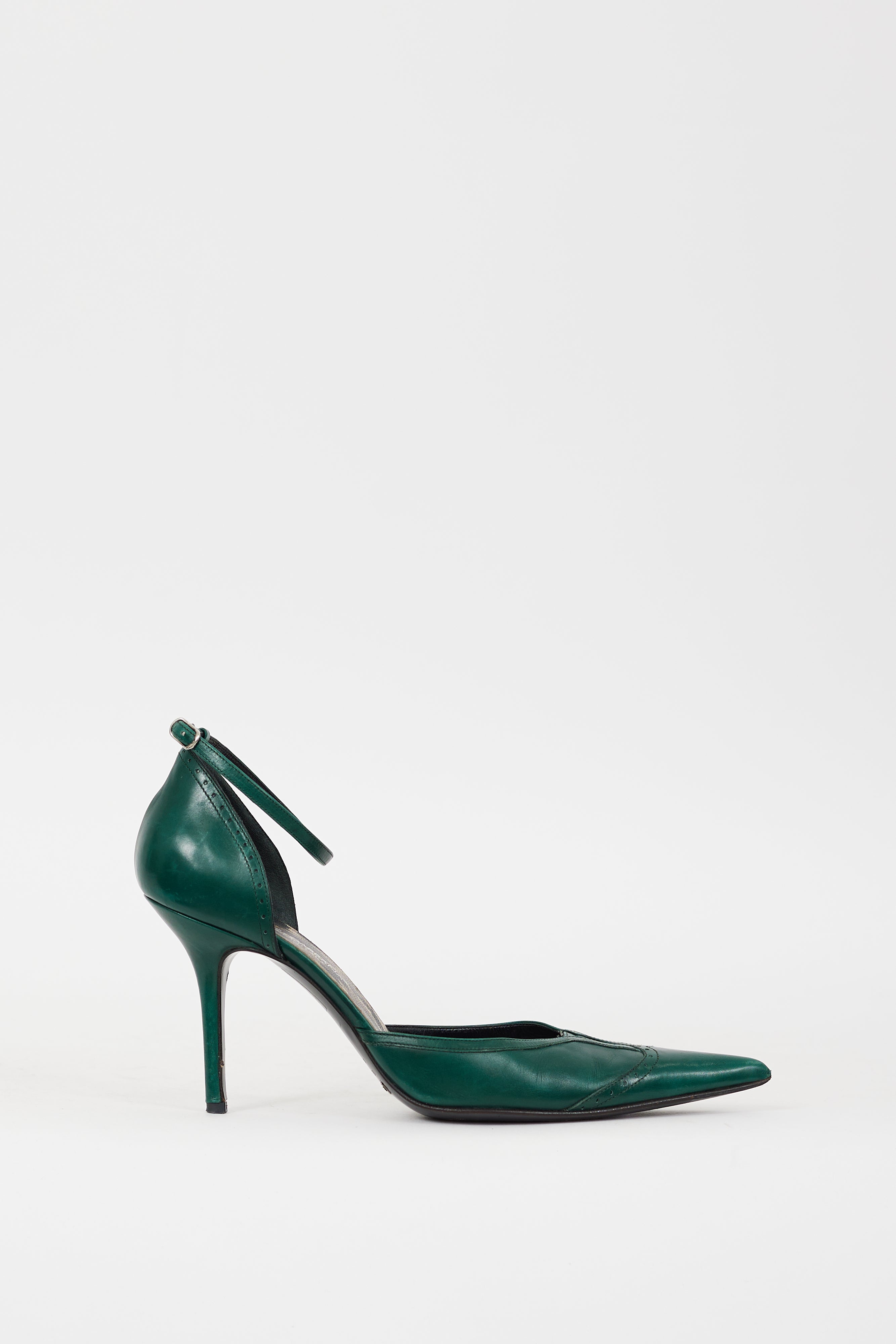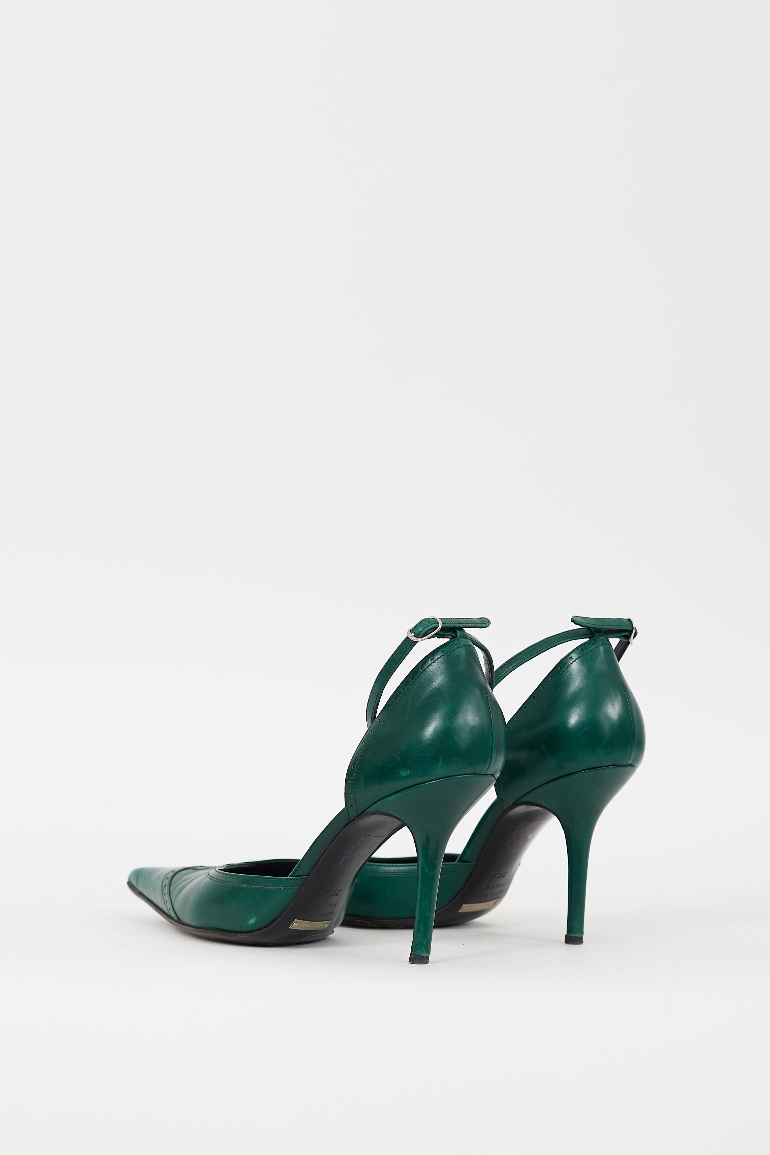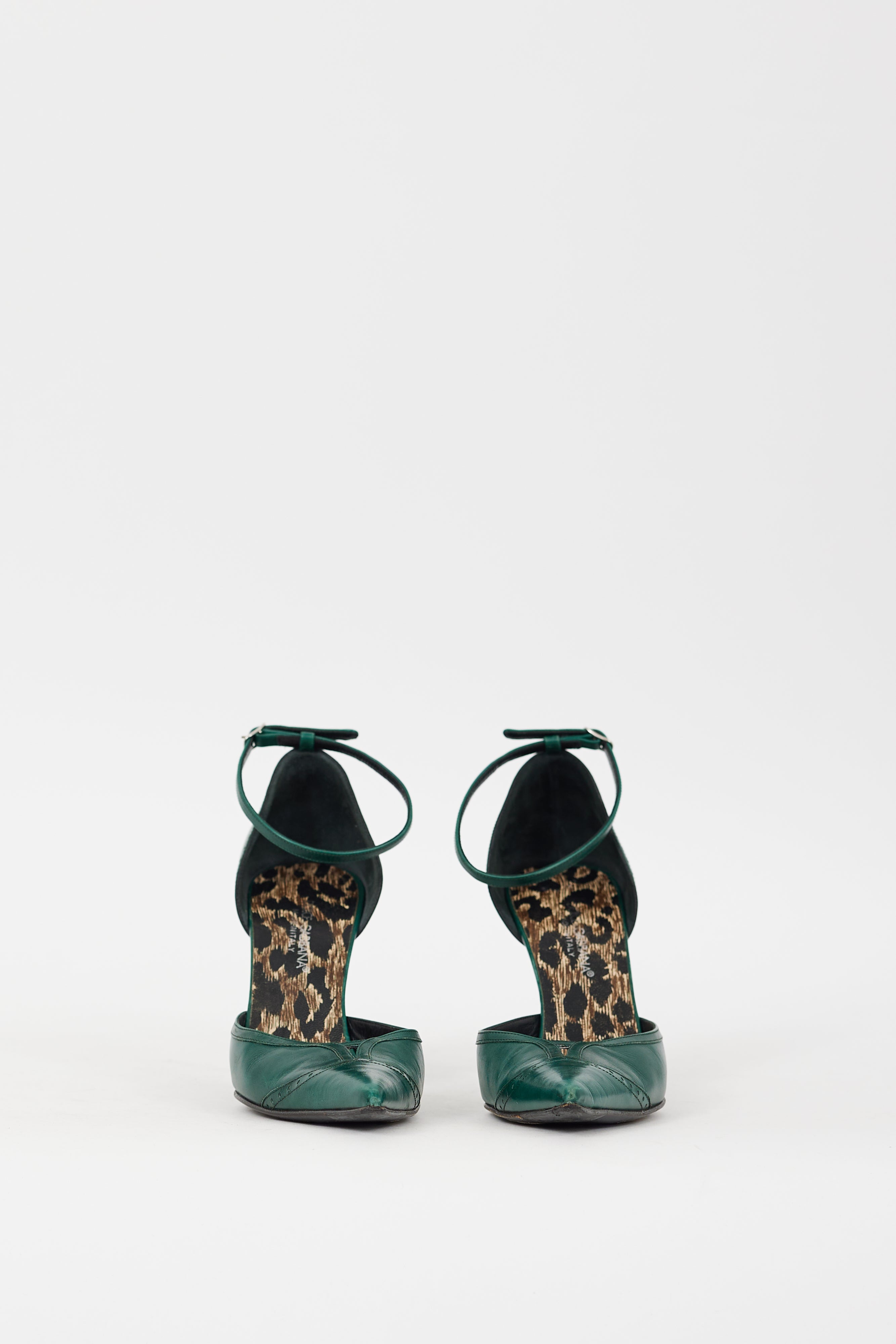 Pre-owned Dolce & Gabbana green leather pumps featuring a pointed toe, D'Orsay design with perforated trim detail, adjustable ankle strap, and covered stiletto heel.
