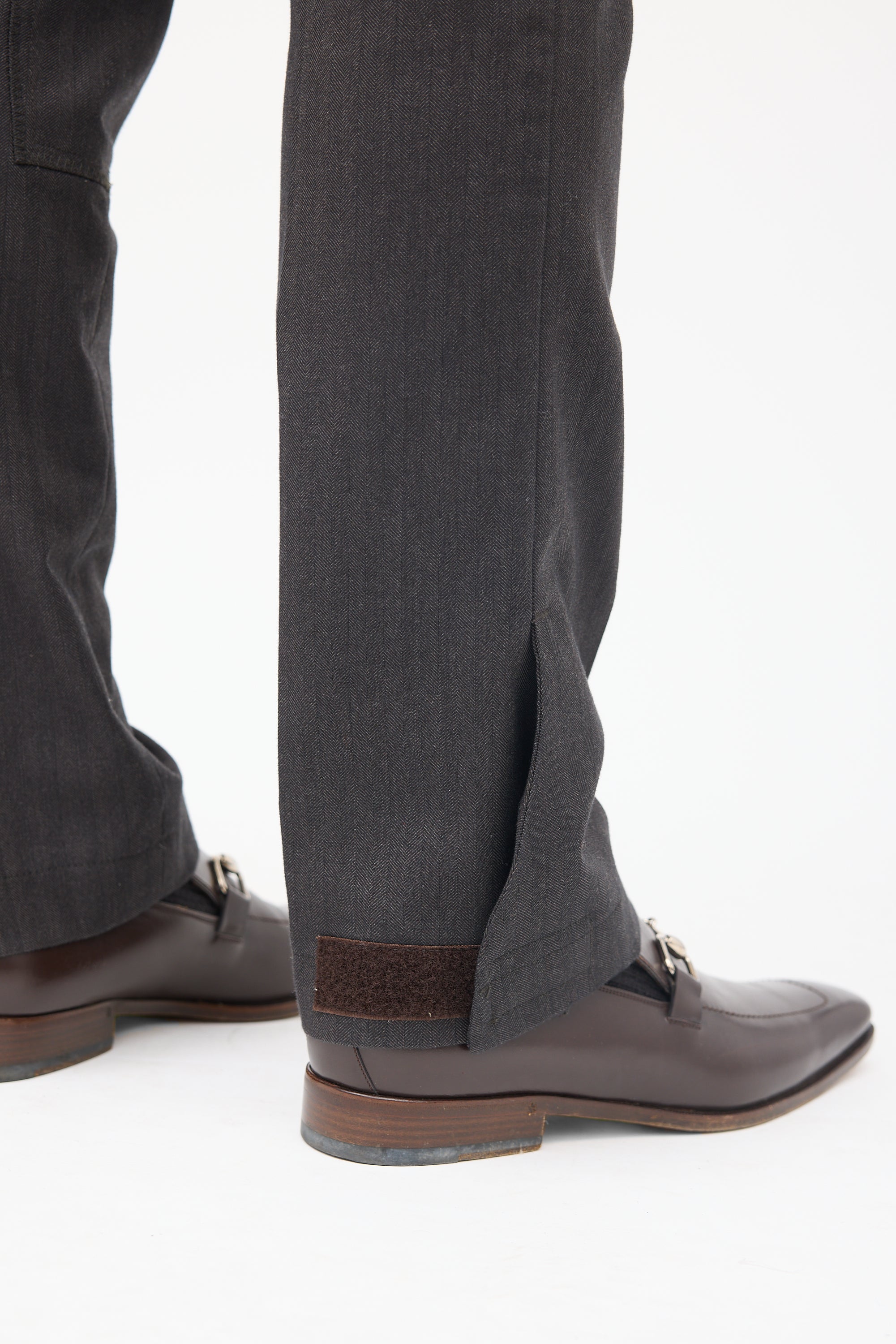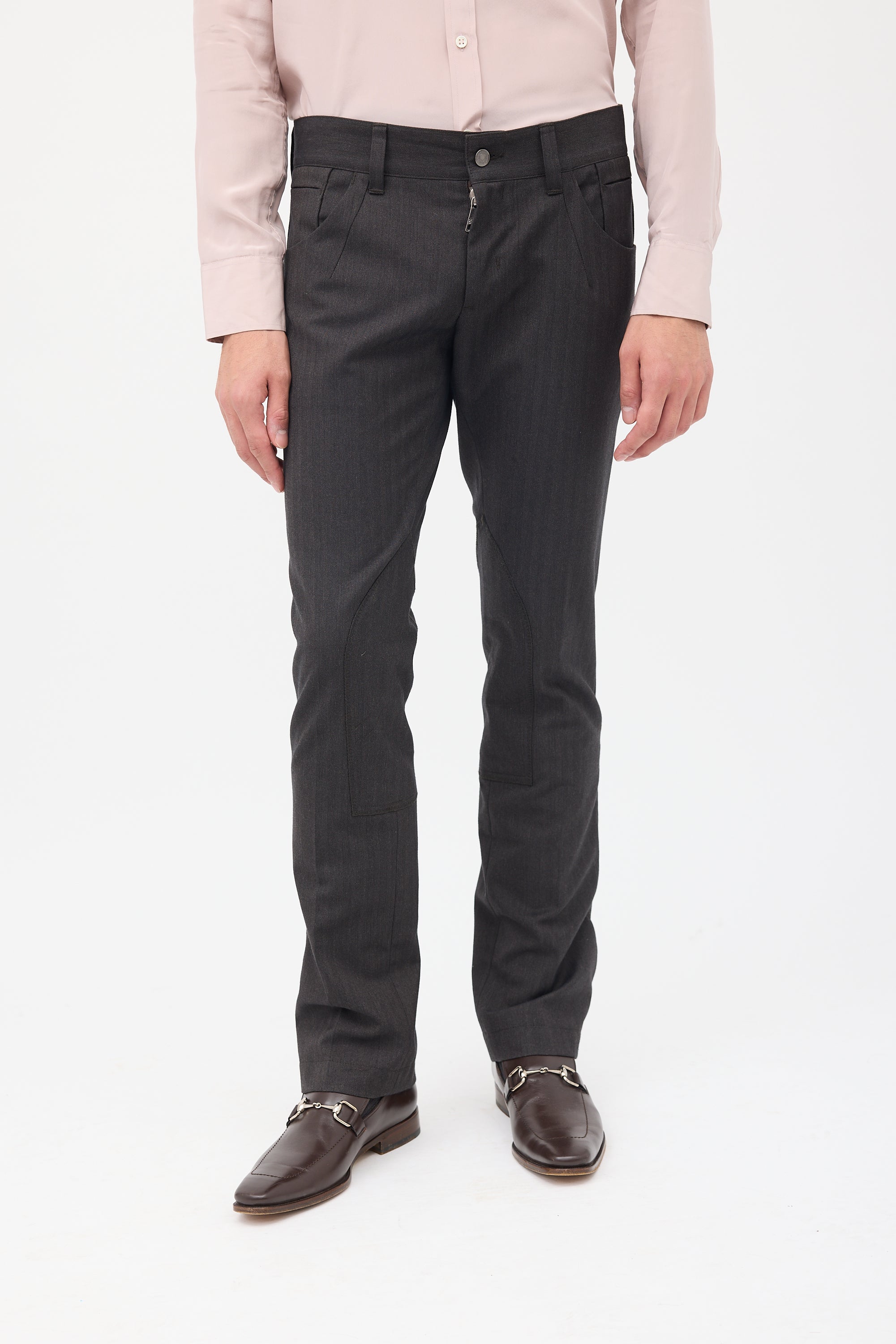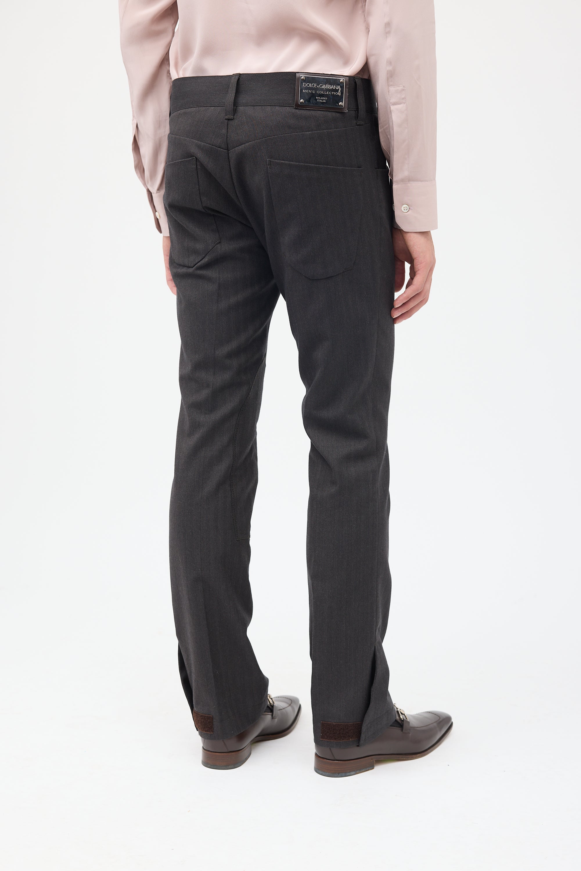 Pre-owned Dolce & Gabbana grey wool trousers featuring low rise, oversized zip fly, belt loops, two slash pockets at front with two coin pockets, two welt pockets at back, silver tone logo plaque at back, panelled detail at knees, and Velcro ankle cuffs.