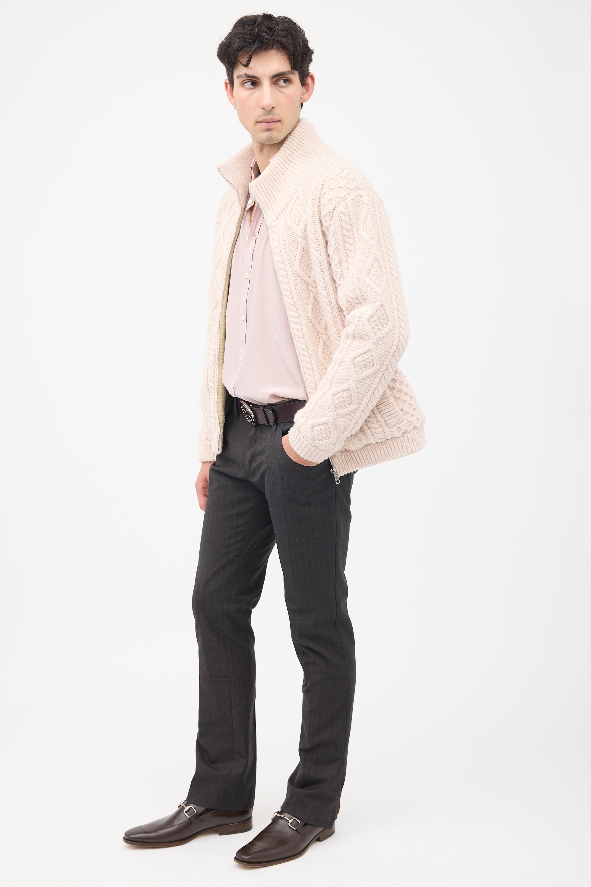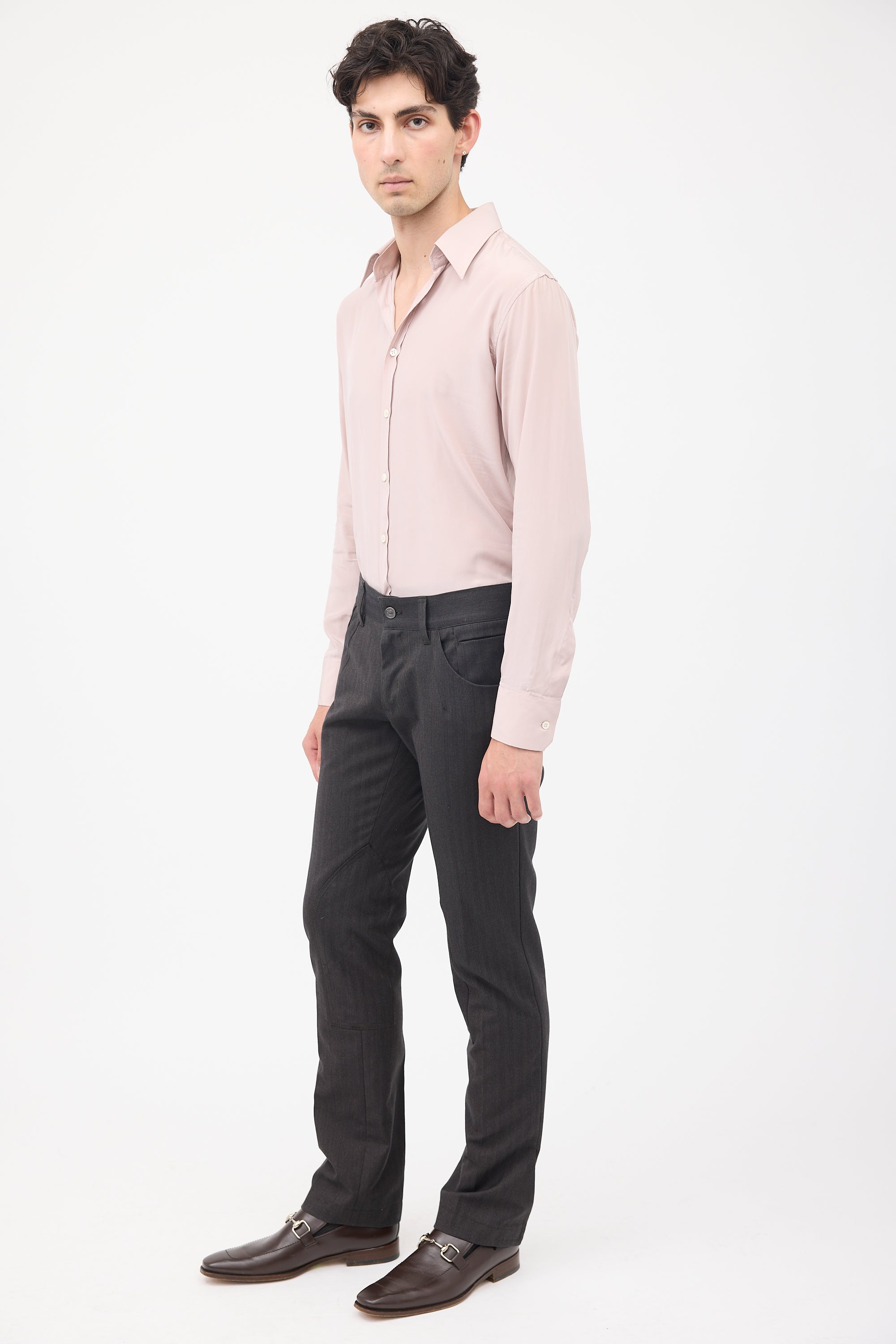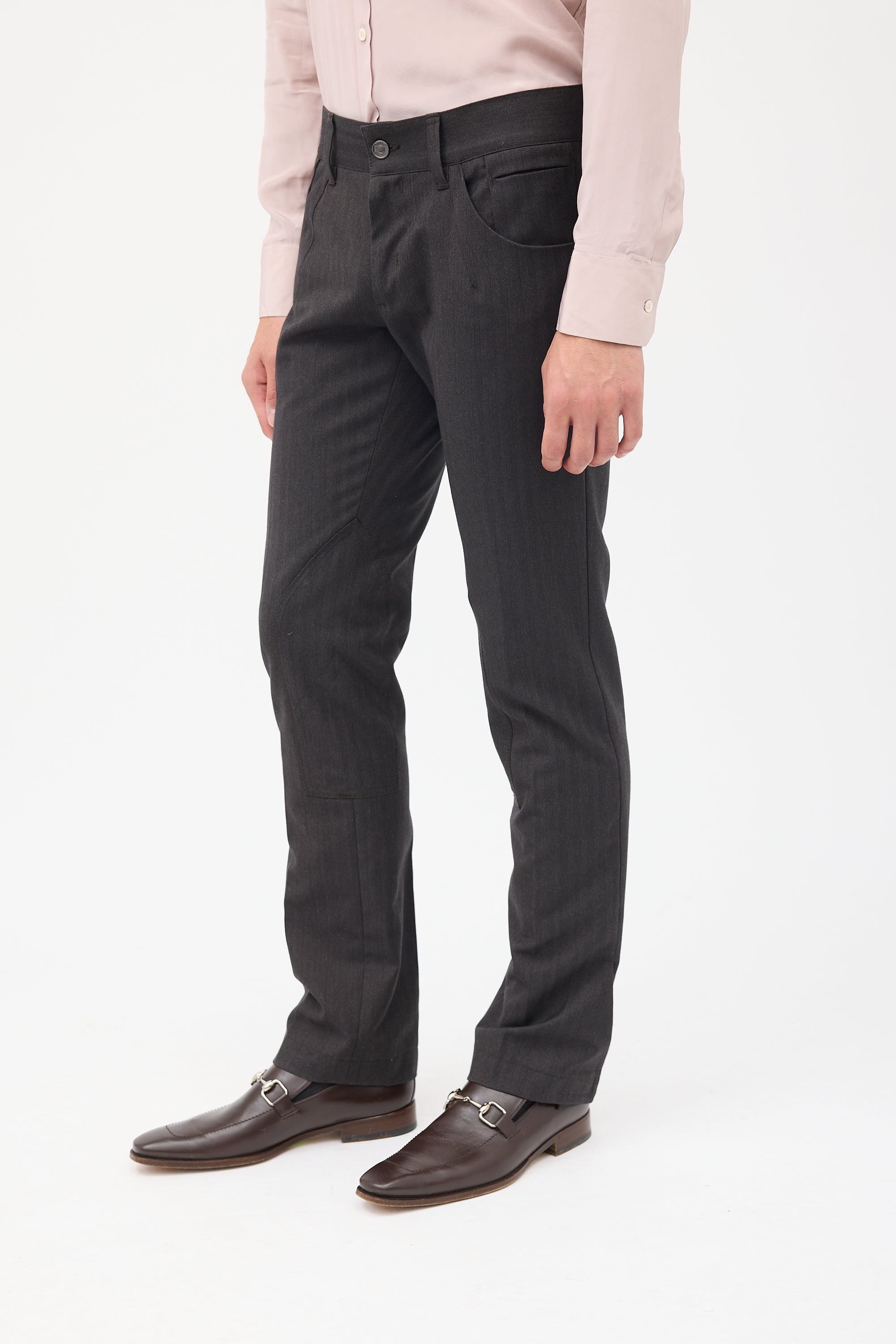 Pre-owned Dolce & Gabbana grey wool trousers featuring low rise, oversized zip fly, belt loops, two slash pockets at front with two coin pockets, two welt pockets at back, silver tone logo plaque at back, panelled detail at knees, and Velcro ankle cuffs.