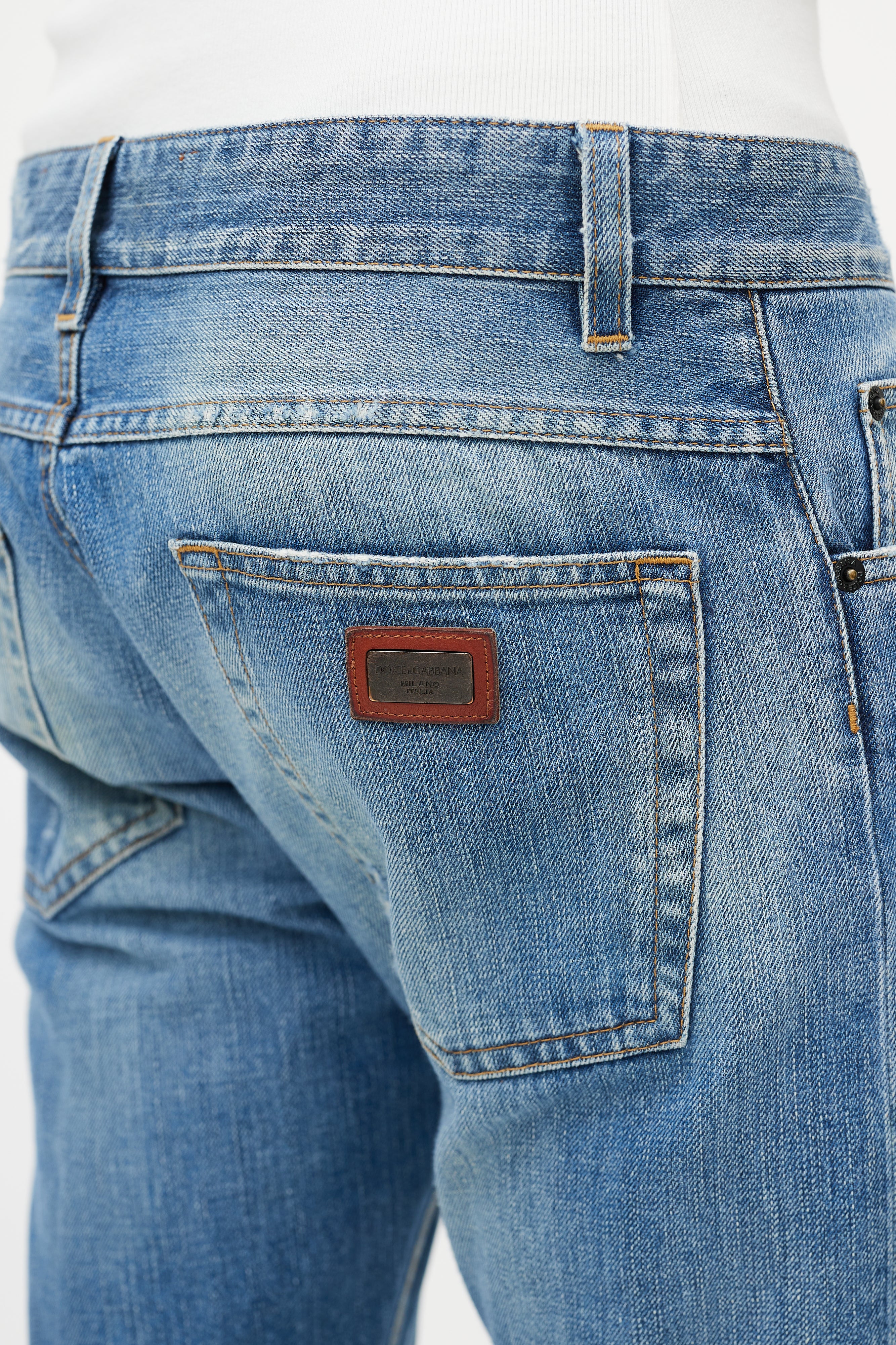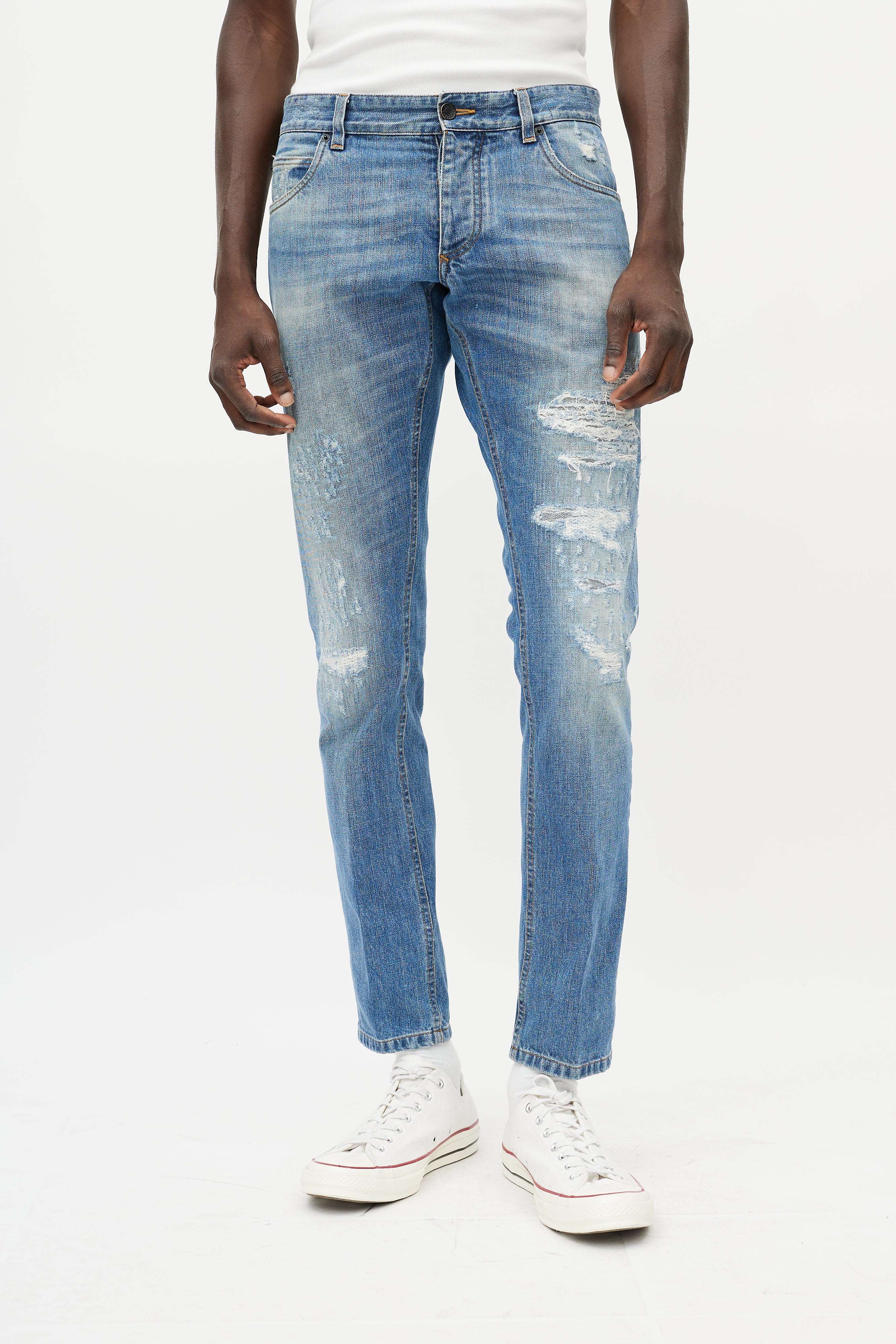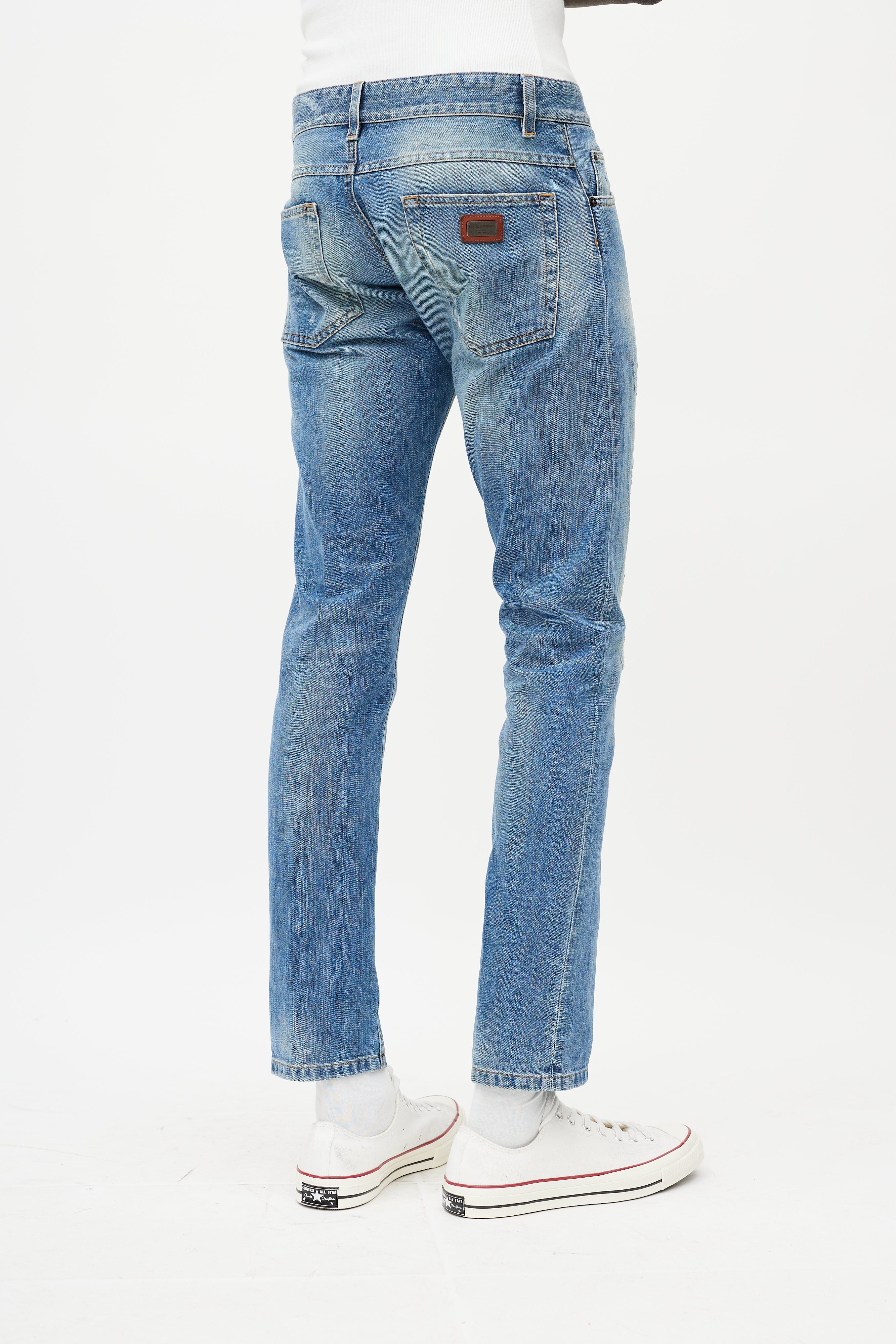 Pre-owned Dolce & Gabbana light wash jeans featuring belt loops, button fly, five pocket styling, leather tag at waist lining, slim leg, and purposeful distressing throughout.