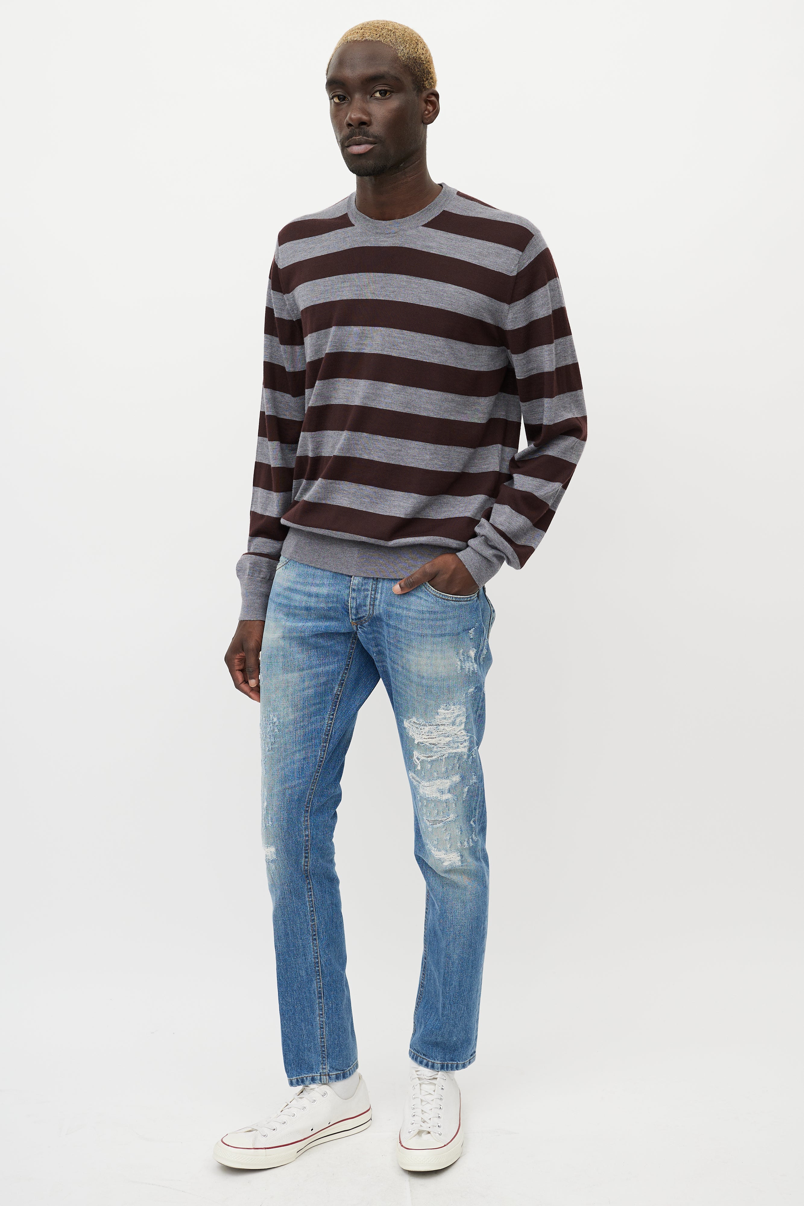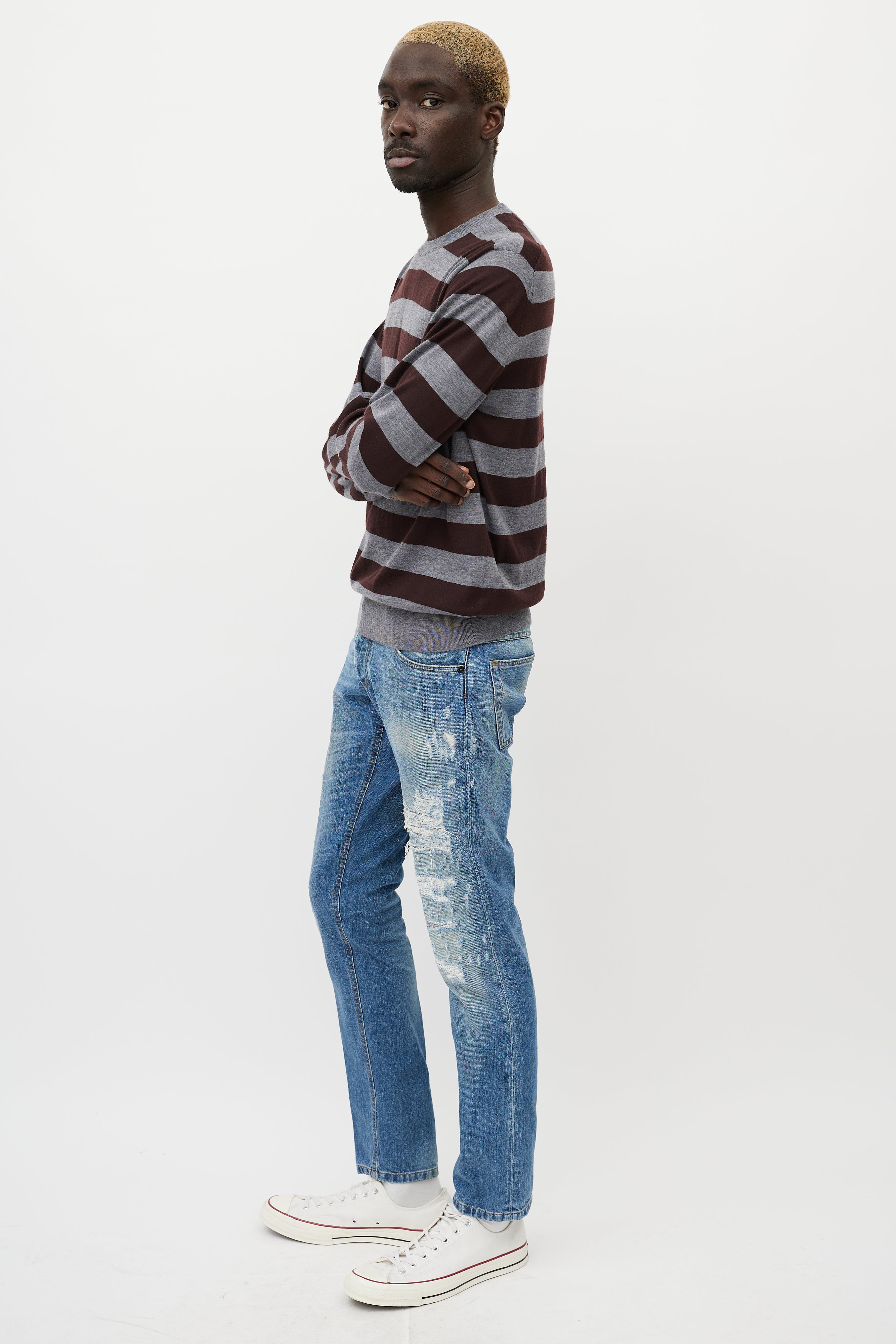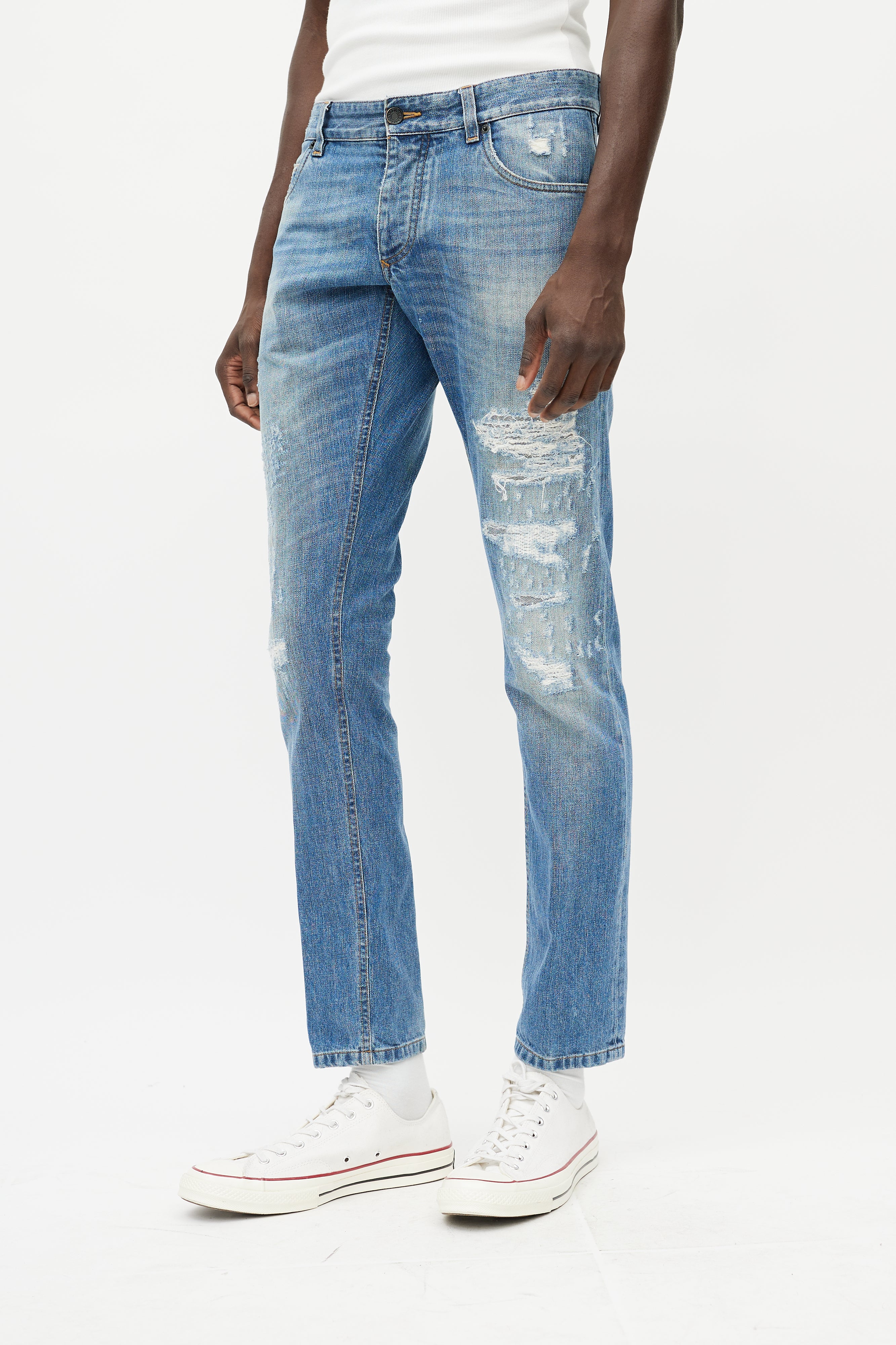 Pre-owned Dolce & Gabbana light wash jeans featuring belt loops, button fly, five pocket styling, leather tag at waist lining, slim leg, and purposeful distressing throughout.