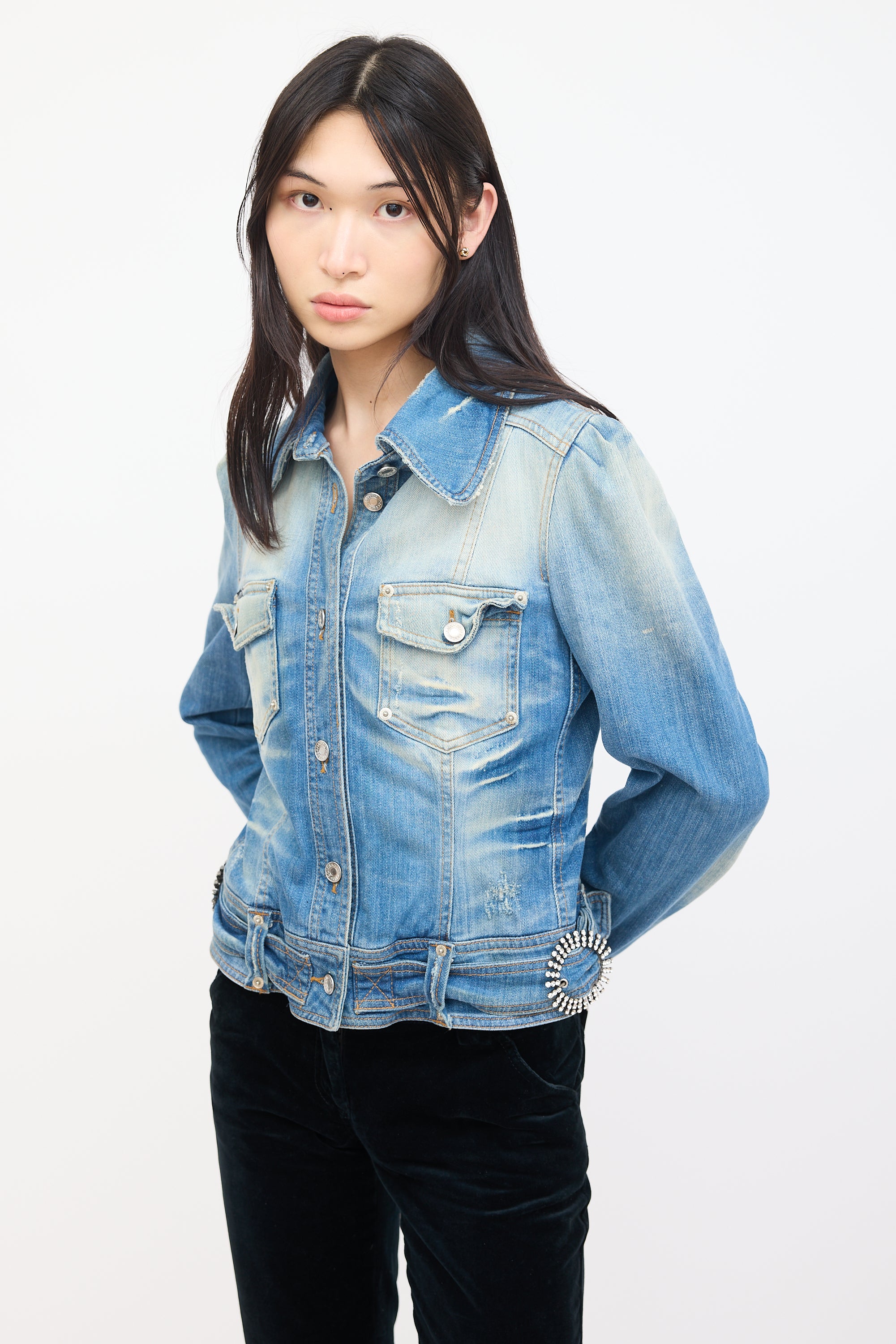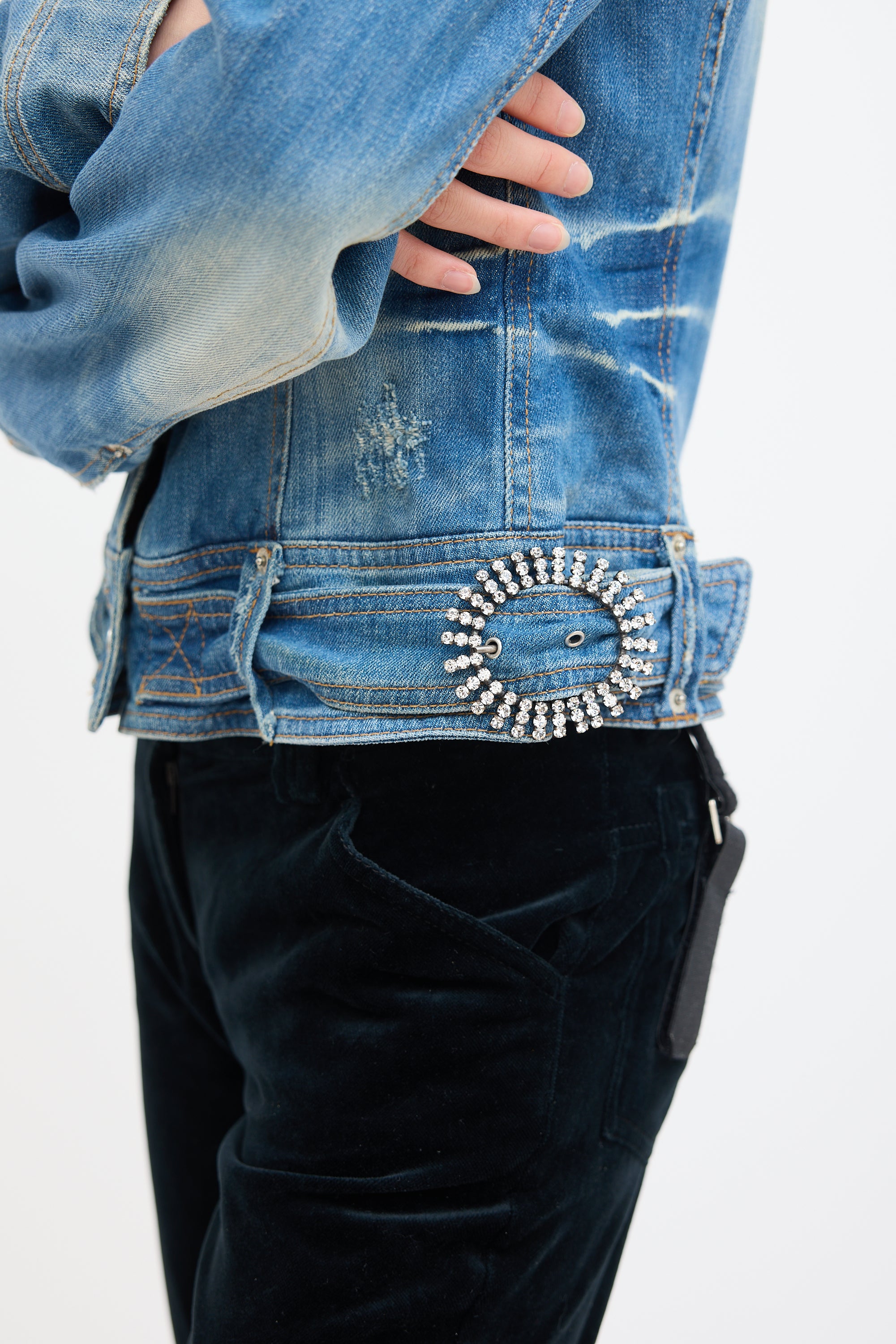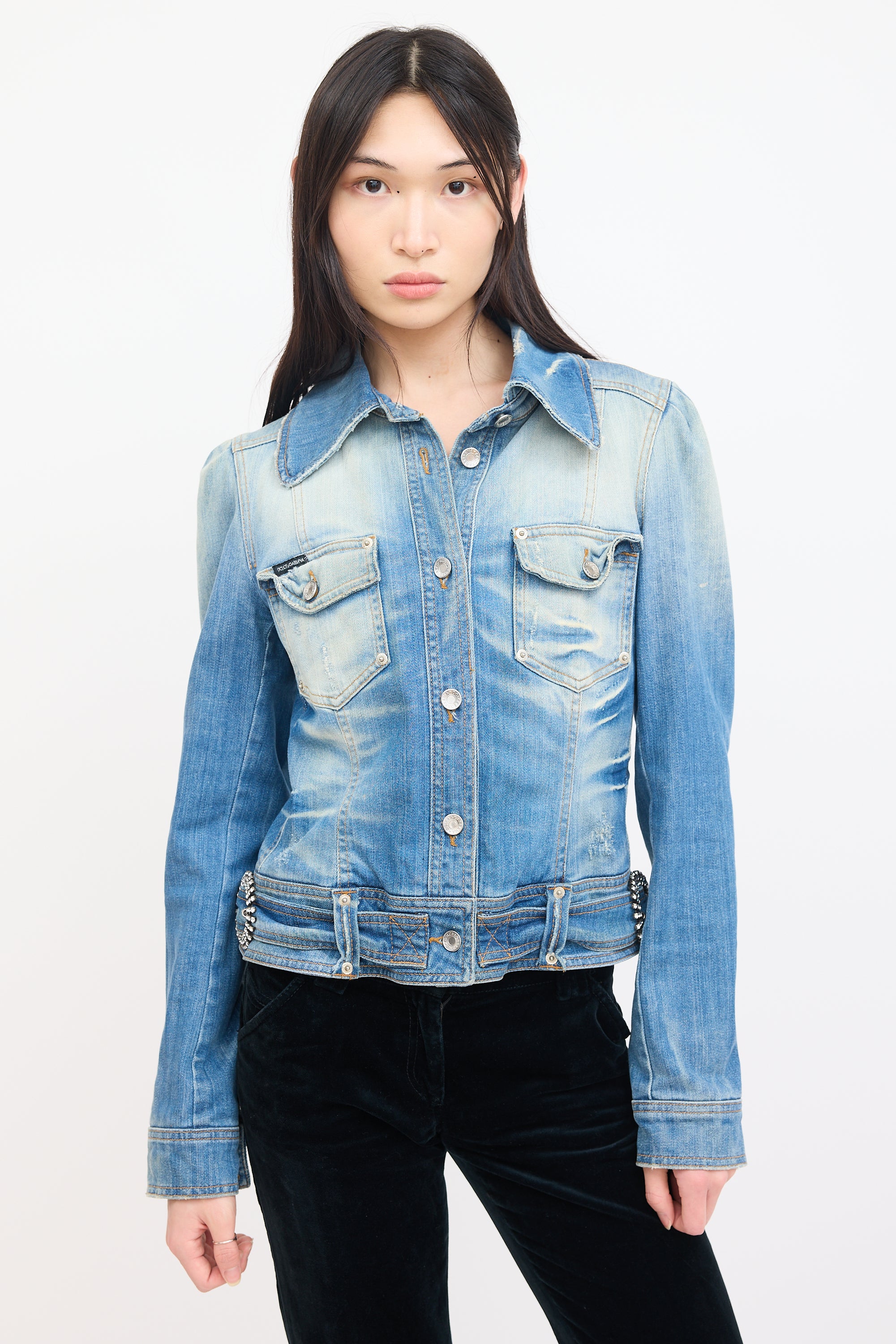 Pre-owned Dolce & Gabbana medium wash denim jacket featuring spread collar, button up front, two flap pockets at chest, waist adjusters with three crystal buckle fastenings at sides and back, long sleeves with buttoned cuffs, leopard lining, and intentional distressed hem. Lined.