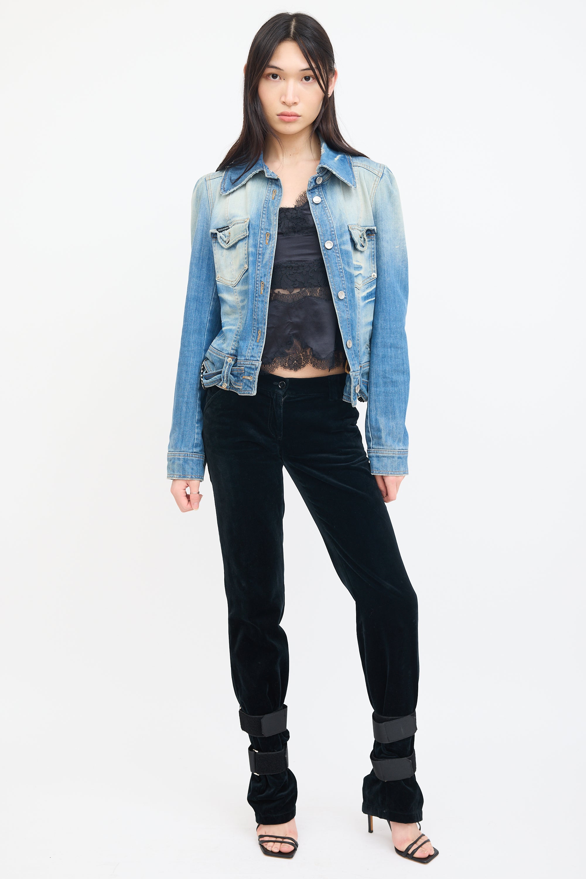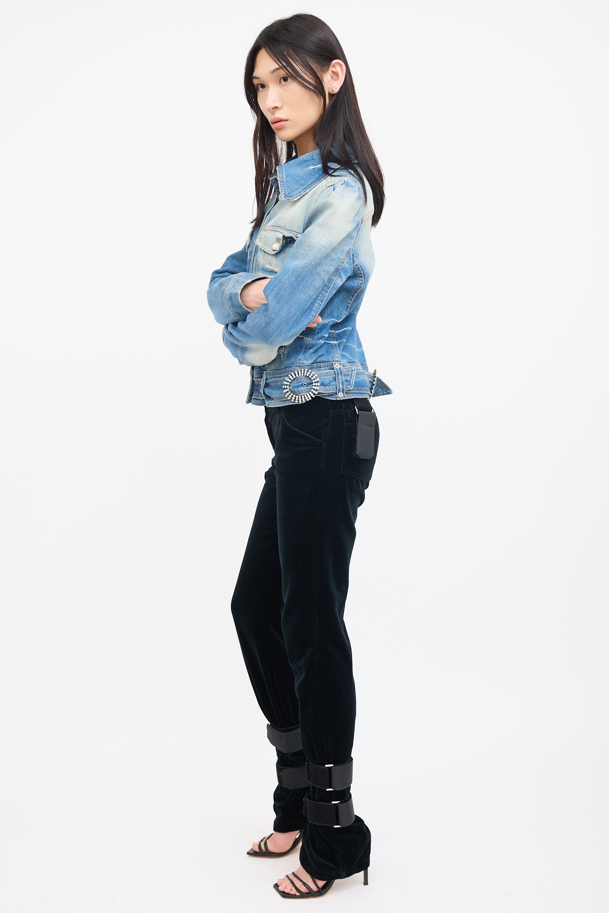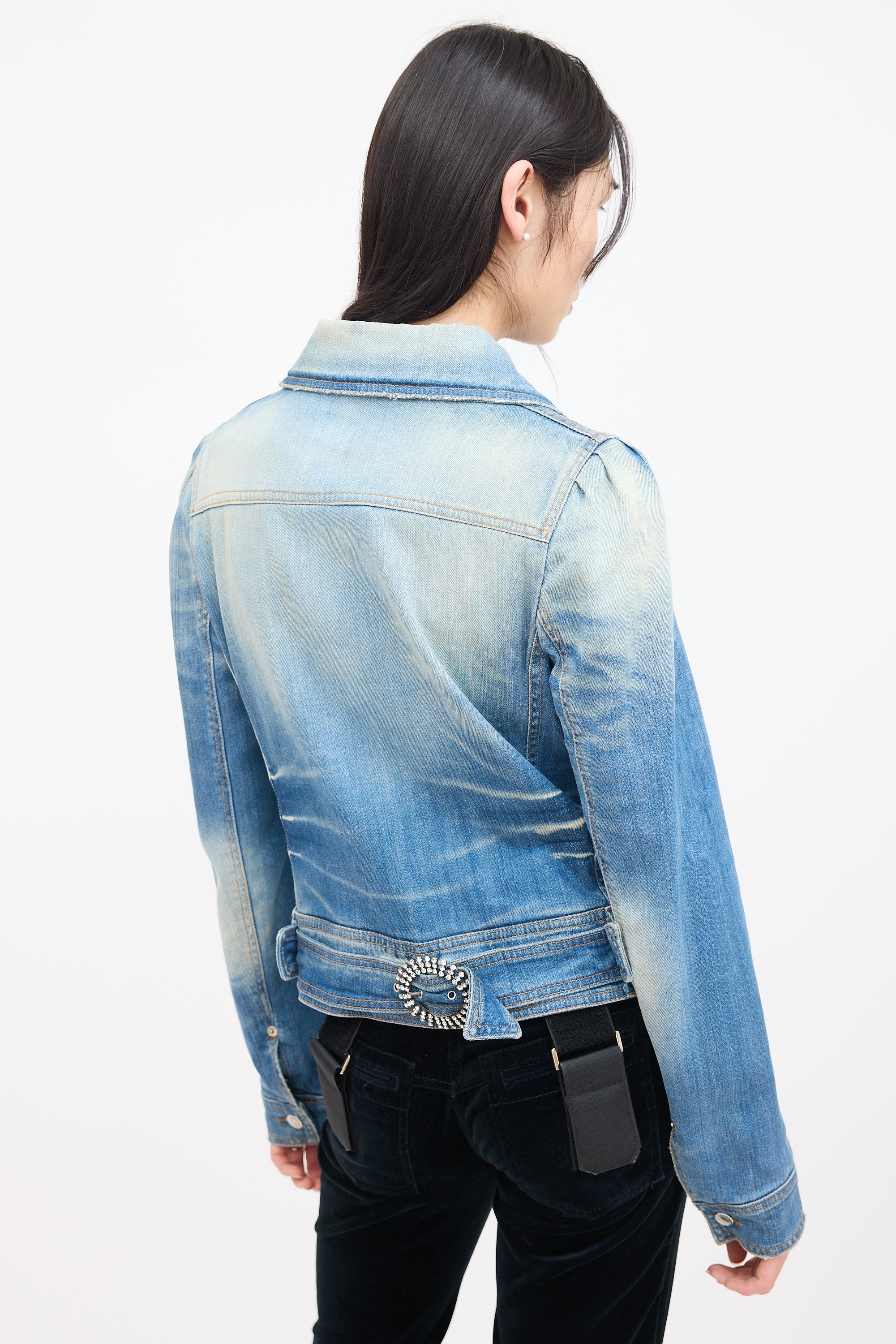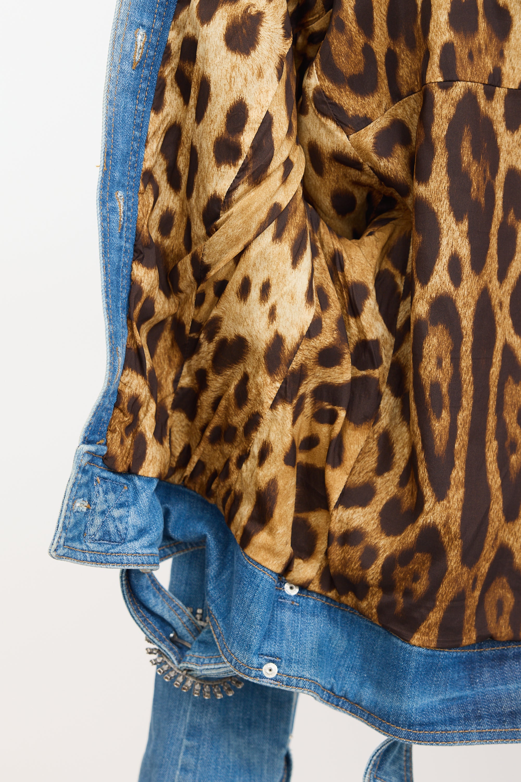Pre-owned Dolce & Gabbana medium wash denim jacket featuring spread collar, button up front, two flap pockets at chest, waist adjusters with three crystal buckle fastenings at sides and back, long sleeves with buttoned cuffs, leopard lining, and intentional distressed hem. Lined.