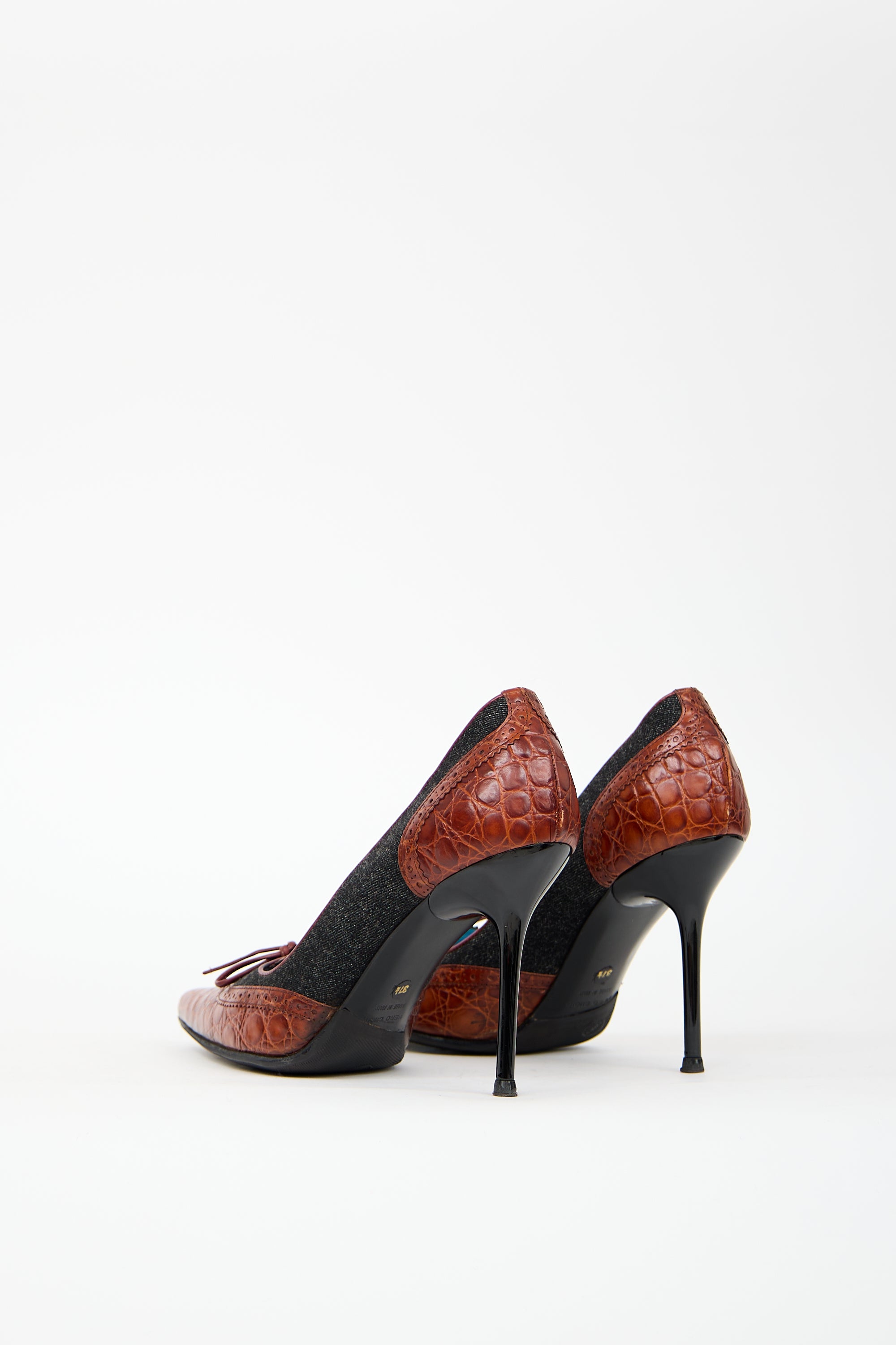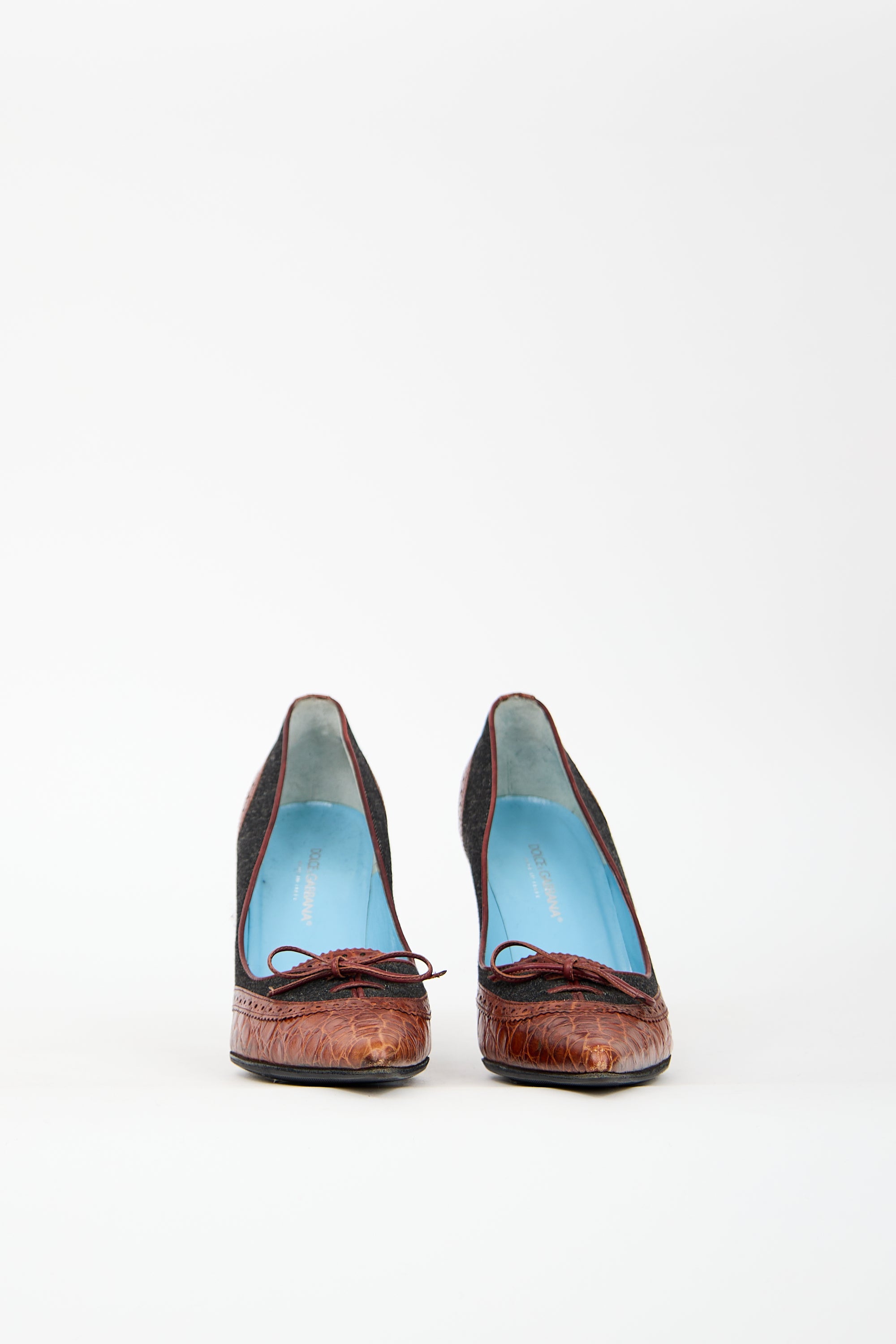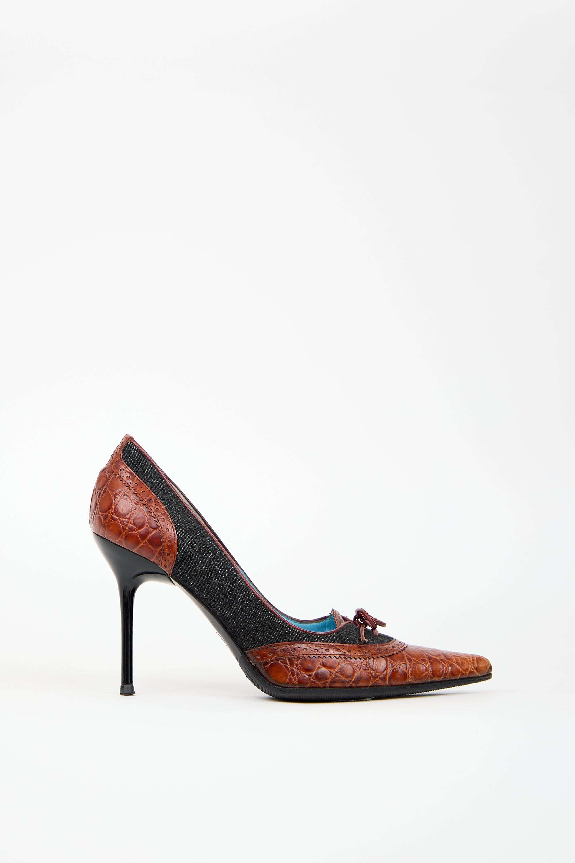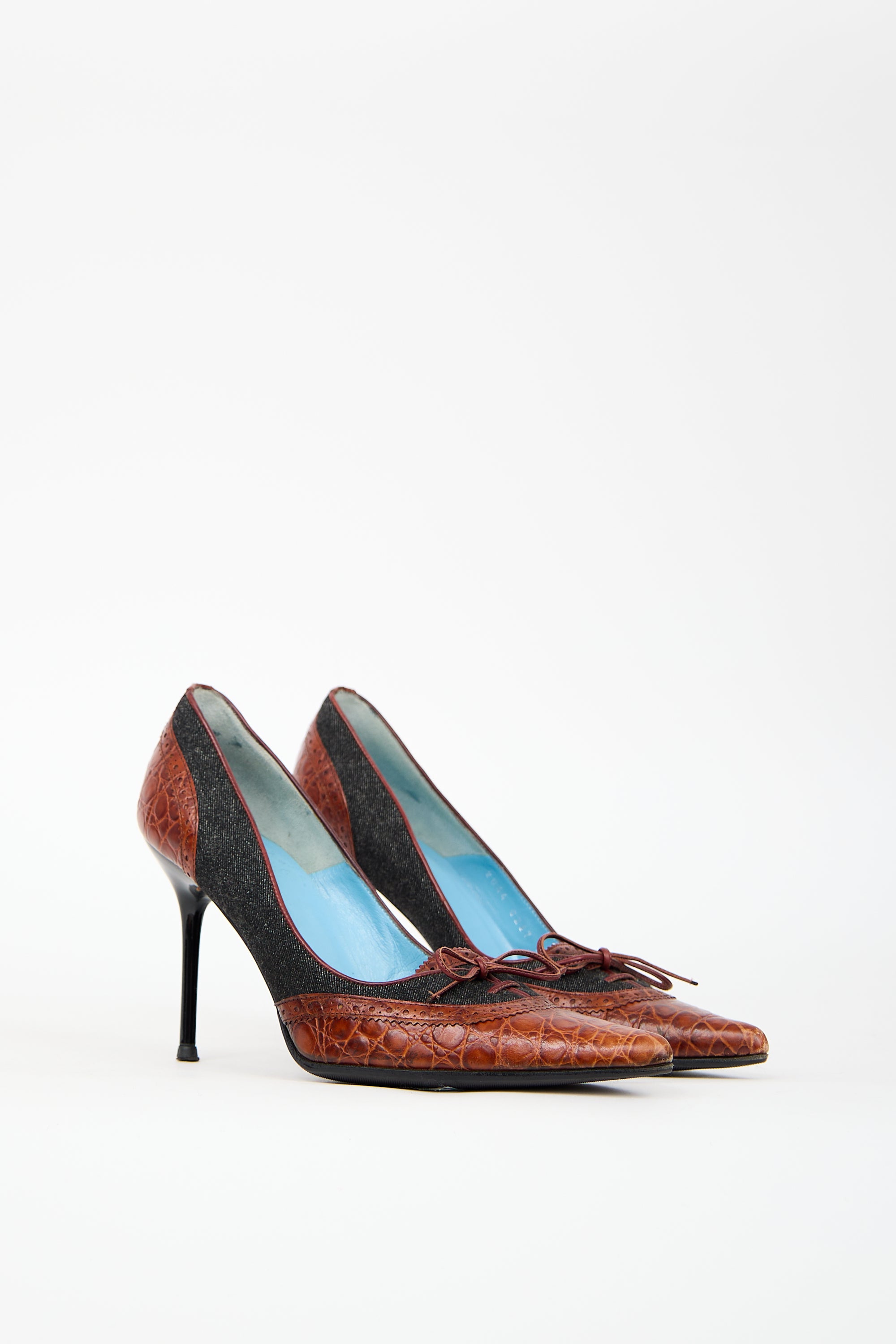 Pre-owned Dolce & Gabbana multicolour denim and textured leather pumps featuring pointed toe, brogue detailing throughout, lace up detail upper, and covered stiletto heel. Comes with original dust bags.