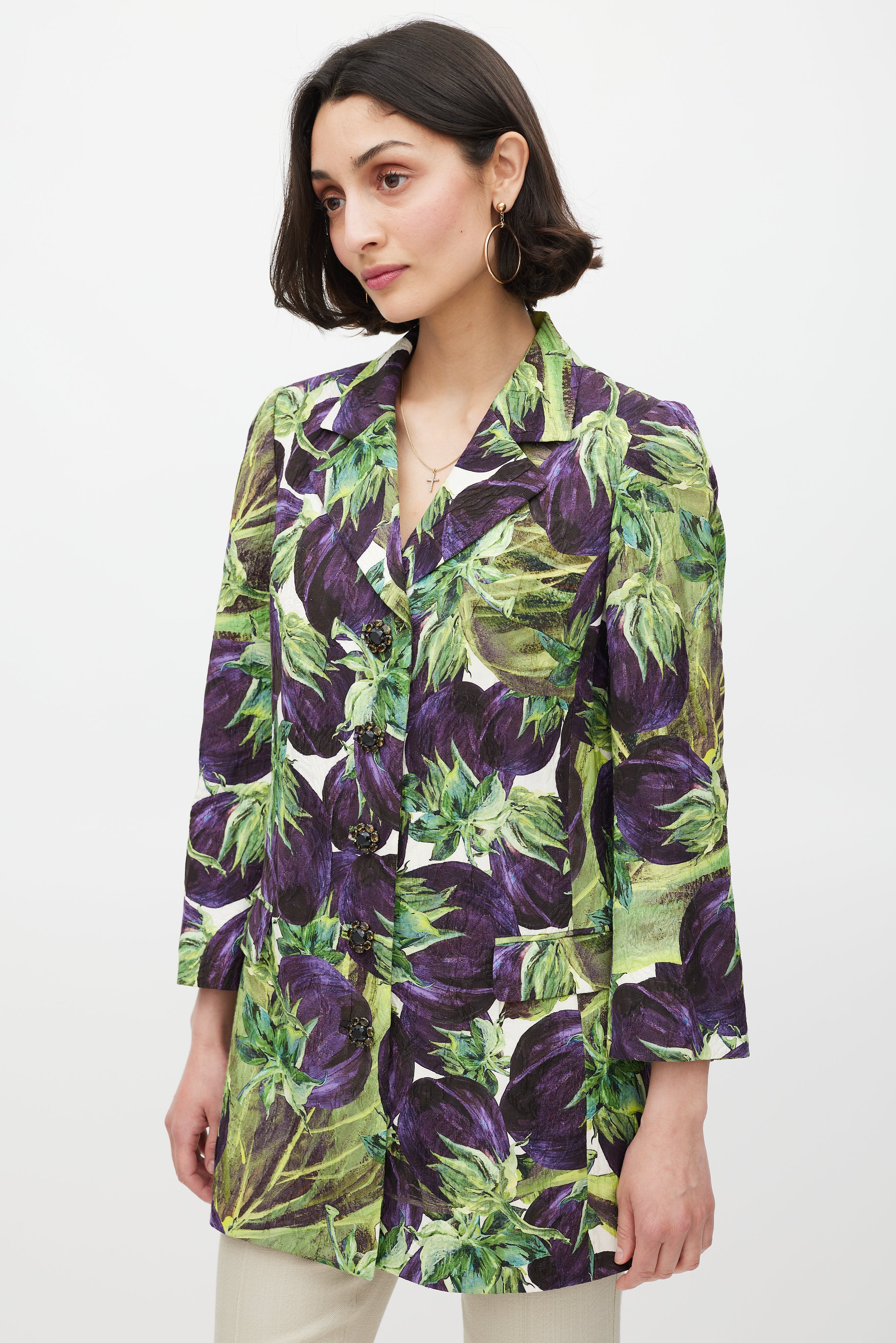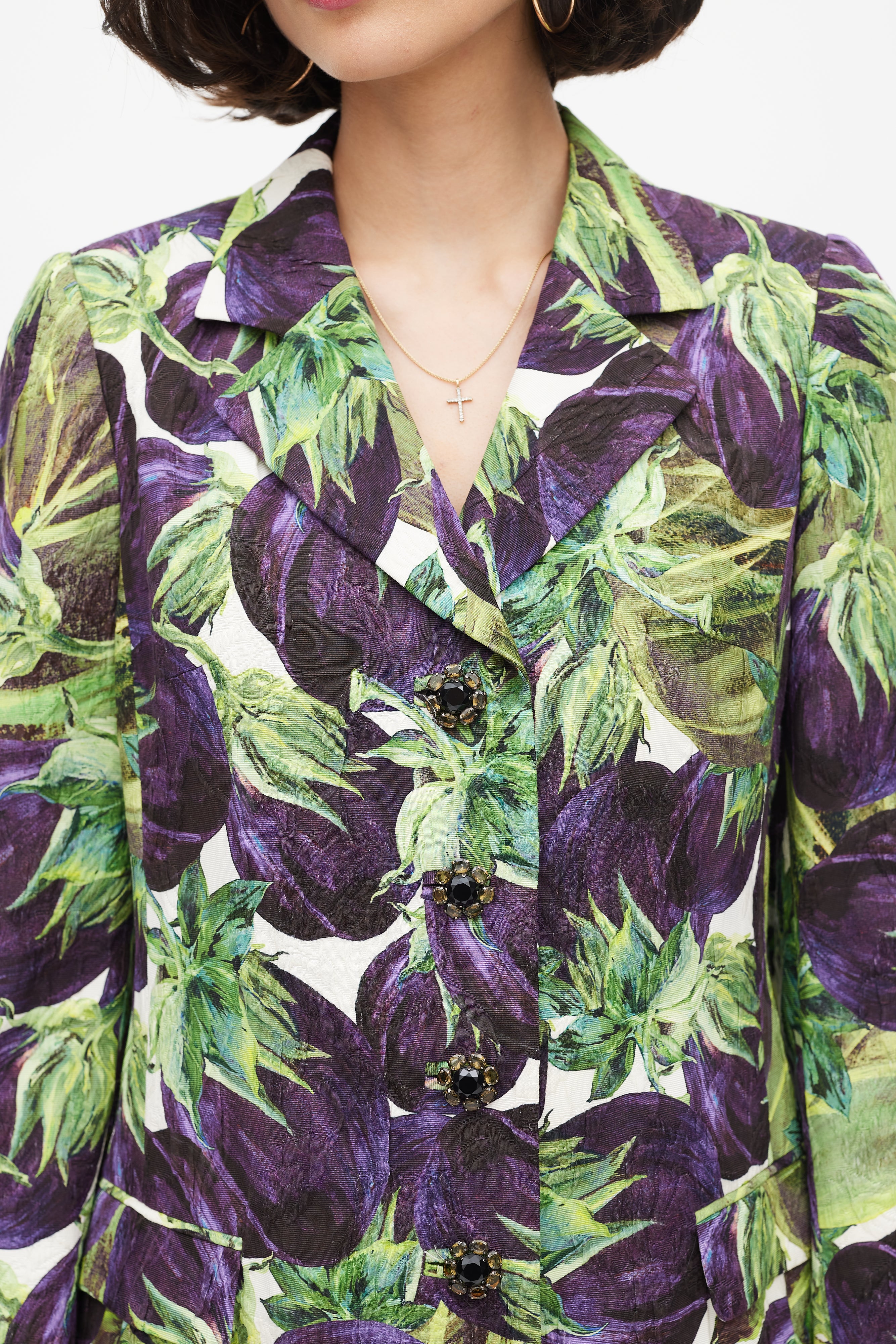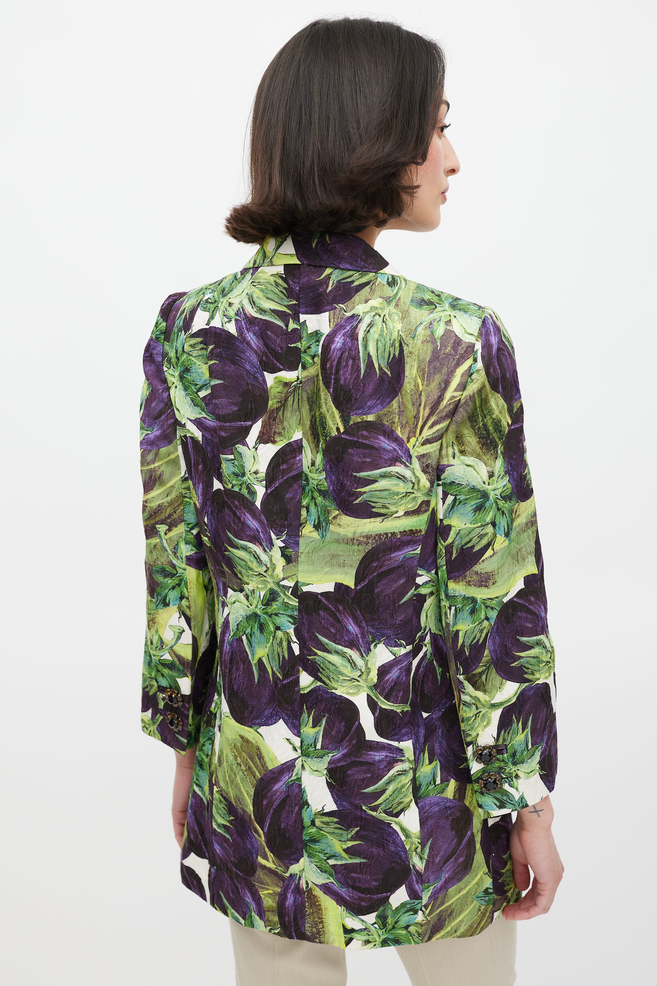 Pre-owned Dolce & Gabbana white, purple, and green eggplant printed blazer featuring a notched collar, green and black crystal cluster buttons front, two front flap pockets, and long sleeves with buttoned cuffs. Lined.