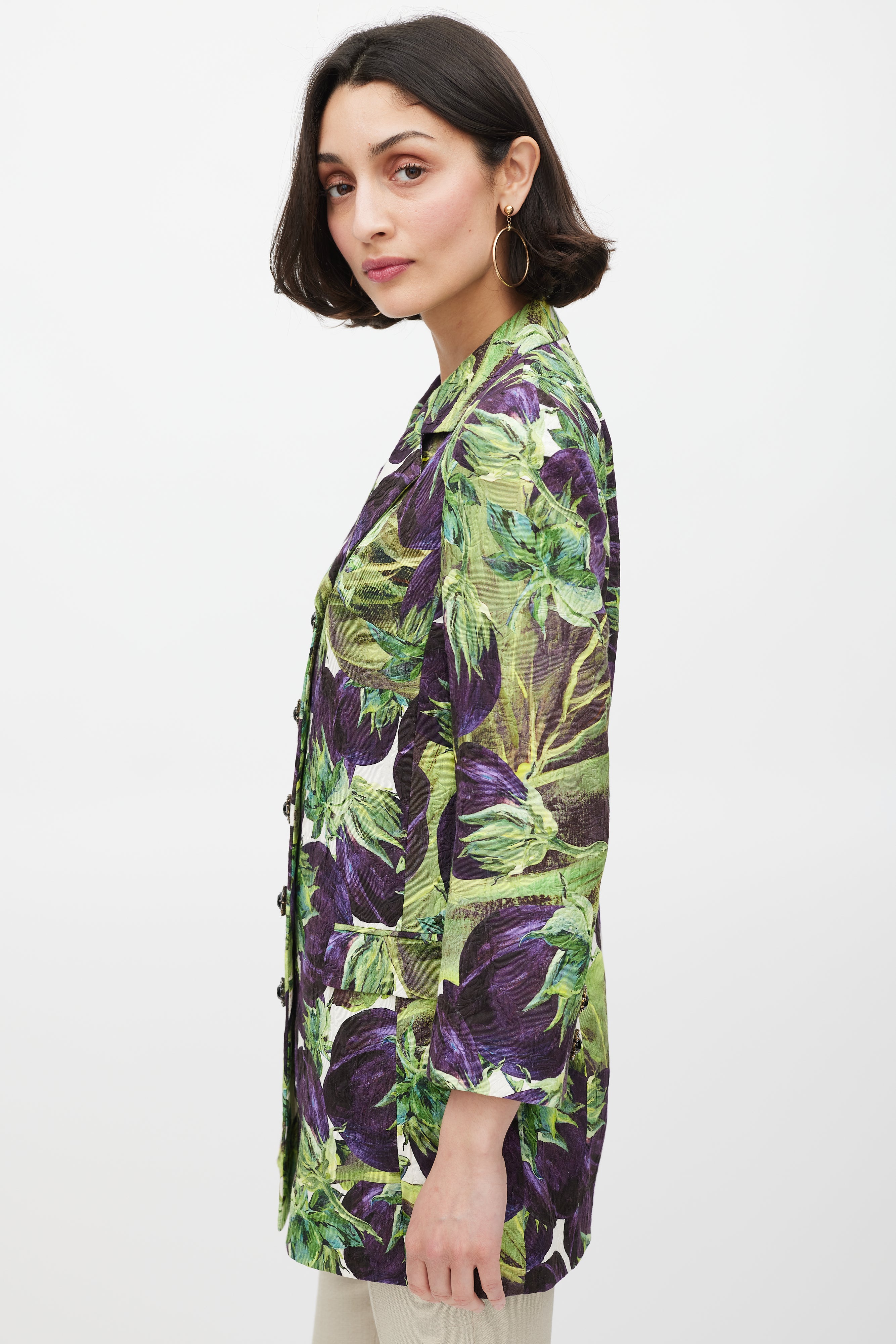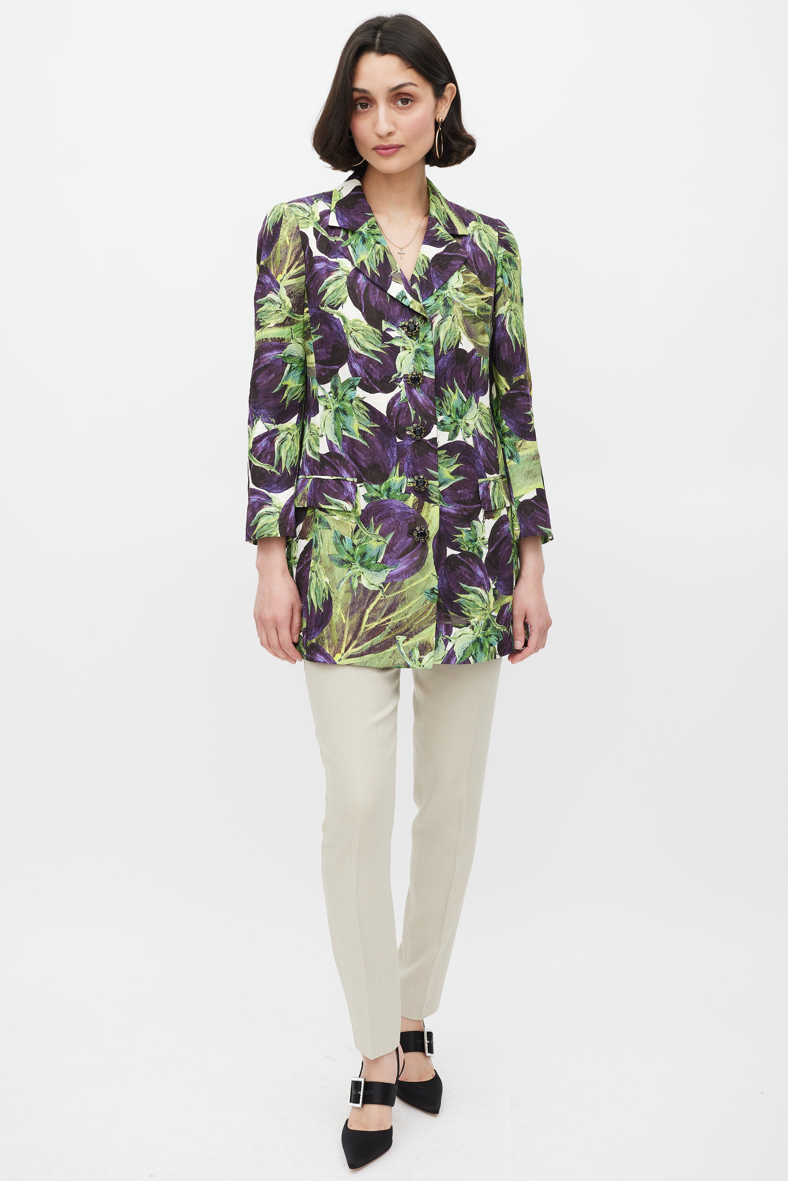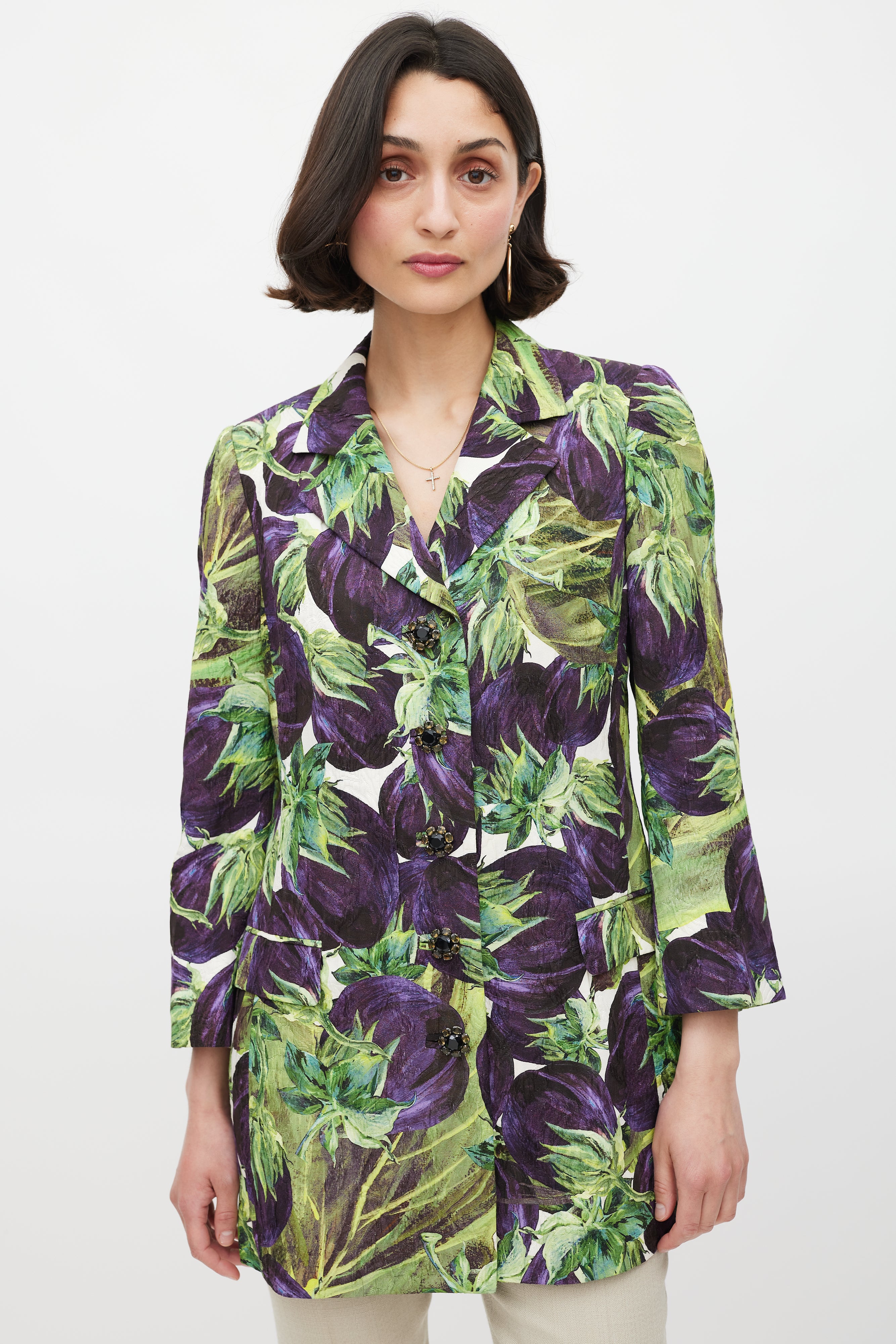 Pre-owned Dolce & Gabbana white, purple, and green eggplant printed blazer featuring a notched collar, green and black crystal cluster buttons front, two front flap pockets, and long sleeves with buttoned cuffs. Lined.