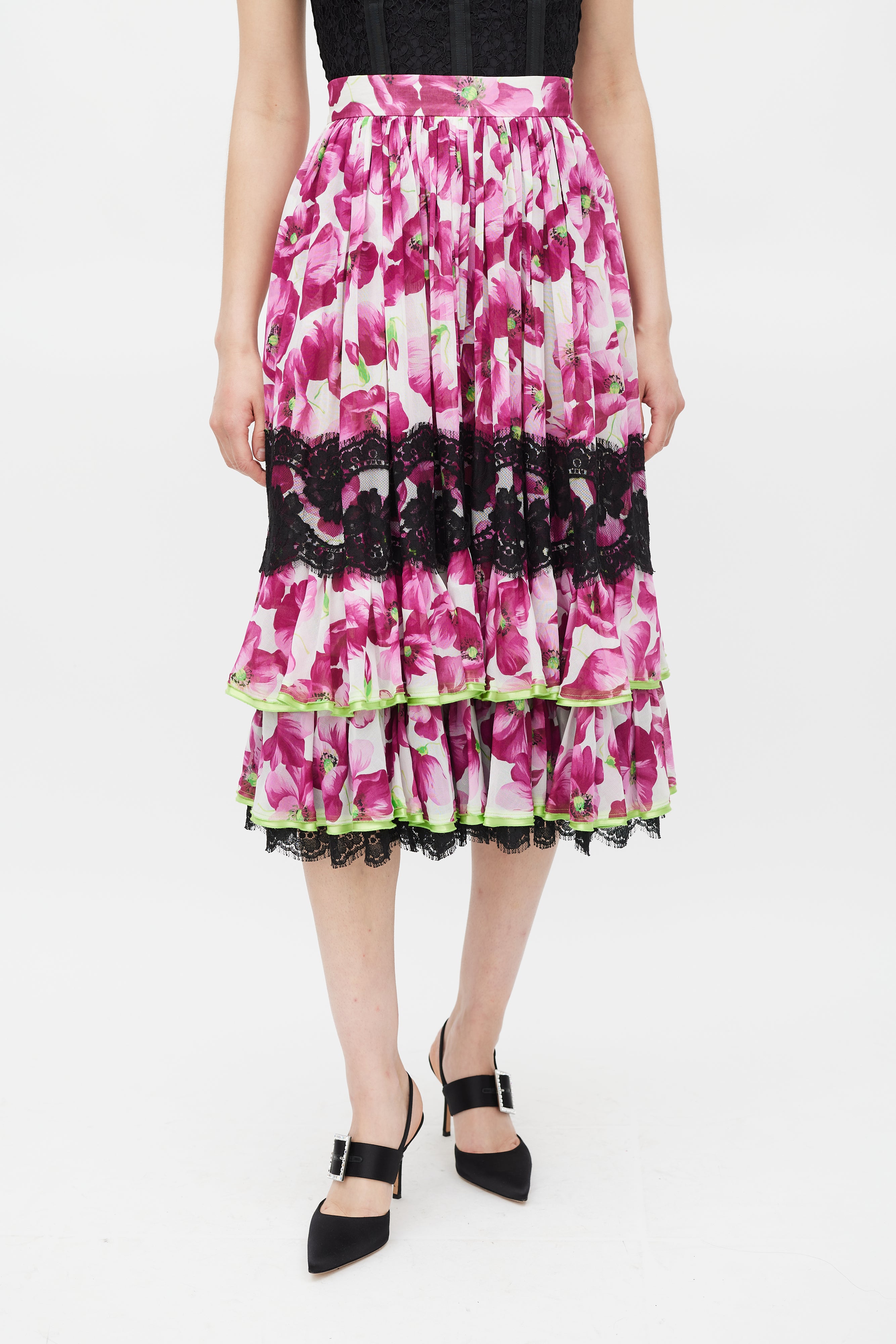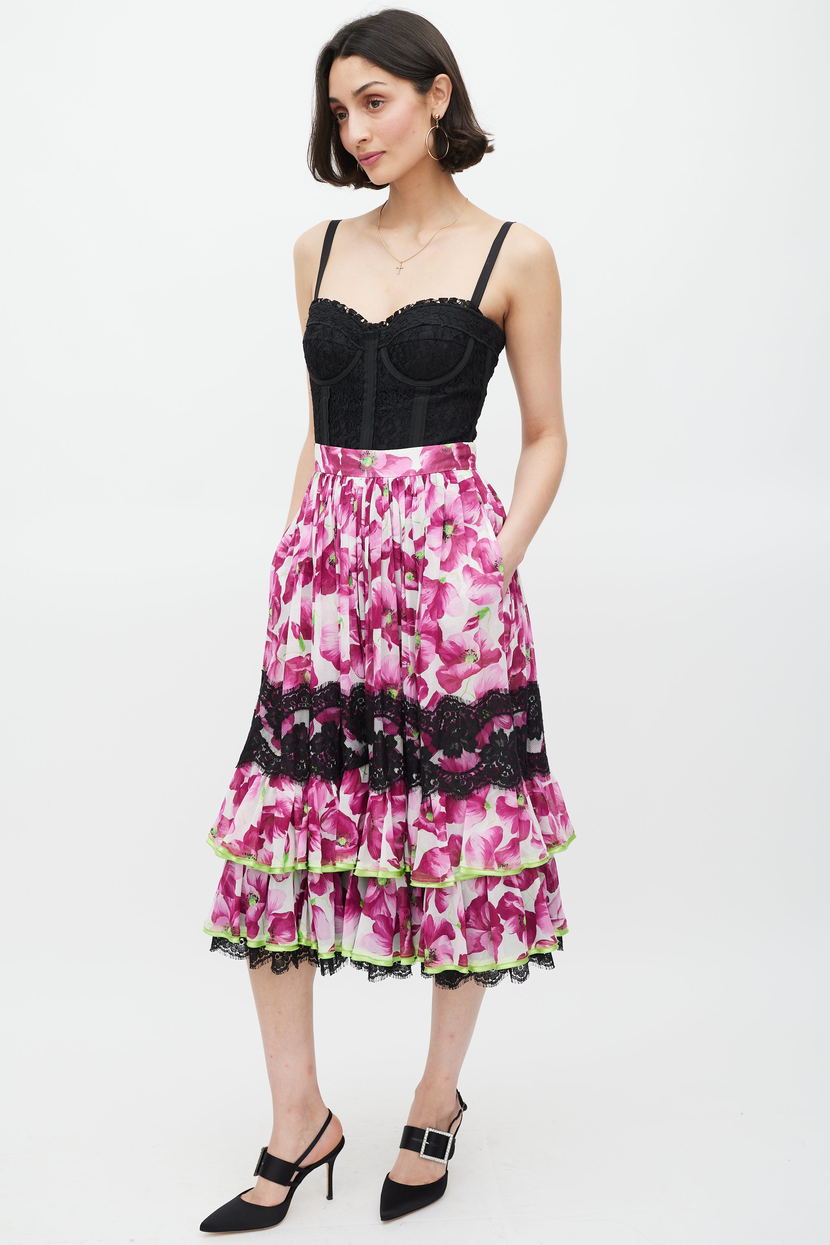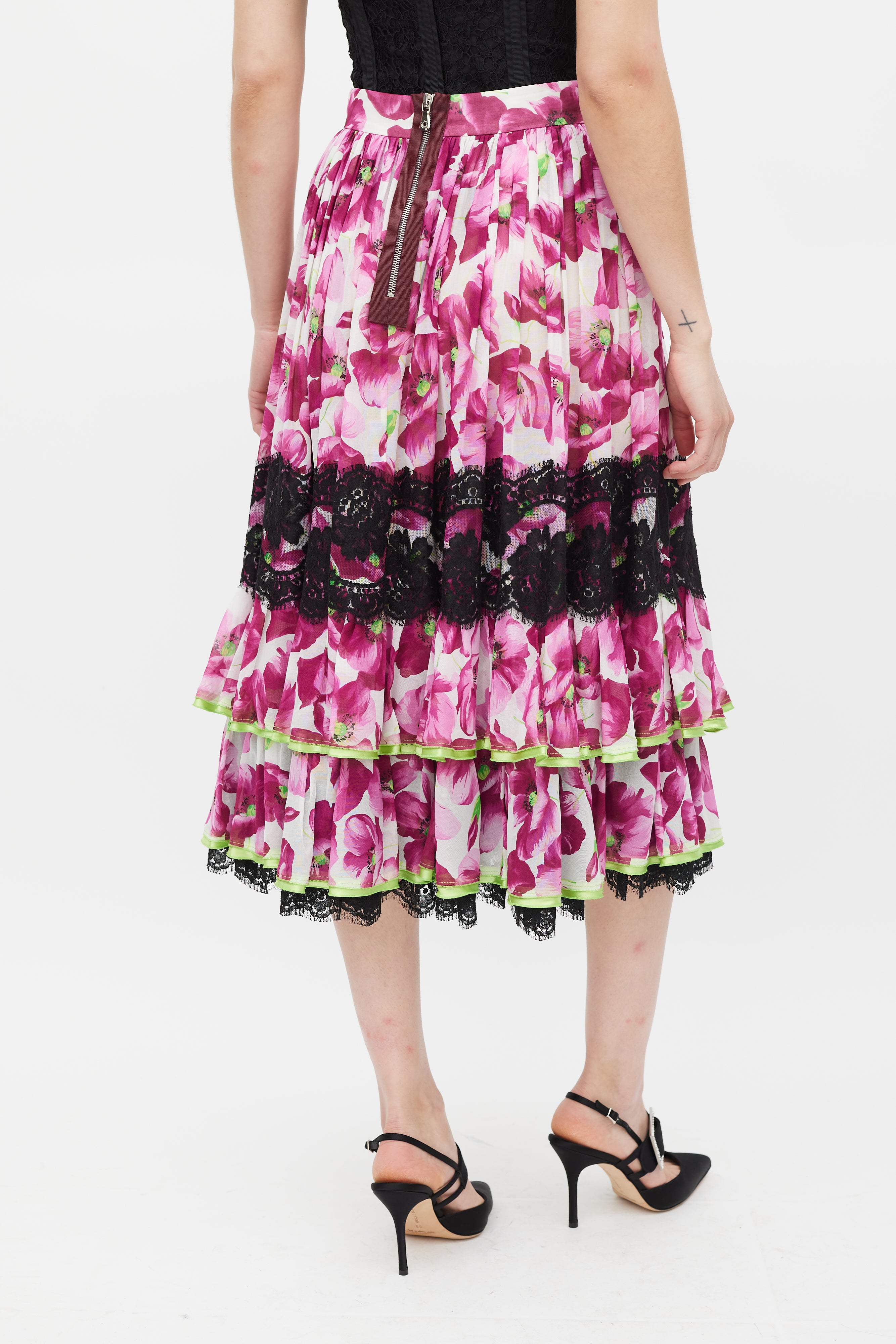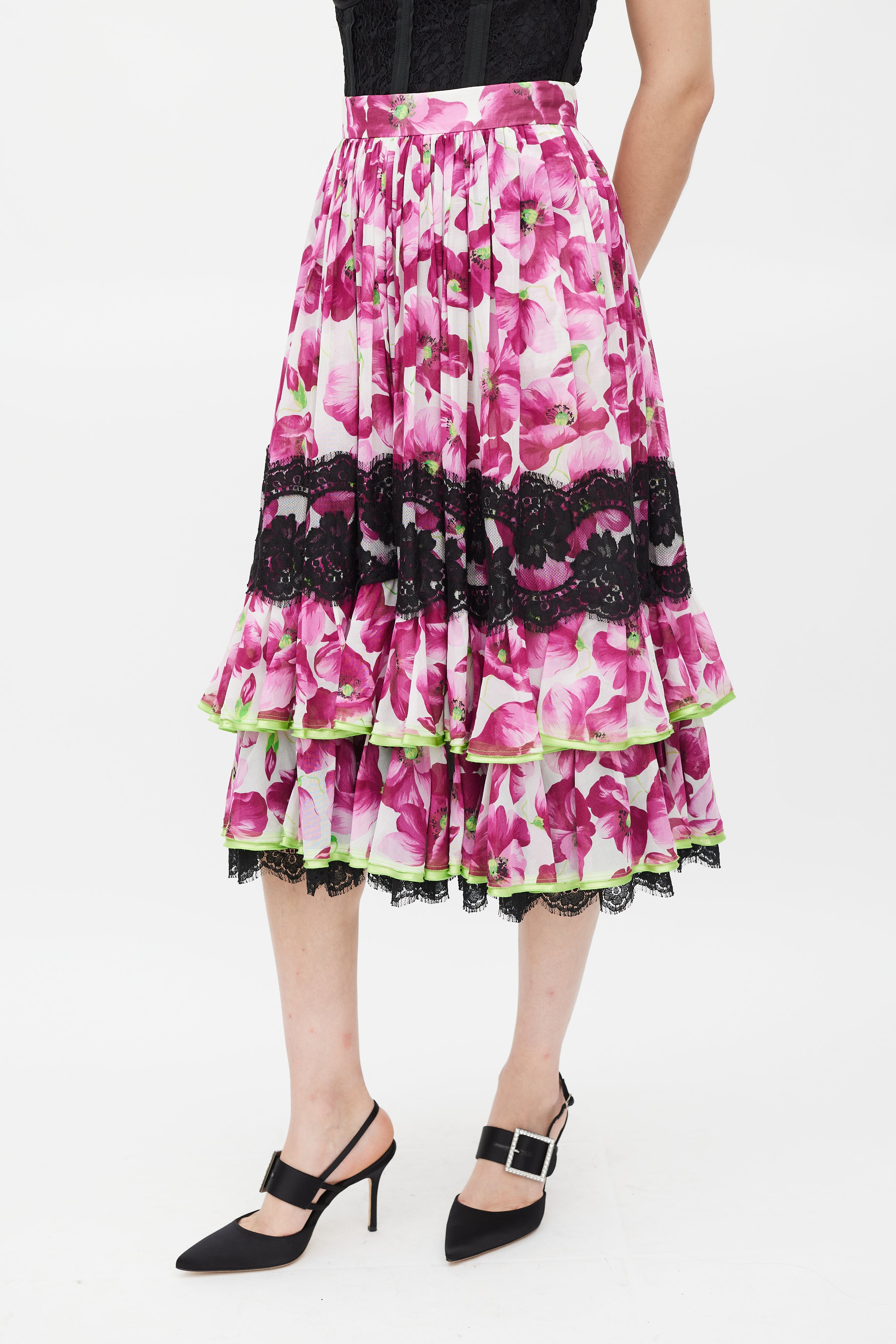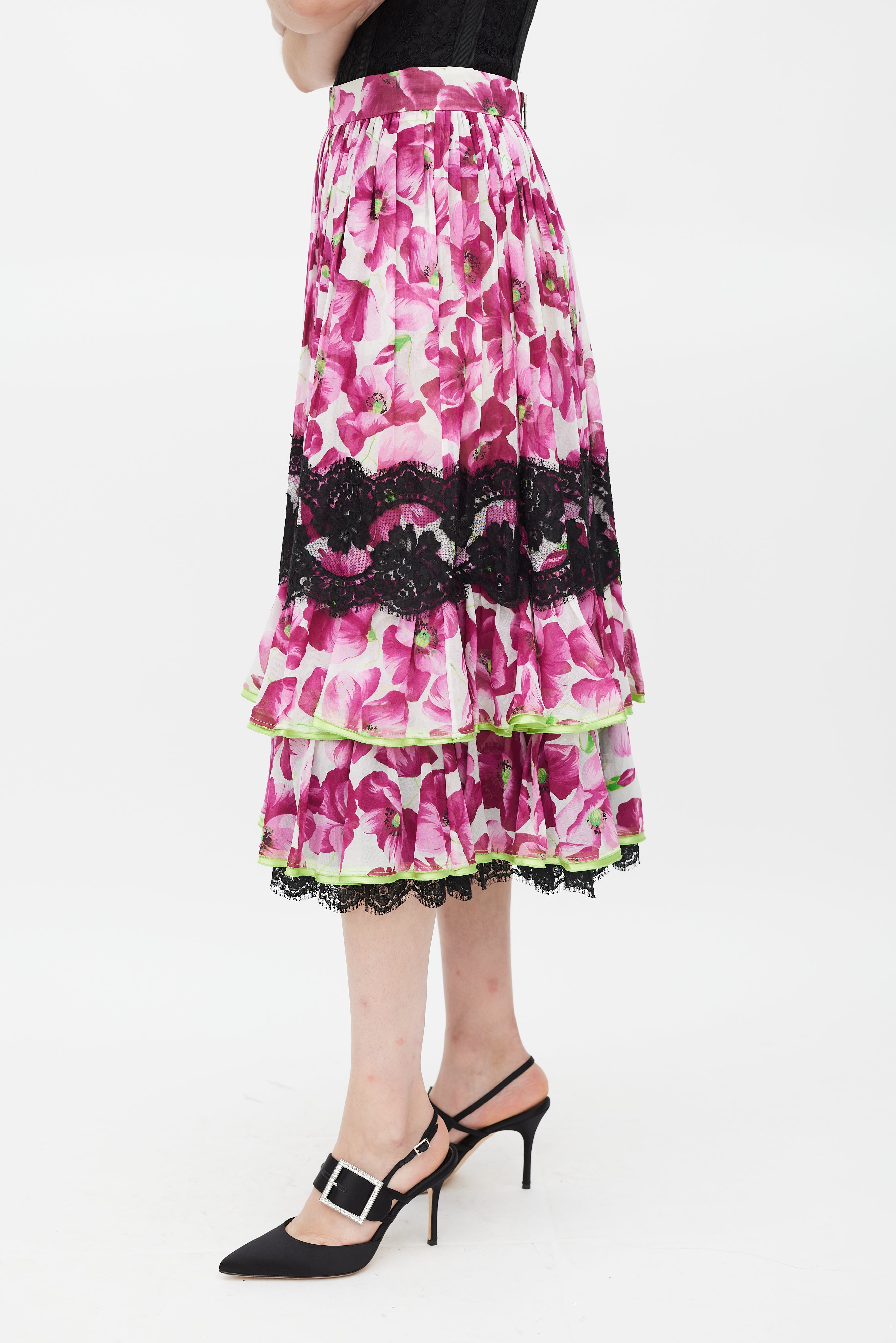 Pre-owned Dolce & Gabbana purple and multicolour cotton midi skirt featuring a floral print throughout, high gathered waist, ruffled tiered construction with green ribbon trim, black floral lace panelling, and back zip closure.