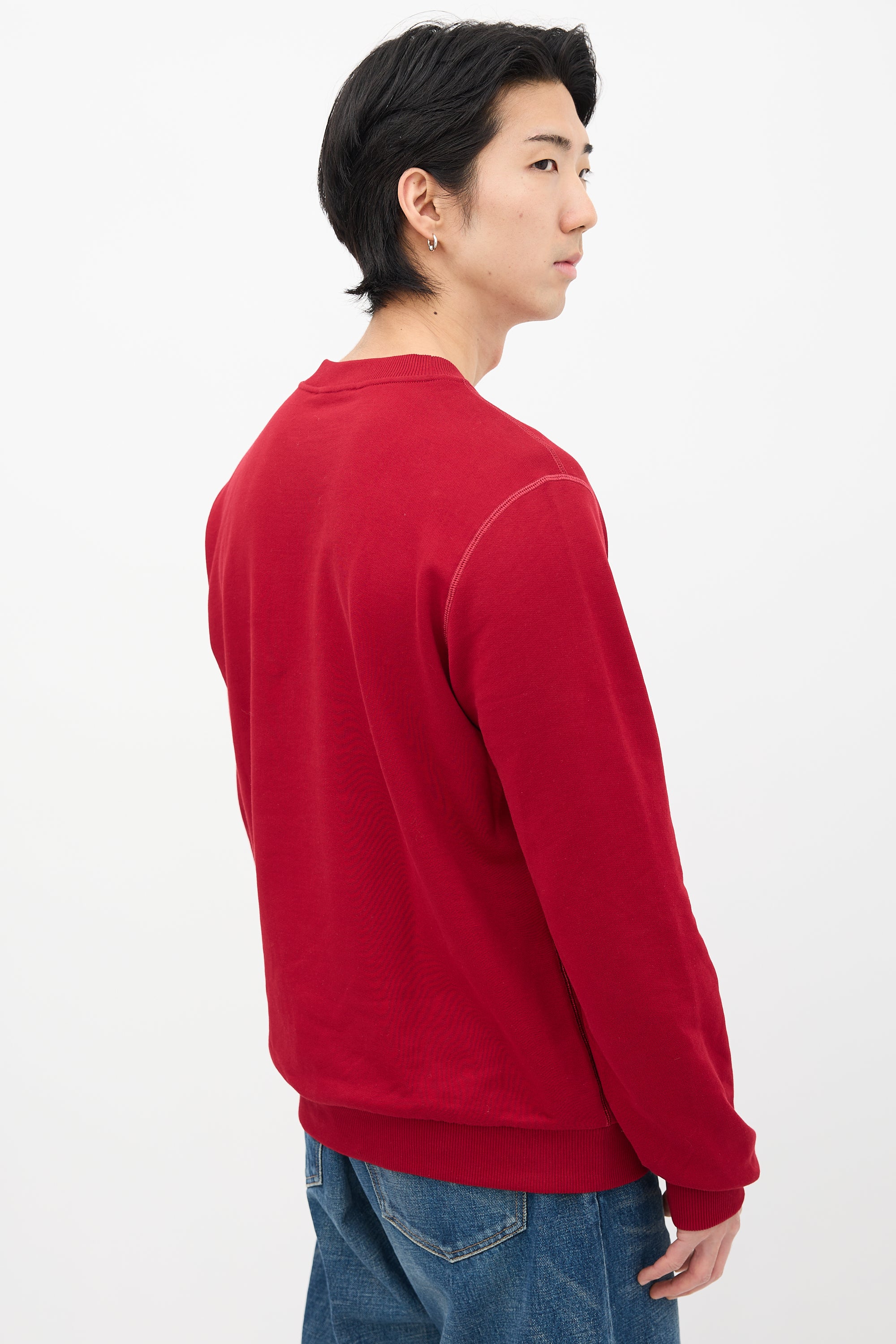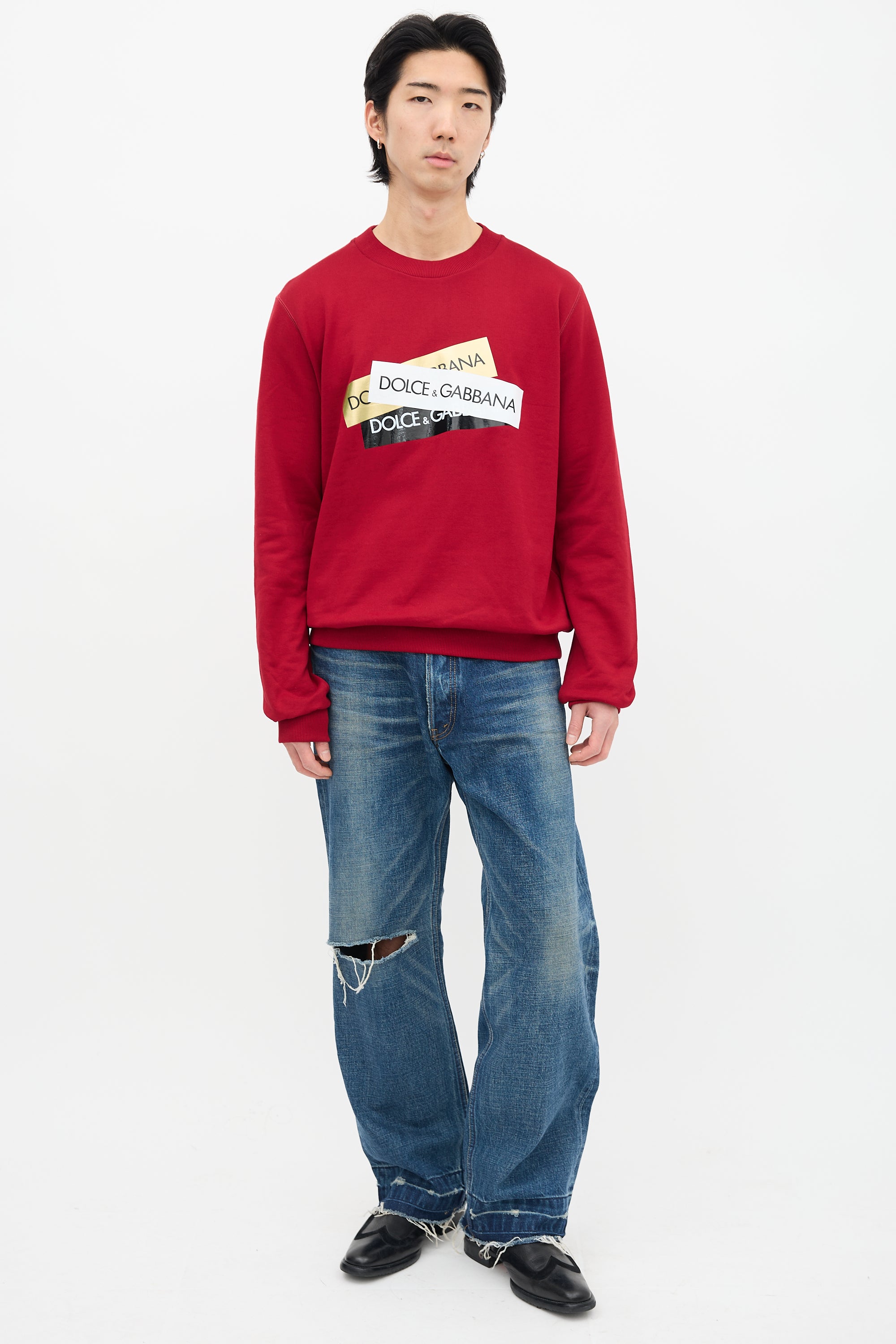 Pre-owned Dolce & Gabbana red sweatshirt featuring a crew neck, white, black, and gold tone layered box logo printed at chest, and ribbed collar, hem, and cuffs.