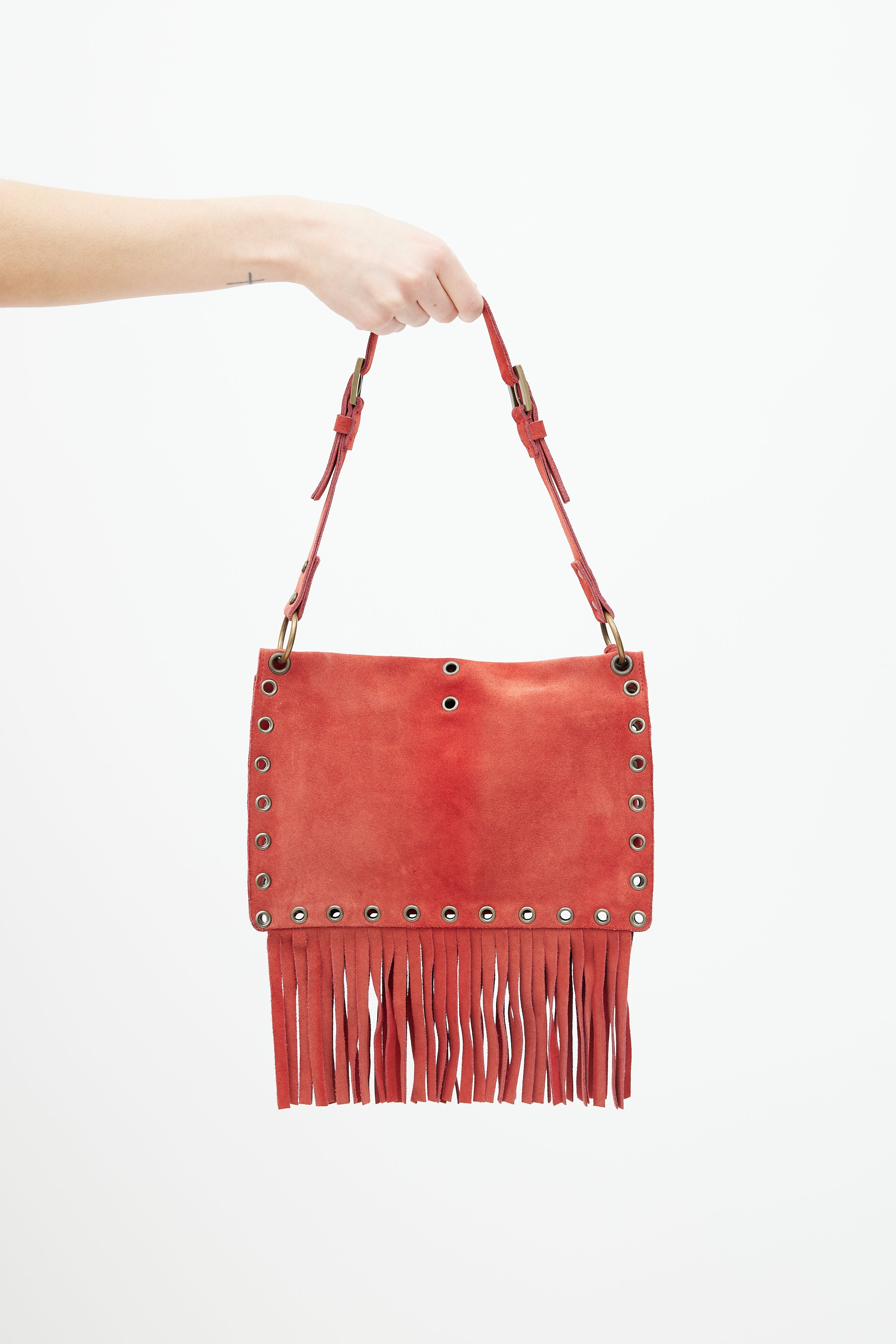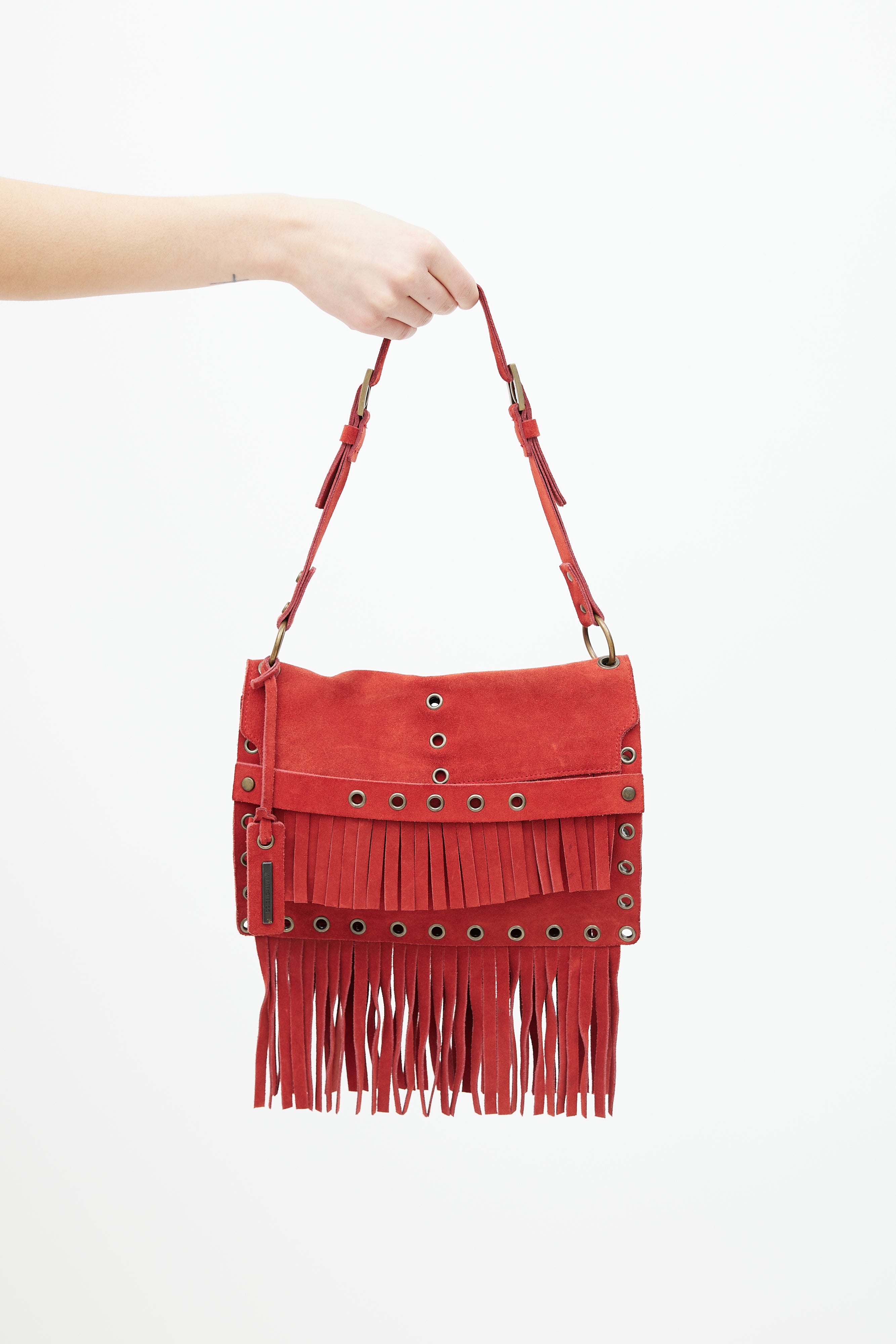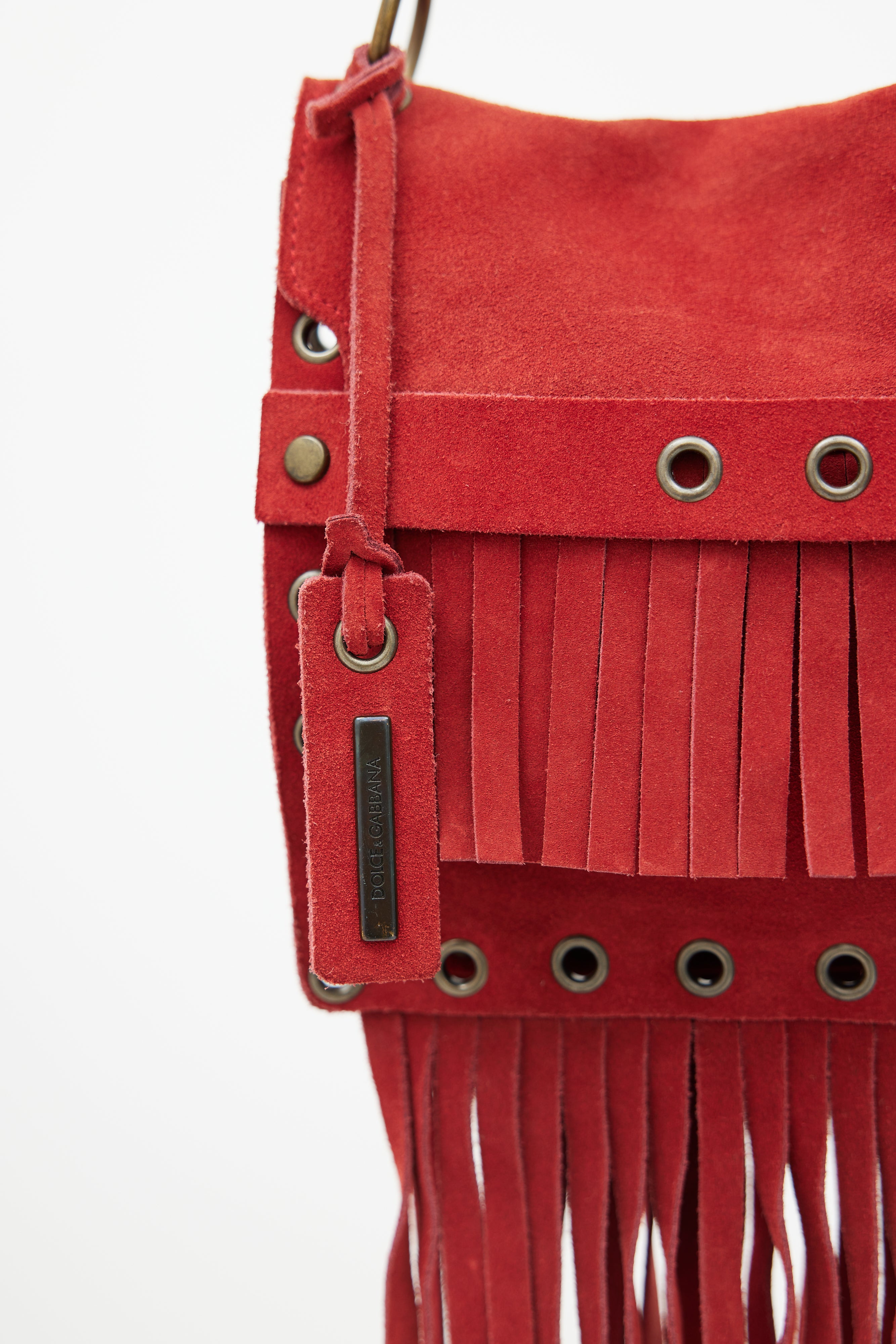 Pre-owned Dolce & Gabbana Fall Winter 2001 red suede shoulder bag featuring fringe throughout, bronze tone grommet hardware, flap closure with strap, single compartment with zip pocket, buckle detail at shoulder strap and logo tag at exterior. Comes with a dust bag.