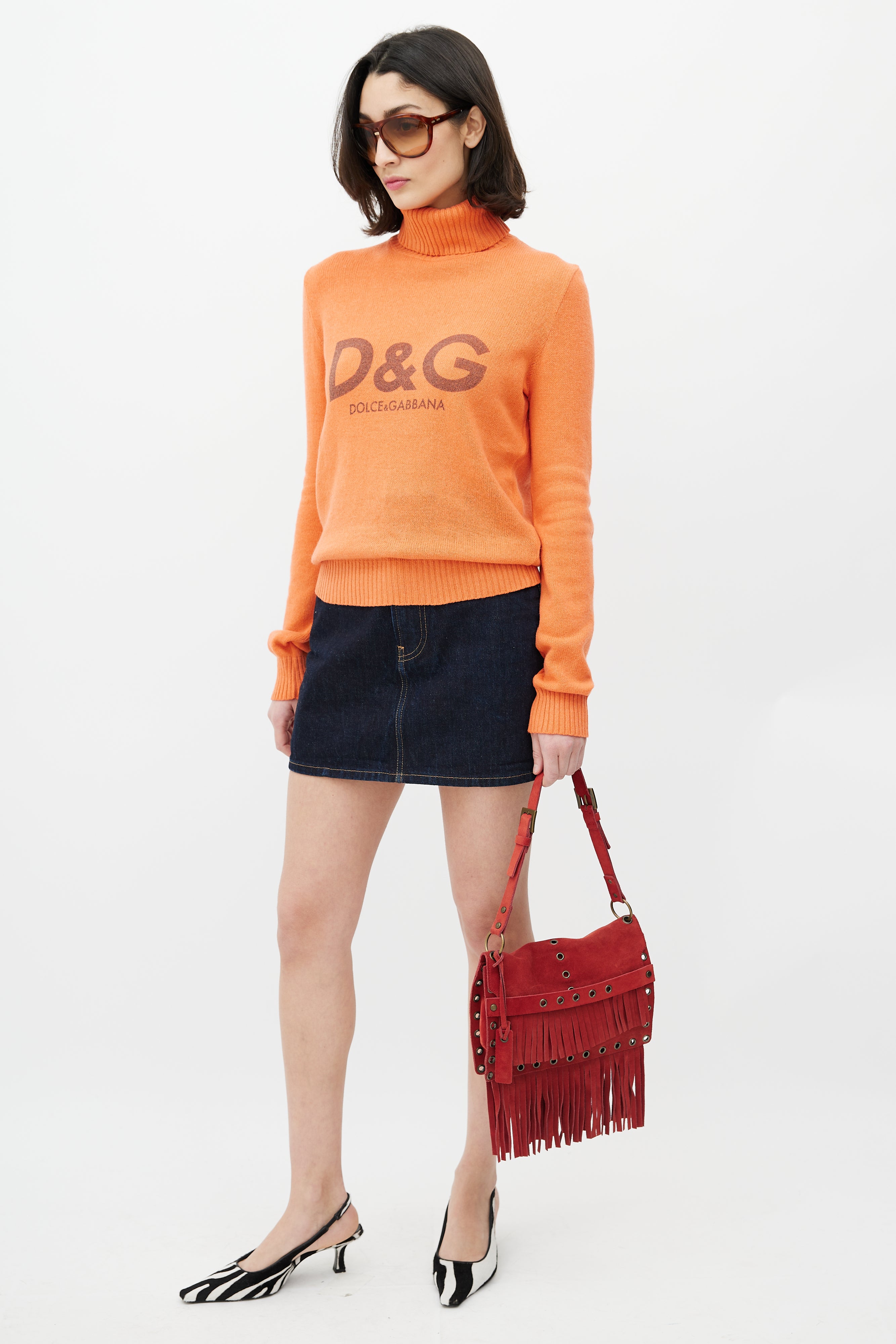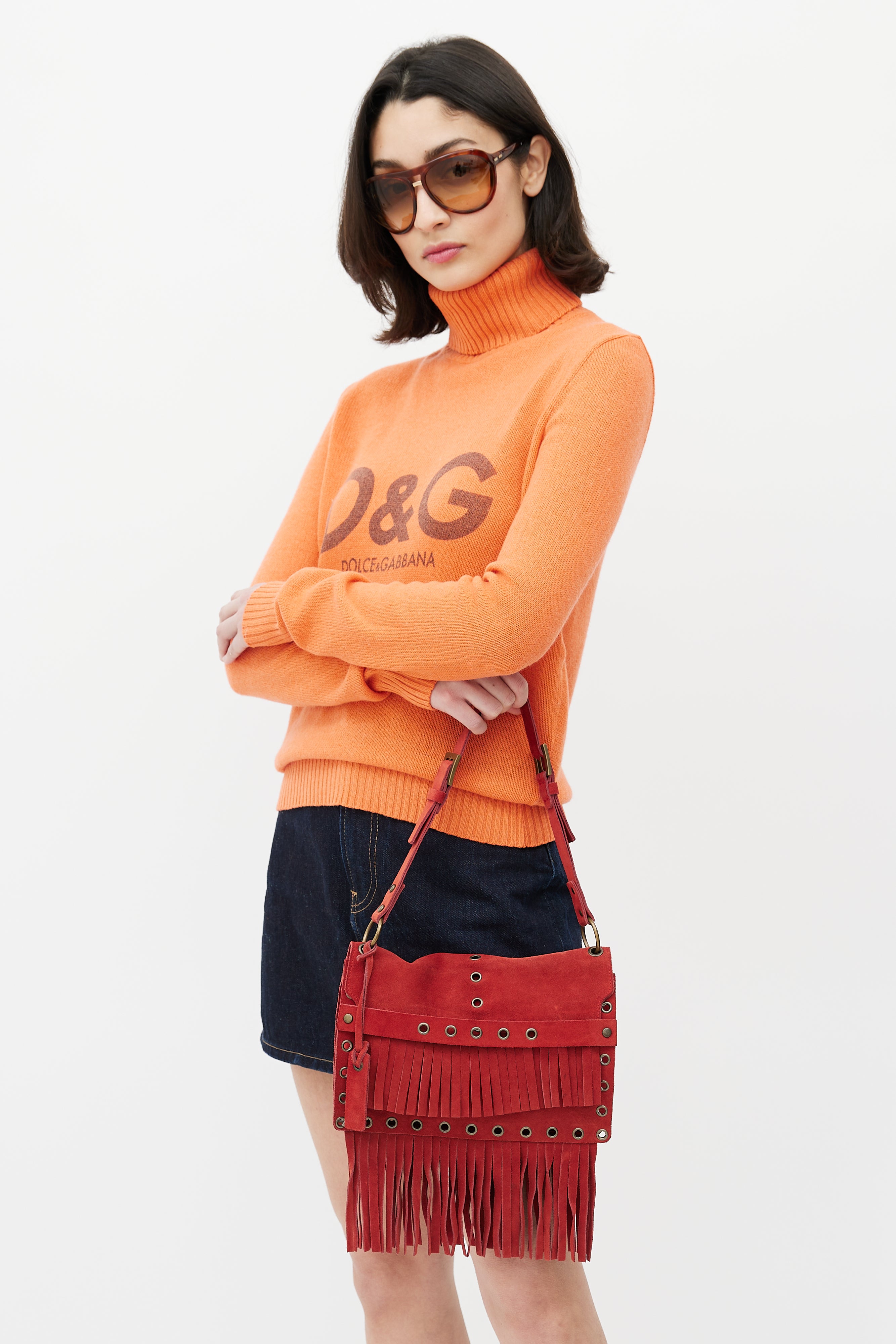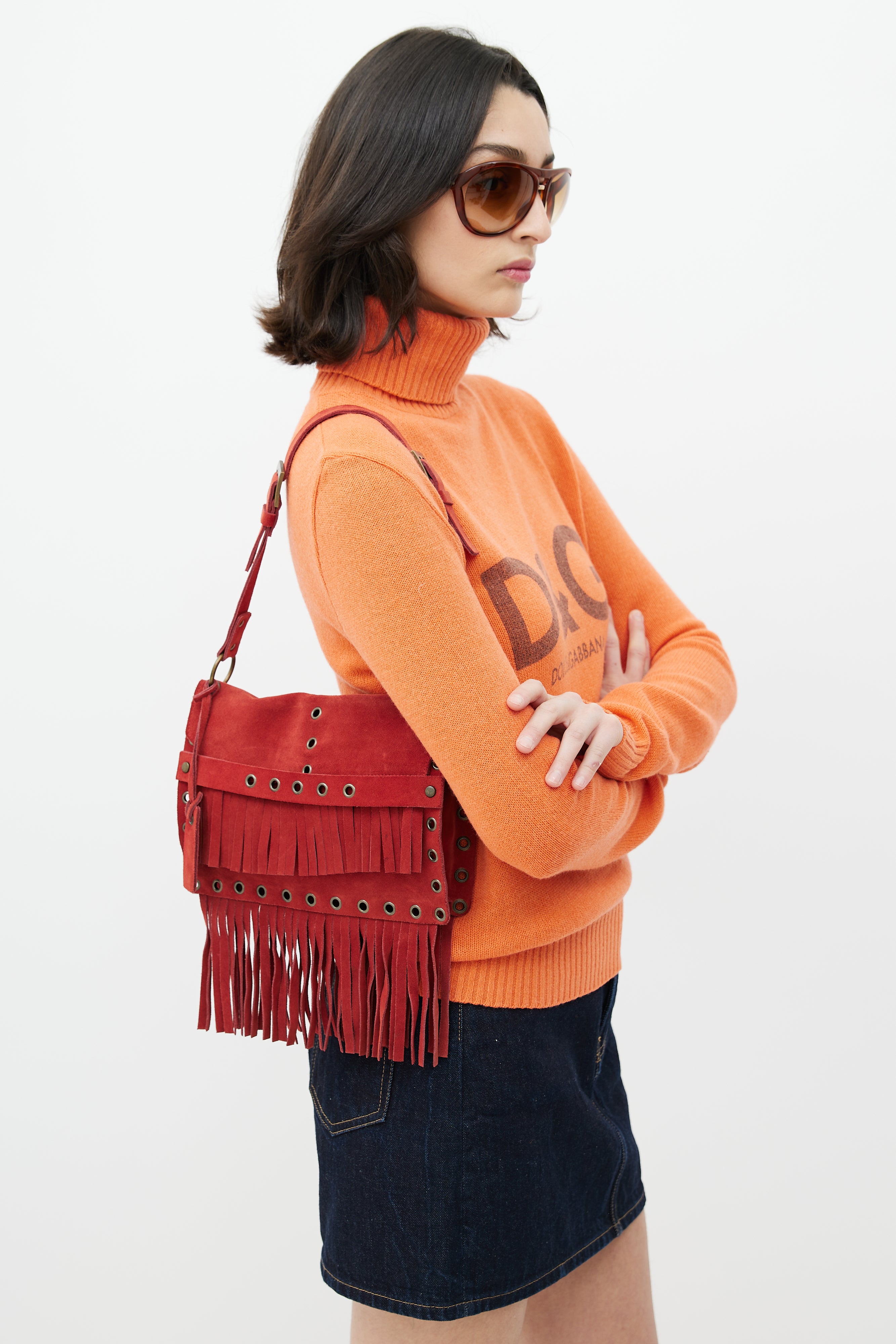 Pre-owned Dolce & Gabbana Fall Winter 2001 red suede shoulder bag featuring fringe throughout, bronze tone grommet hardware, flap closure with strap, single compartment with zip pocket, buckle detail at shoulder strap and logo tag at exterior. Comes with a dust bag.