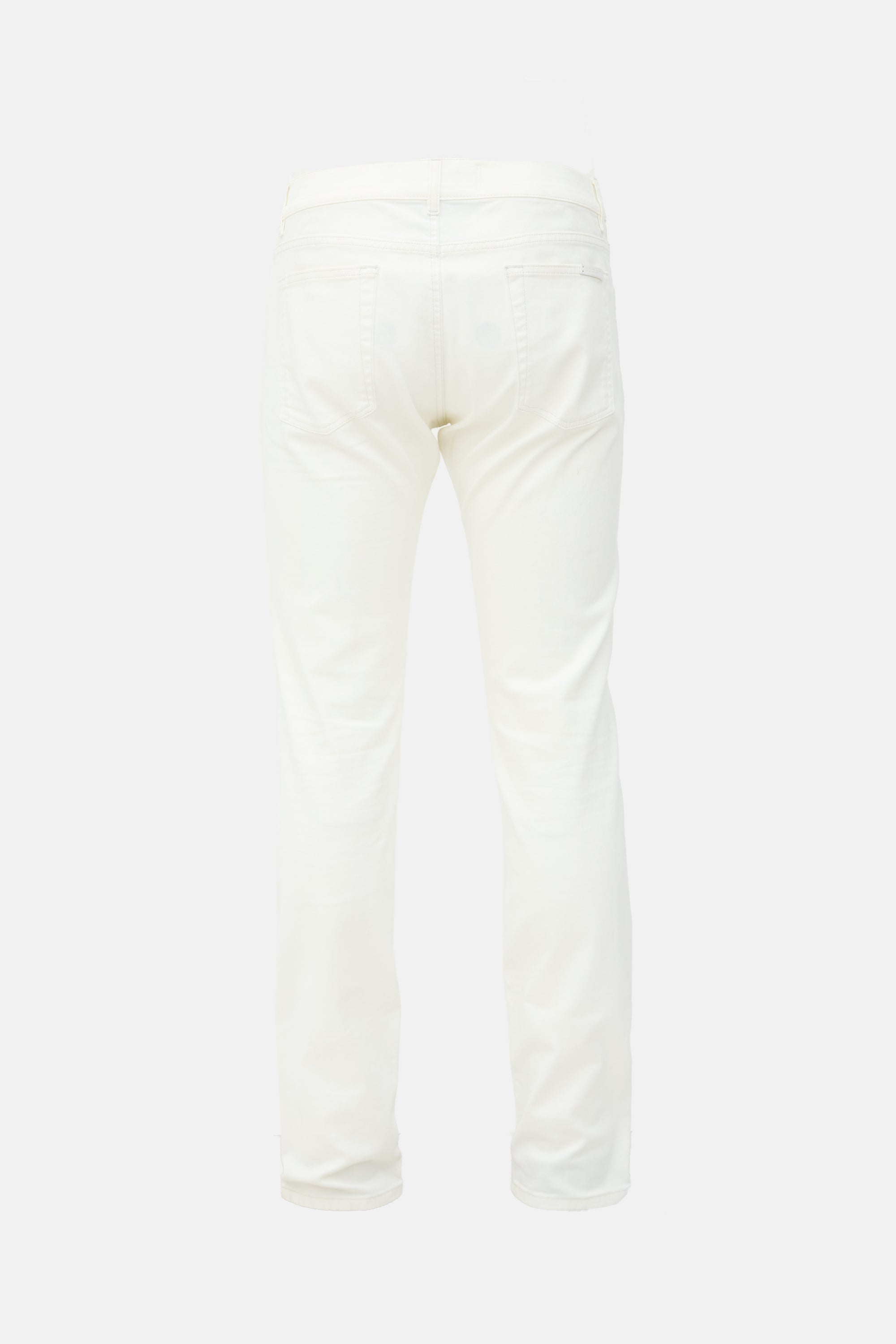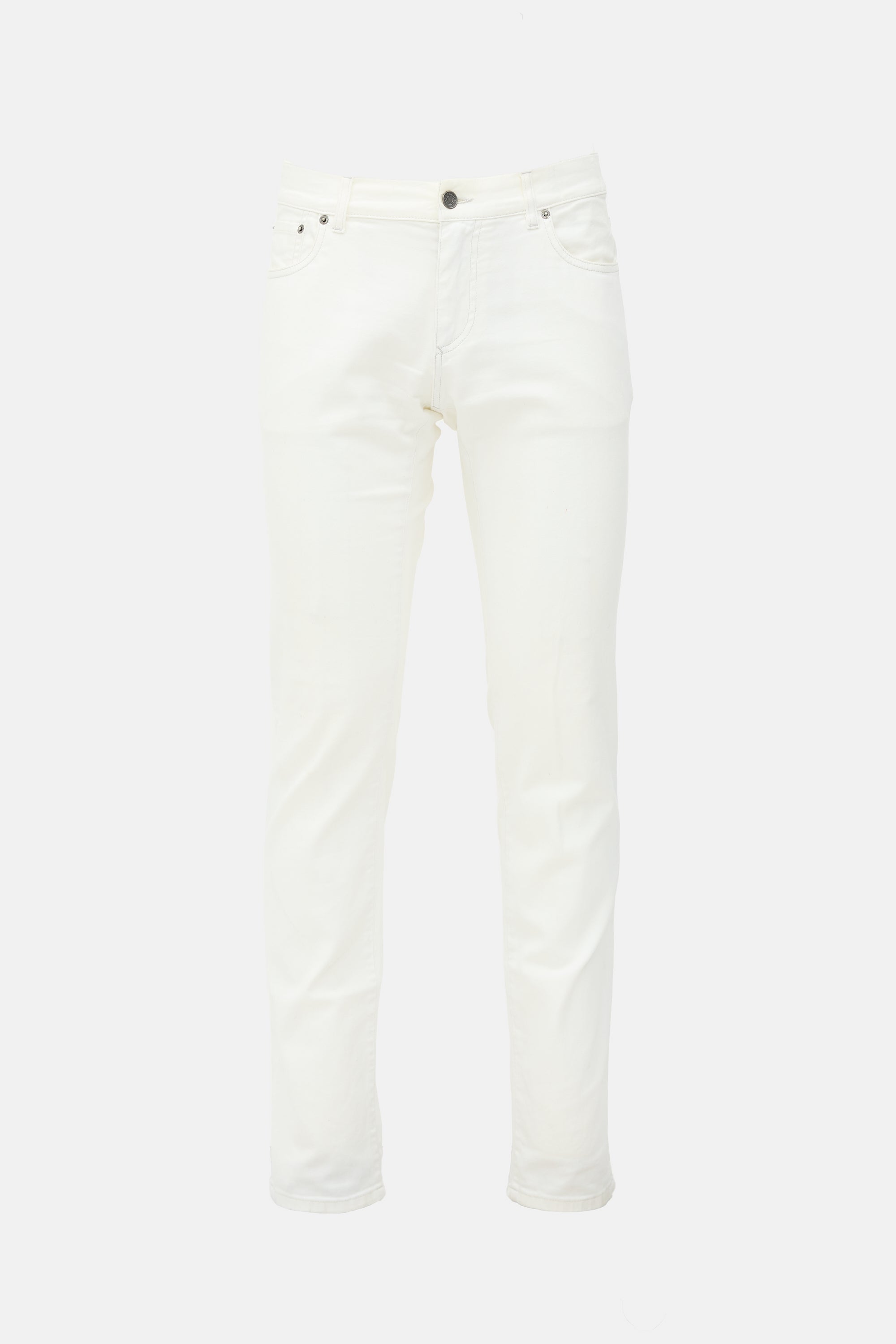 Pre-owned Dolce & Gabbana white jeans featuring belt loops, button fly, five pocket styling, low rise, Jacron patch at back, and slim leg.