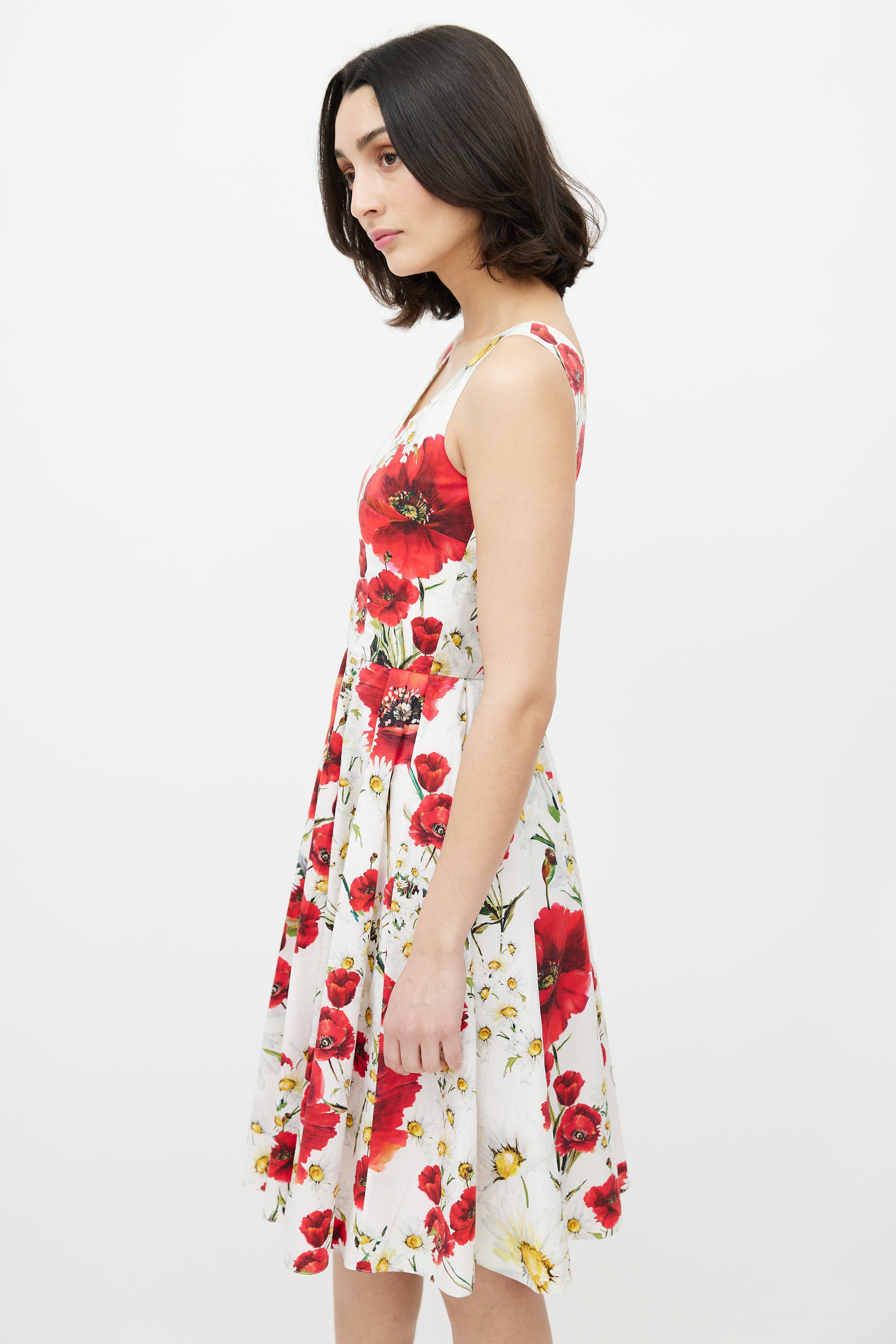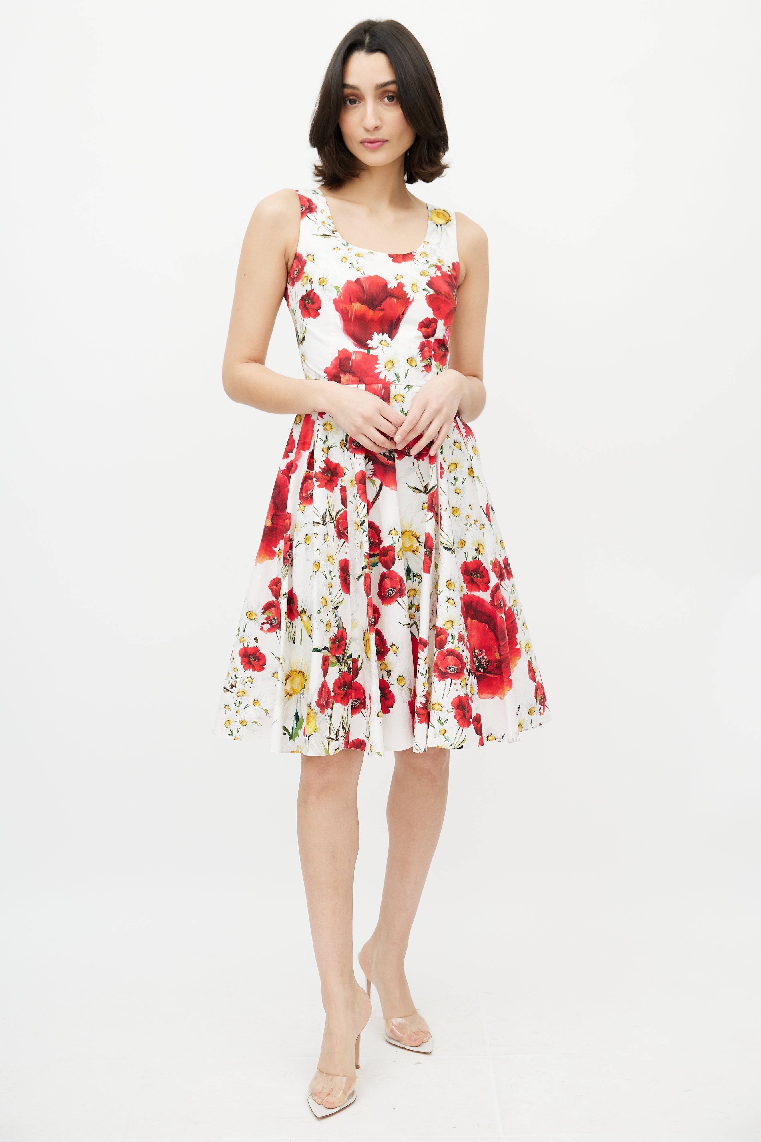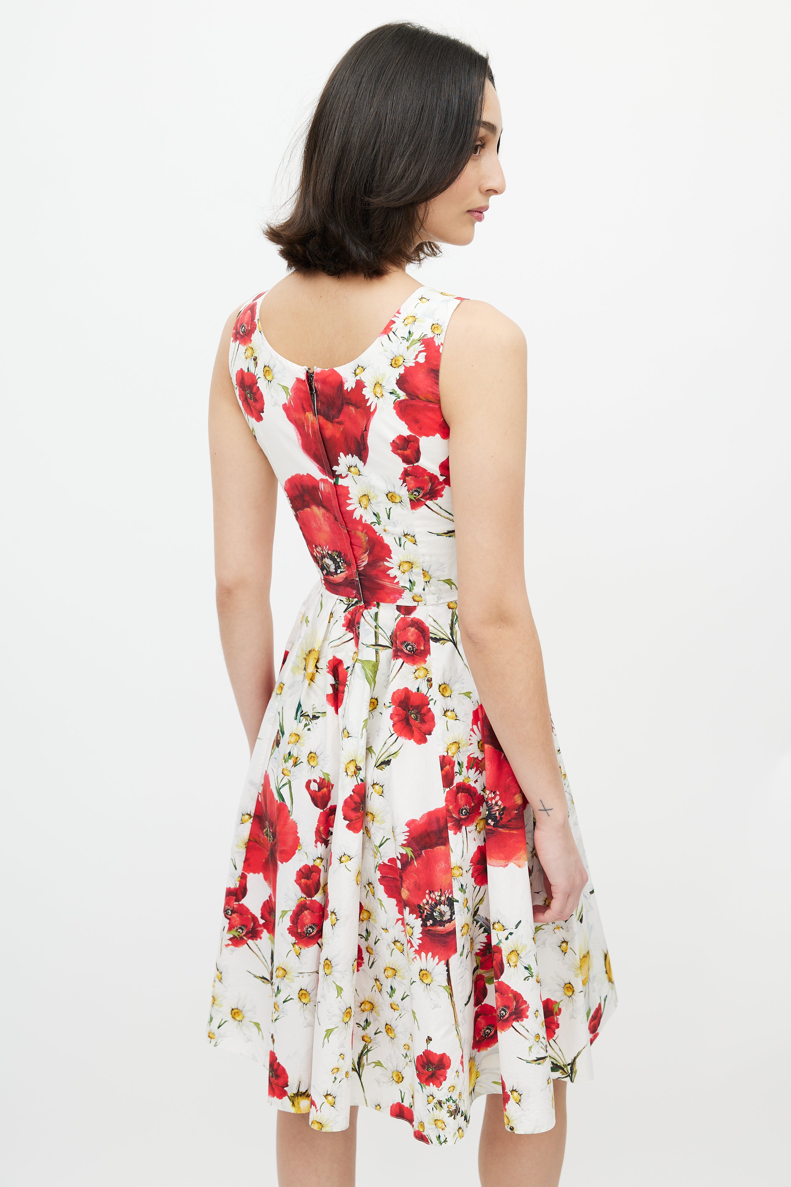 Pre-owned Dolce & Gabbana white and multicolour dress featuring floral print, round neckline, pleated A-line skirt, and concealed zip closure at back. Partially lined.