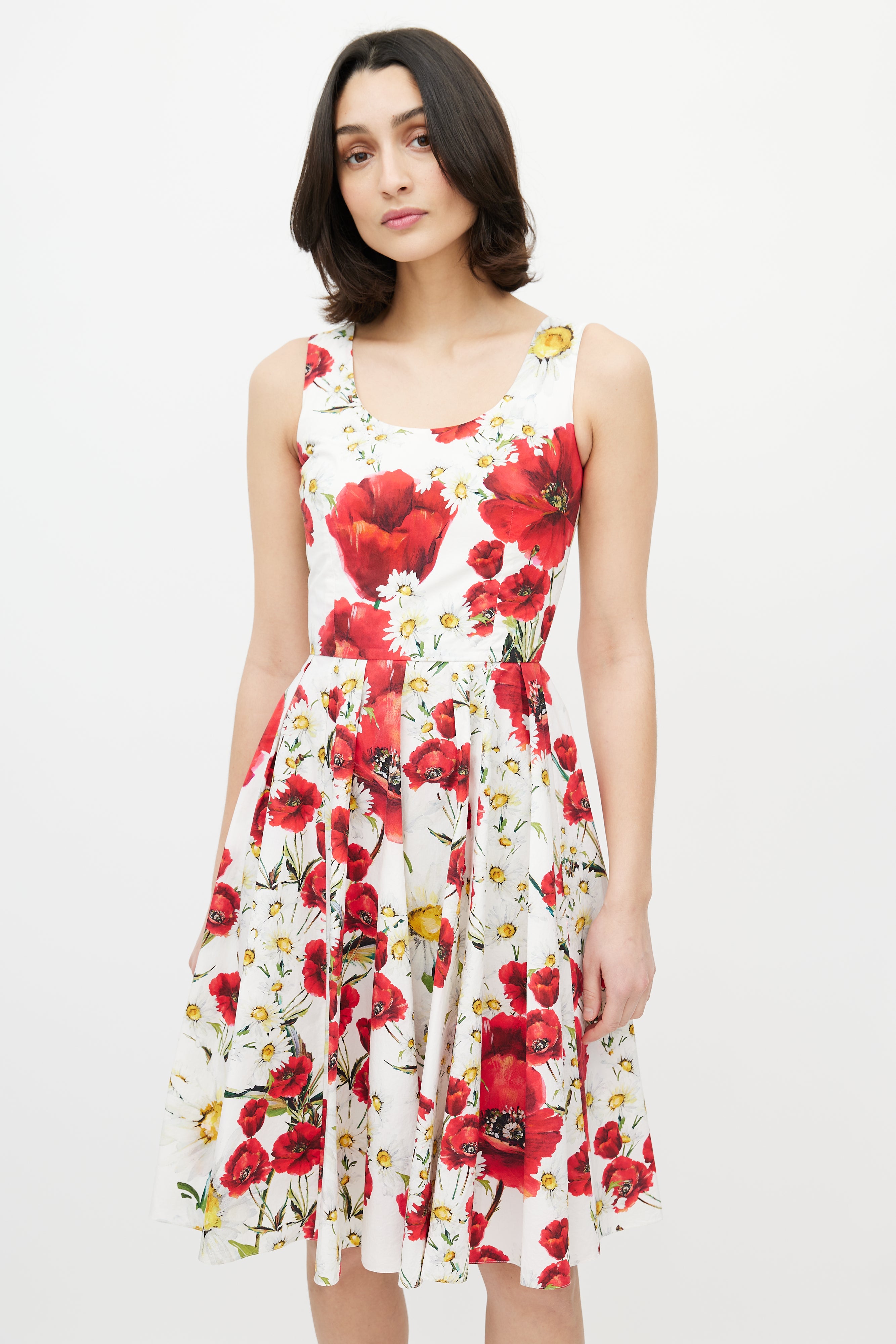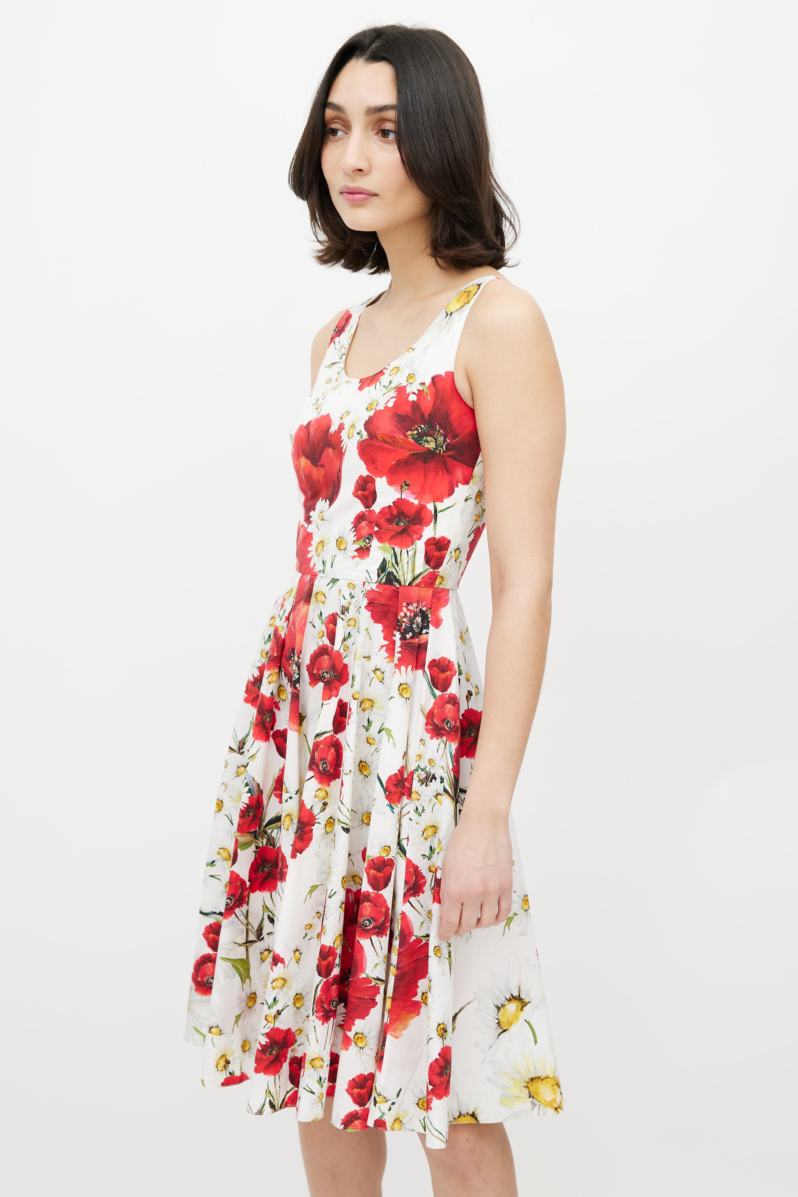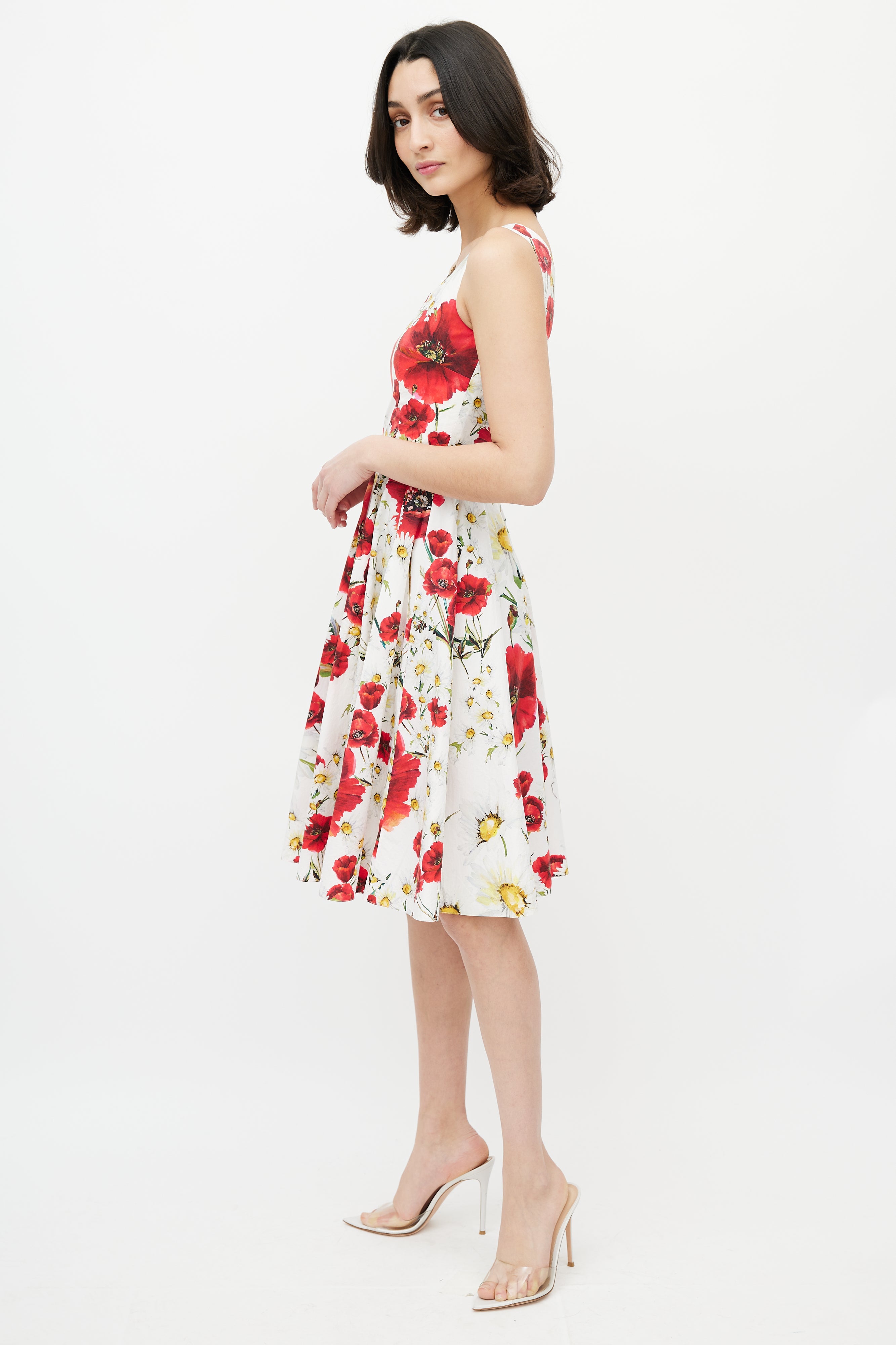 Pre-owned Dolce & Gabbana white and multicolour dress featuring floral print, round neckline, pleated A-line skirt, and concealed zip closure at back. Partially lined.
