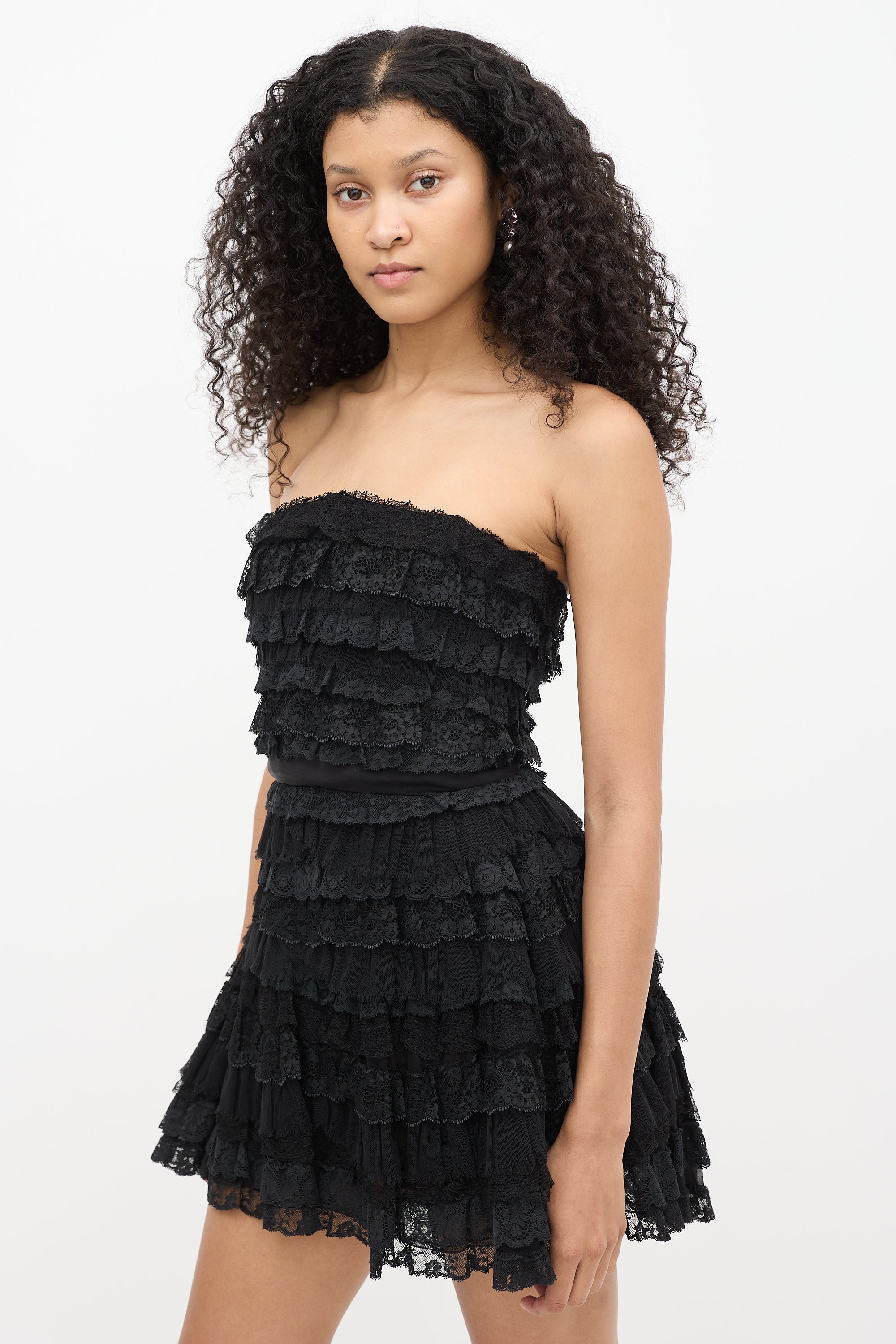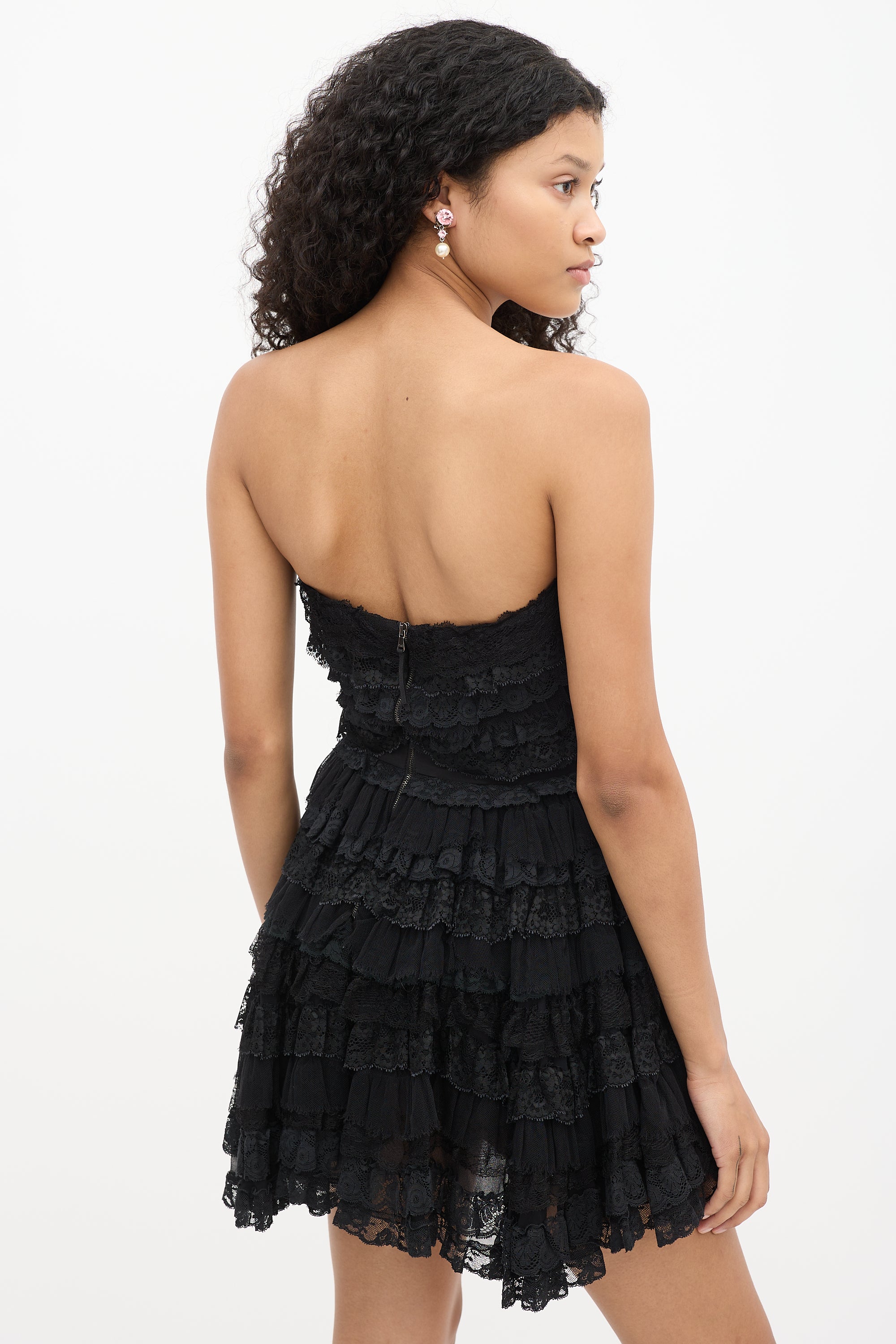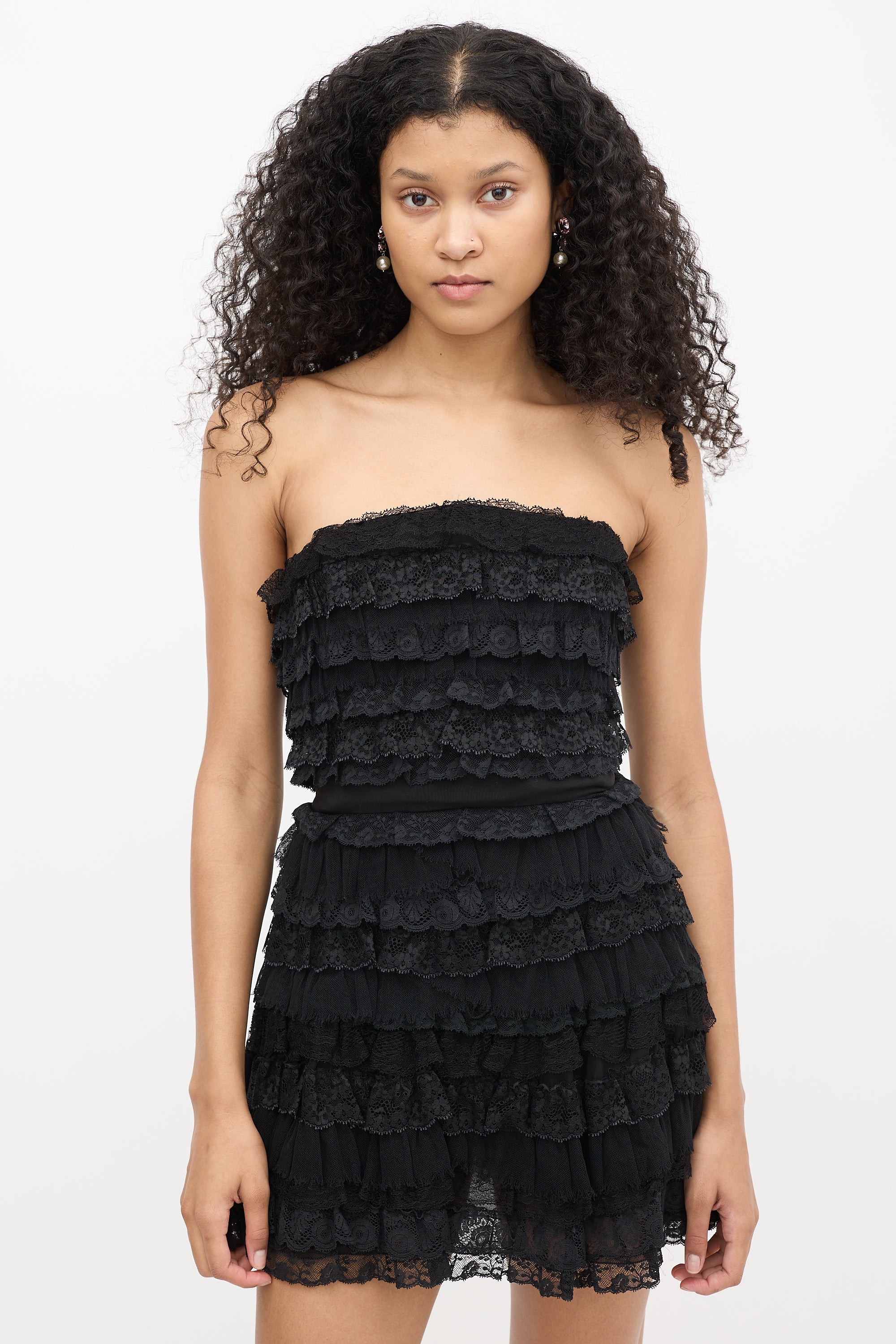 Pre-owned Dolce & Gabbana black silk strapless dress featuring tiered lace and mesh ruffles throughout, boning throughout bodice, back zip closure, and A-line skirt. Lined.
