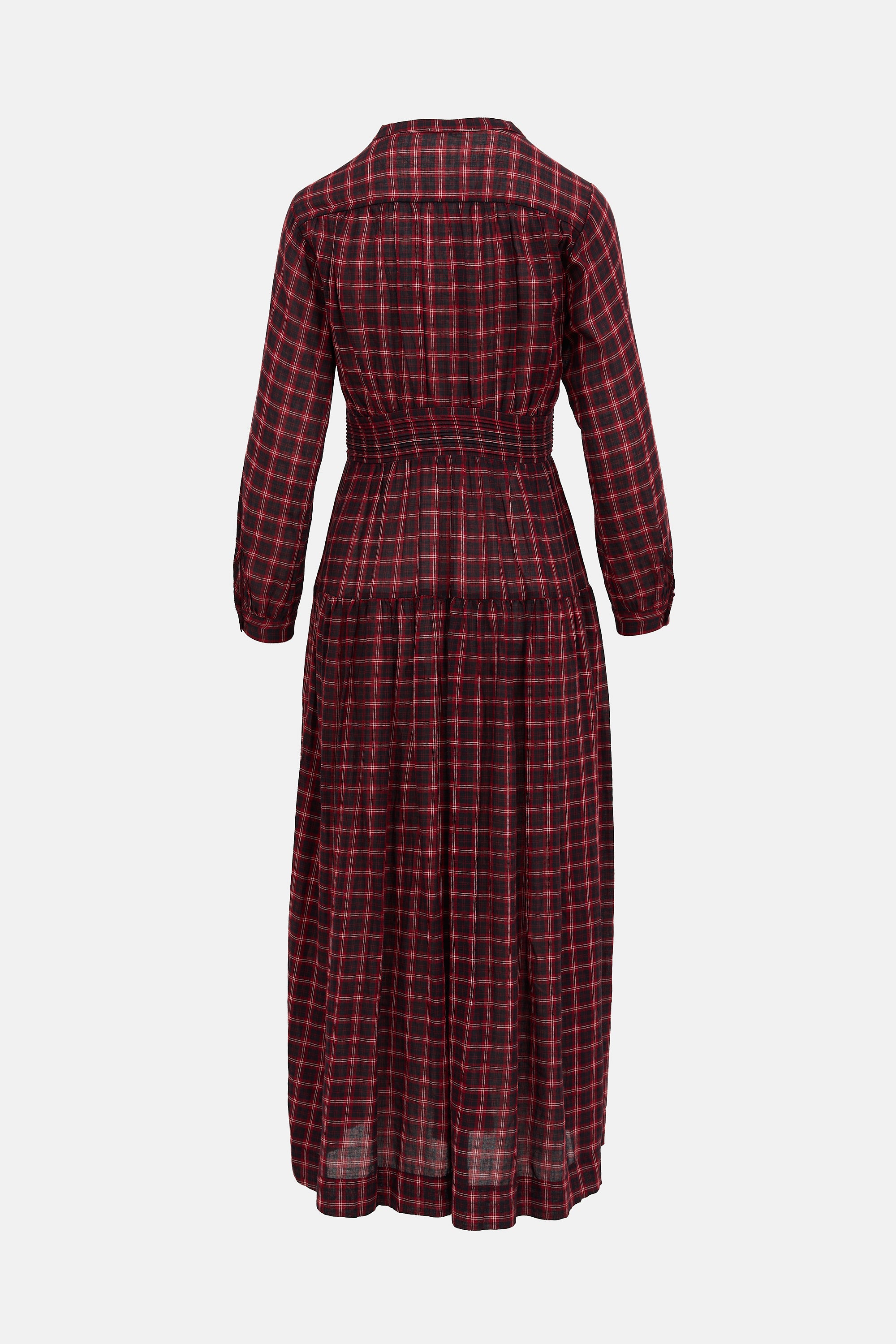 Pre-owned Dôen red and black plaid Annika long dress featuring a stand collar, gathered yoke, button front, ruched waist, tiered skirt, and buttoned cuffs.