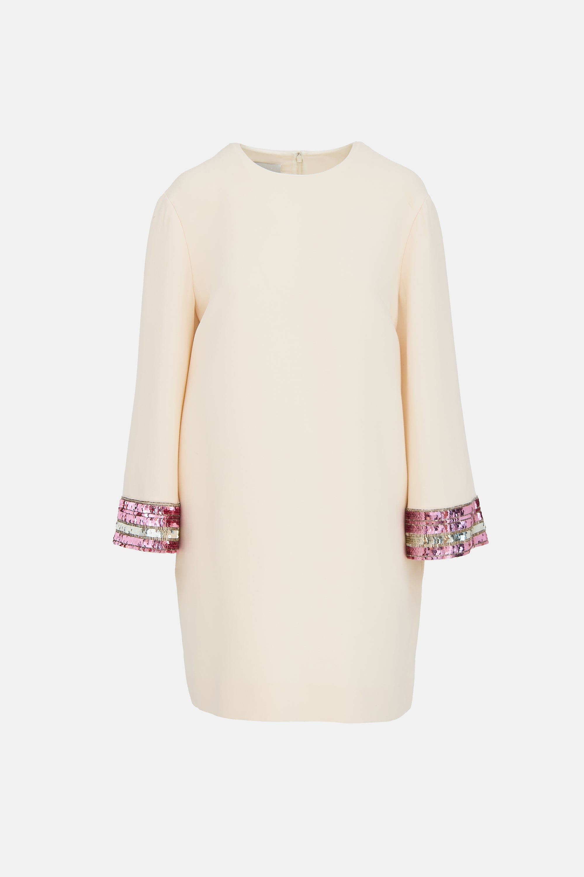 Pre-owned Valentino cream wool and silk dress featuring round neckline, pink and gold sequin embroidered cuffs, two inseam pockets, and concealed zip closure at back. Lined.