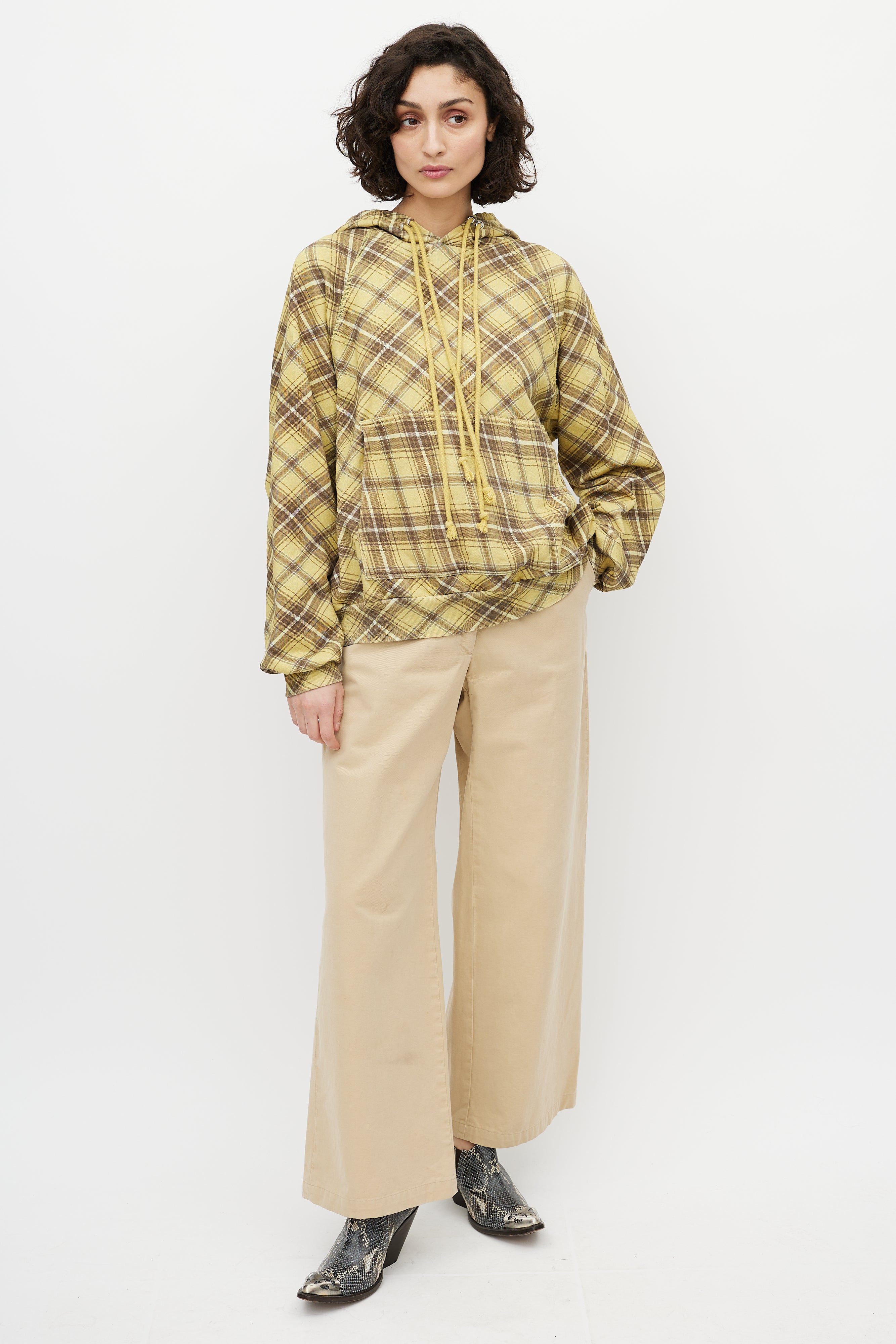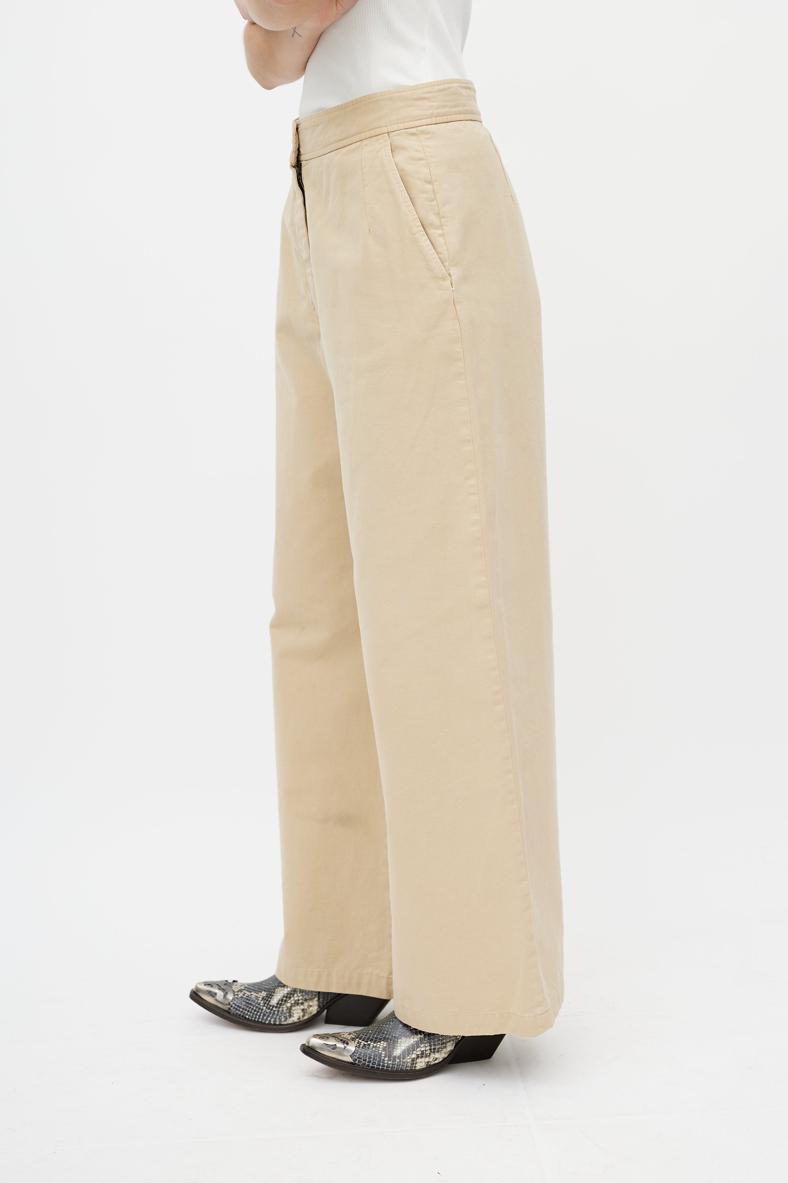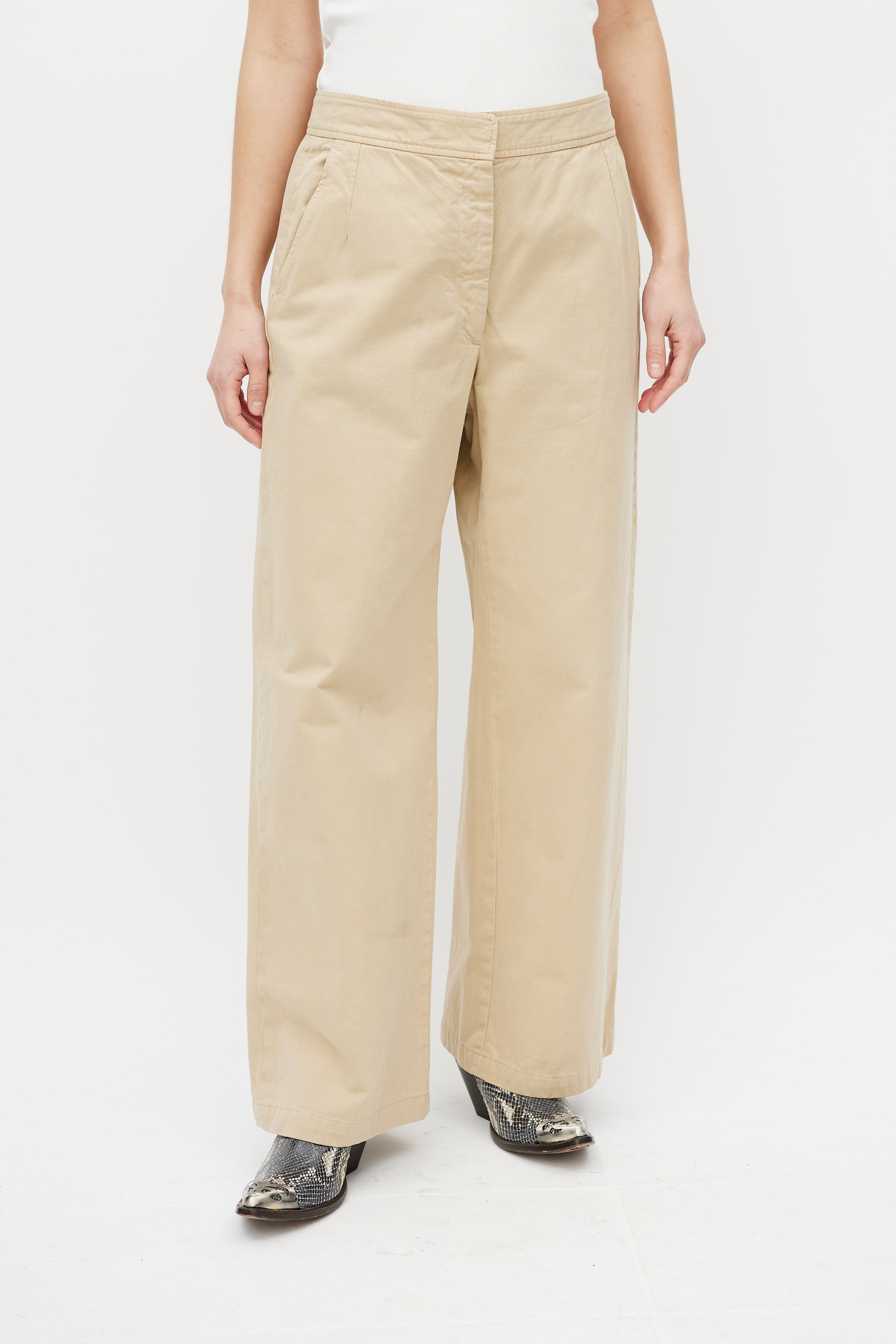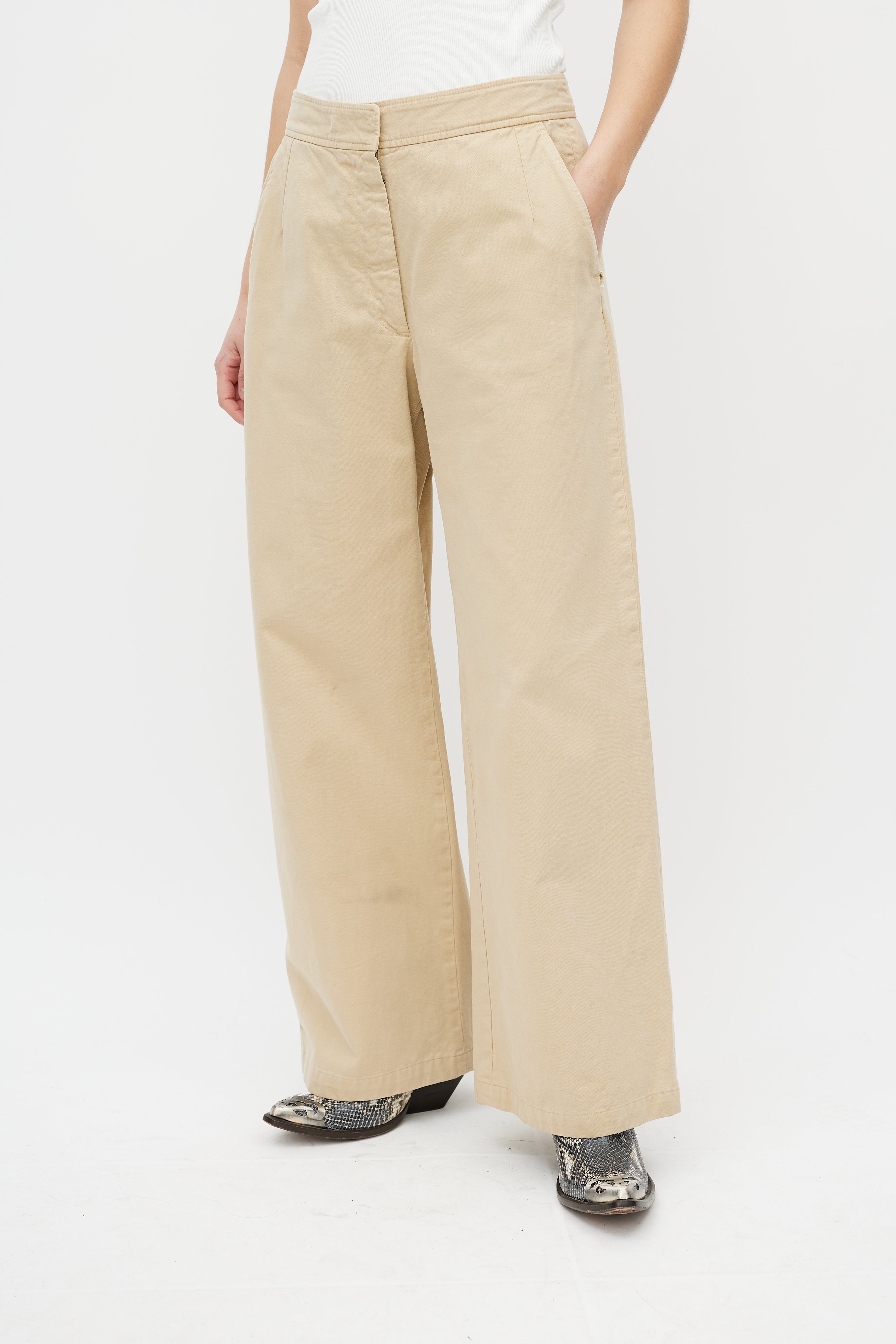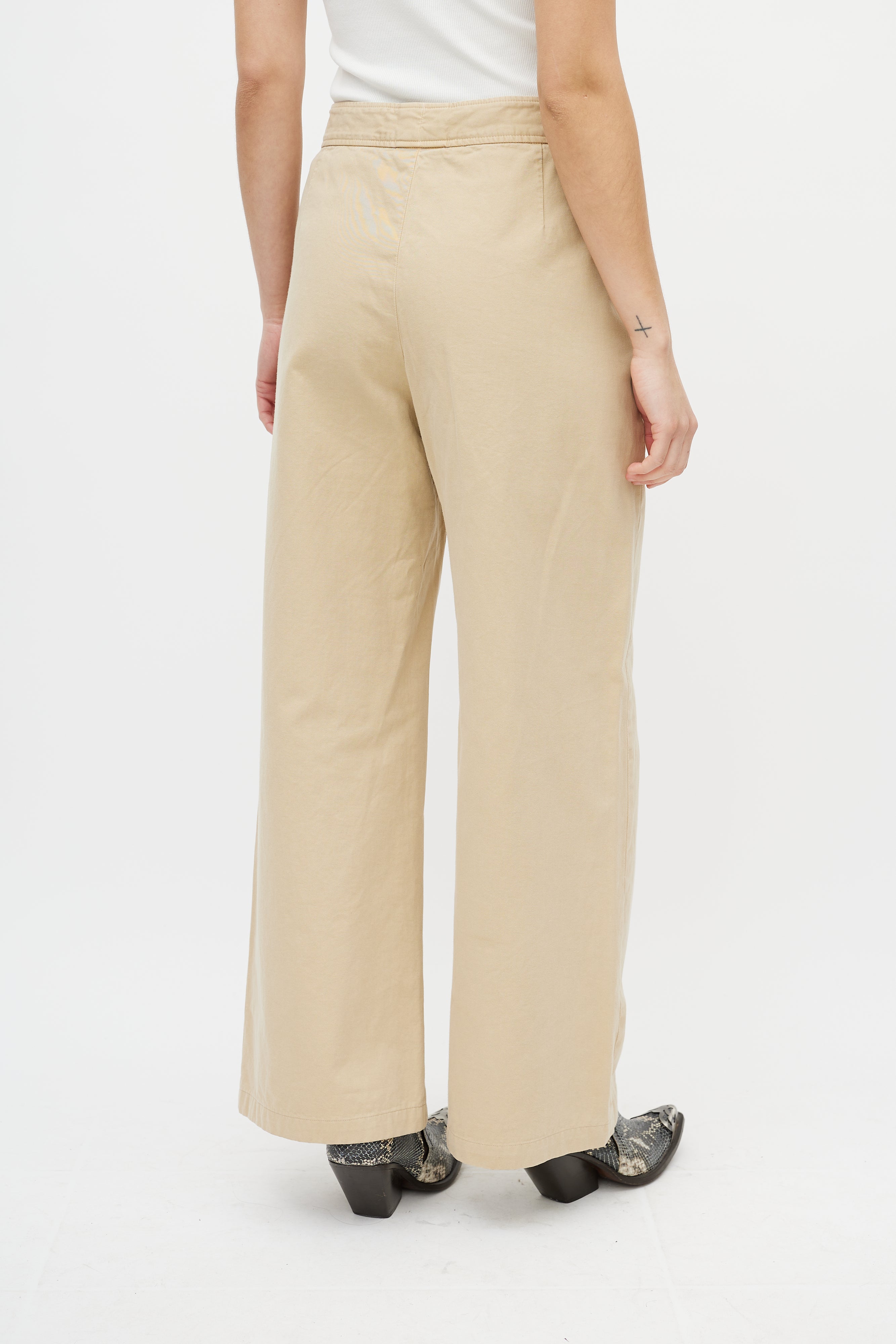Pre-owned Dries Van Noten beige trousers featuring two slip pockets at hip, wide leg, and zip fly with hook and eye closure.