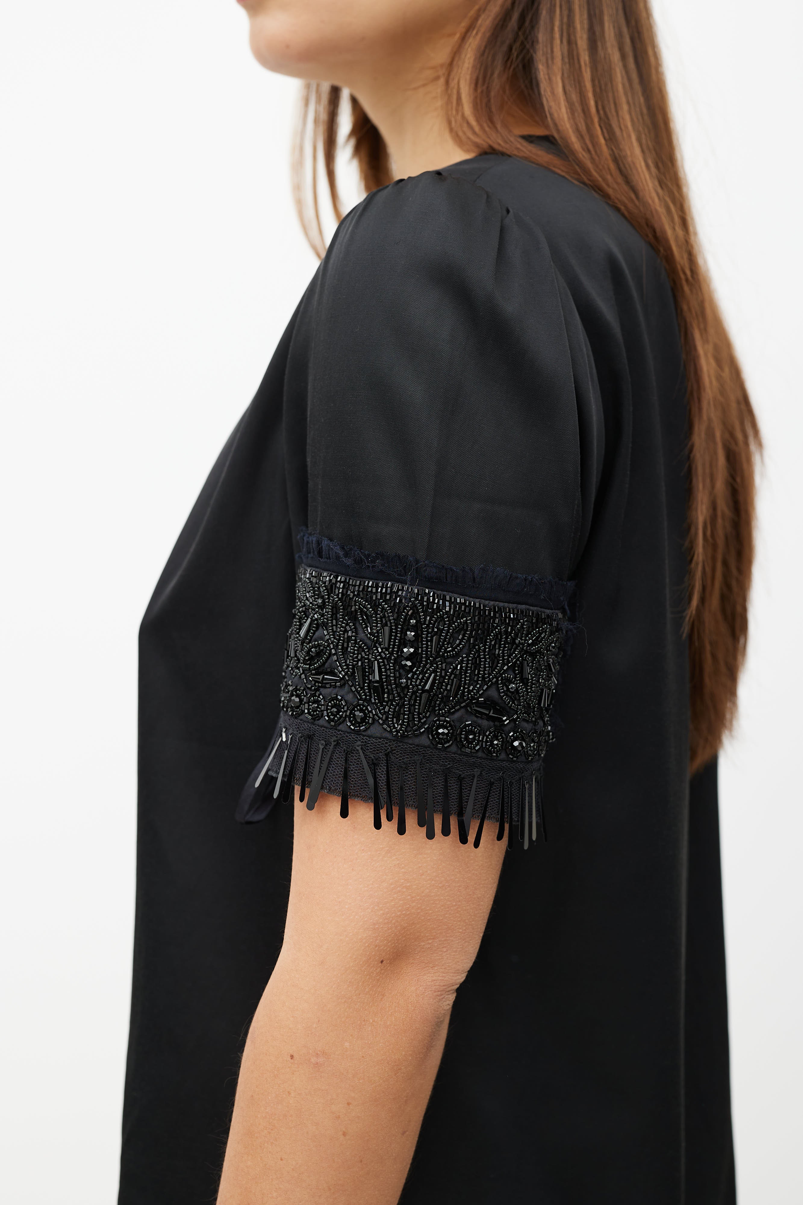 Pre-owned Dries Van Noten black cotton blend top featuring a round neckline with pleats at front, darts at back neck, back hook and eye fastening, short sleeves with gathering at shoulders, and sleeve embellishments with beads, ribbons, and mixed textiles.