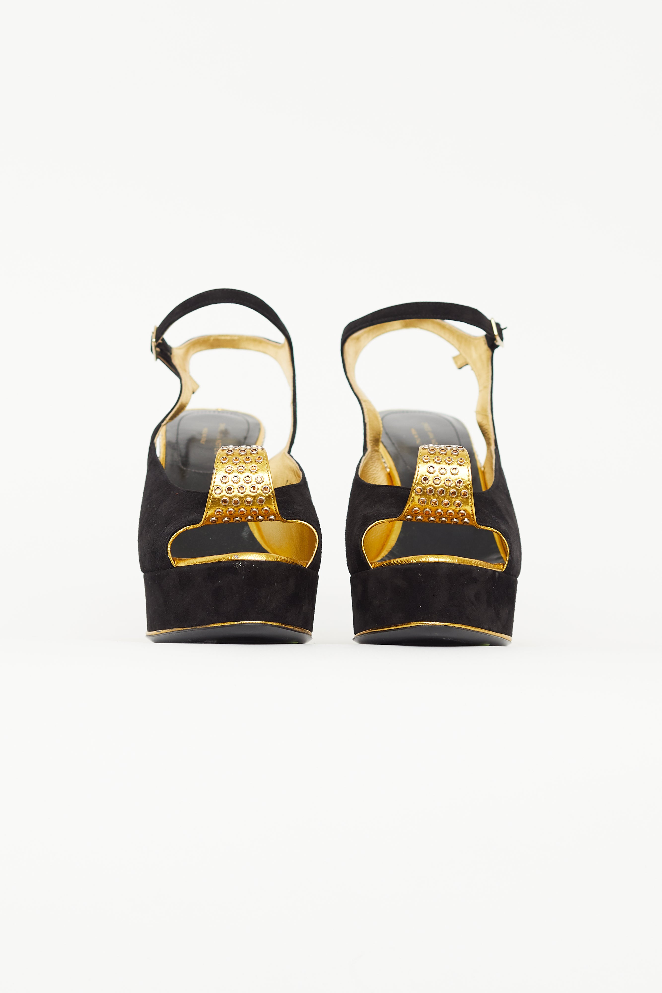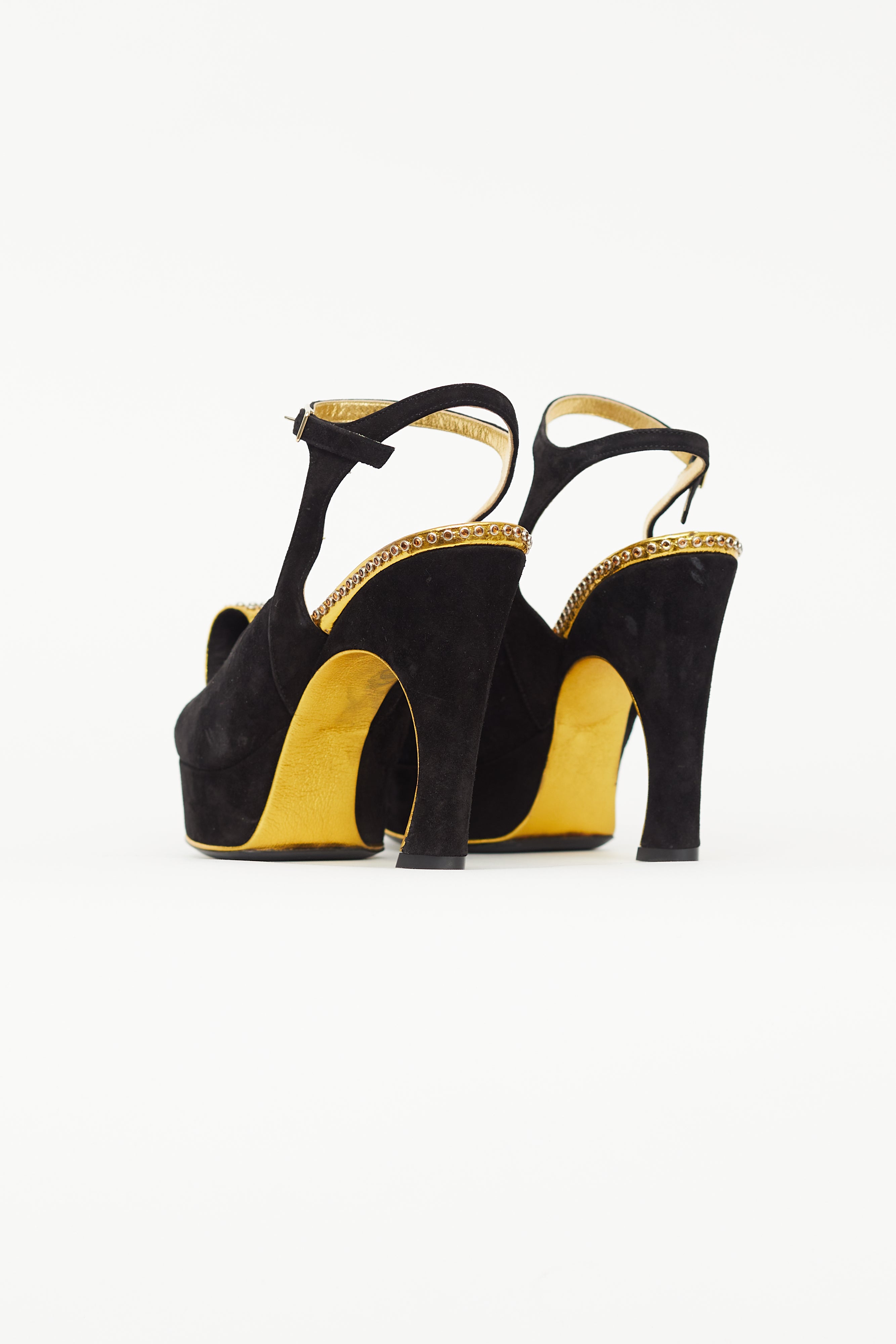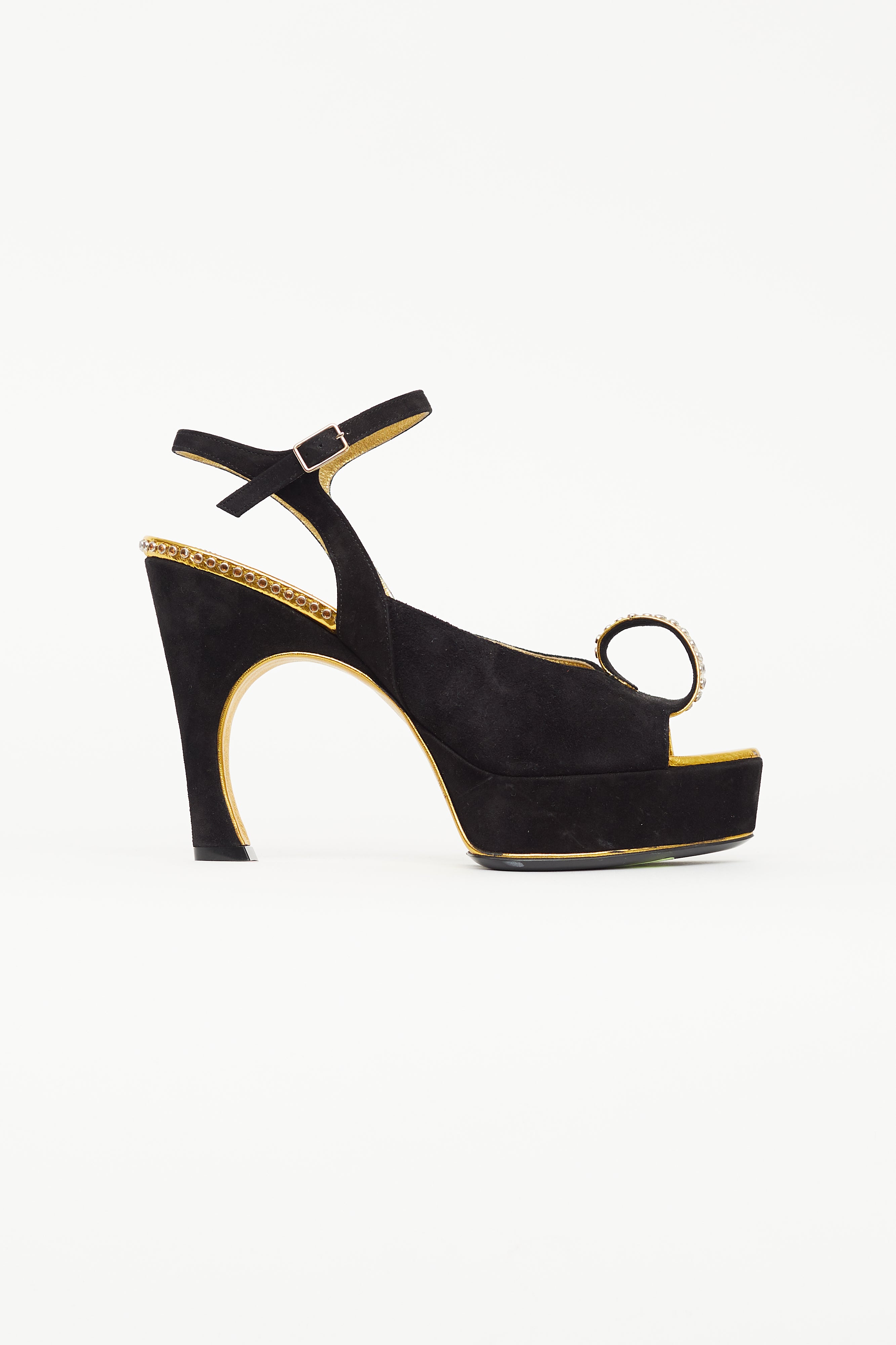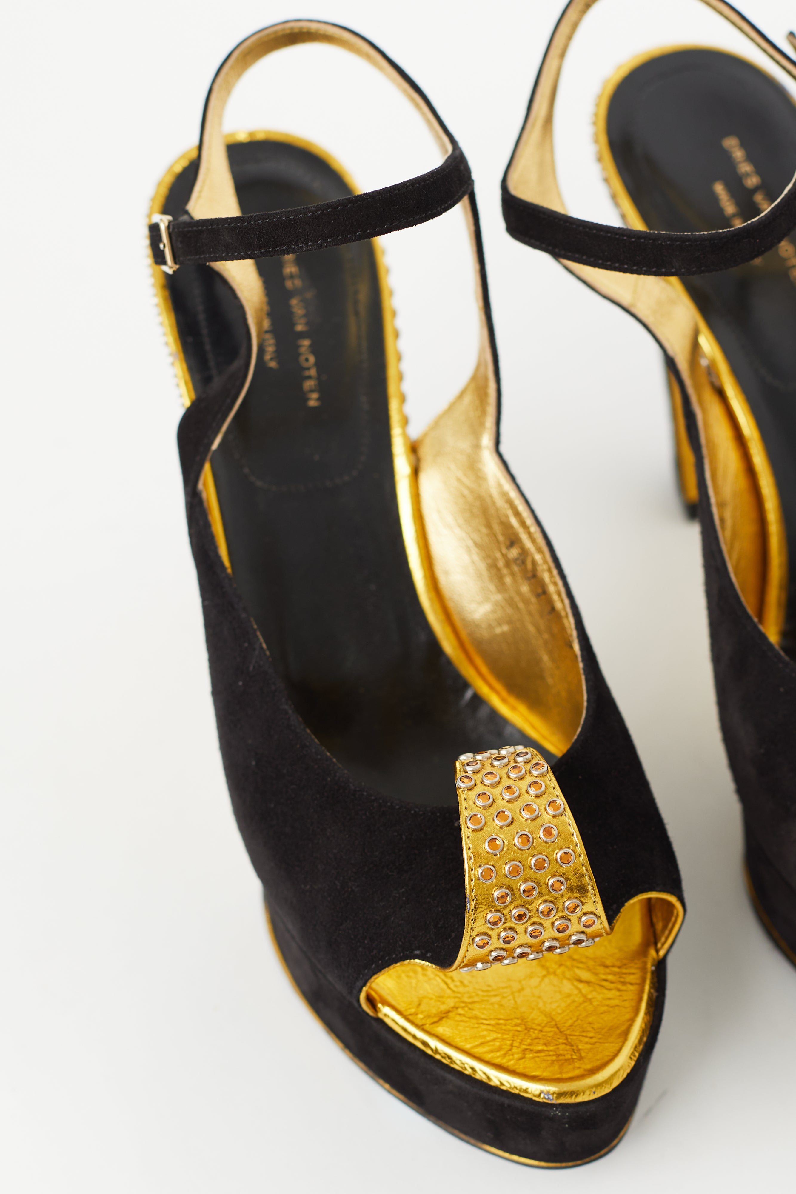 Pre-owned Dries Van Noten black heels featuring suede upper, gold leather lining, open almond toe, ankle strap with buckle fastening, pink gem and gold leather embellished detail at vamp, gem embellishment at back of heel, and curved block heel.