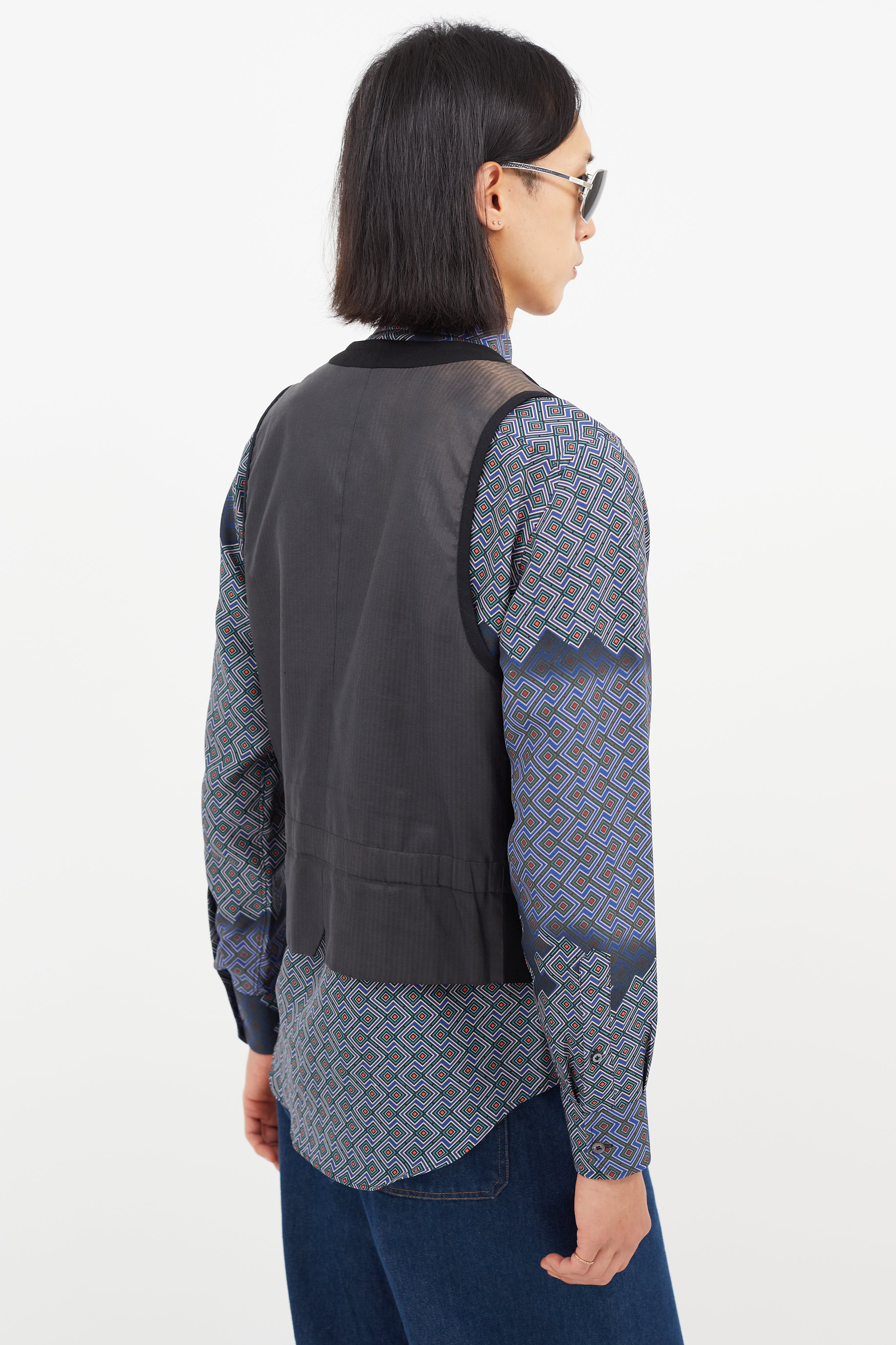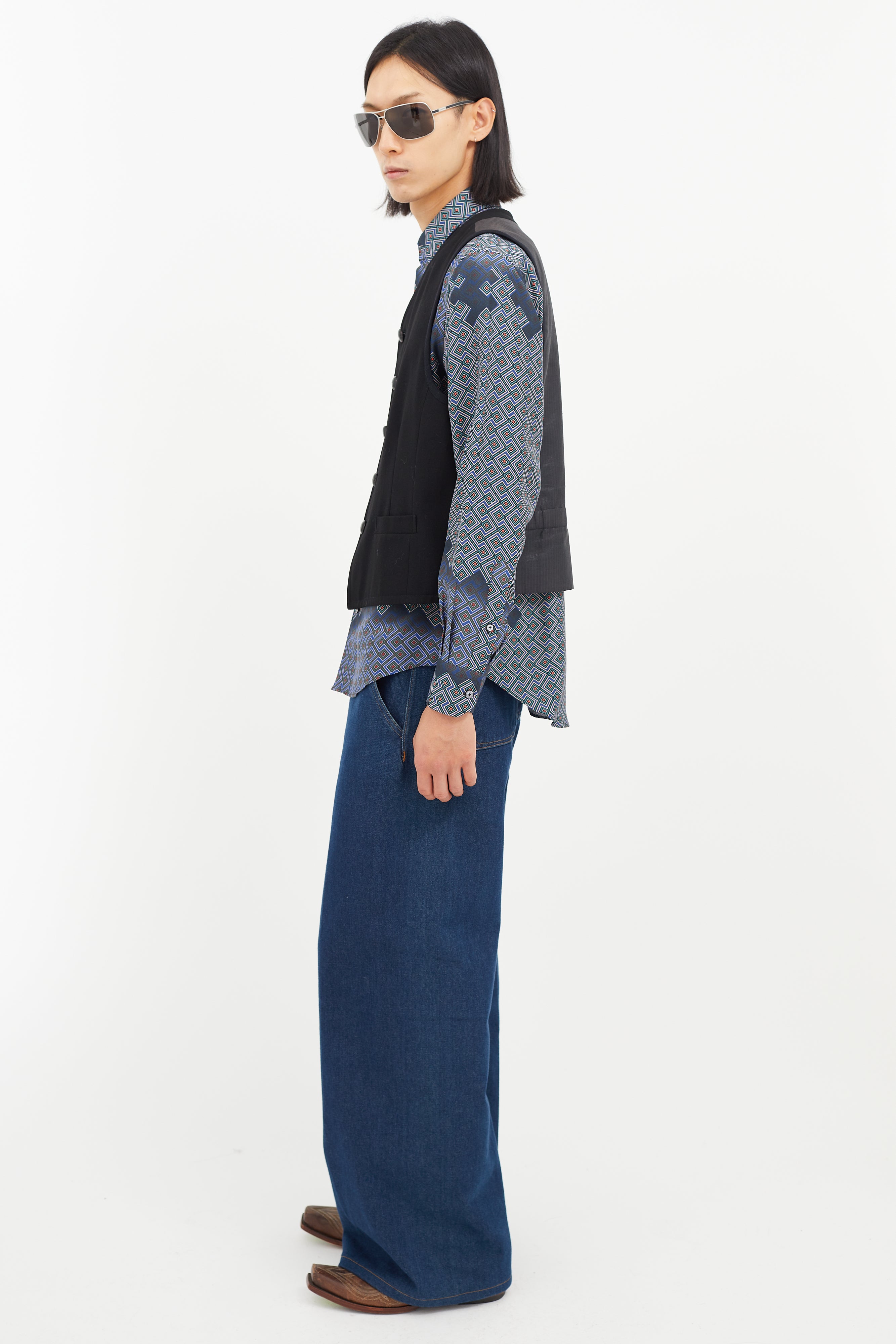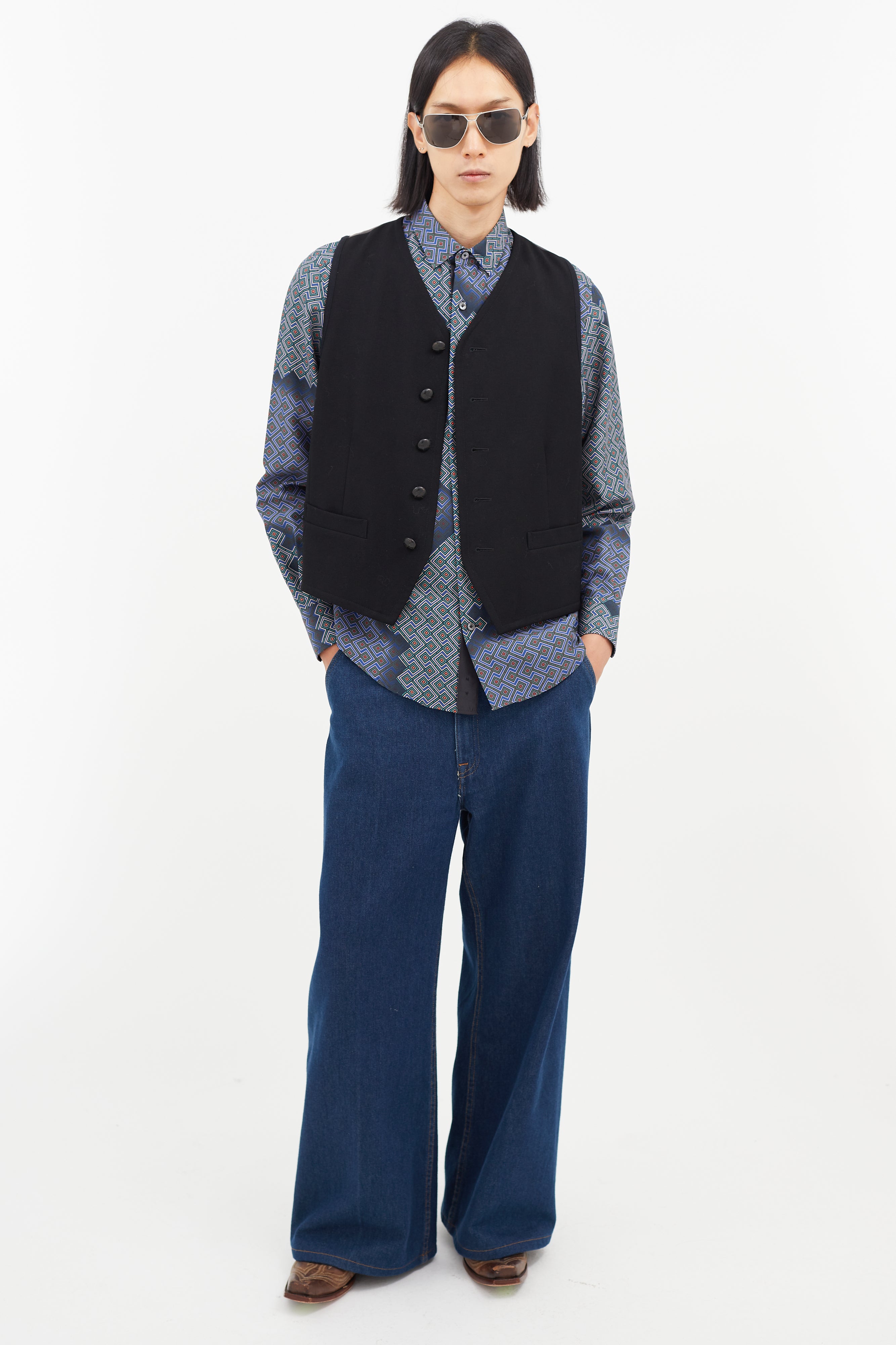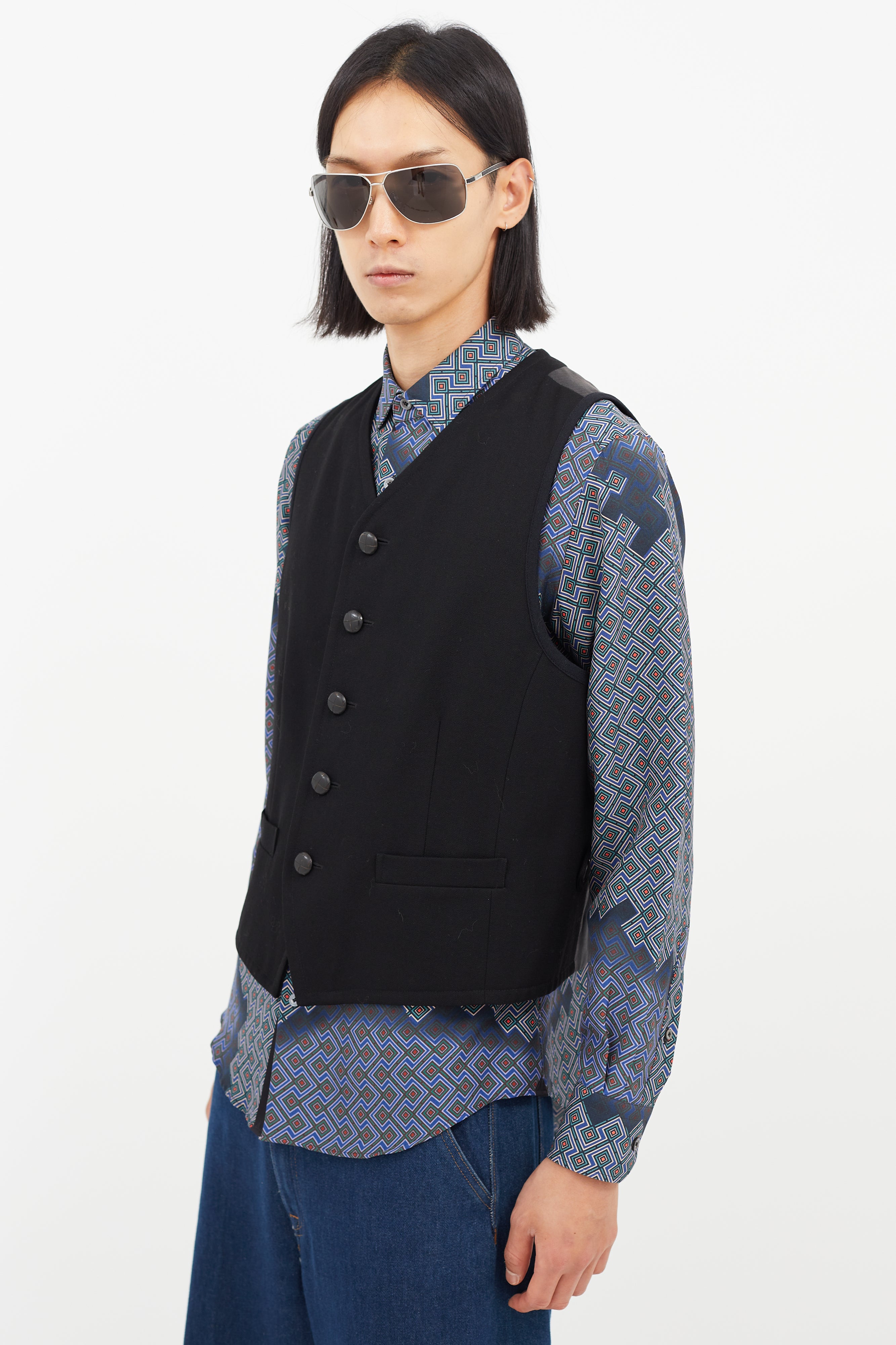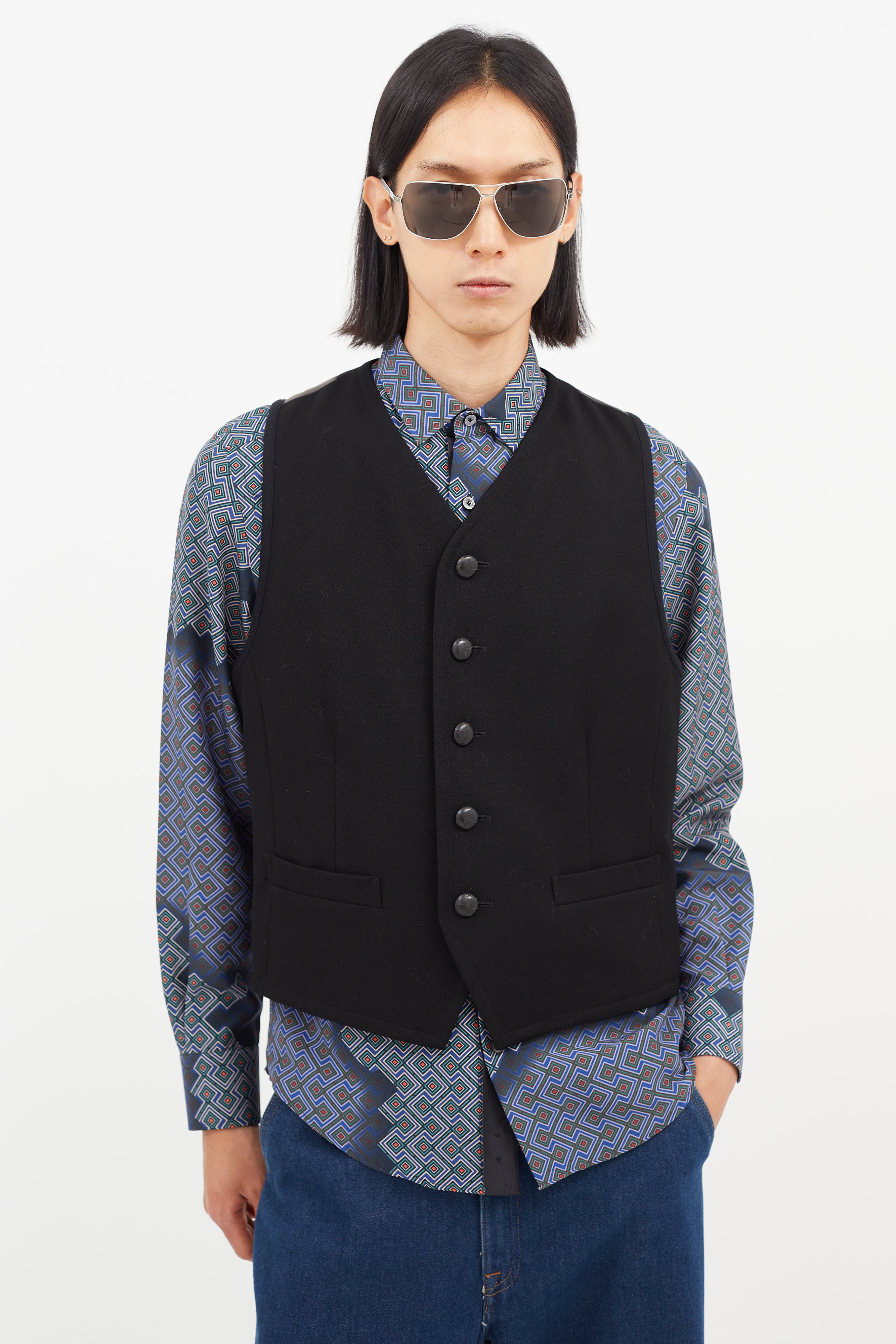 Pre-owned Dries Van Noten black wool vest featuring a grey striped panel at back, V-neckline, two slip pockets at hip, and button up front.