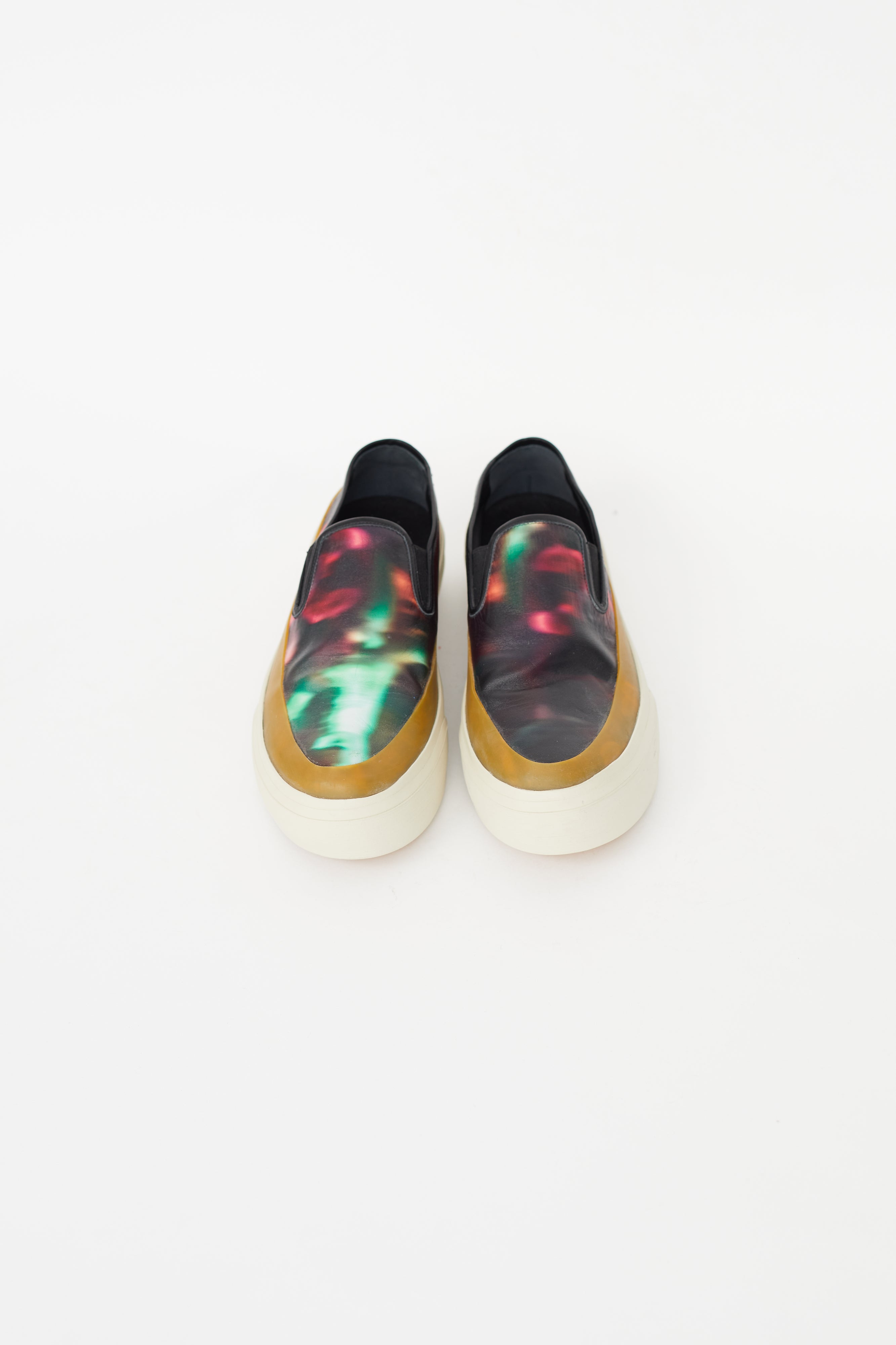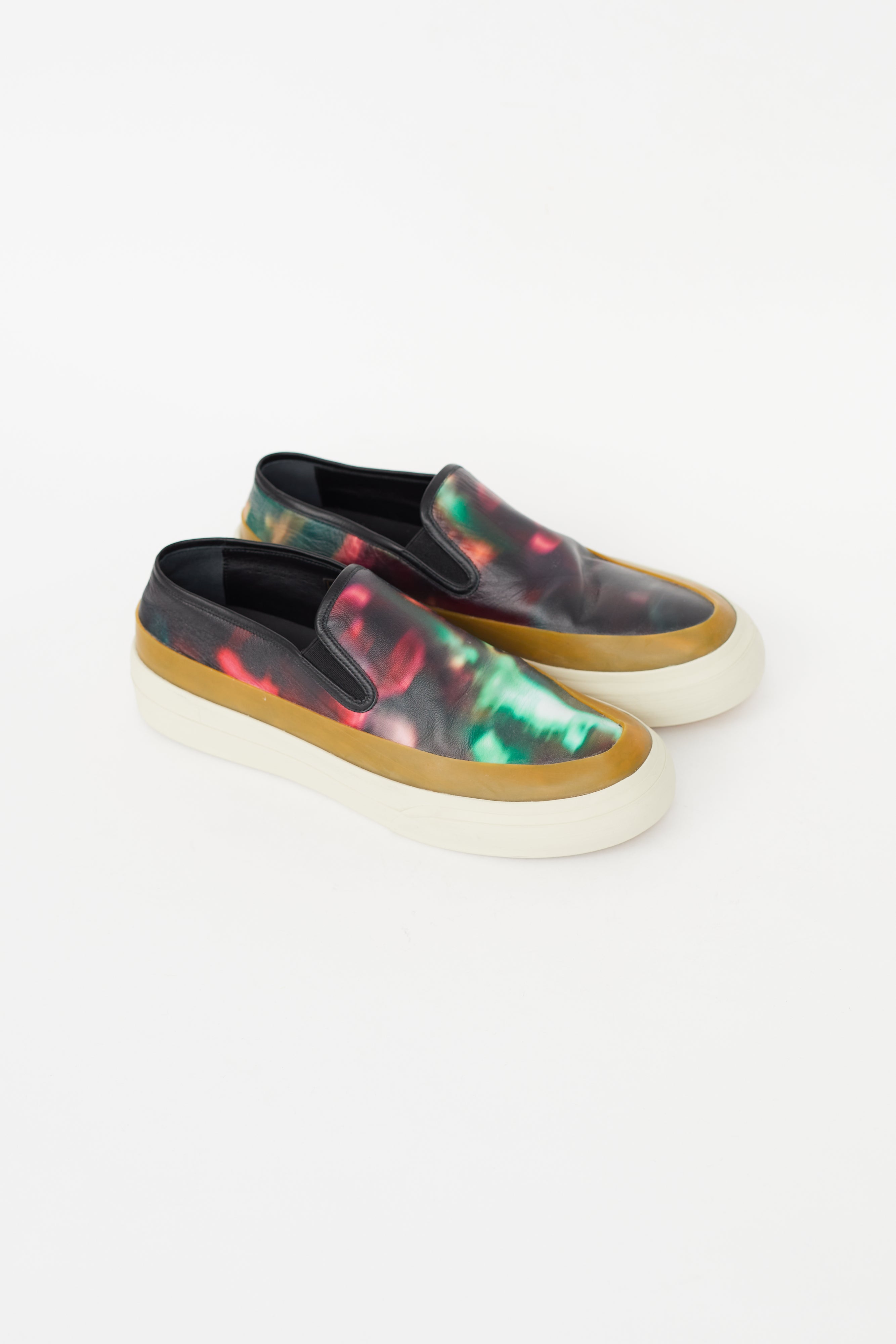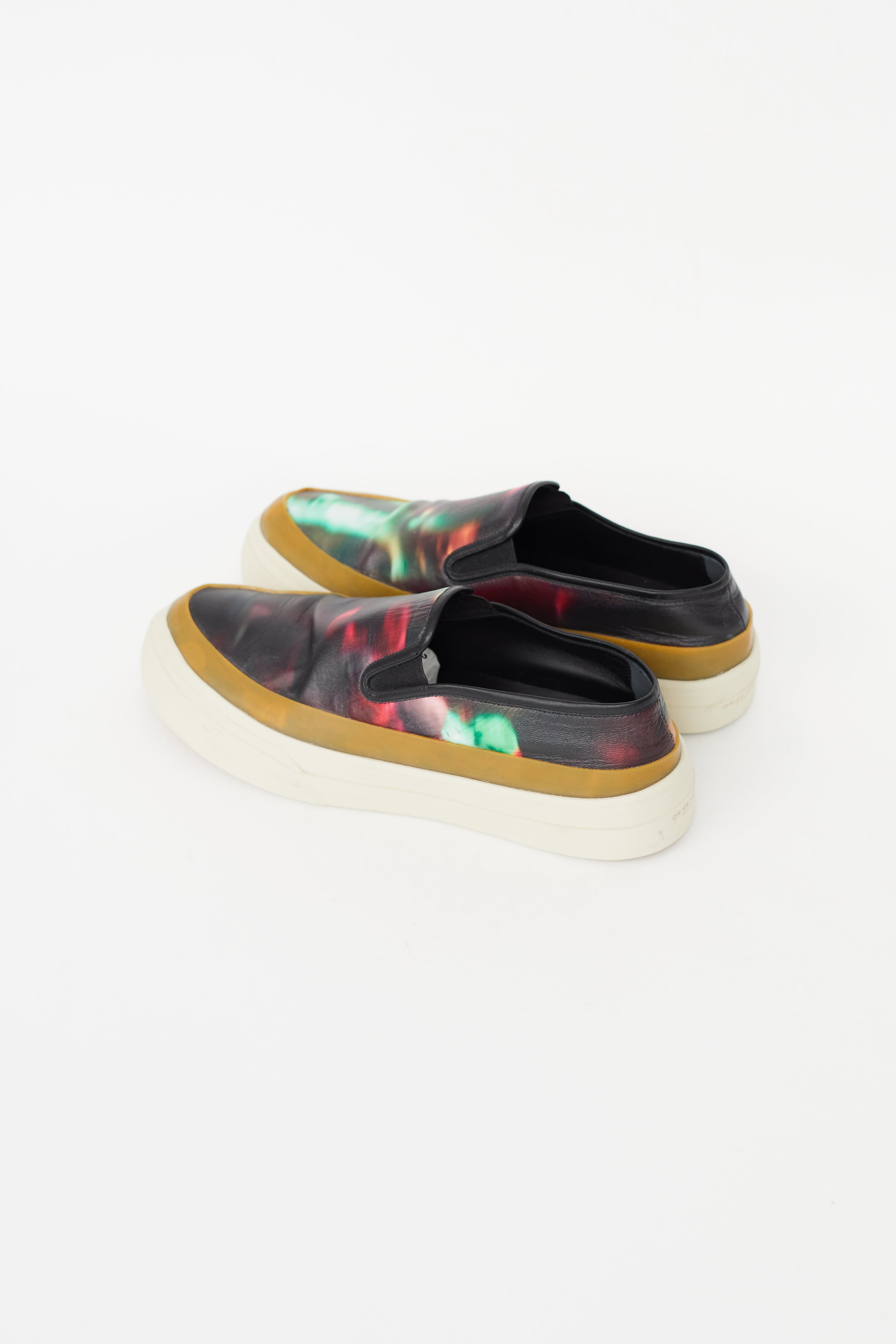 Pre-owned Dries Van Noten black leather sneakers featuring a round toe, multicolour print at upper, rubber midsole, embossed logo at heel, and slip on entry.