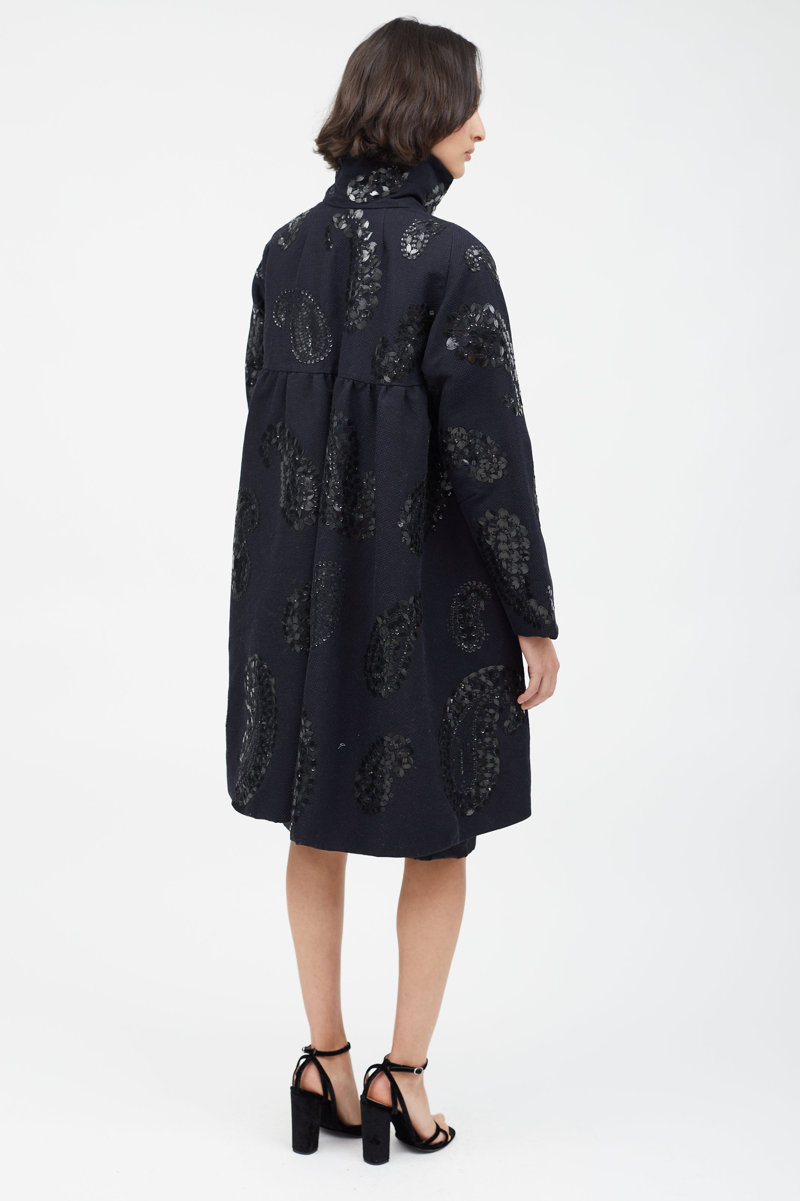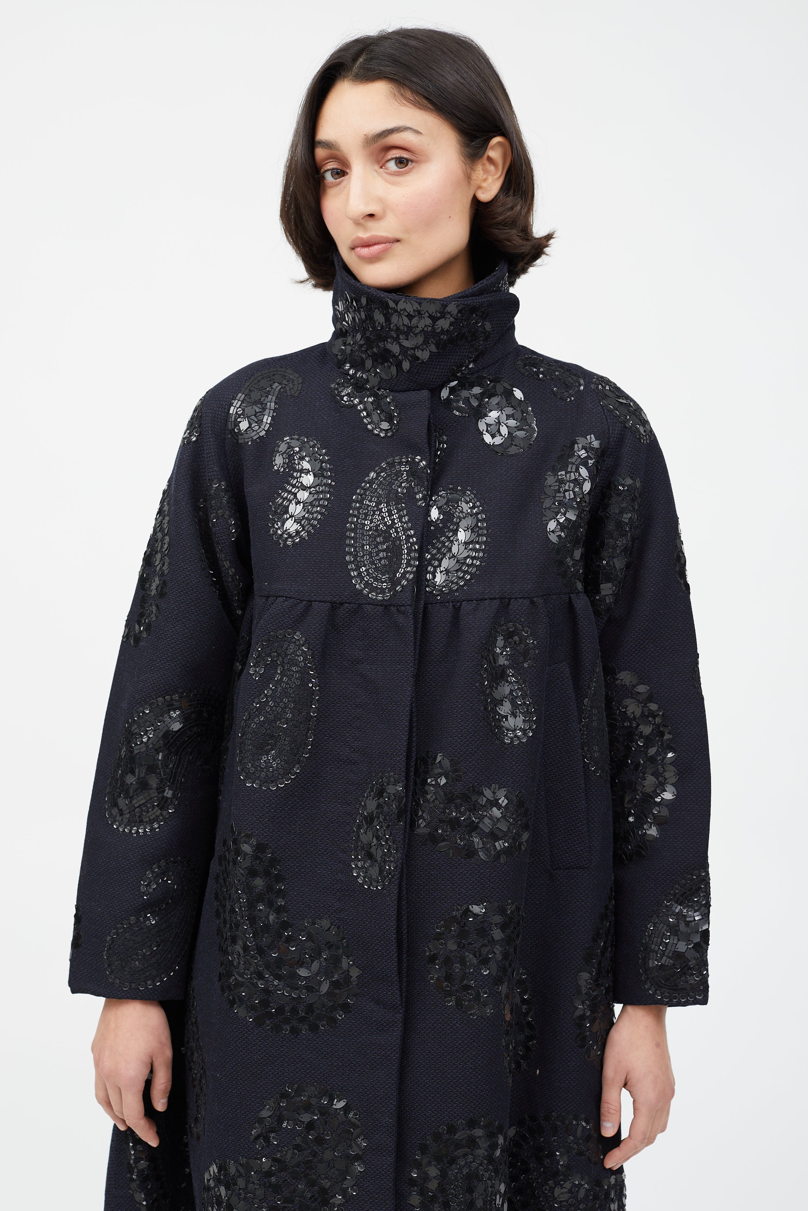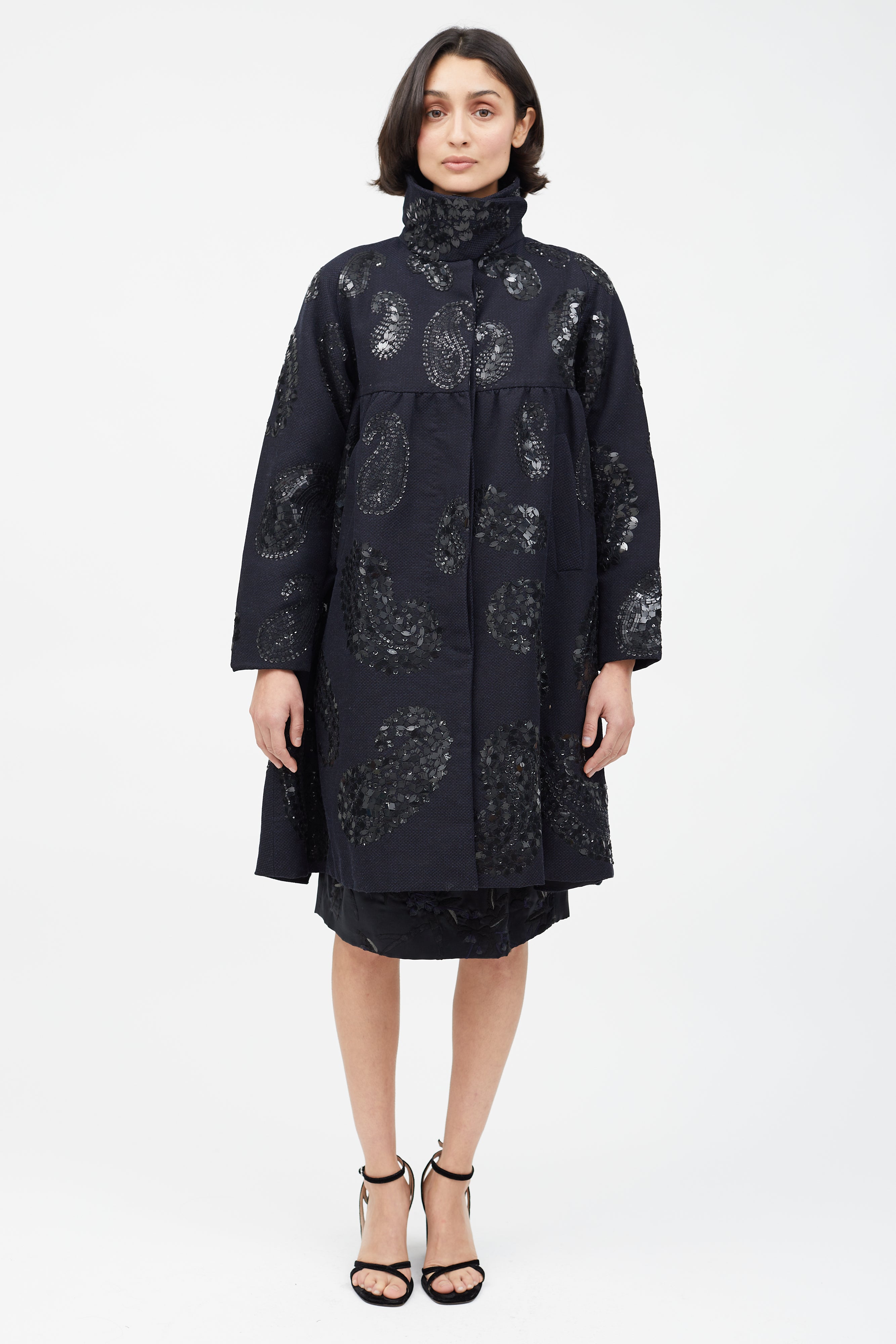 Pre-owned Dries Van Noten black coat featuring convertible collar with button fastening, concealed button up front, tonal sequin paisley embellishment throughout, empire waistline, and two hip pockets. Lined.