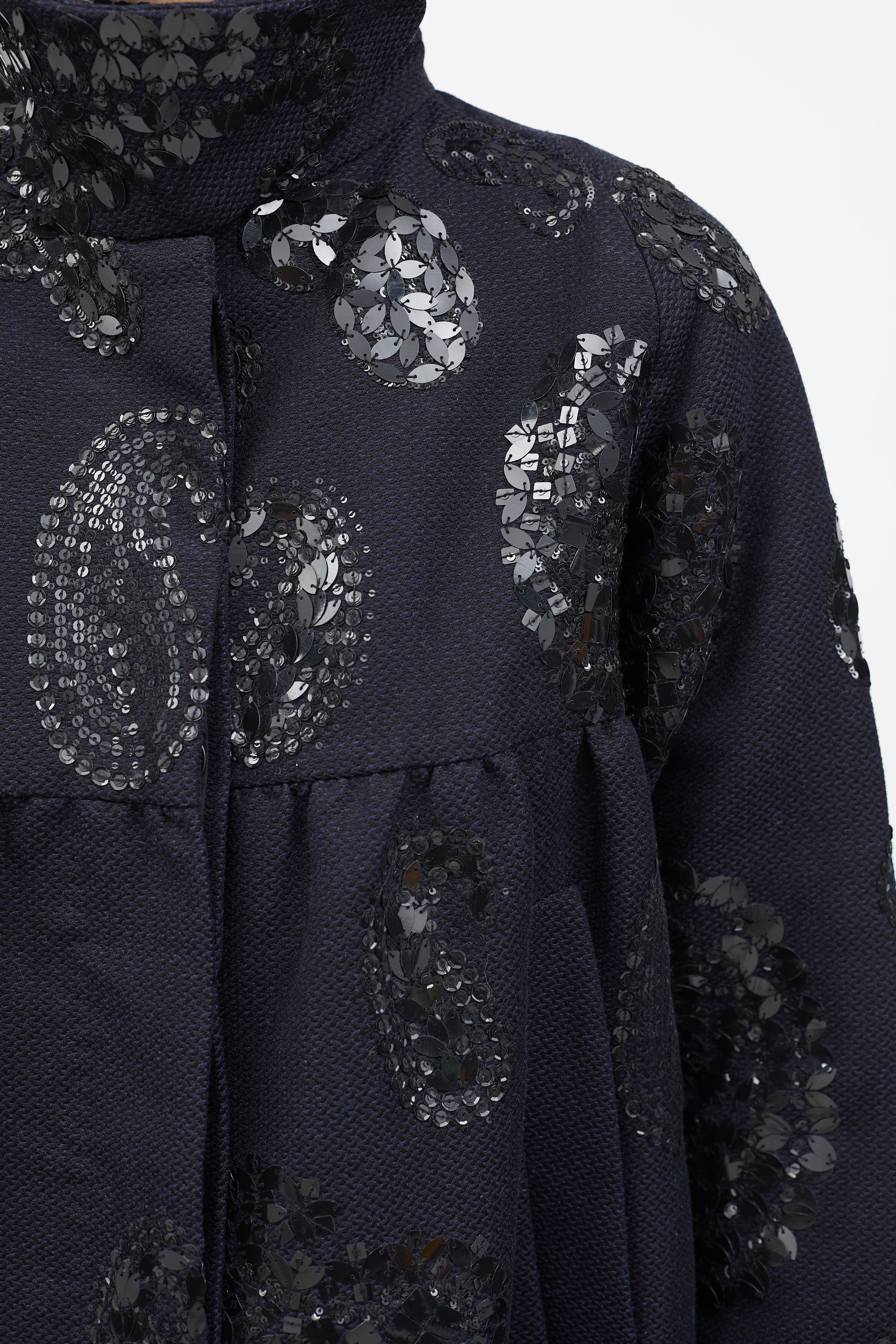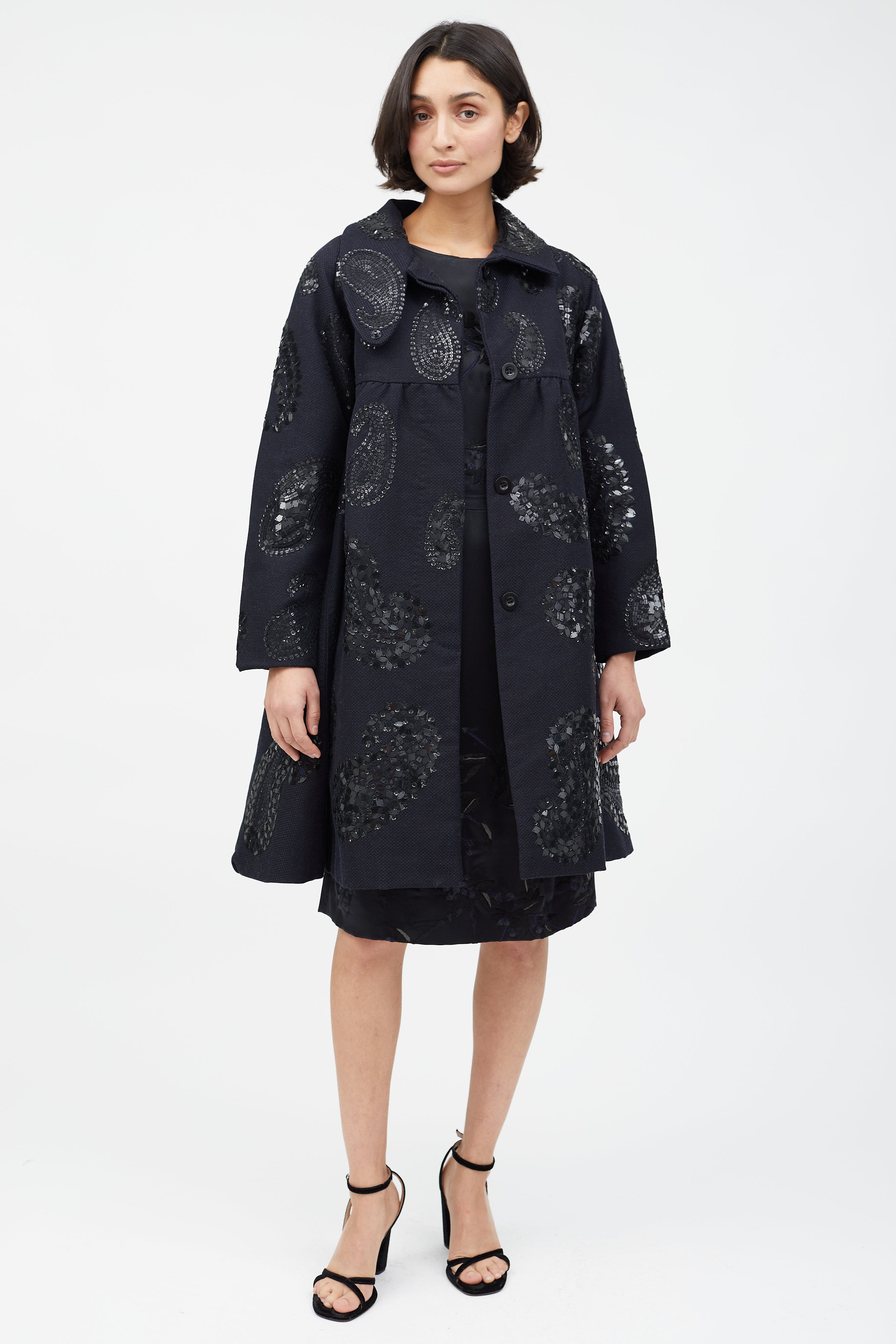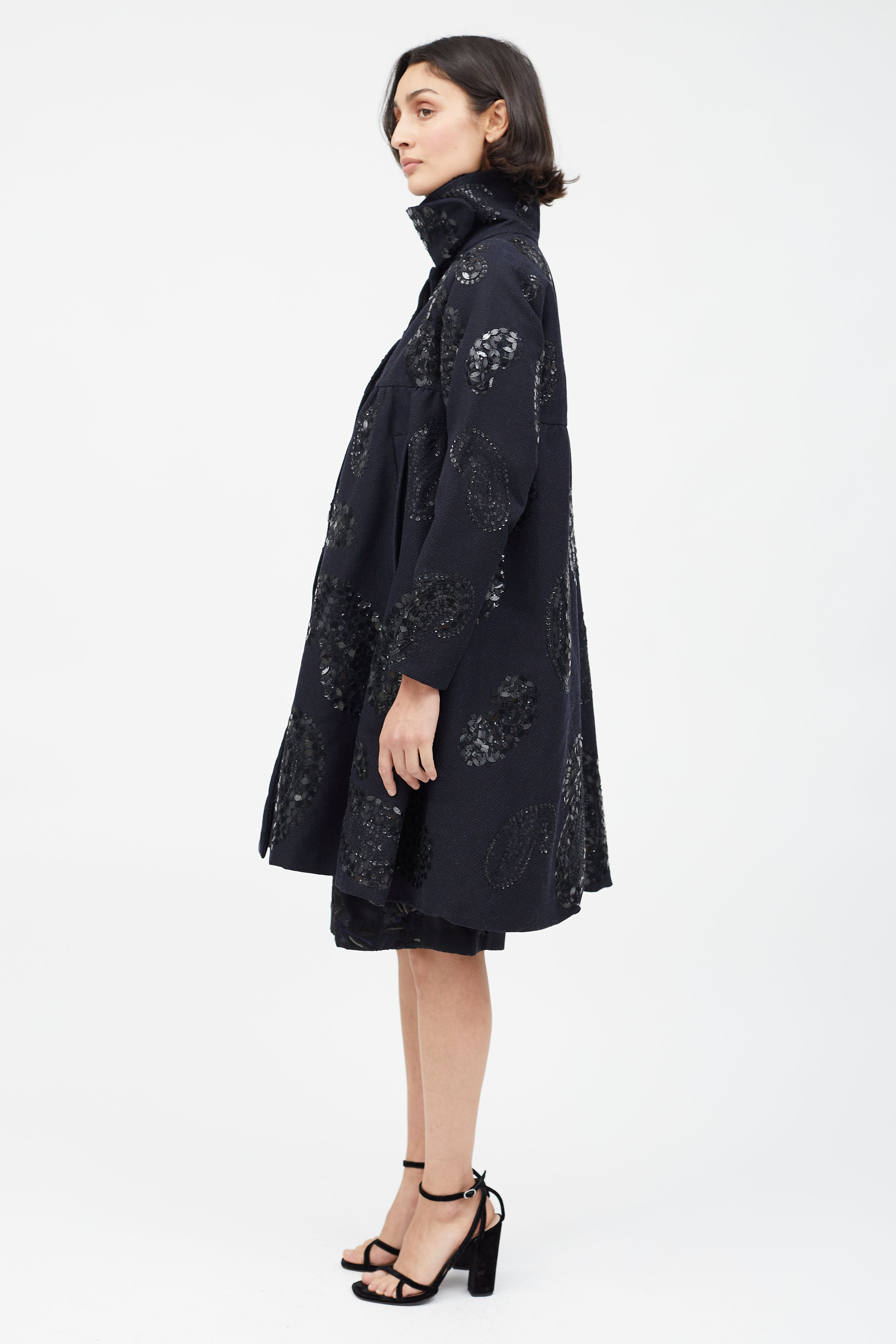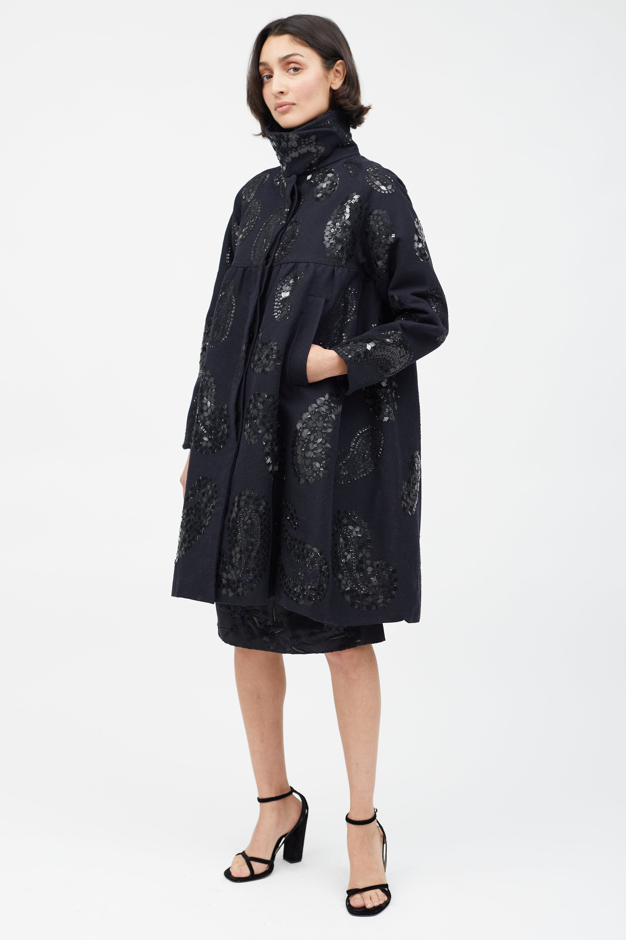 Pre-owned Dries Van Noten black coat featuring convertible collar with button fastening, concealed button up front, tonal sequin paisley embellishment throughout, empire waistline, and two hip pockets. Lined.