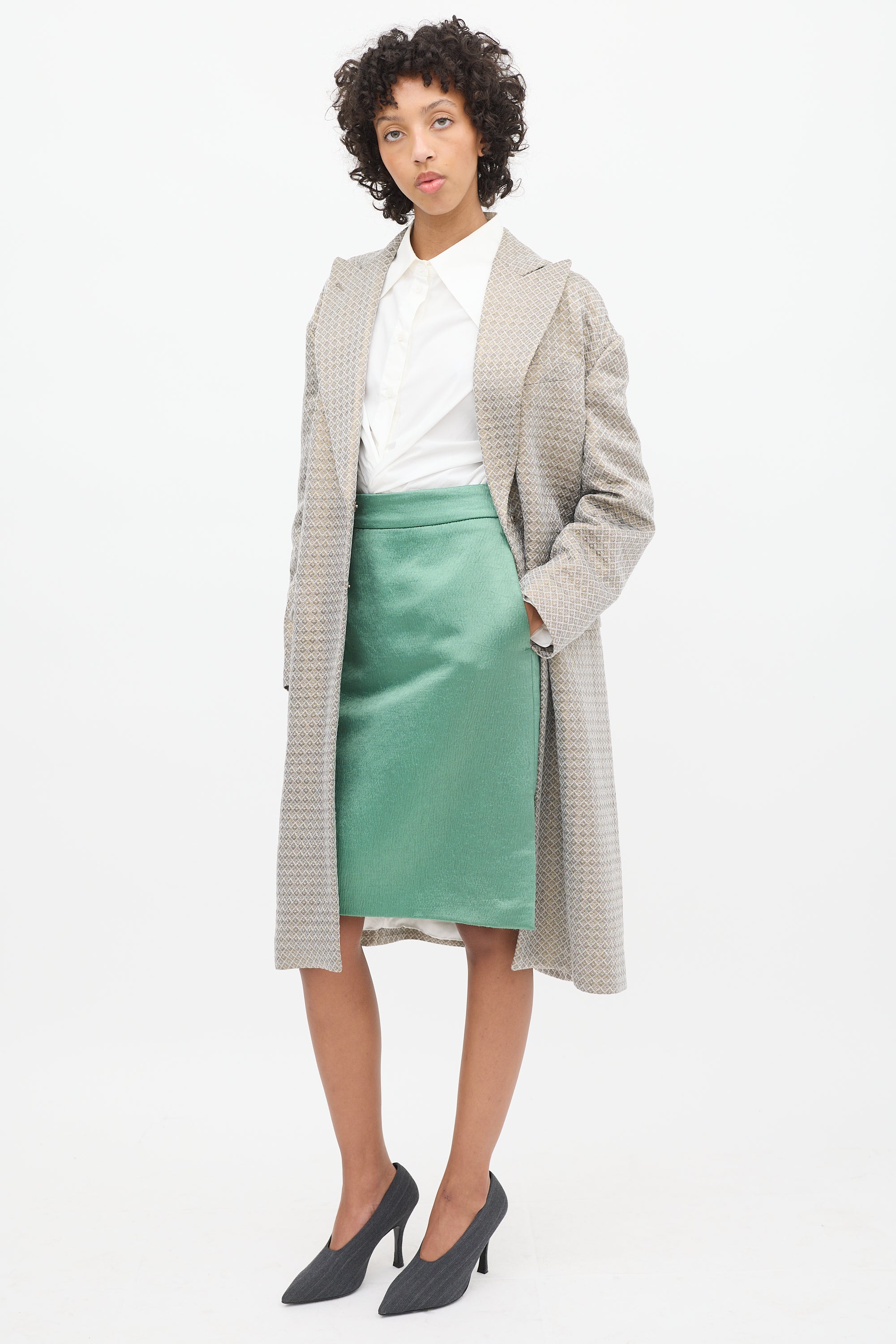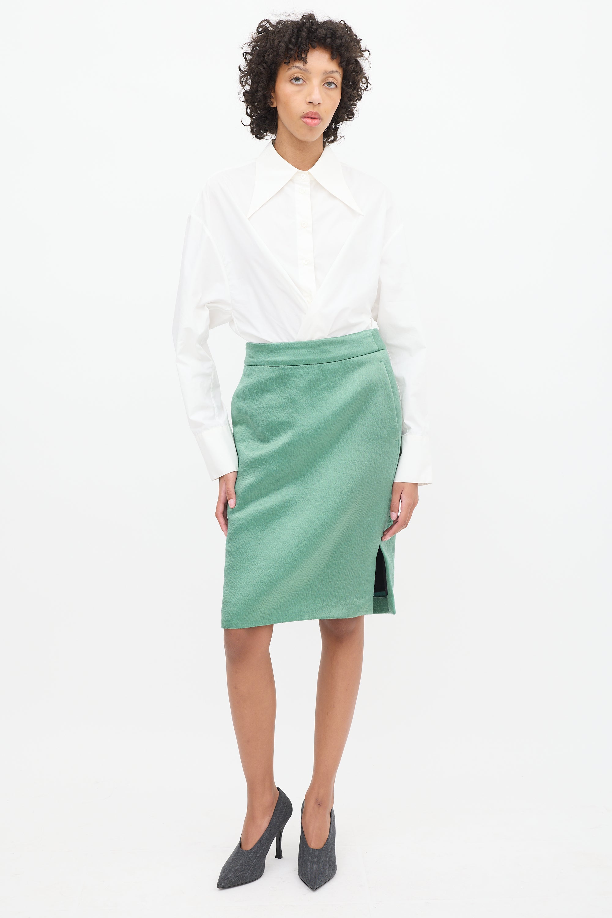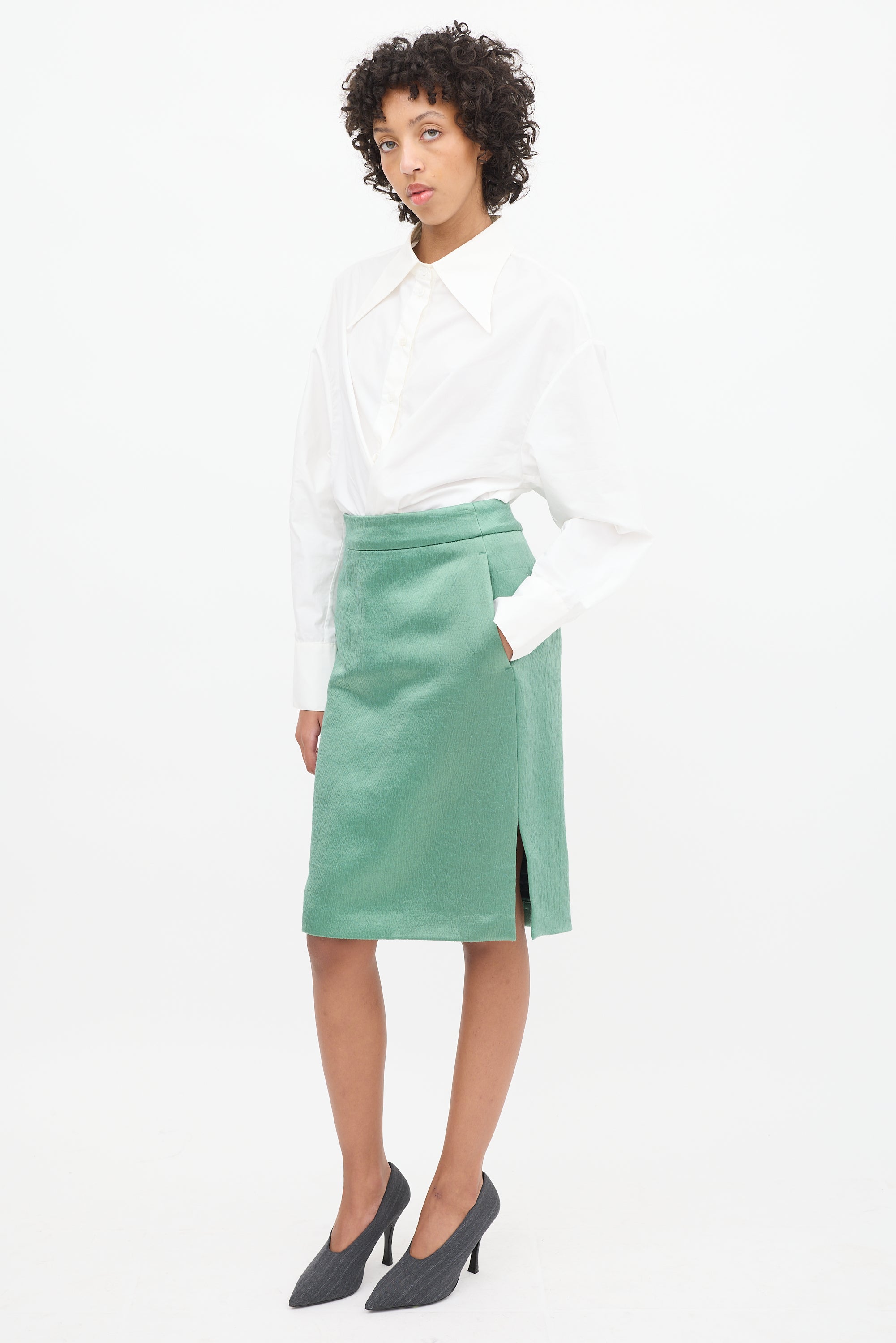 Pre-owned Dries Van Noten light green midi pencil skirt featuring a high waist, puckering throughout, in seam pockets, left side slit, and concealed back zip. Lined.