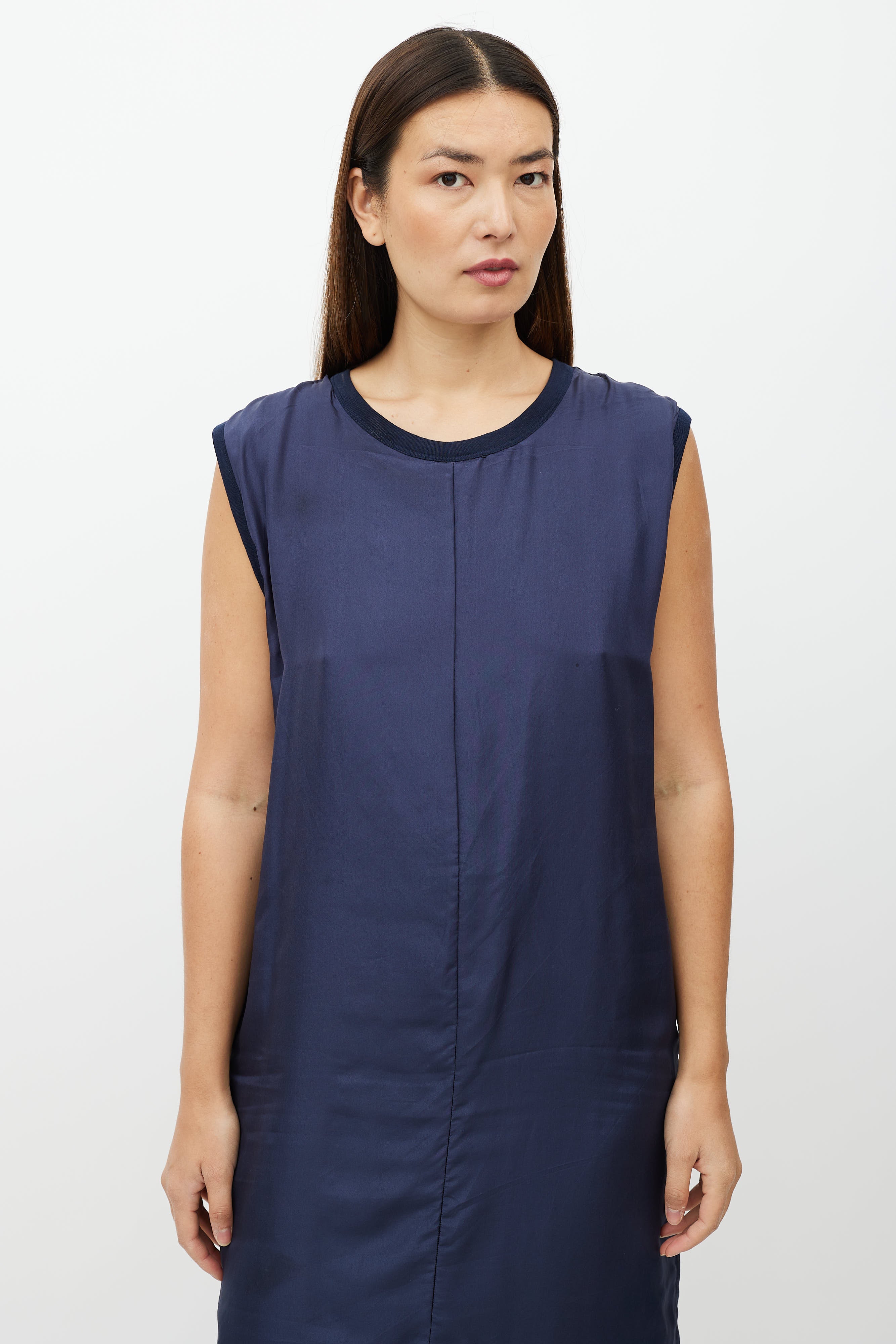 Pre-owned Dries Van Noten navy sleeveless shift dress featuring a rounded neckline, back slit, centre front and back seams, and contrast trim at neck and arm holes. Lined.