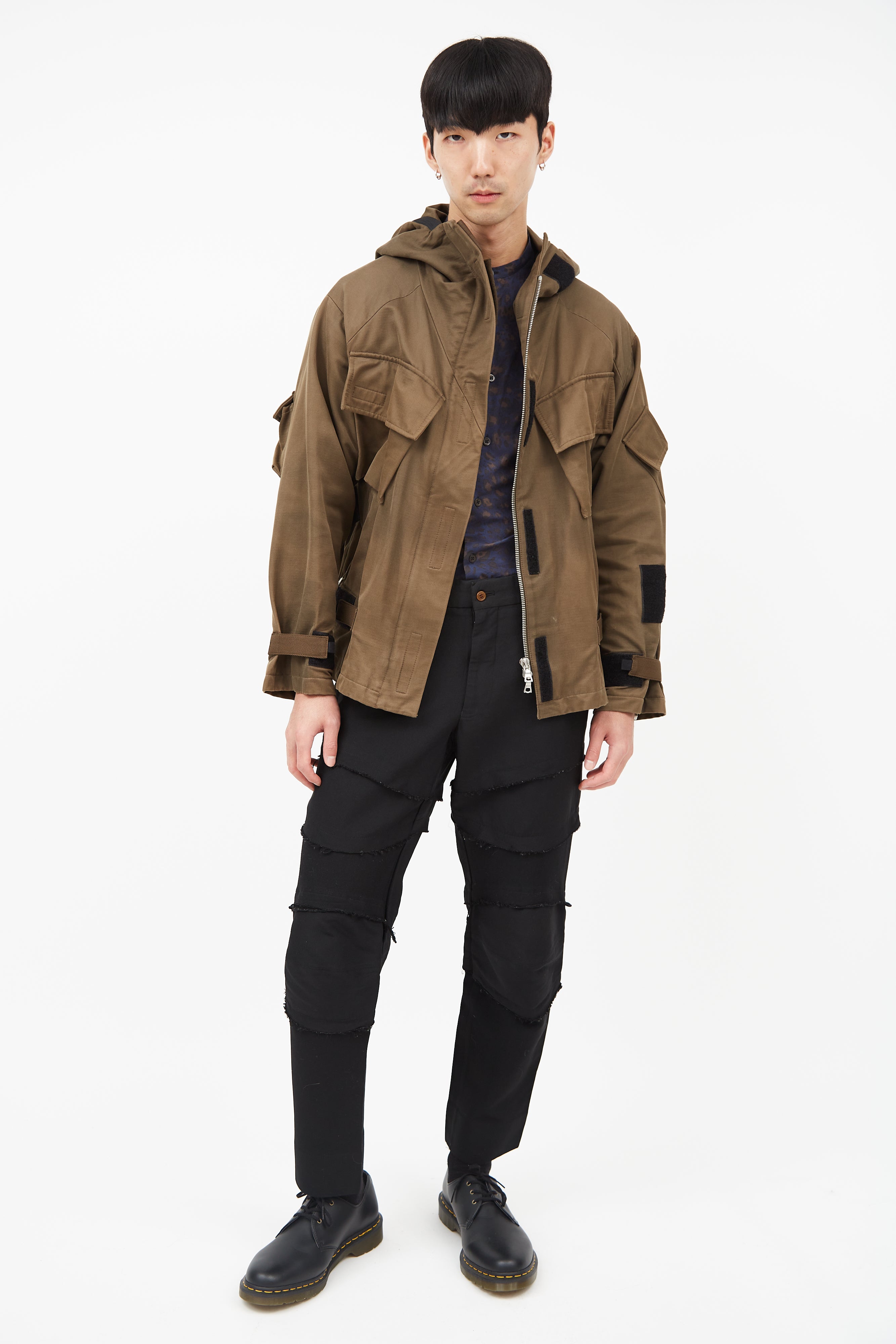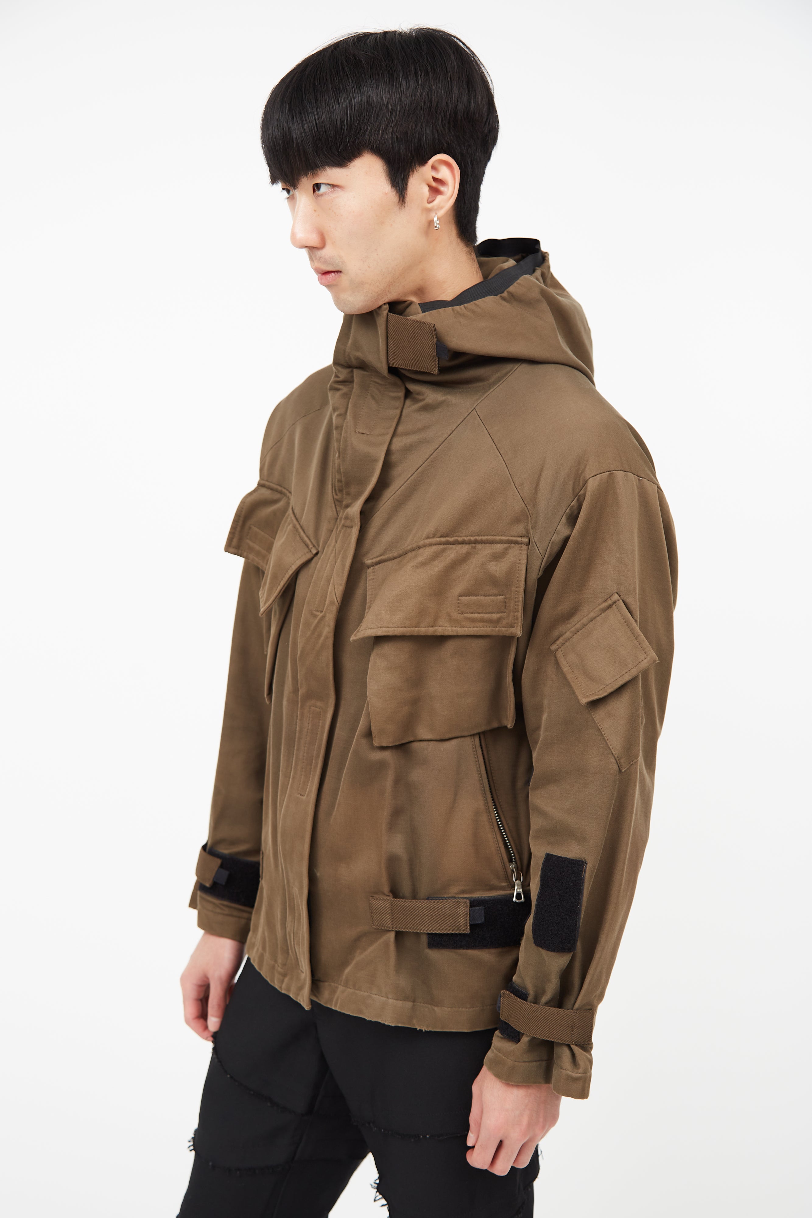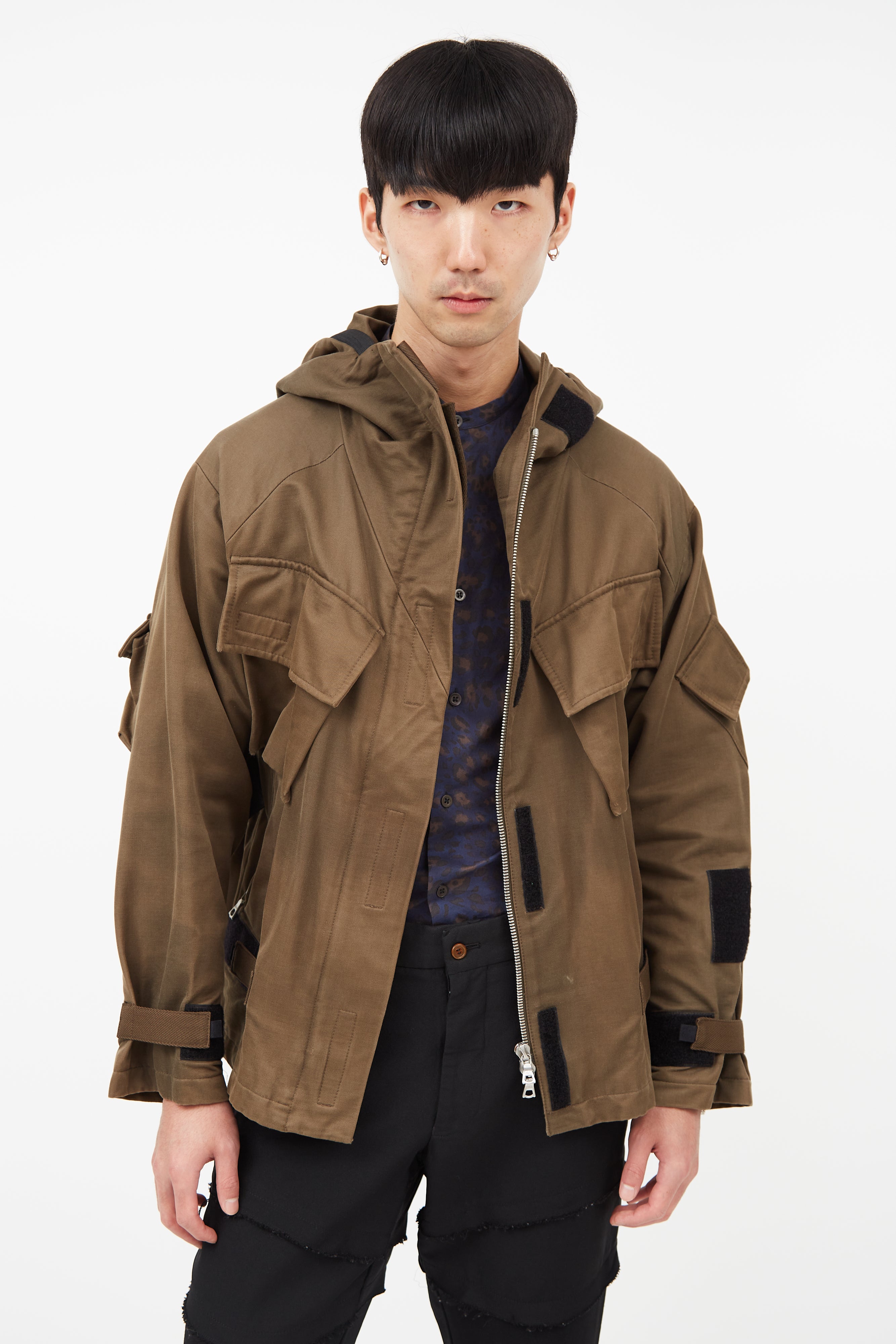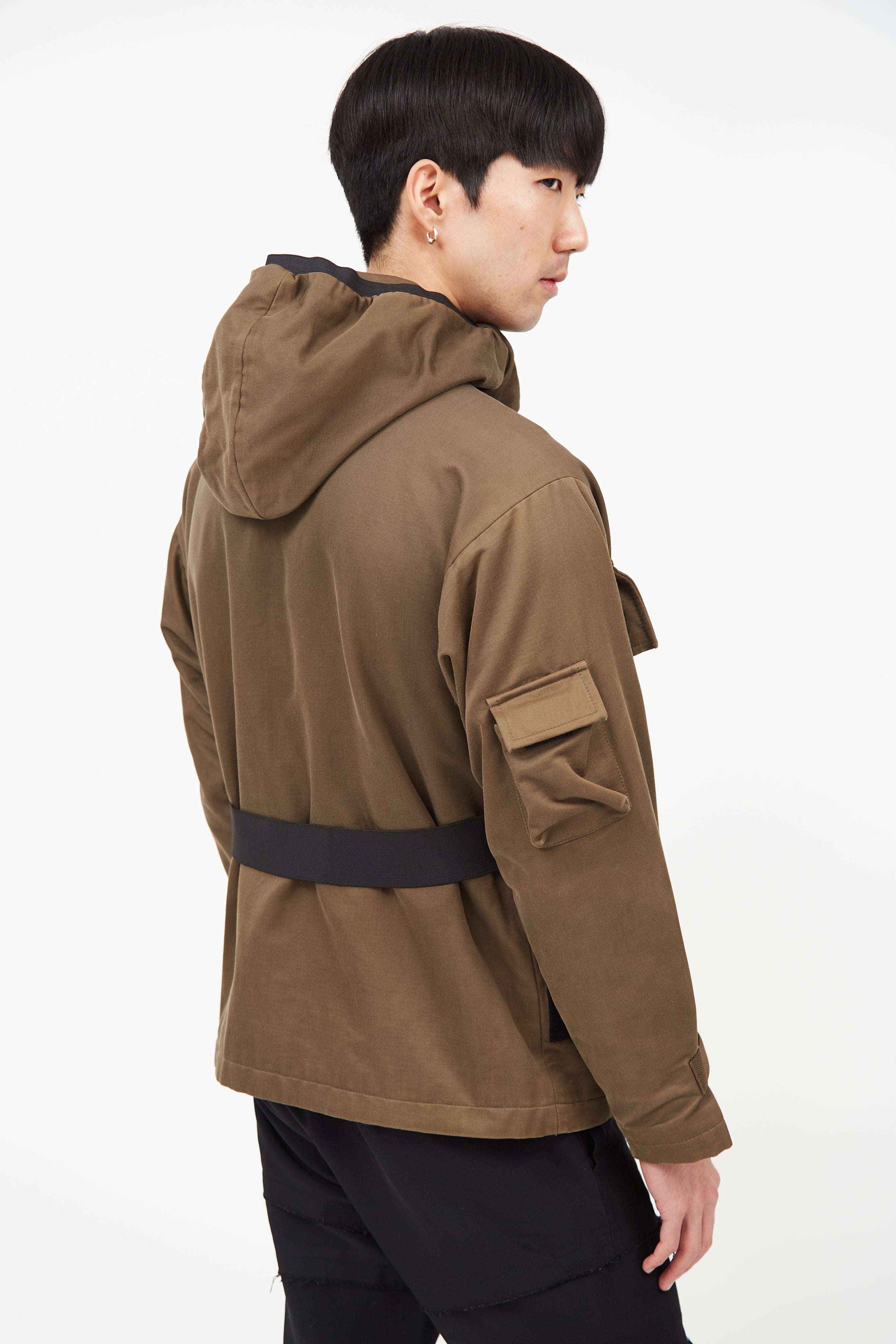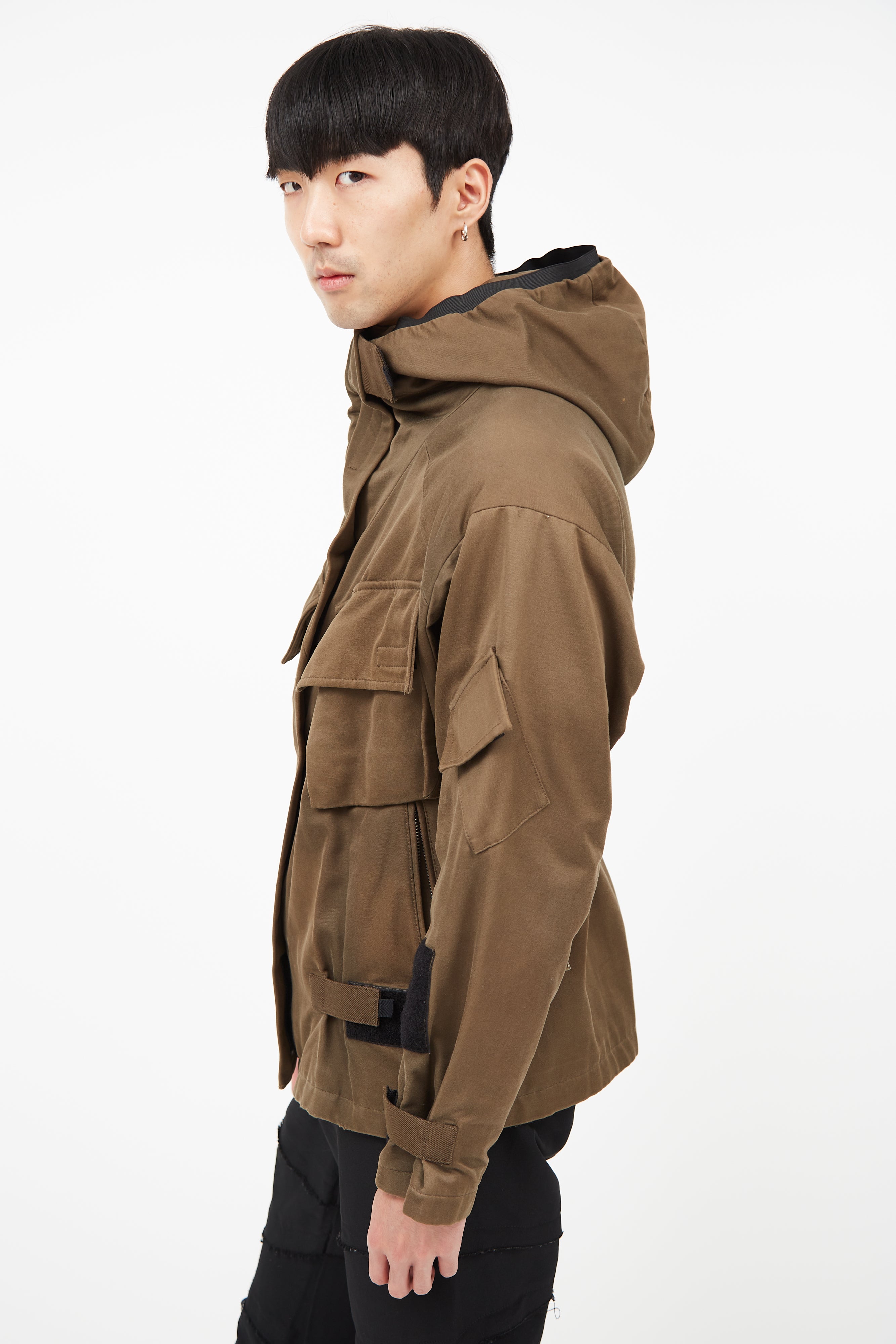 Pre-owned Dries Van Noten olive jacket featuring an attached hood, two flap pockets at hip, one flap pocket at arm, long sleeves with velcro cuffs, two zip pockets at hip, adjustable belt at waist, and zip front closure. Lined.