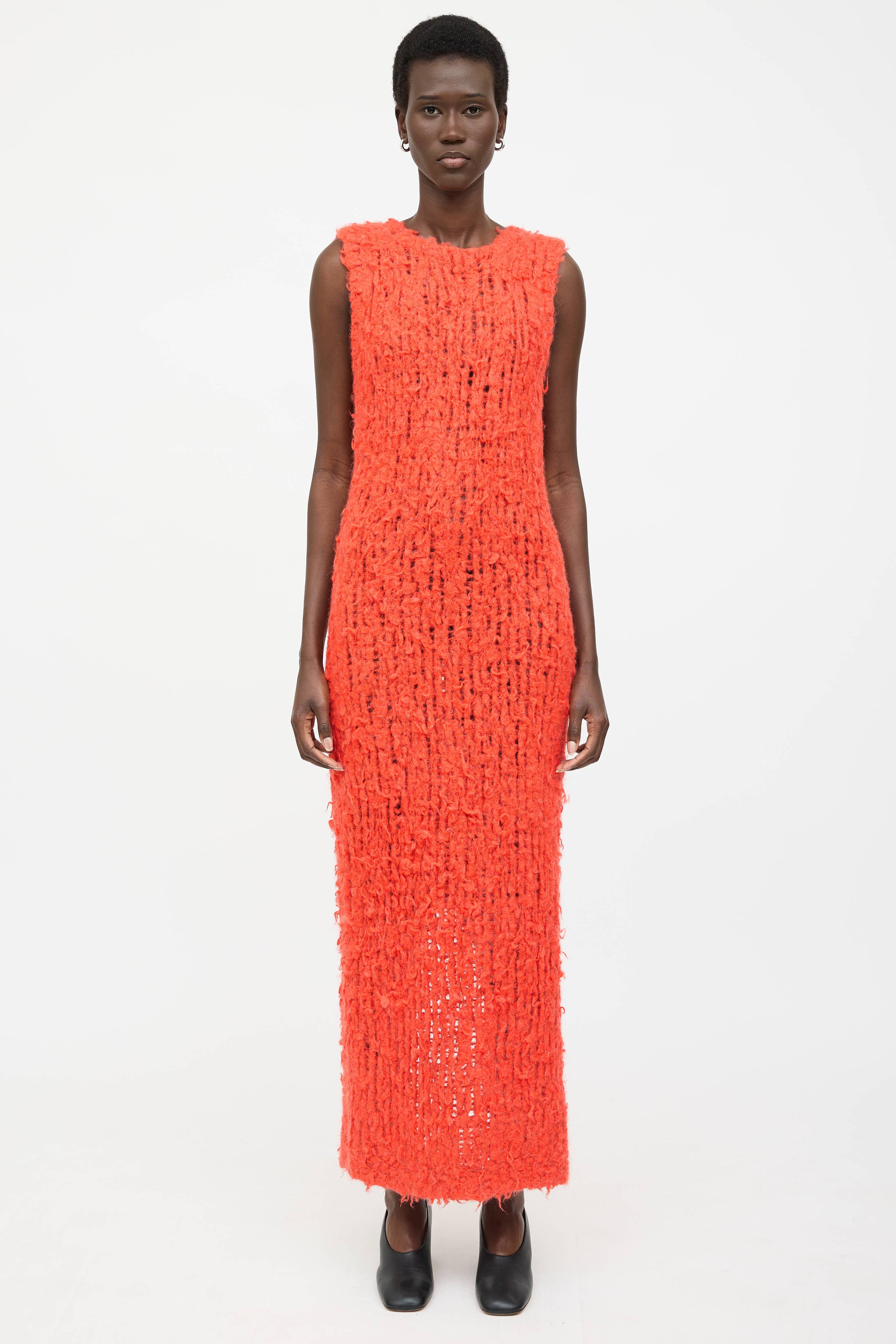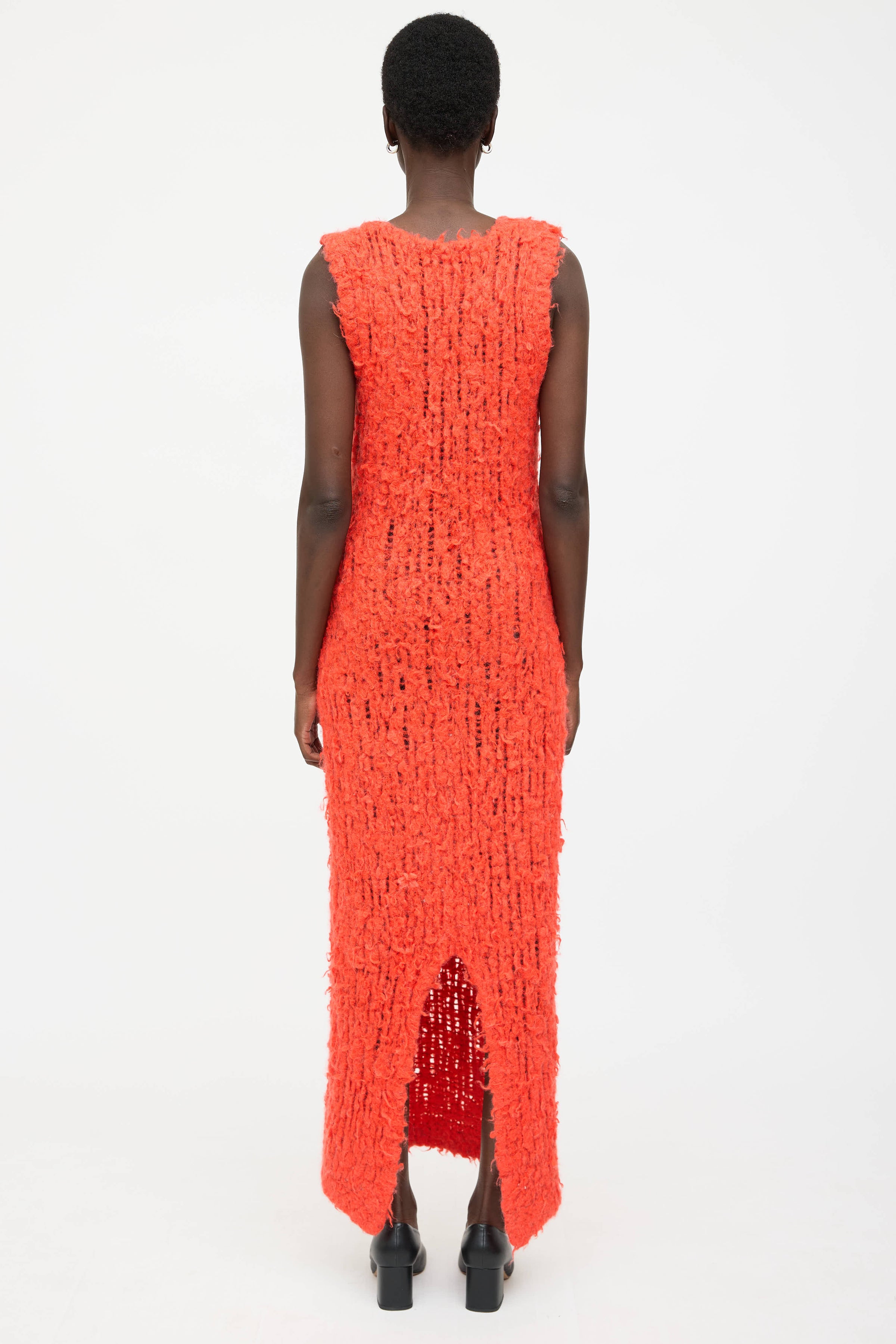 Pre-owned Zankov orange wool knit dress featuring a round neckline, thick weave, sleeveless styling, and slit at hem.