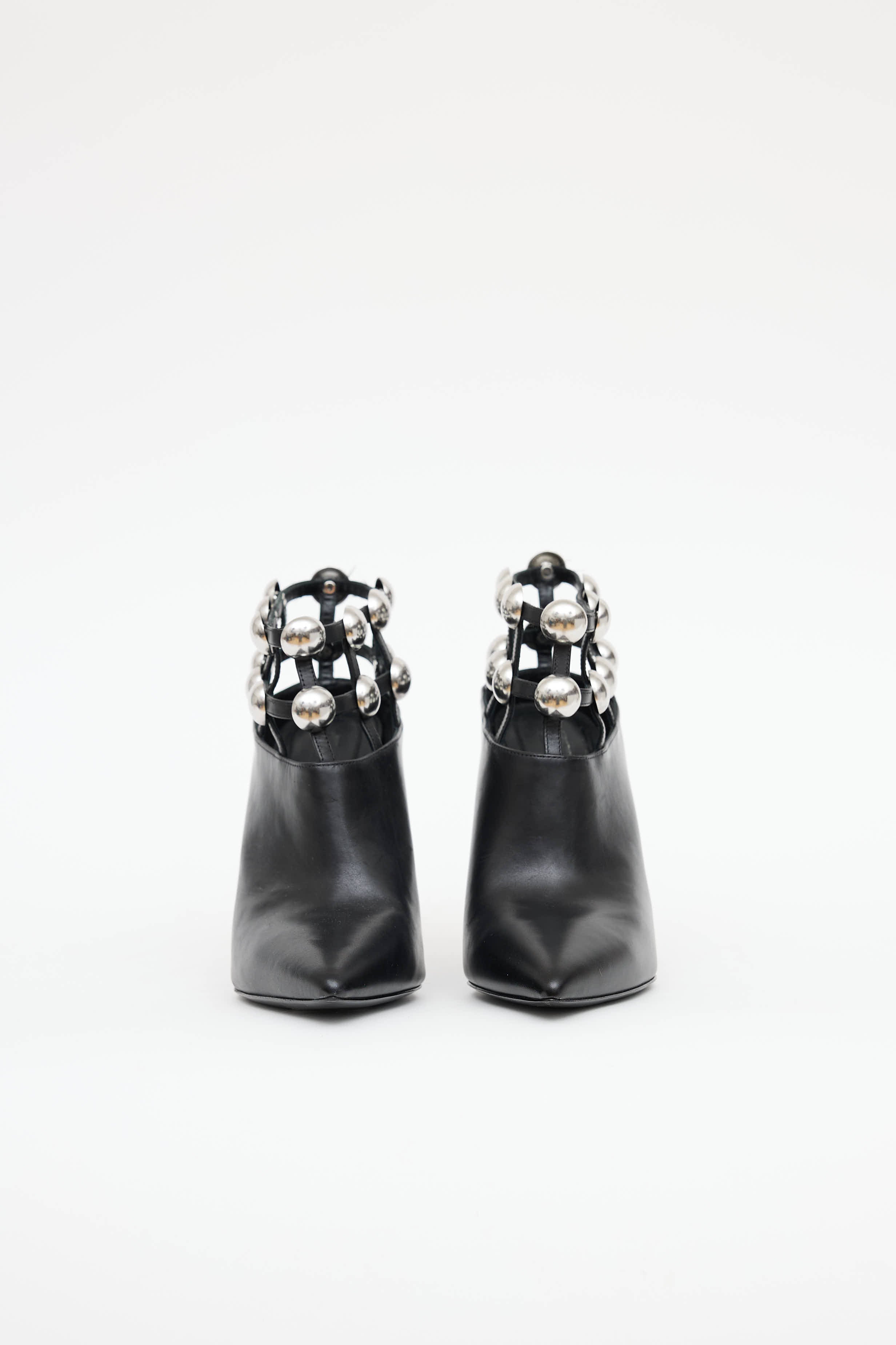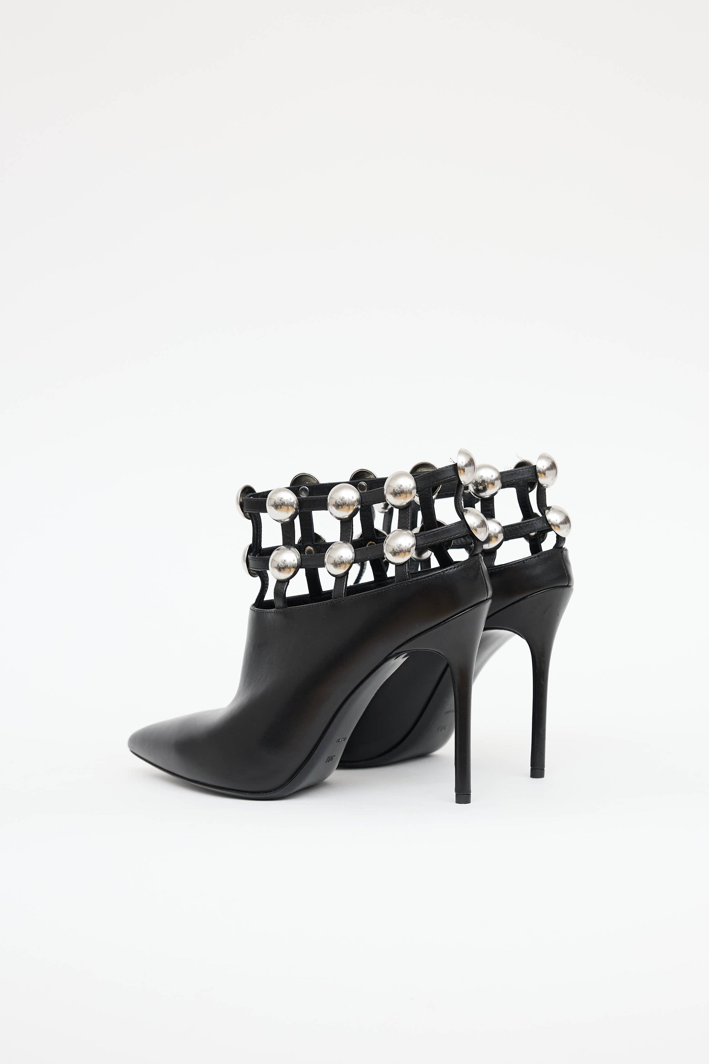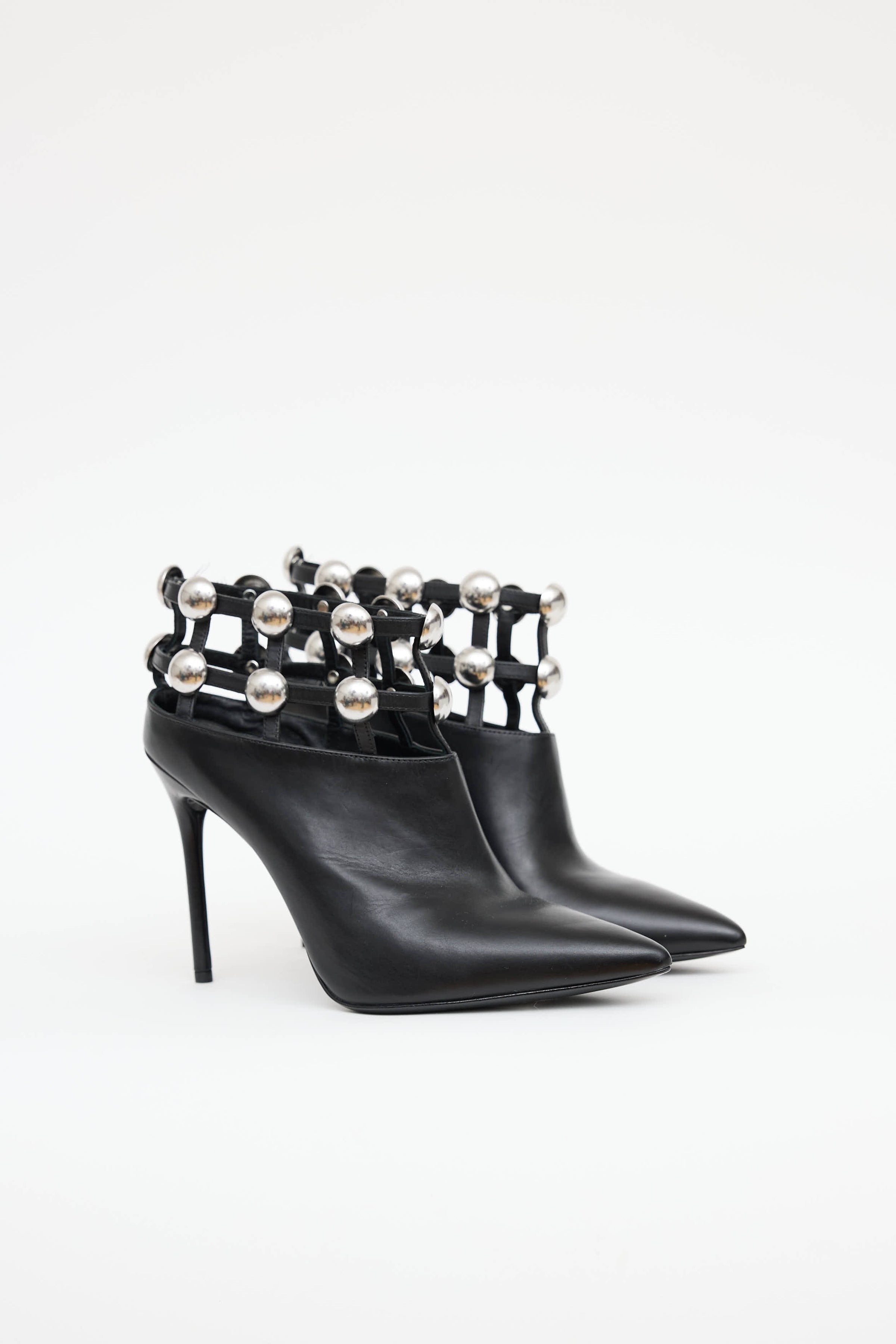 Pre-owned Alexander Wang black leather bootie featuring pointed toe, cutouts and silver tone studs at ankle, and covered heel.