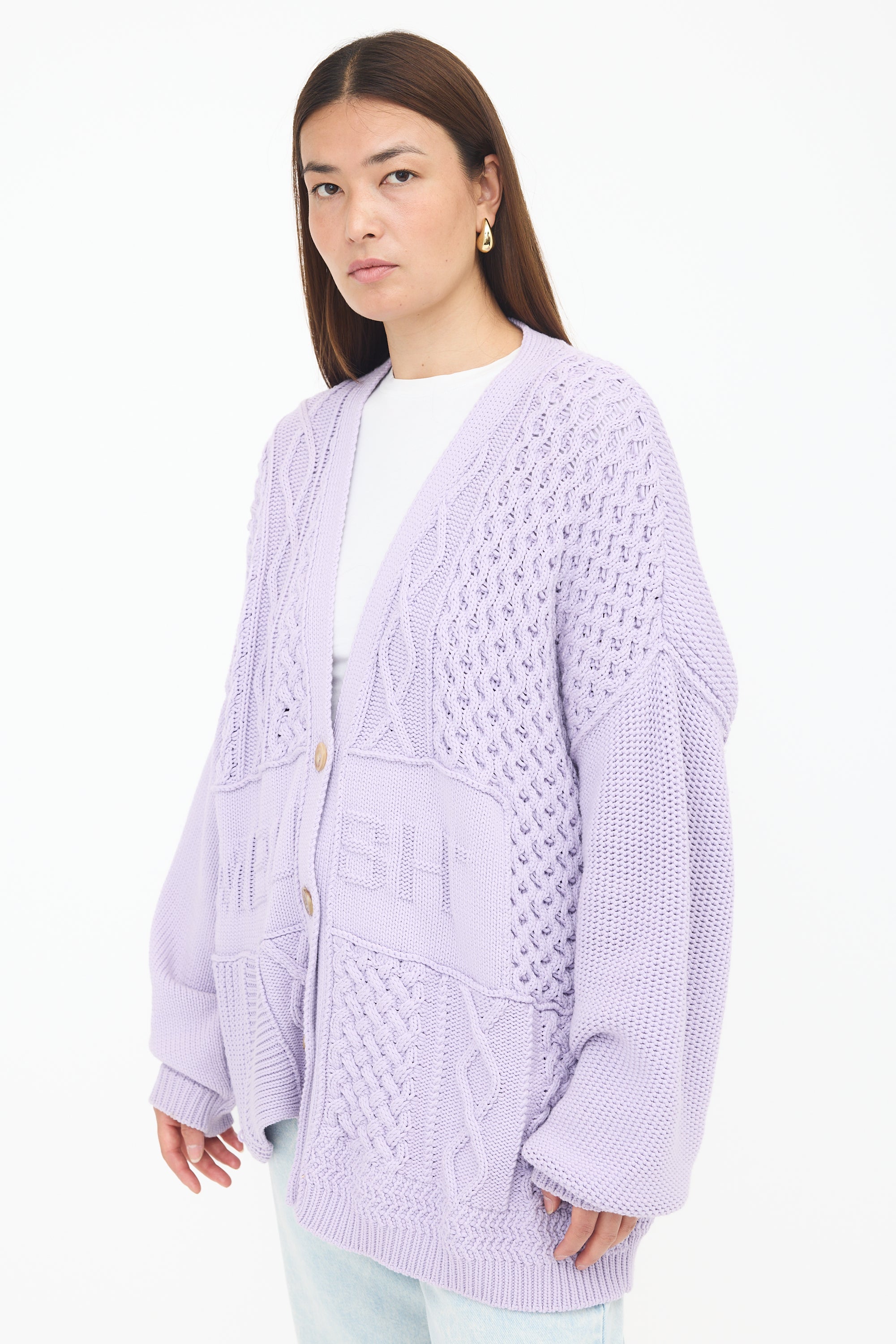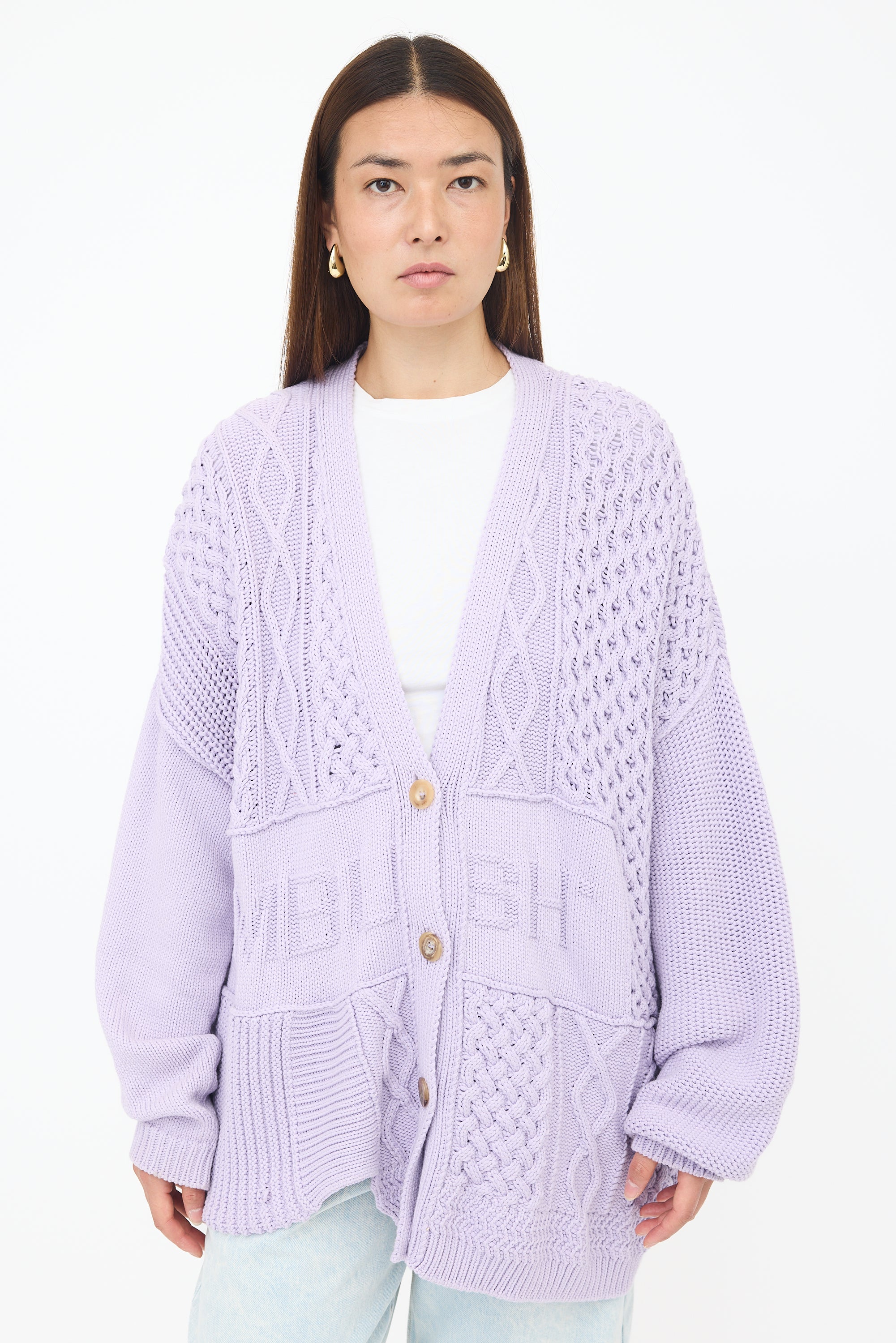 Pre-owned Ambush purple knit cardigan featuring a V-neckline, button front, mixed cable knit patchwork, knit logo jacquard at front, ribbed cuffs, and asymmetric hem.