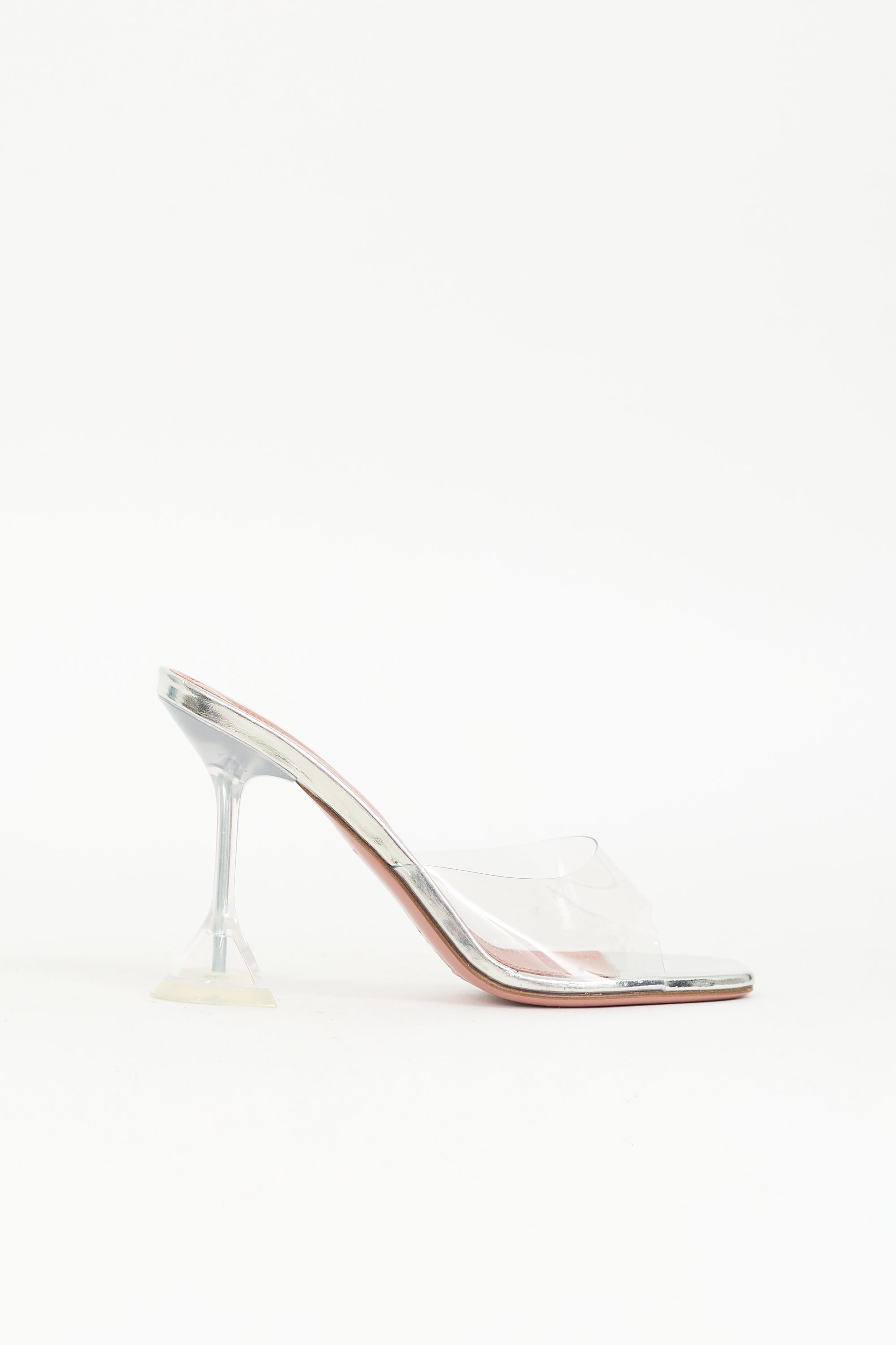 Pre-owned Amina Muaddi silver tone metallic leather and transparent PVC Lupita mules featuring square toe, transparent spool heel, and leather insole and outsole.