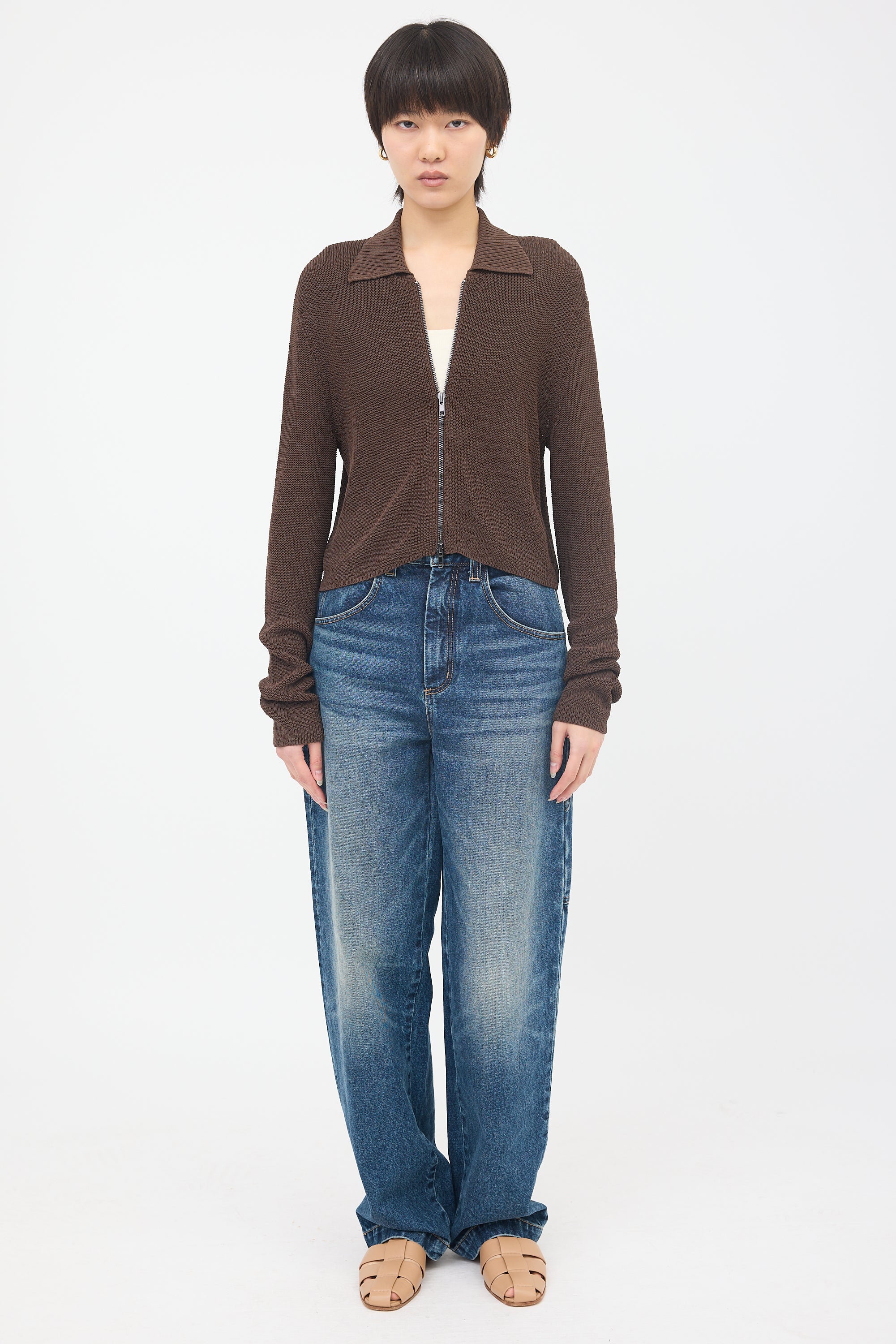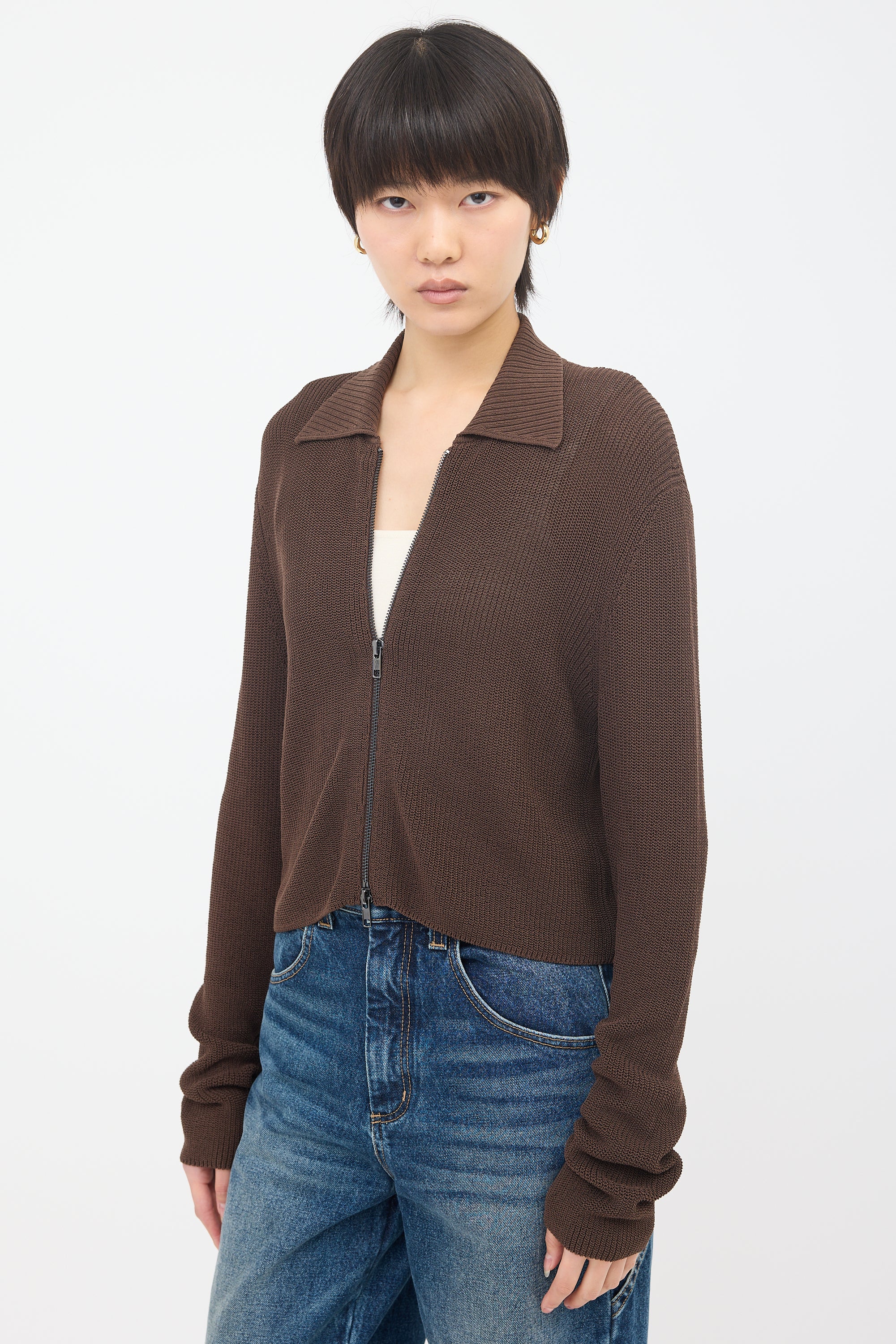 Pre-owned Aya Muse brown rib knit Musa cardigan featuring a Johnny collar, two-way front zip, and elongated sleeves.