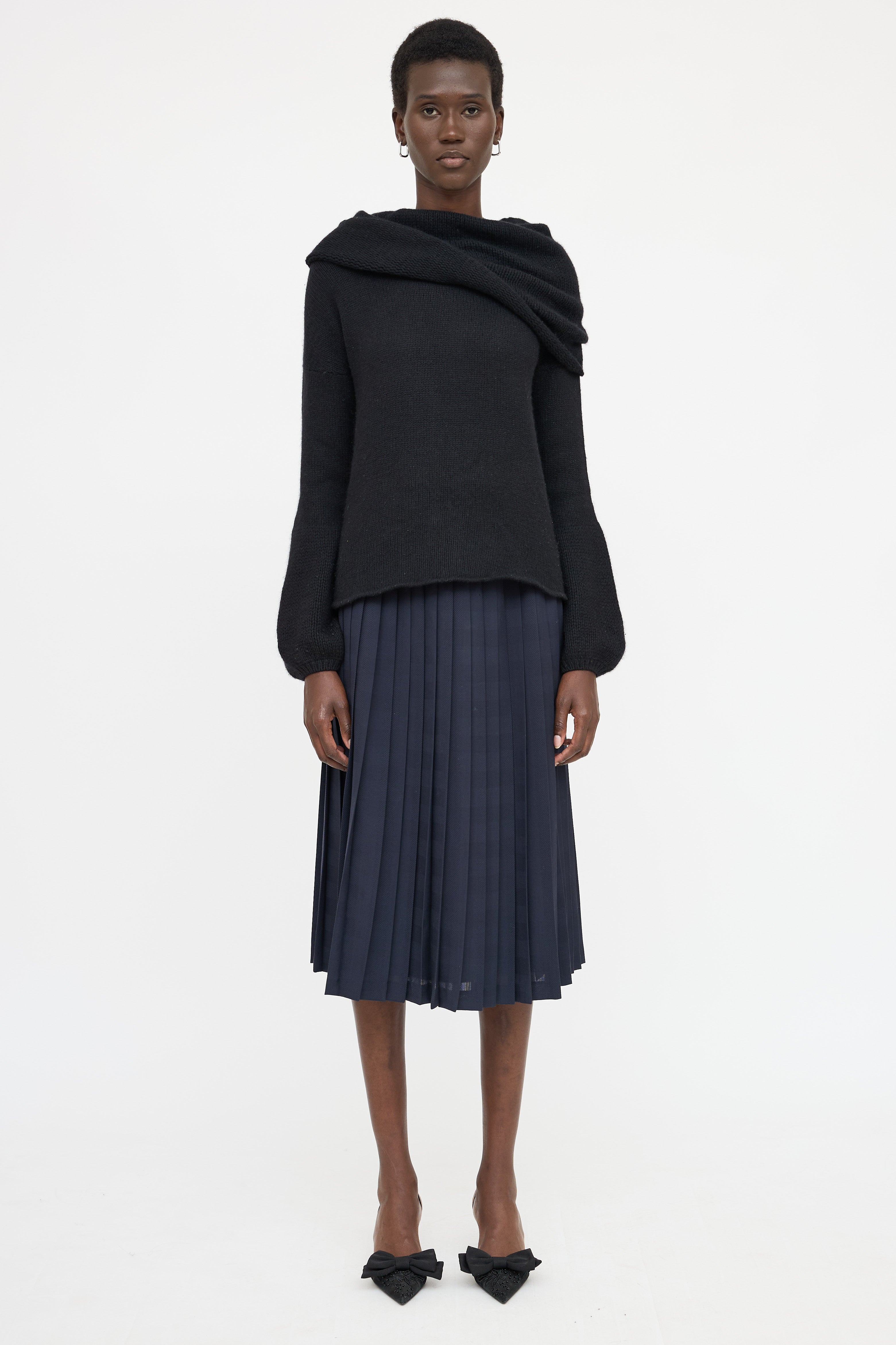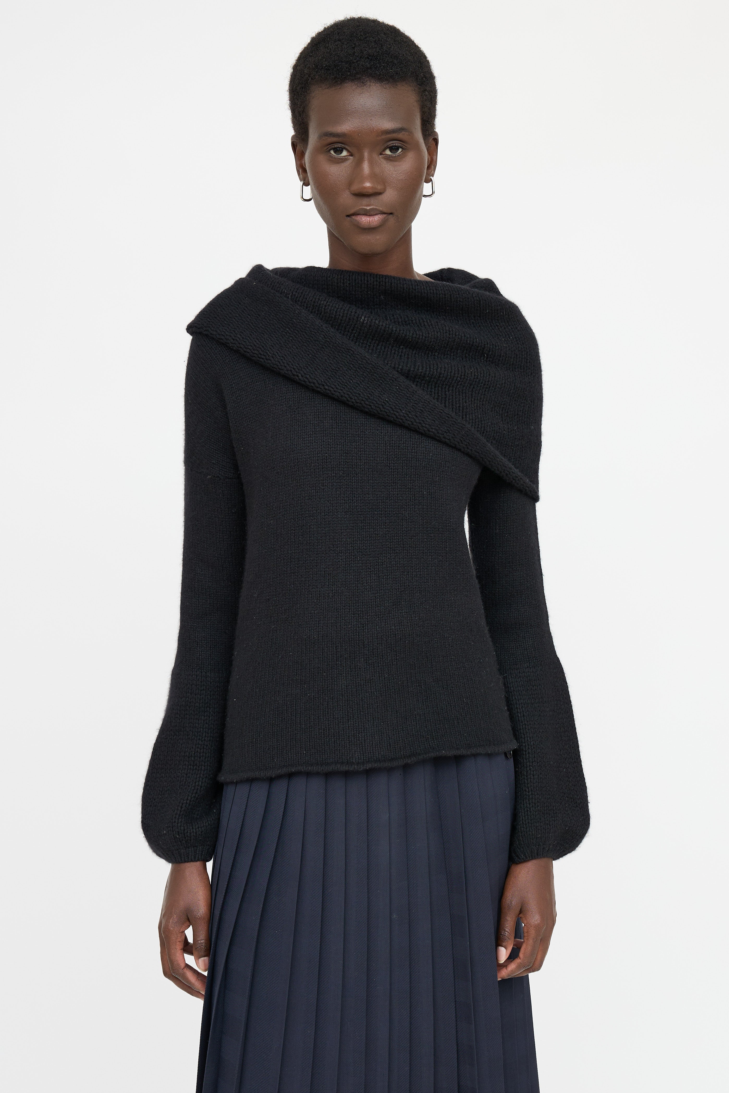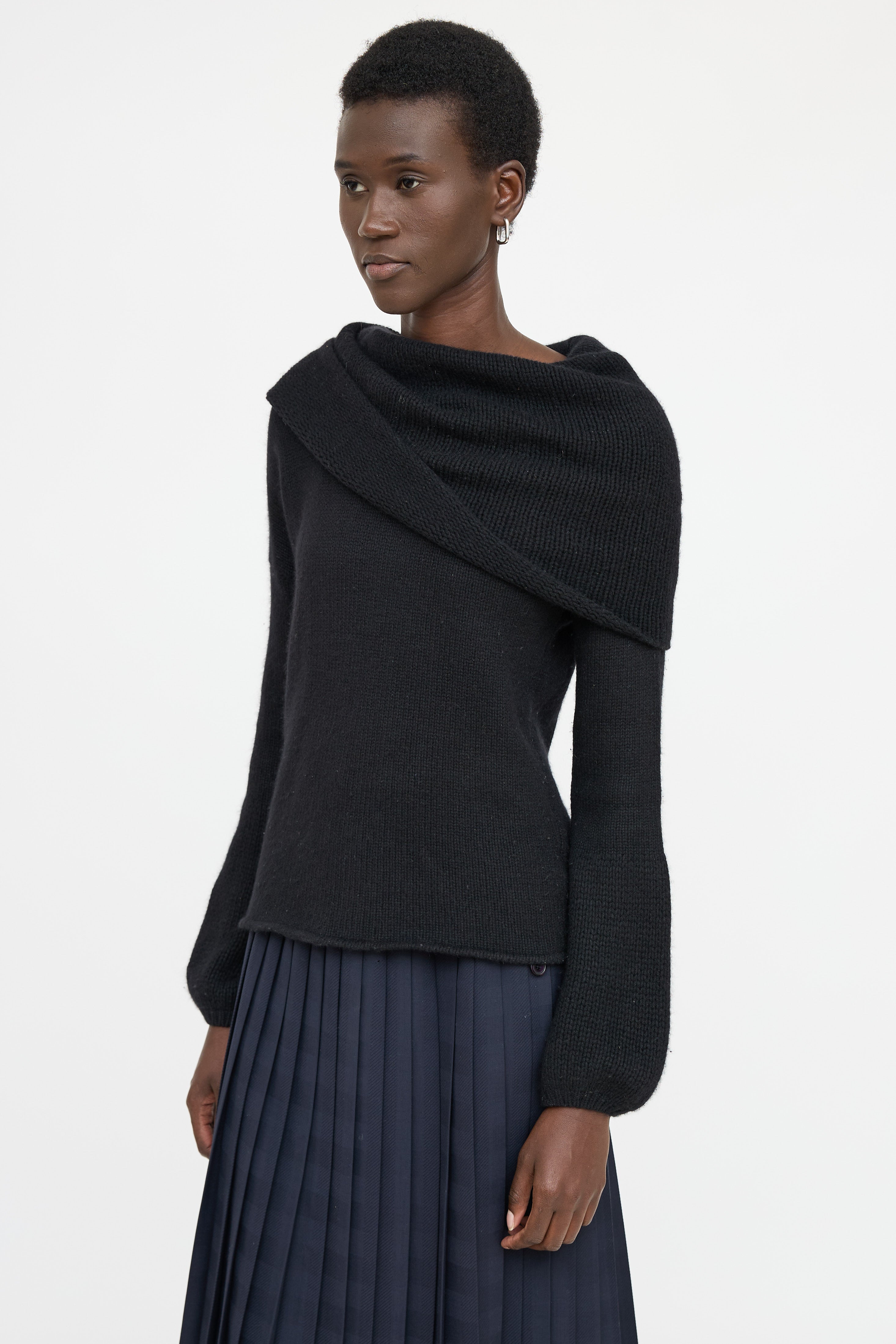 Pre-owned Blumarine black long sleeve sweater featuring off shoulder styling, fold over neckline, ribbed knit, and balloon sleeves.
