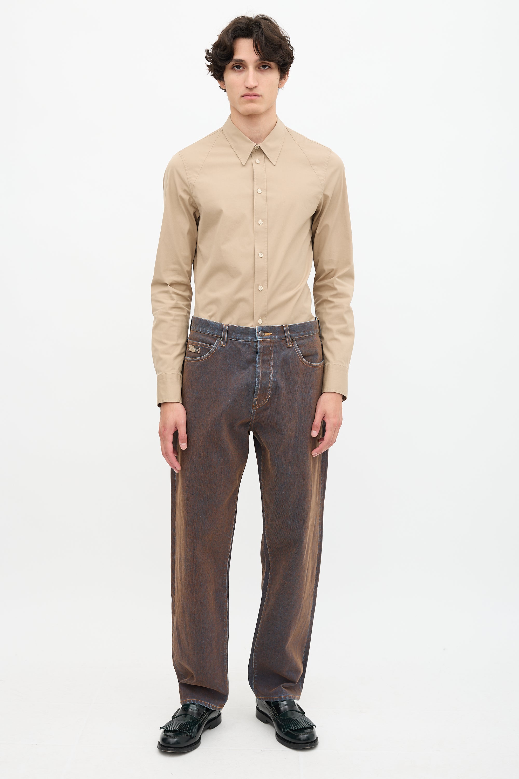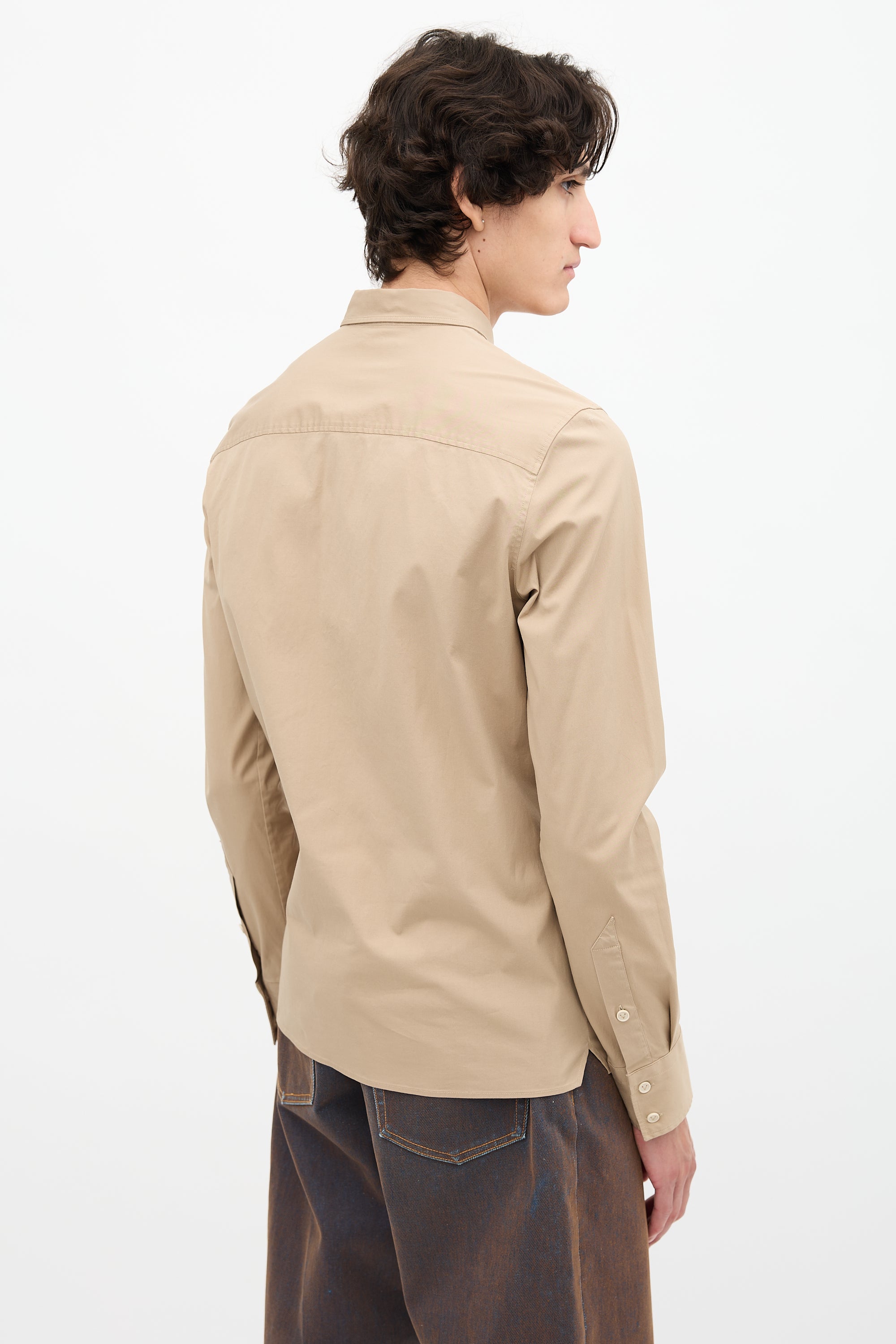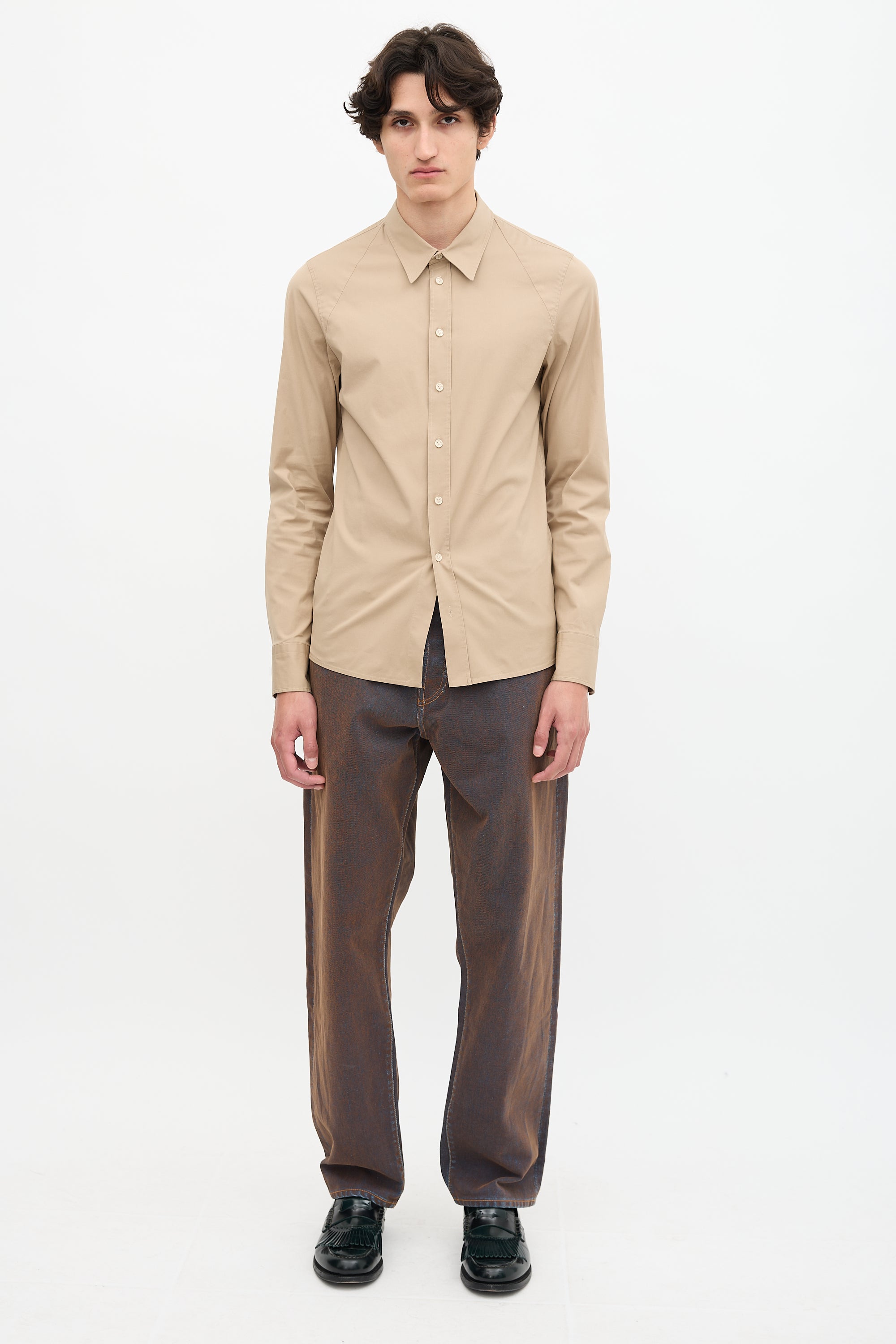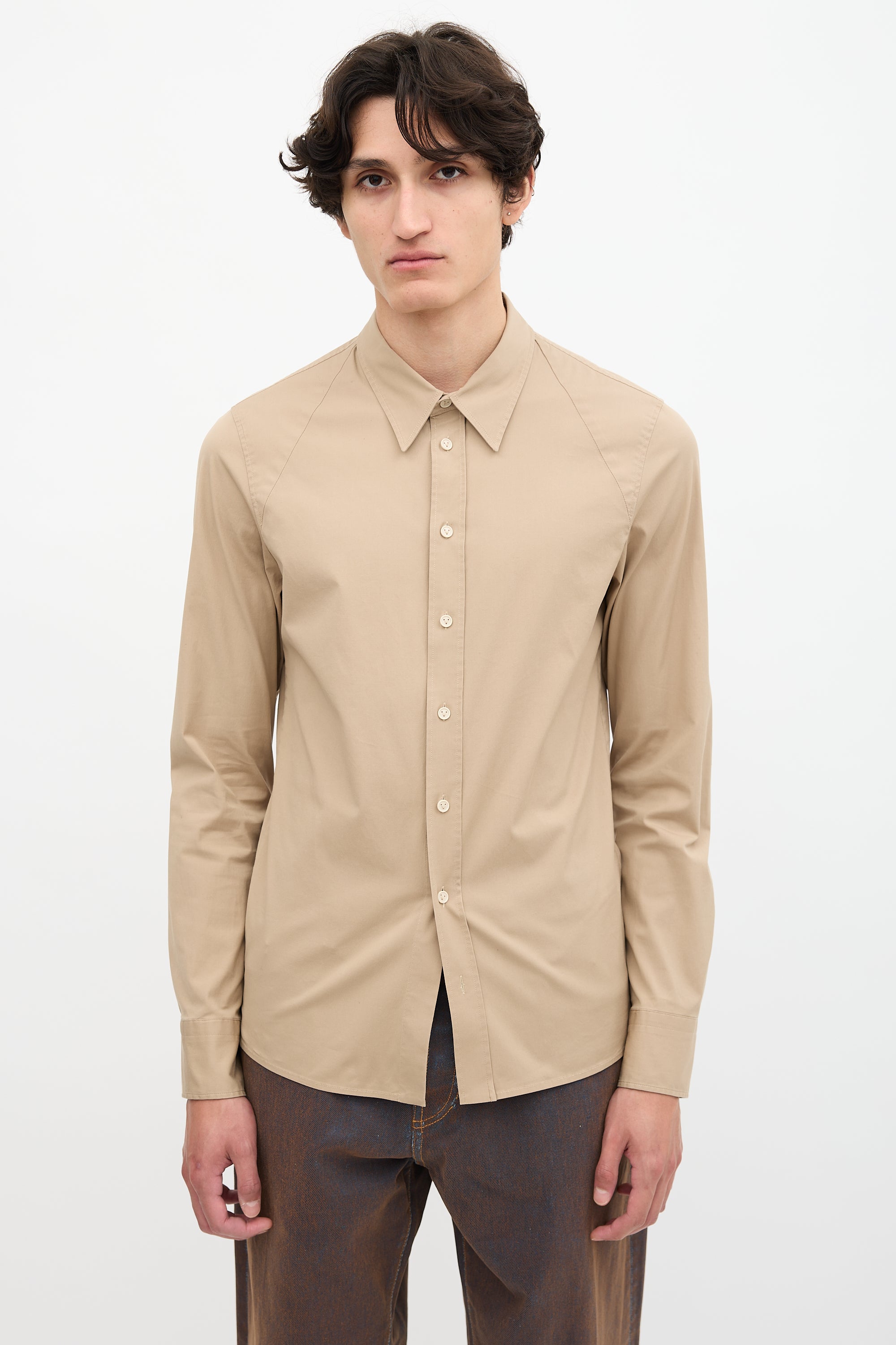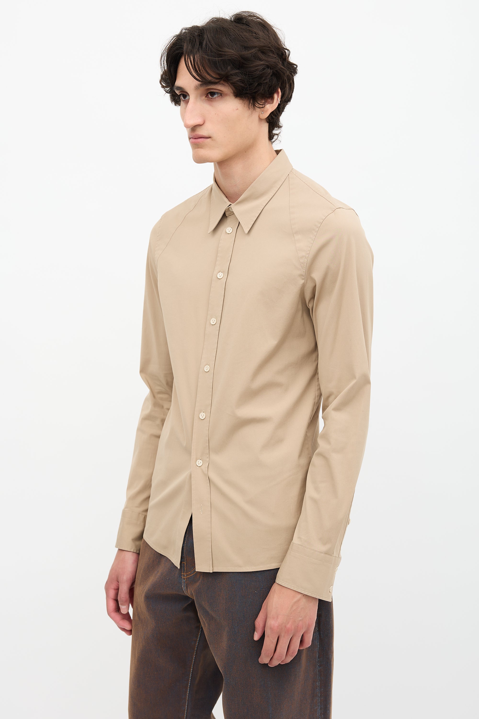 Pre-owned Bottega Veneta beige shirt featuring point collar, button up front, side slits, and buttoned cuffs.