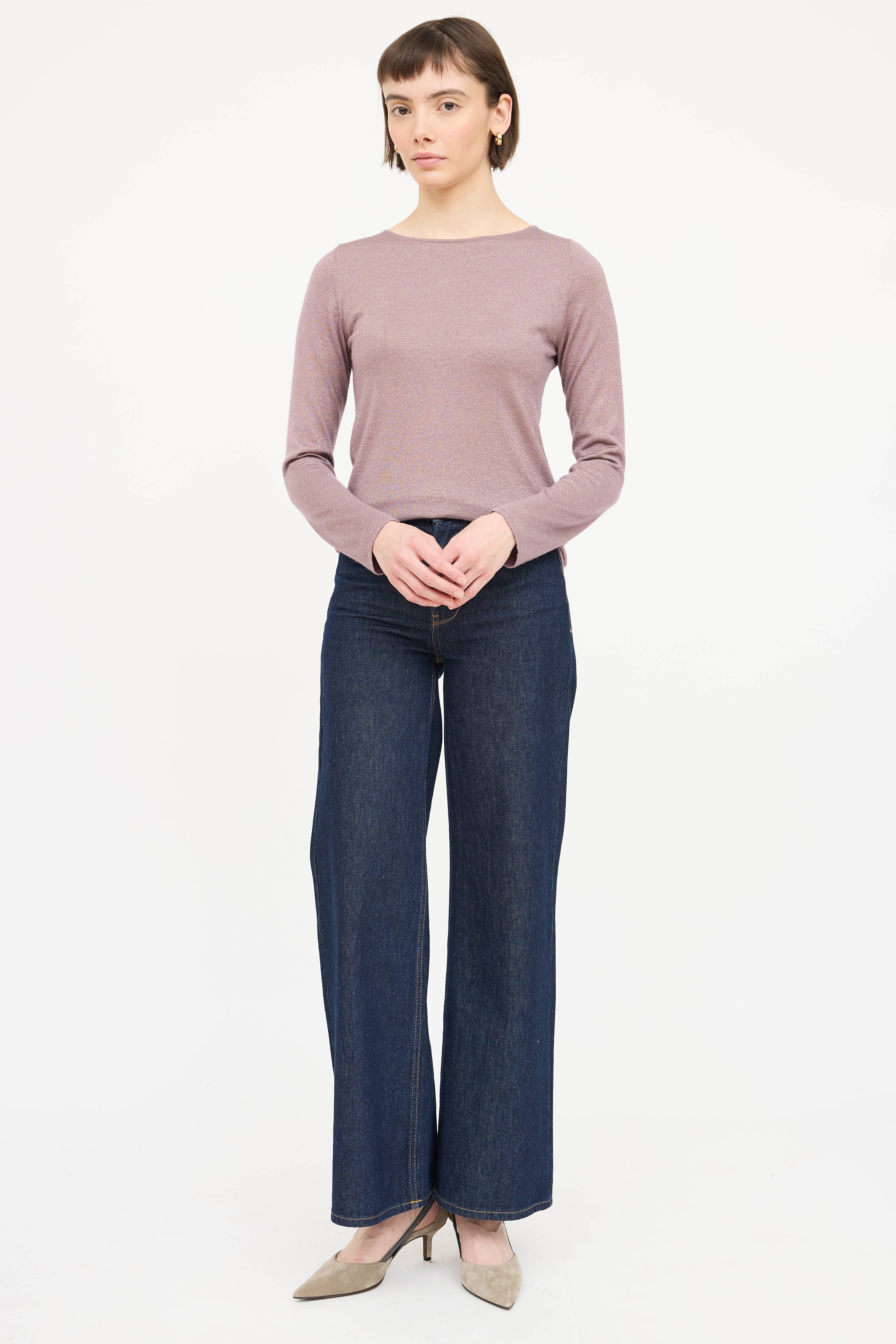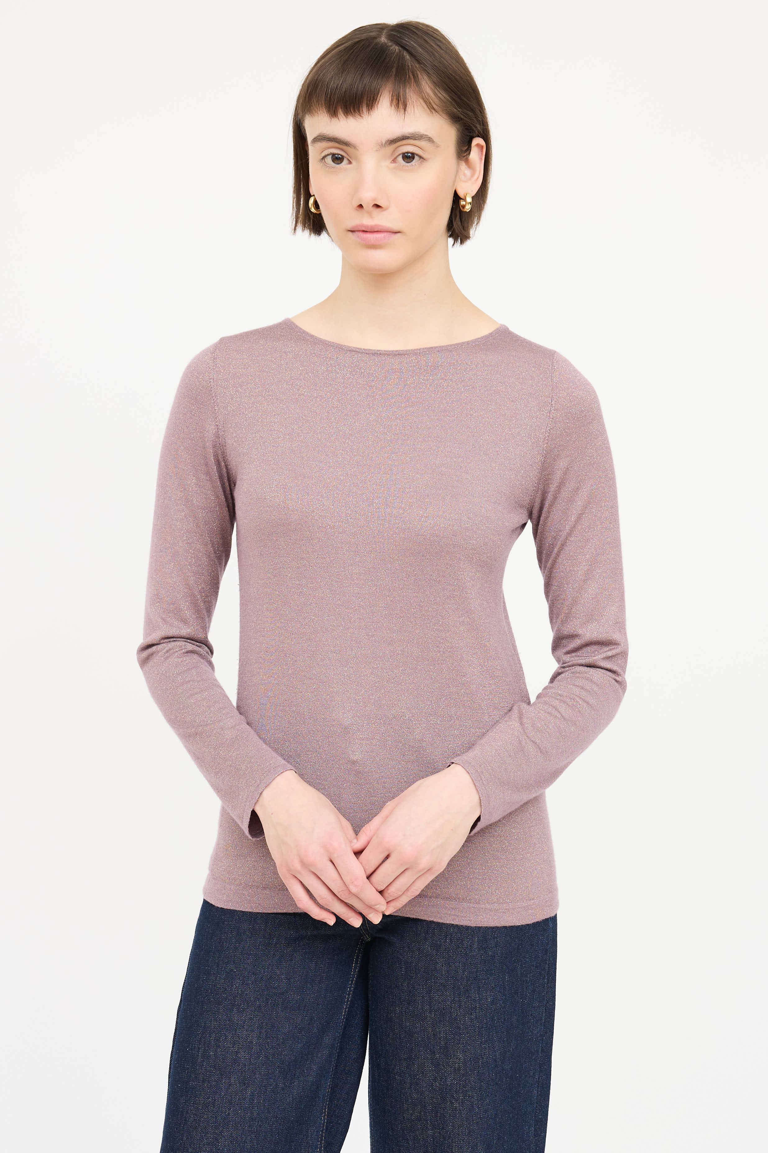 Pre-owned Brunello Cucinelli purple long sleeve top featuring round neckline and gold metallic thread throughout.