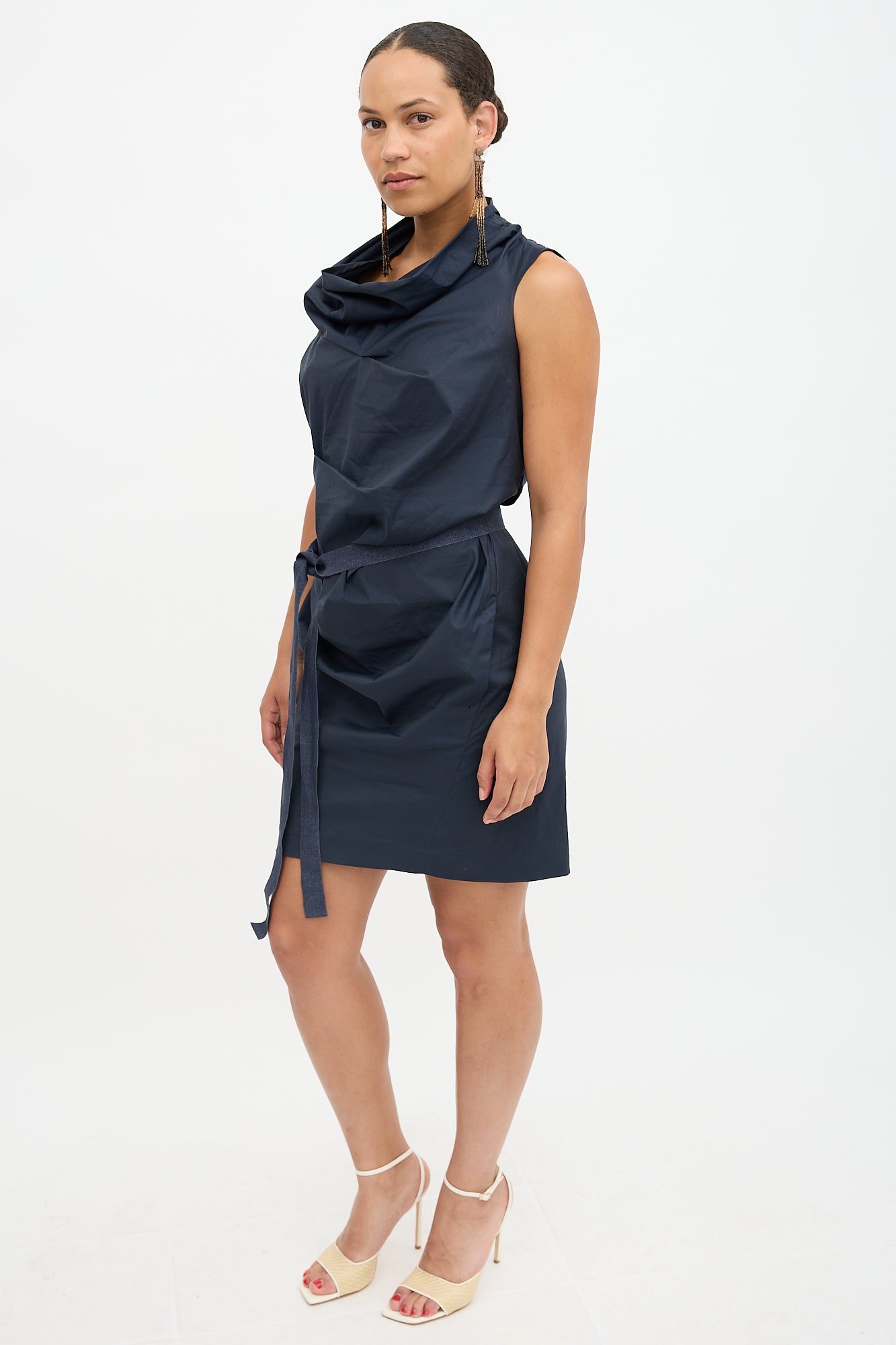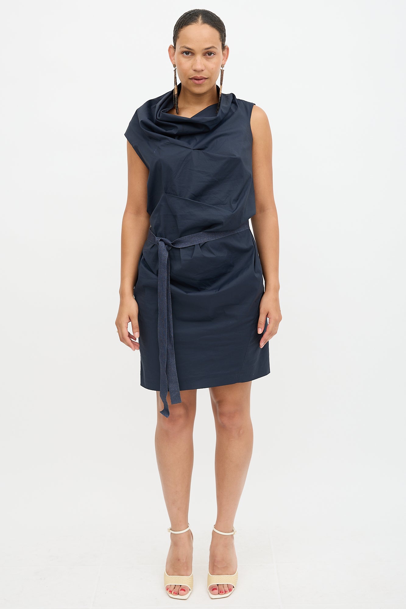 Pre-owned Brunello Cucinelli navy midi dress featuring a cowl neckline, draped front pleats, asymmetrical back collar back, canvas tie belt, and left in seam pocket. Unlined.