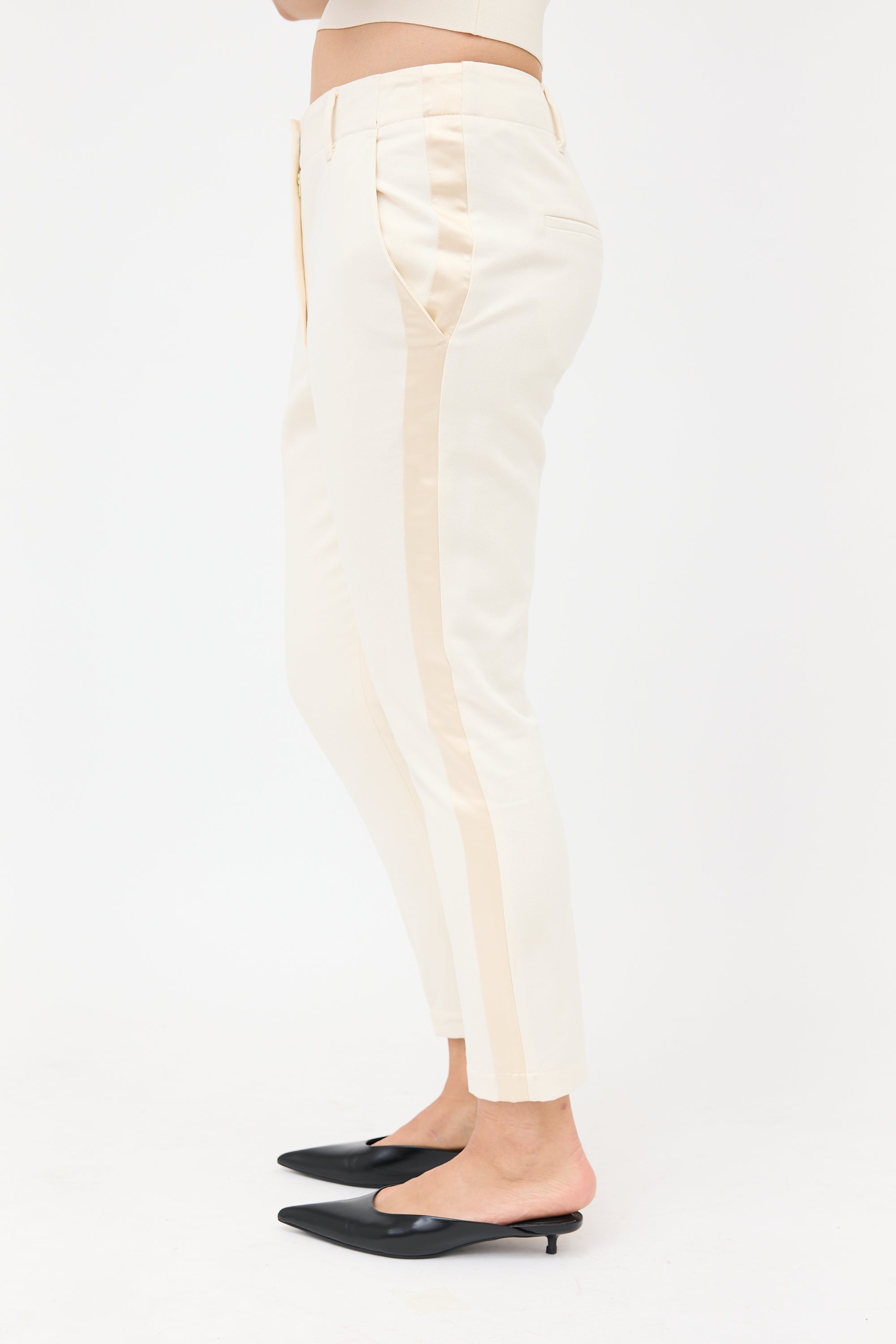 Pre-owned Brunello Cucinelli cream slim leg trousers featuring a zip fly, belt loops, four pocket styling, tonal satin stripe at outseam, and pressed seams.