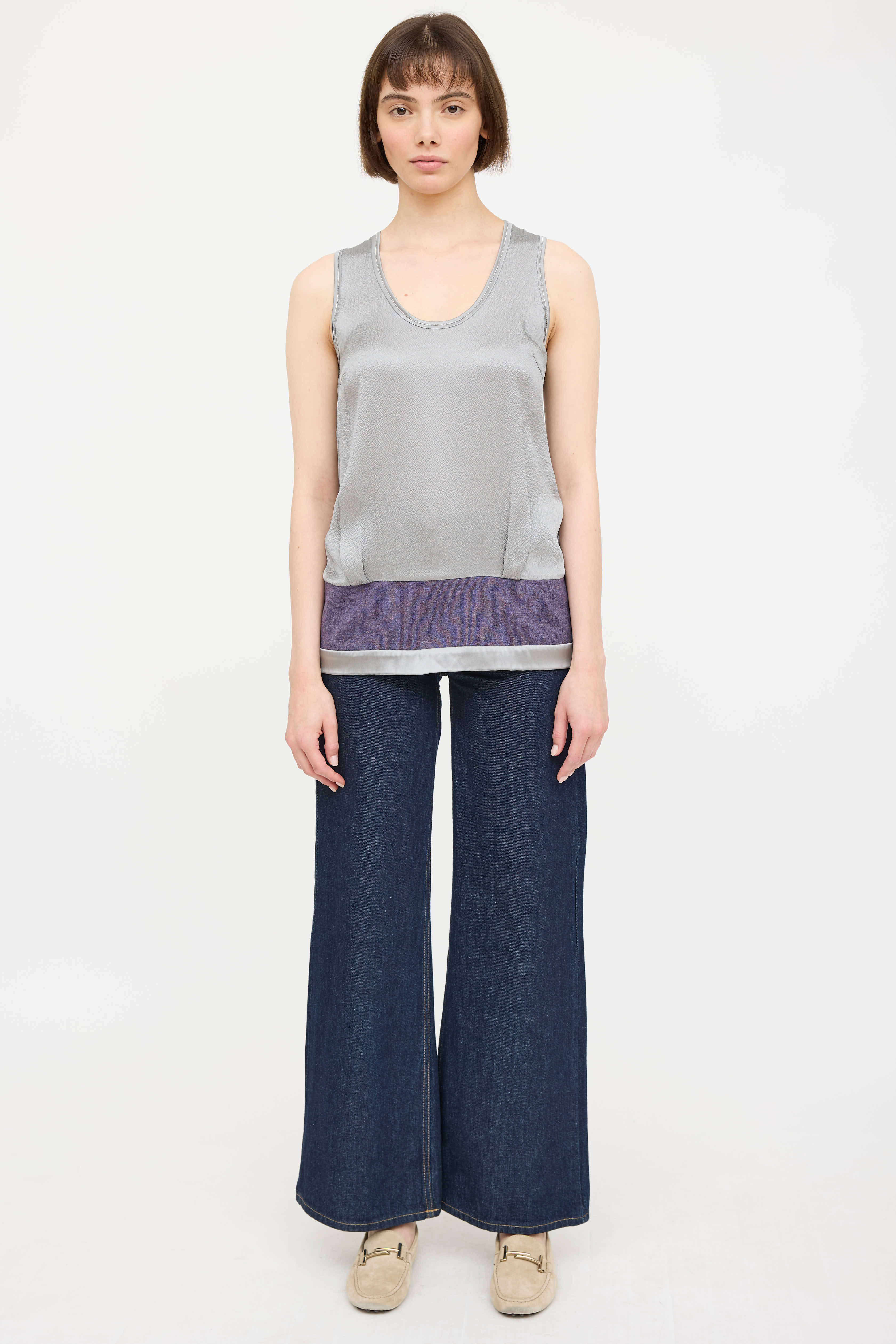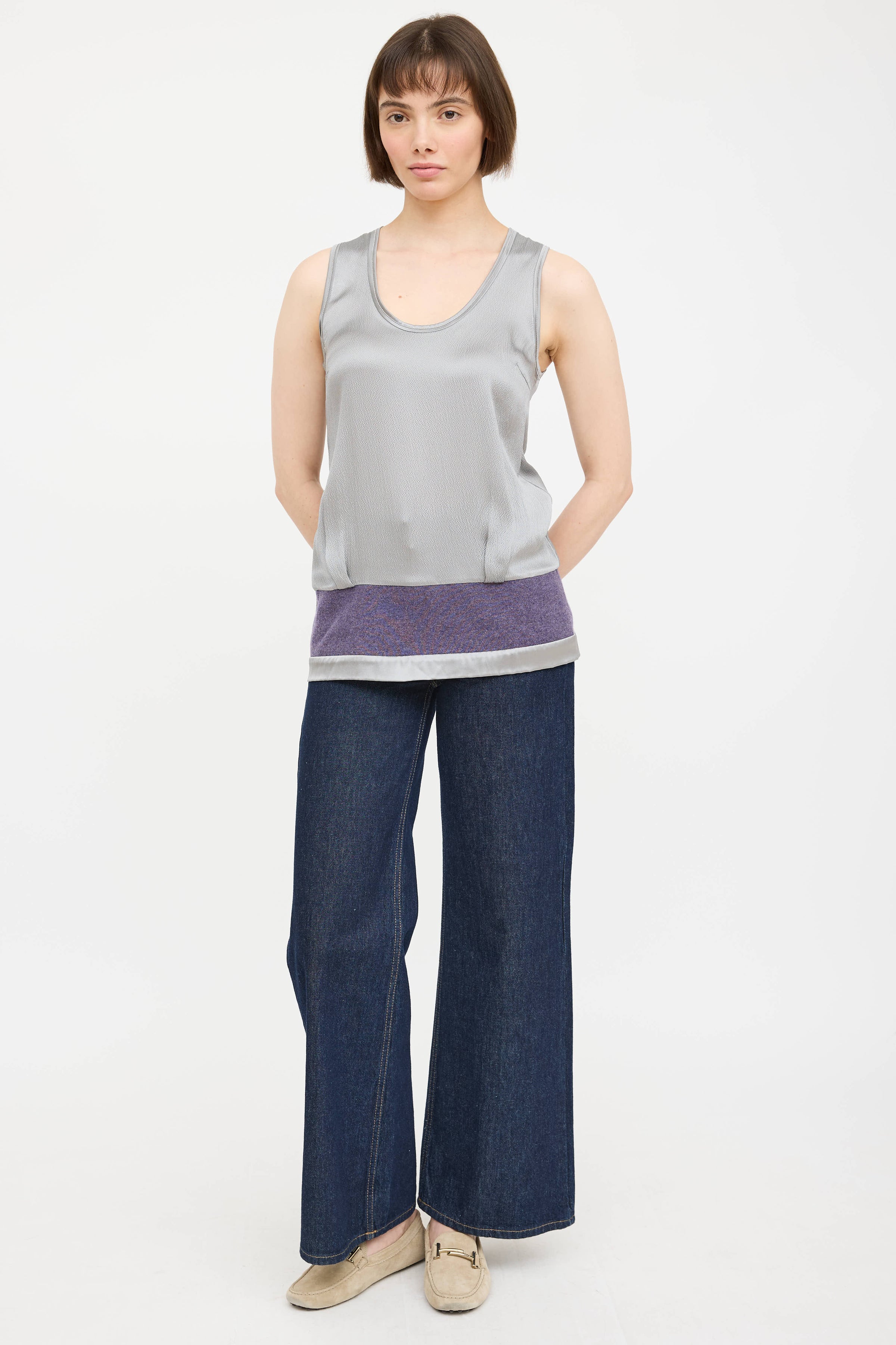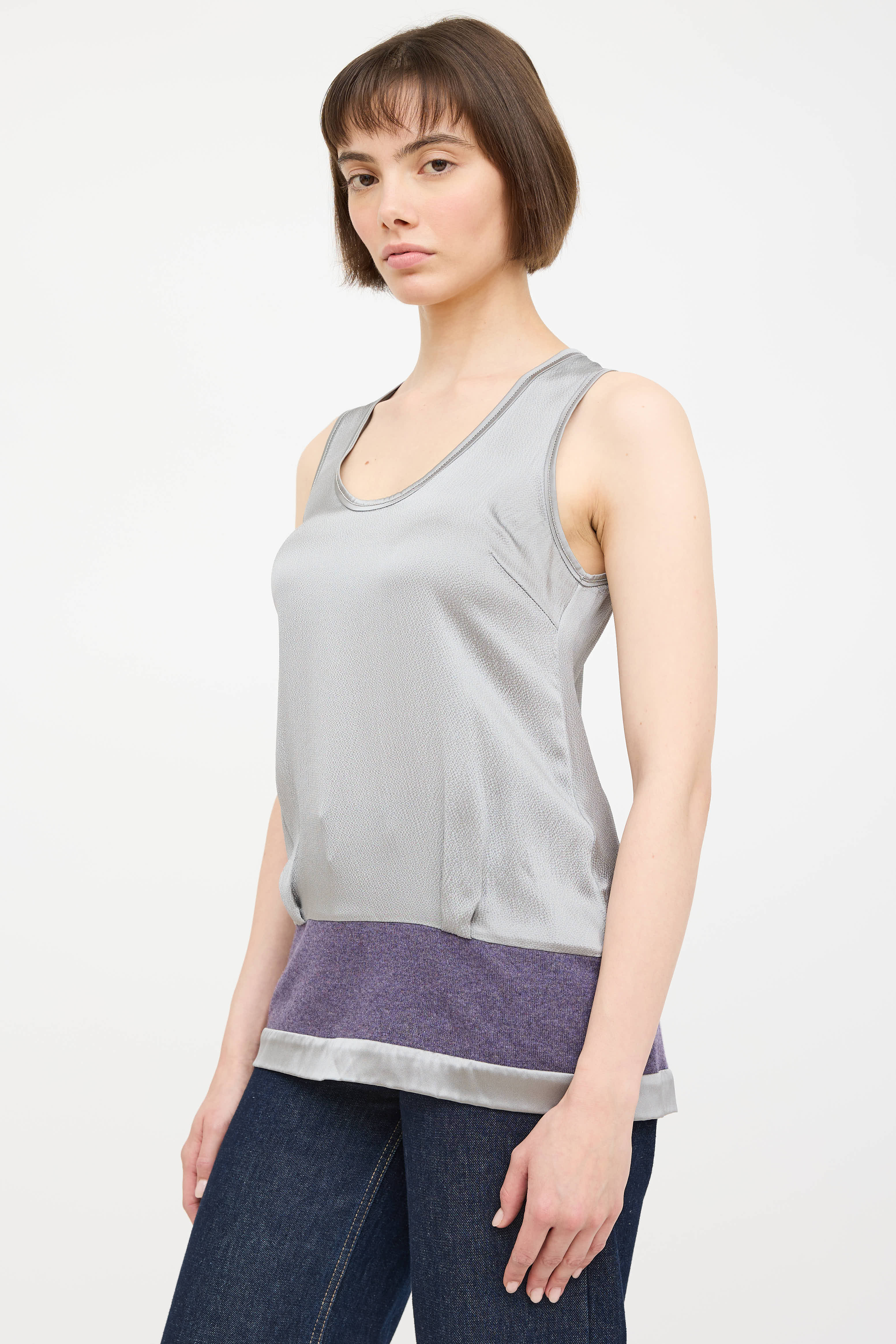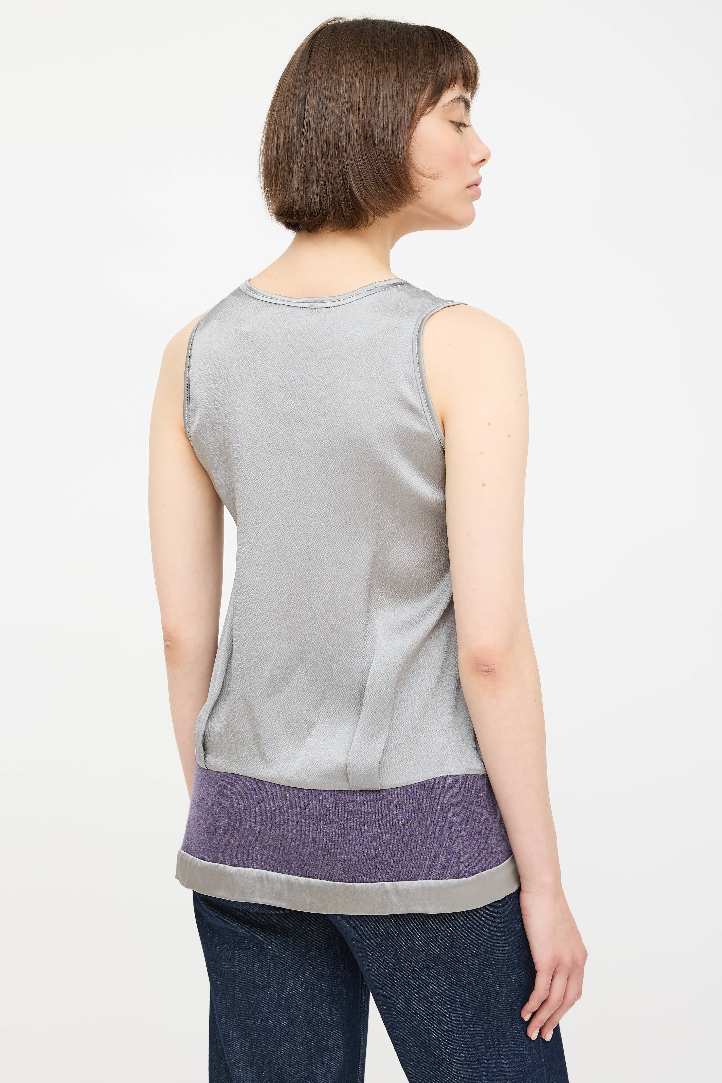 Pre-owned Brunello Cucinelli grey silk metallic tank top featuring a scoop neckline with monili bead trim, darted bust, and purple cashmere knit trim at hem.
