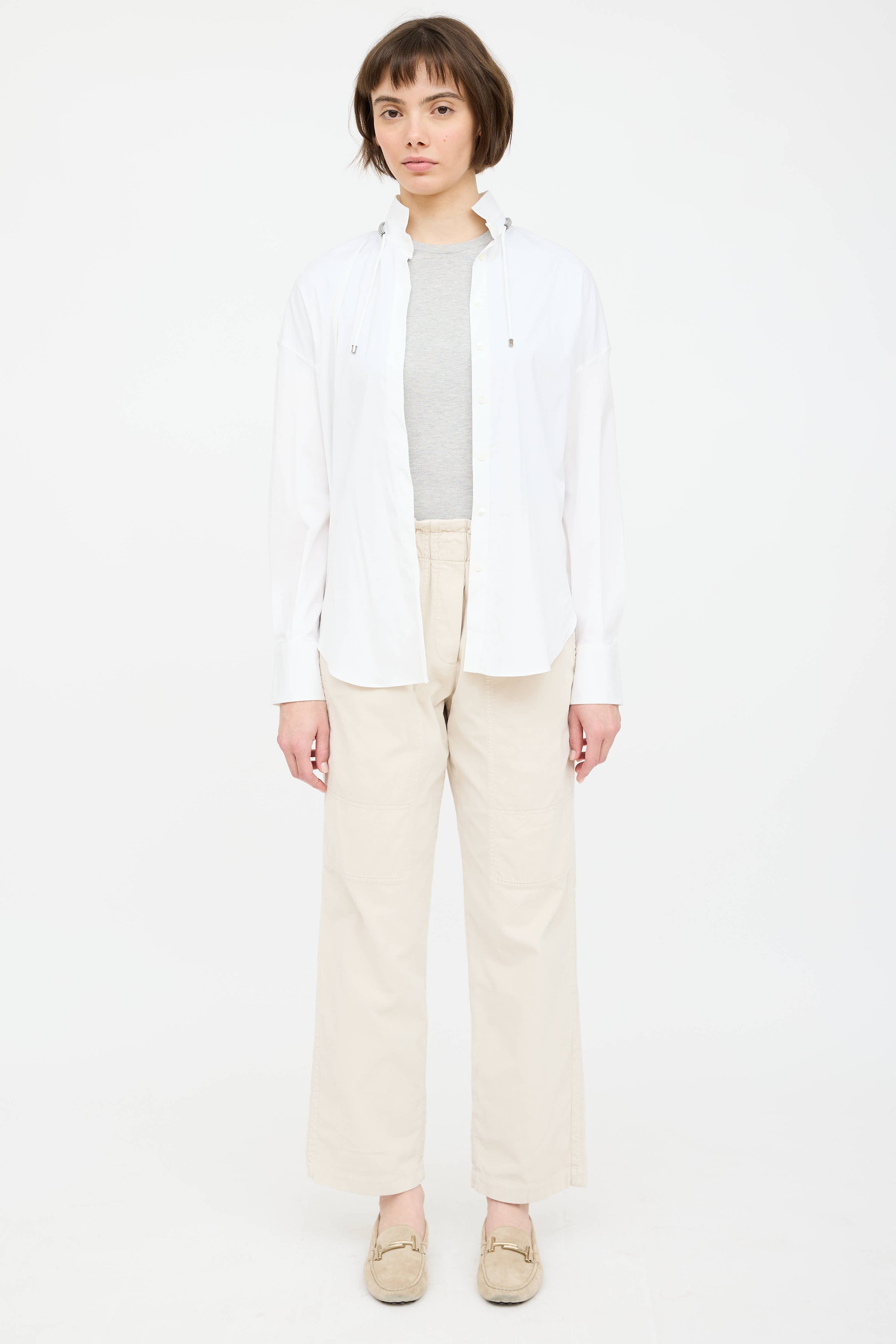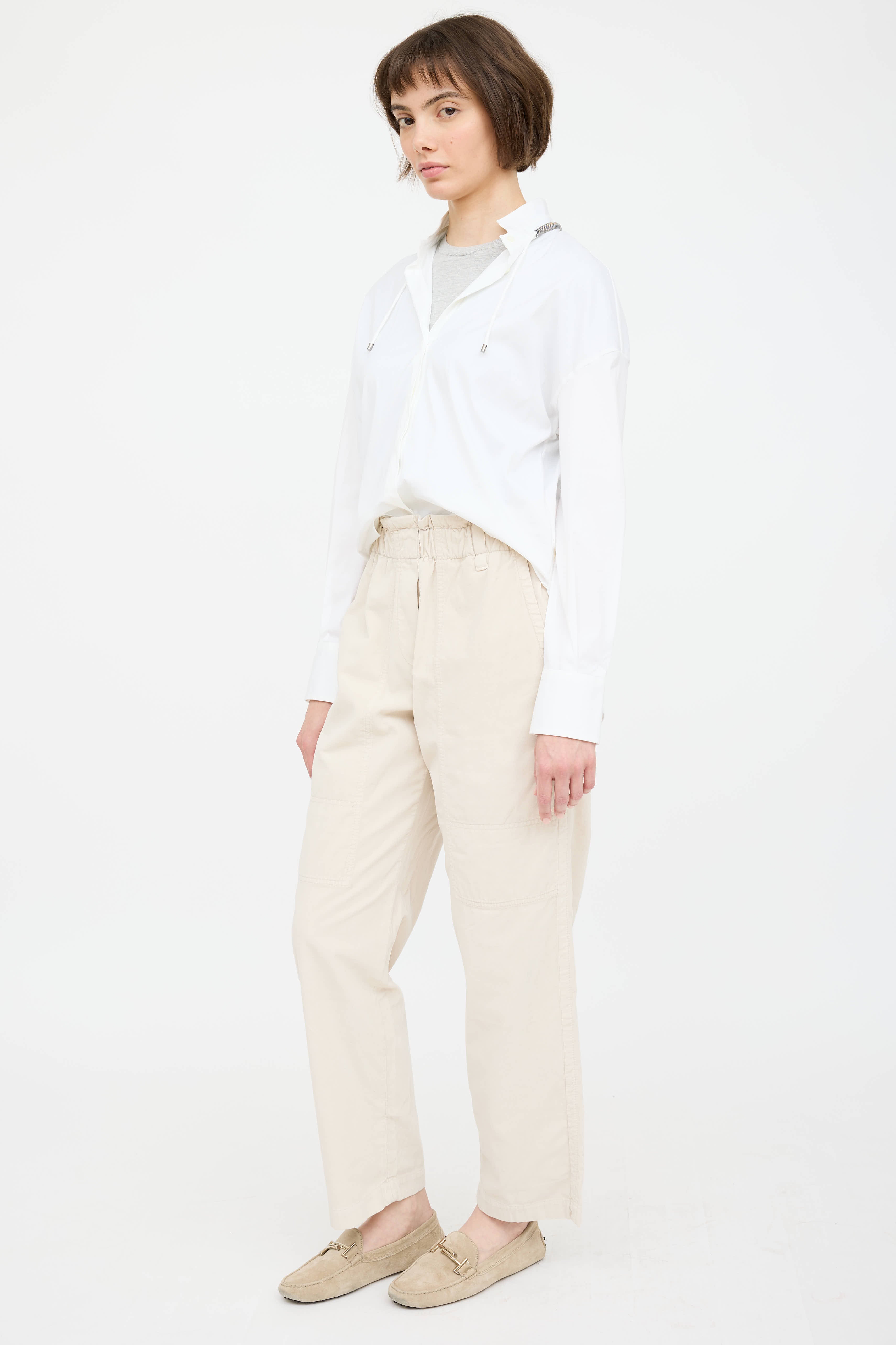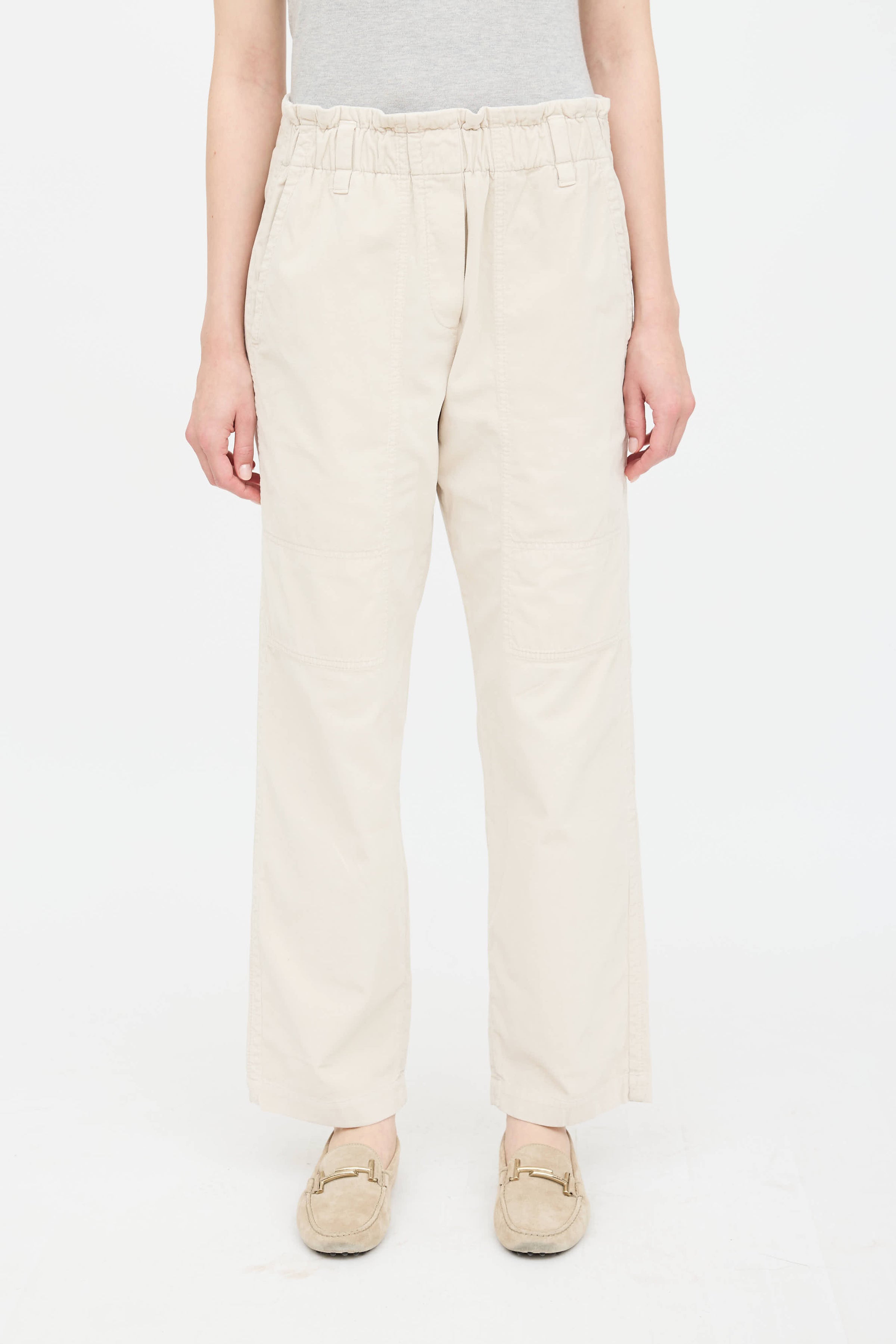 Pre-owned Brunello Cucinelli cream velour trousers featuring an elastic waist, two slip pockets at hip, two welt pockets at back, and tapered leg.