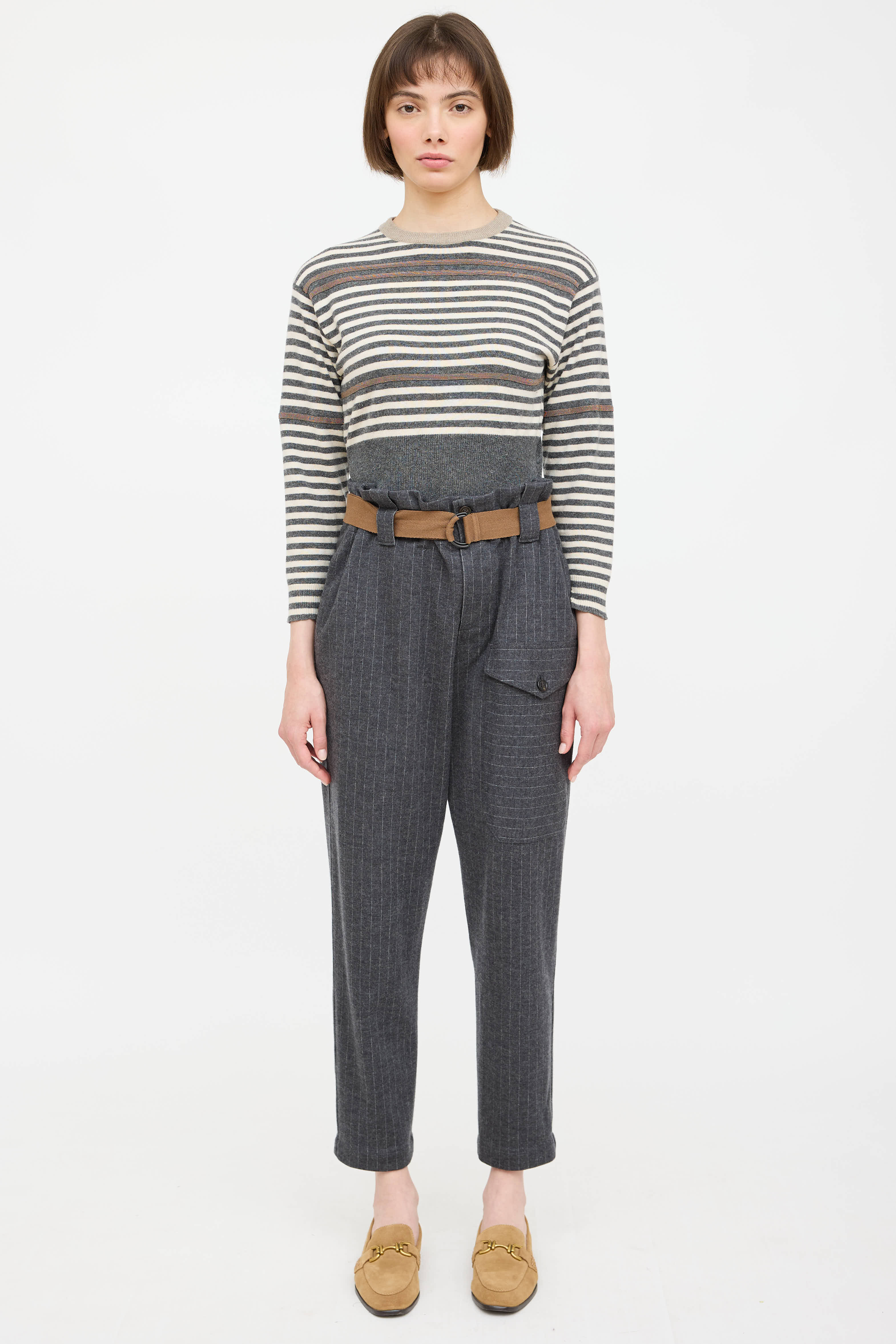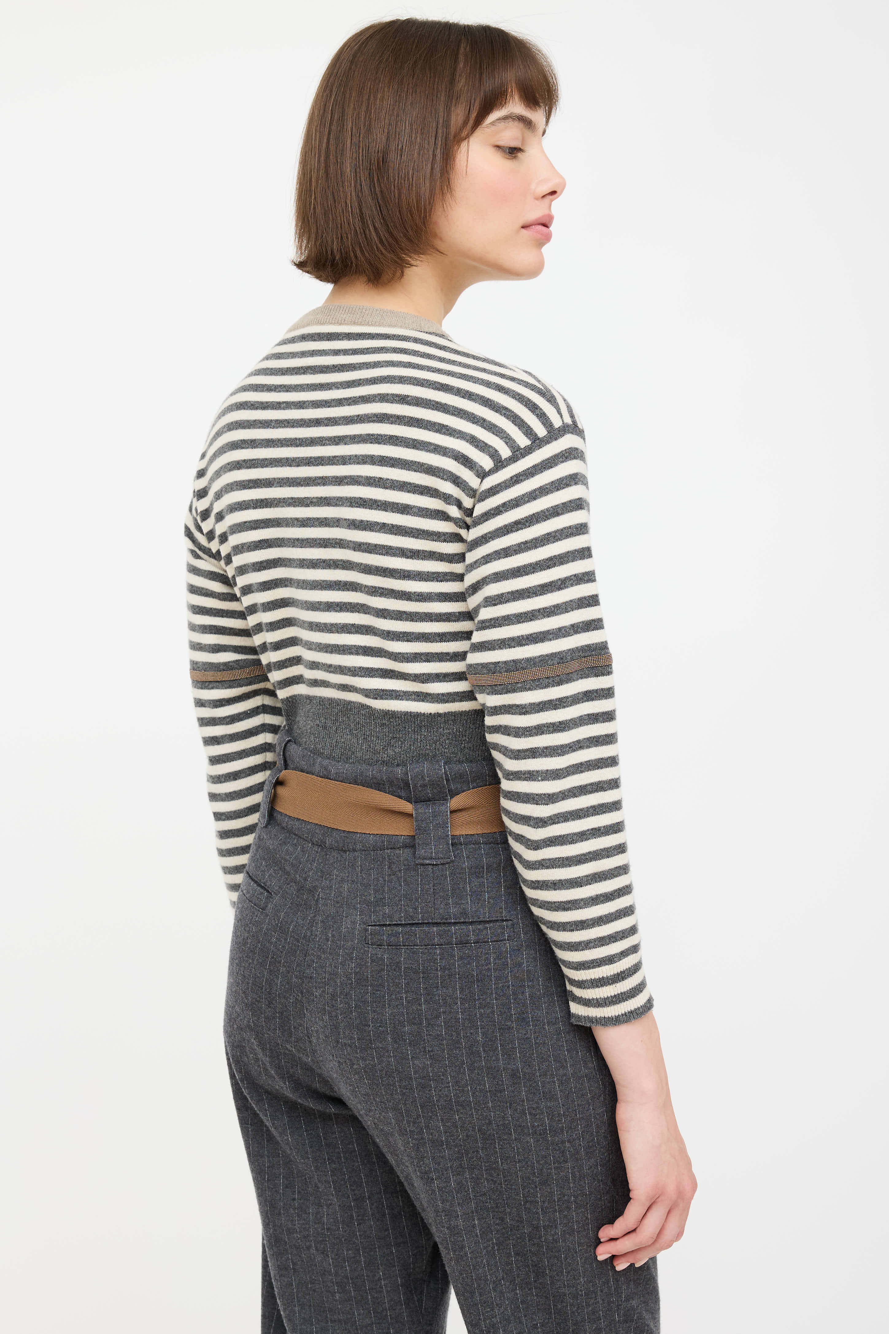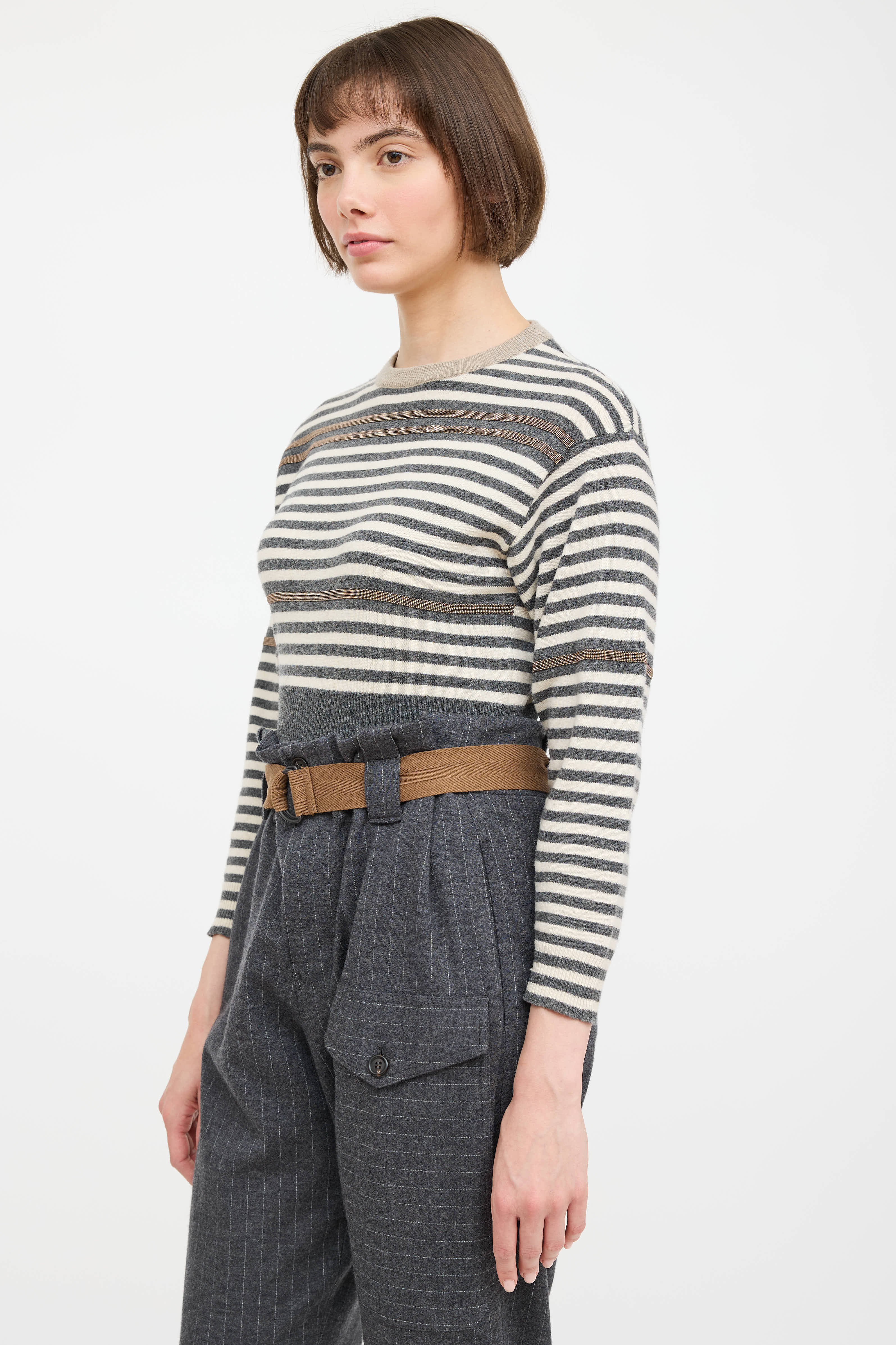 Pre-owned Brunello Cucinelli grey wool knit sweater featuring a cream striped monili bead pattern throughout, crew neckline, long sleeves, and ribbed hem.