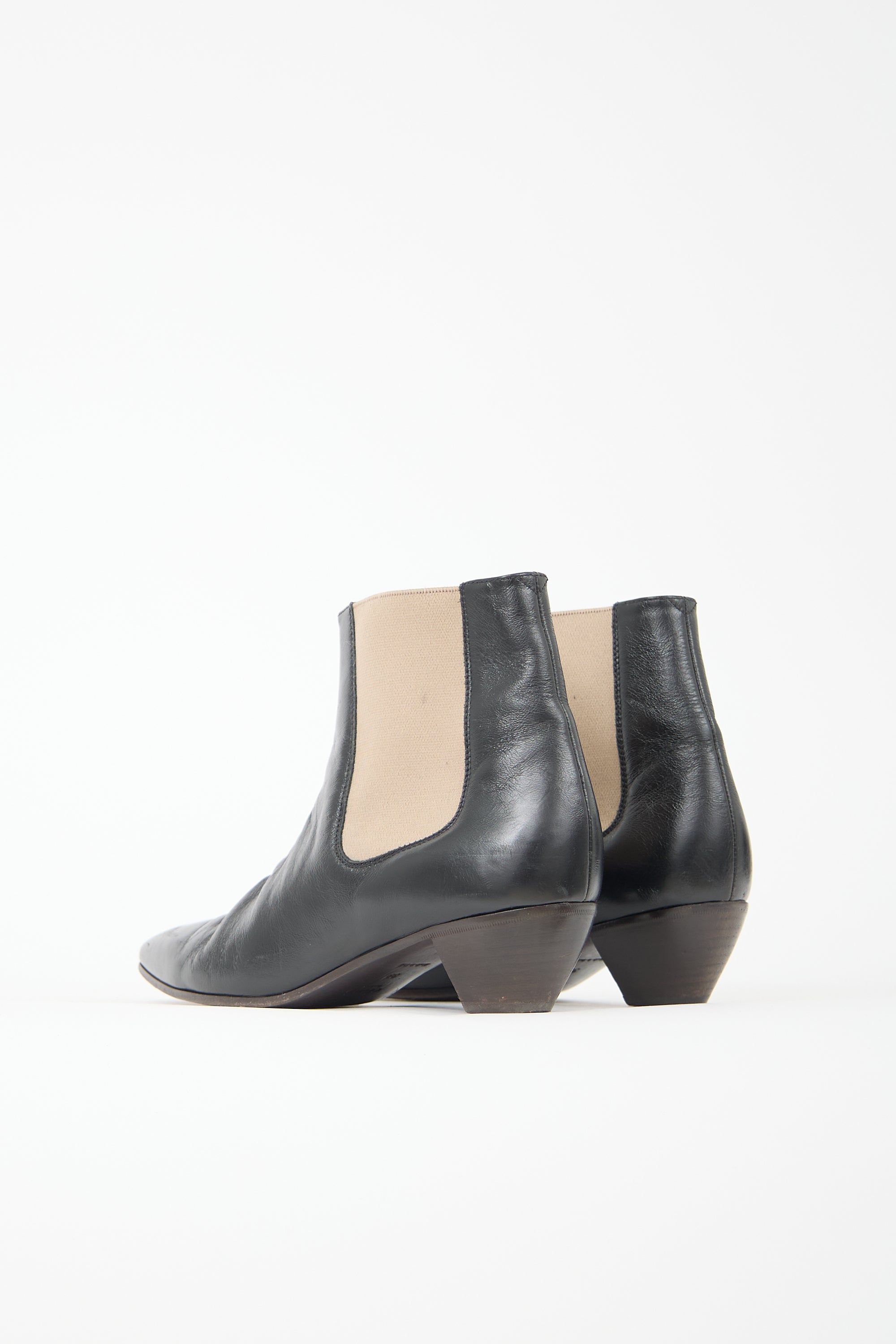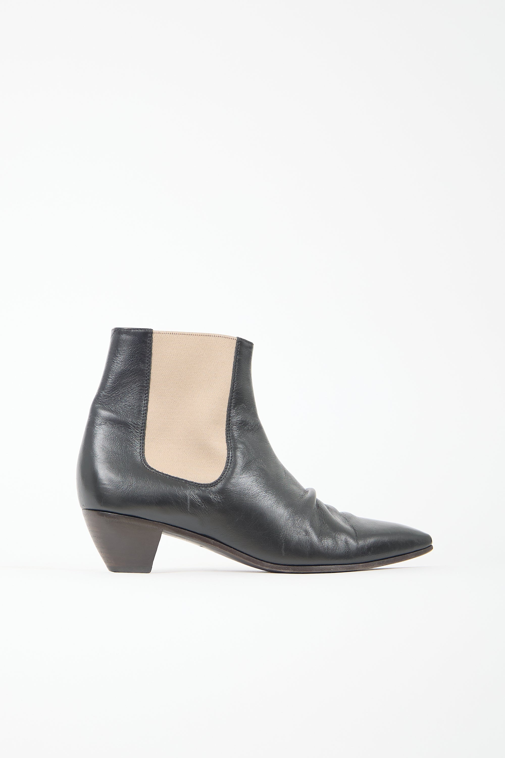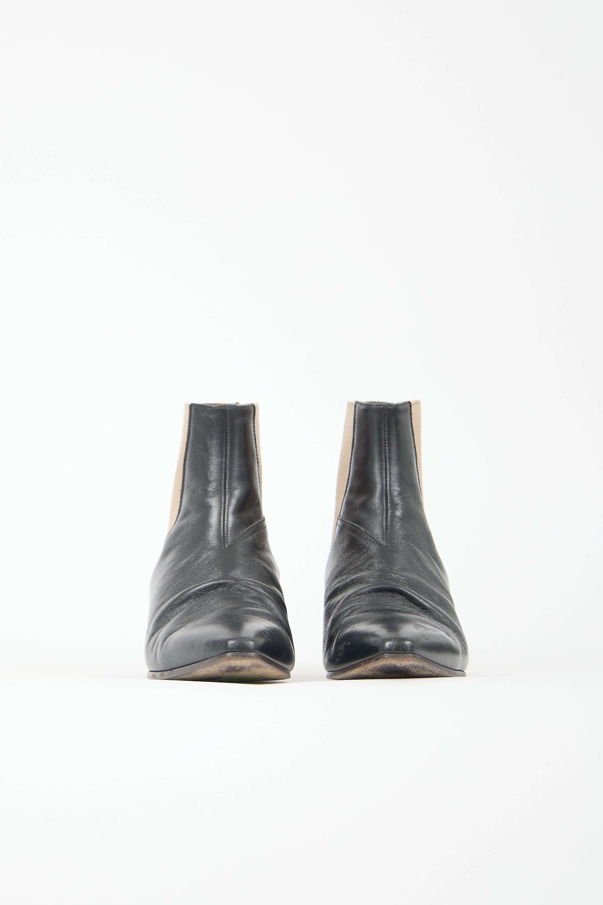 Pre-owned Celine black leather Chelsea ankle boots featuring pointed toe, scrunched vamp, beige elastic side panels, pull on entry, and wooden block heel.