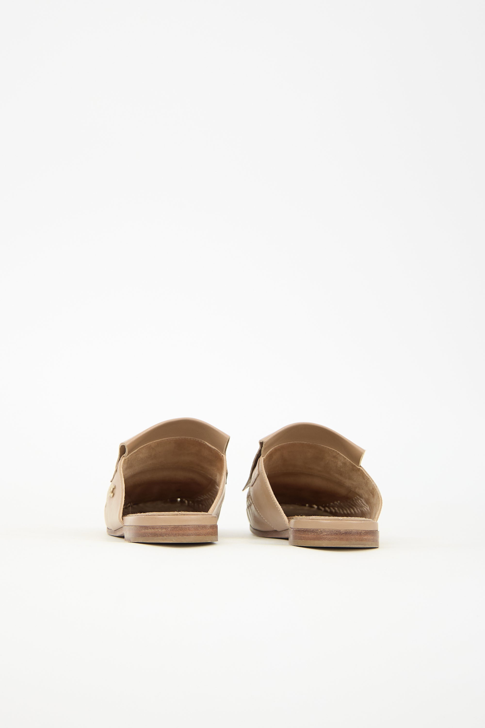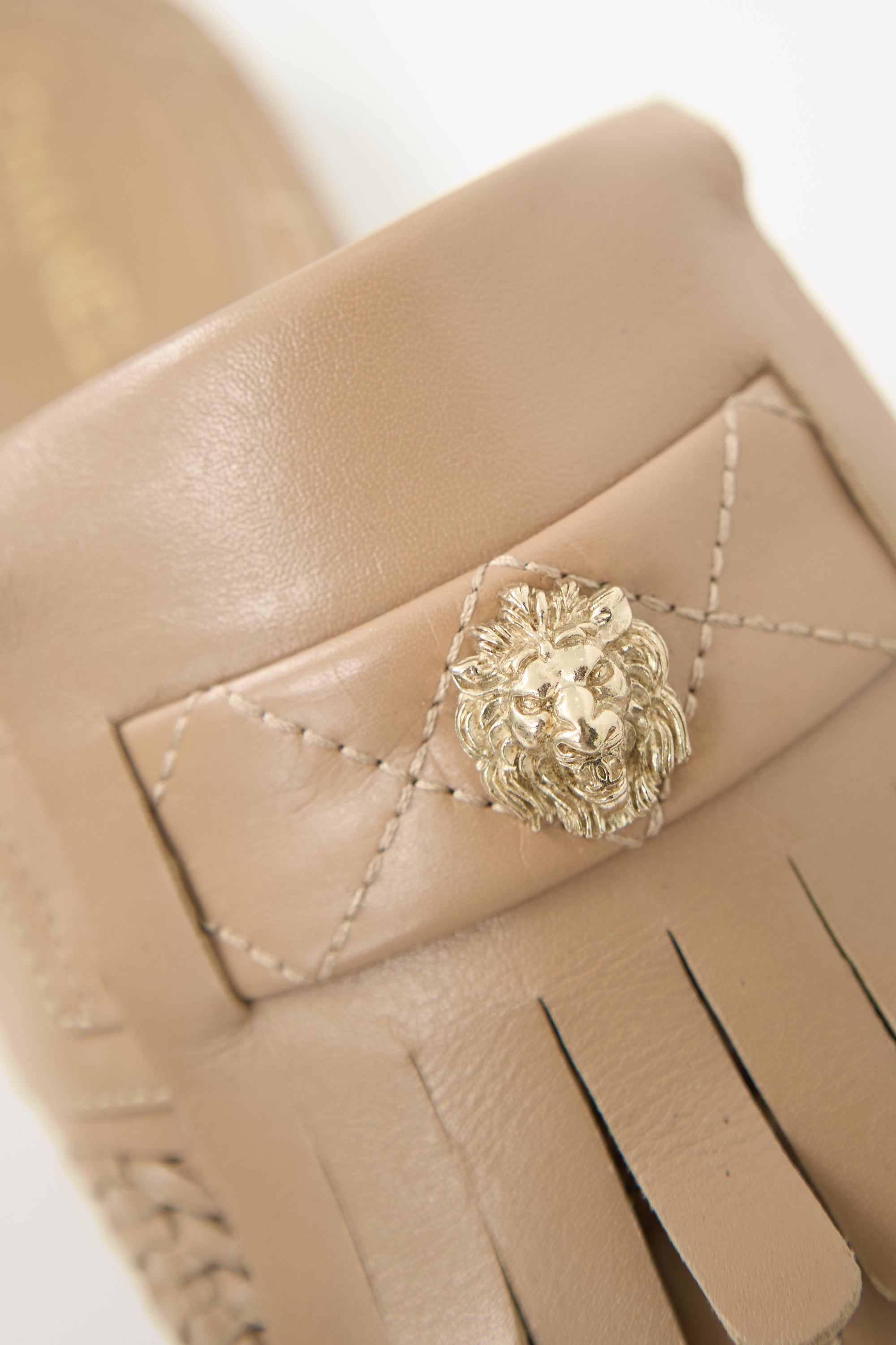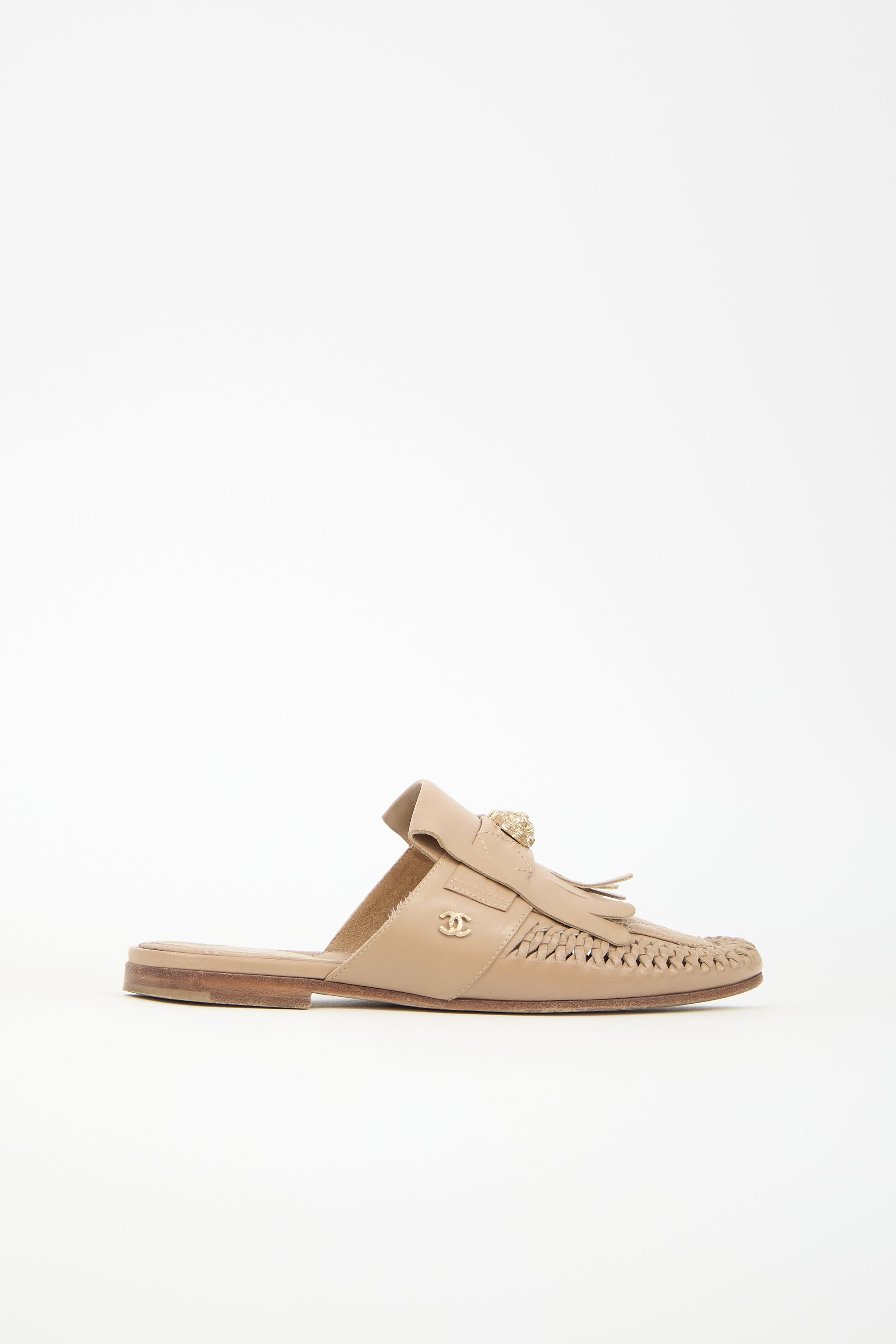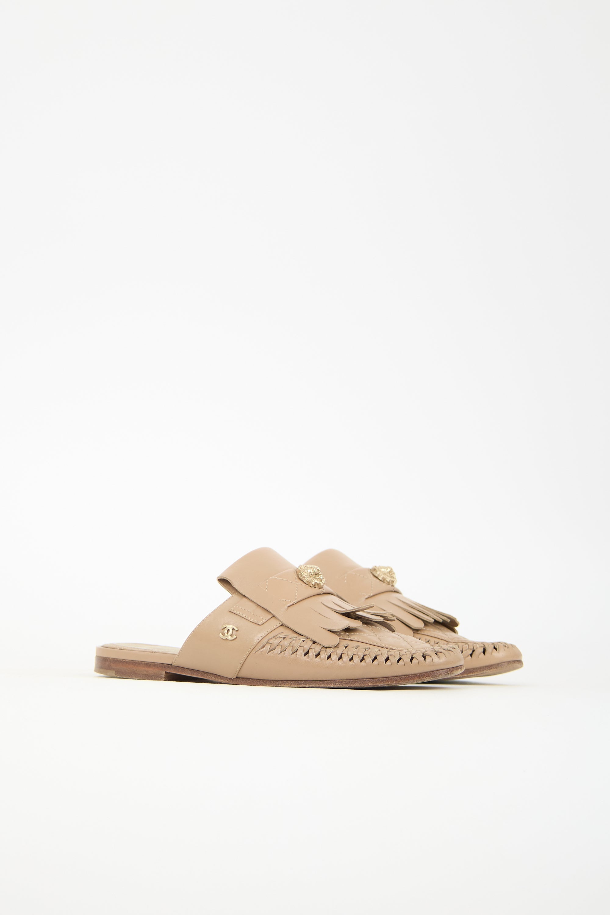 Pre-owned Chanel 2018 brown leather mules featuring an almond toe with woven cut out detail, quilted vamp, foldover panel with fringed ends, gold tone hardware, lion head embellishment with CC logo, interlocking CC at outerside, quilted footbed, and a small stacked heel. Comes with original dust bags.
